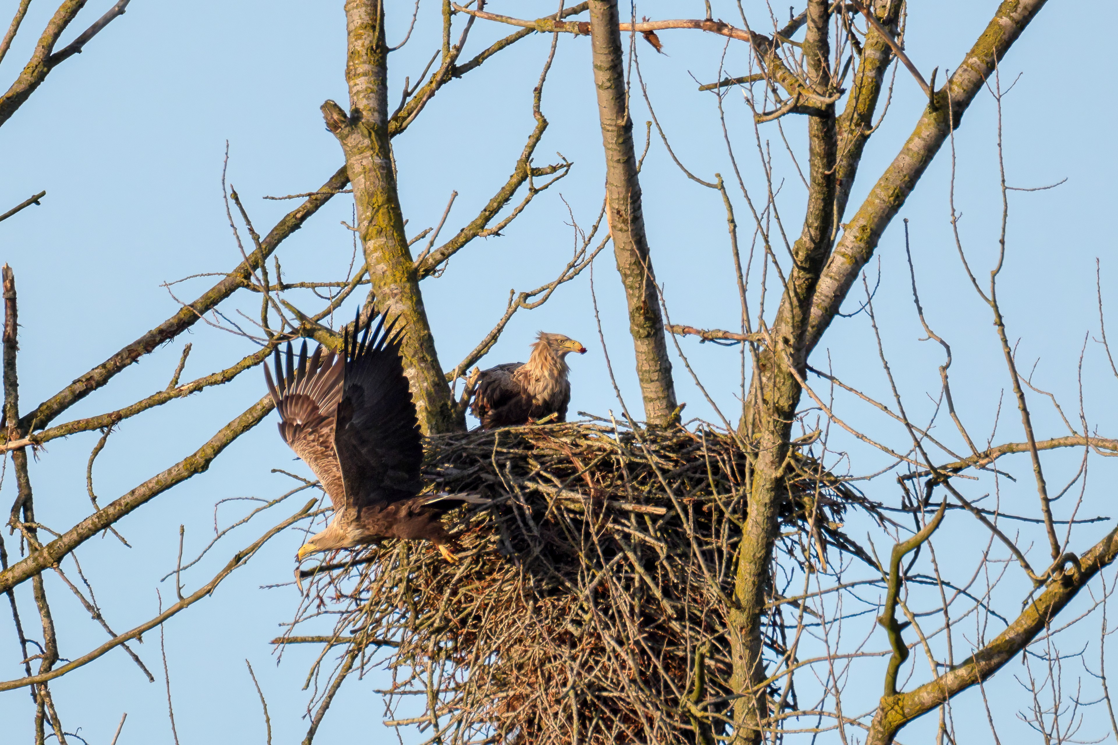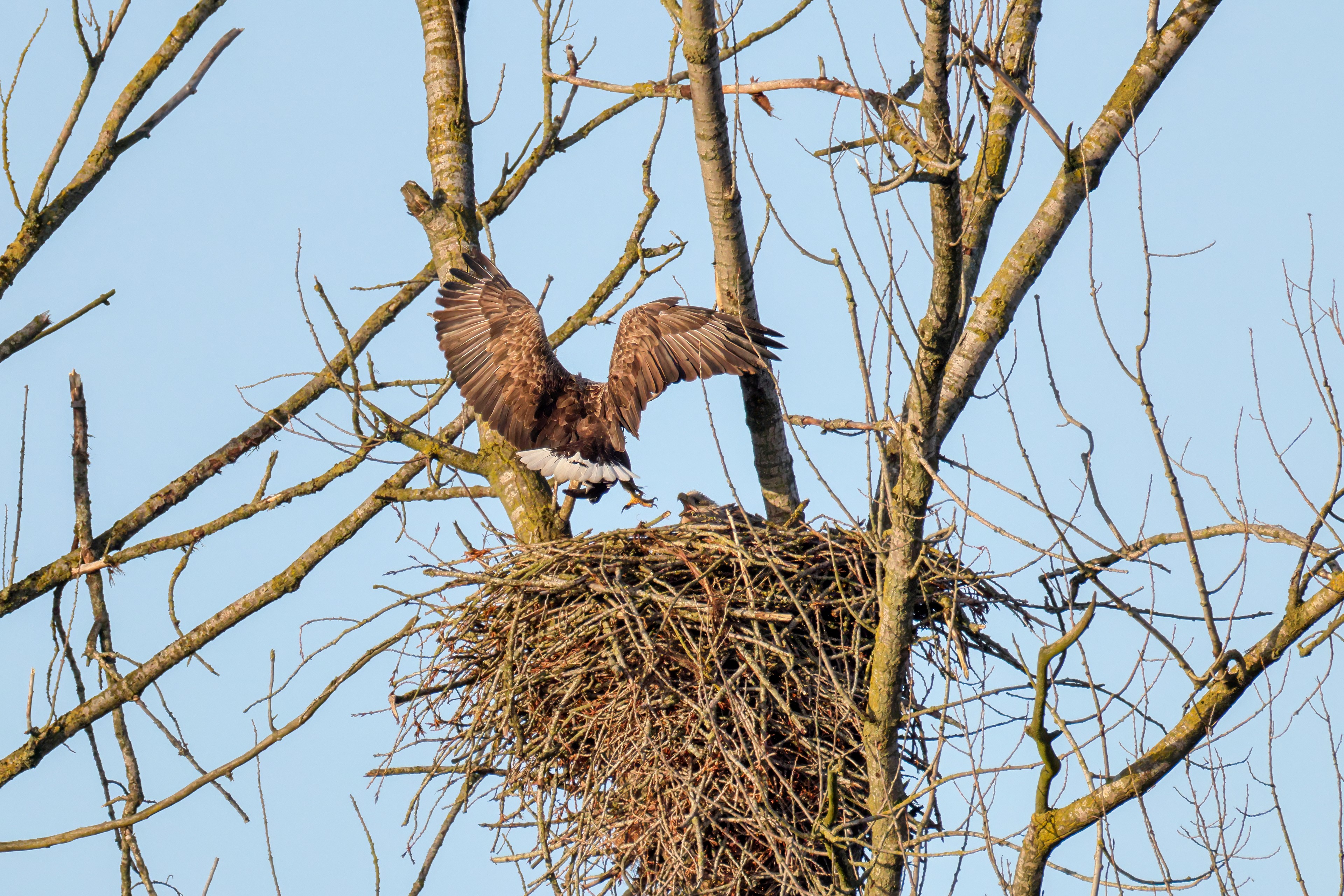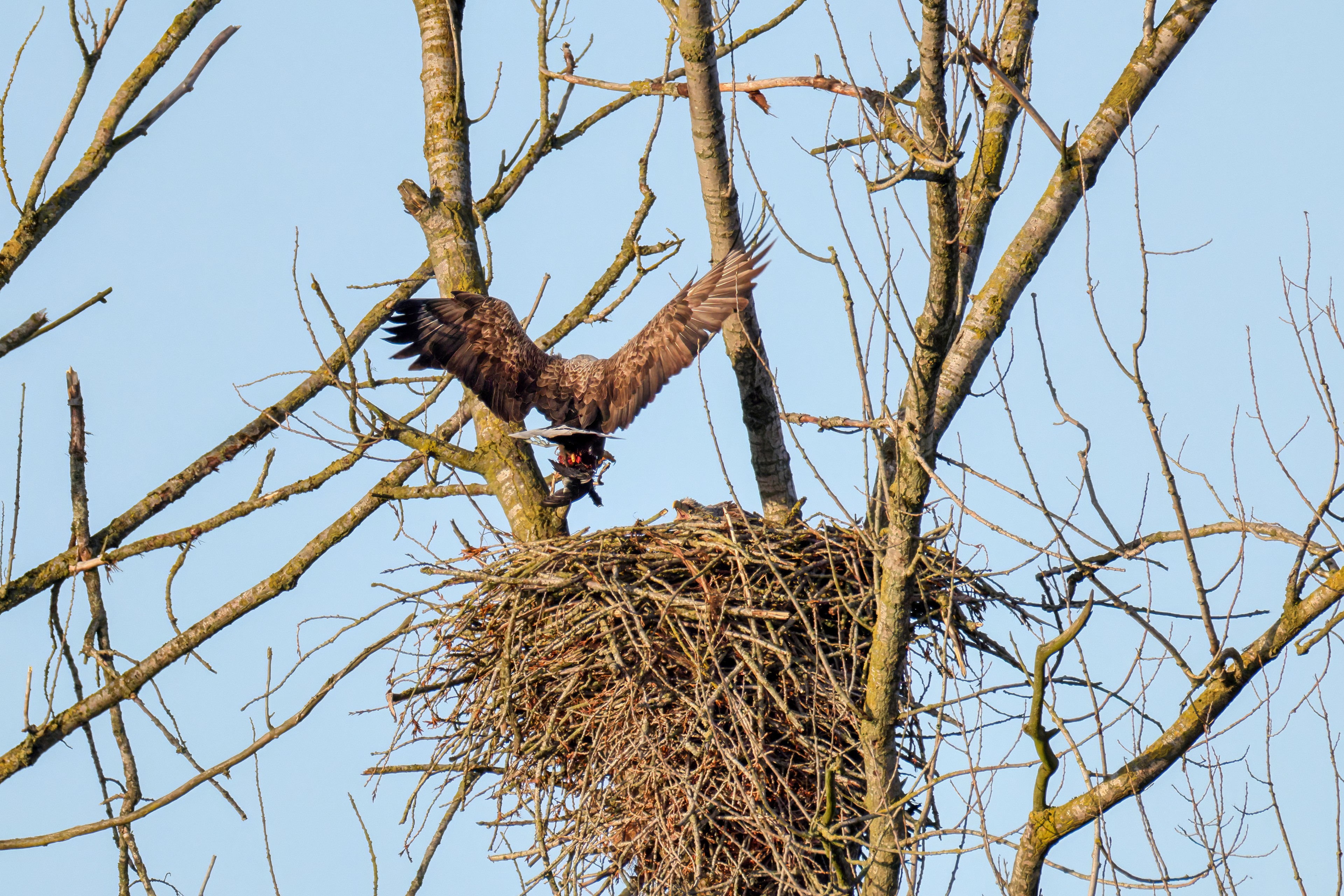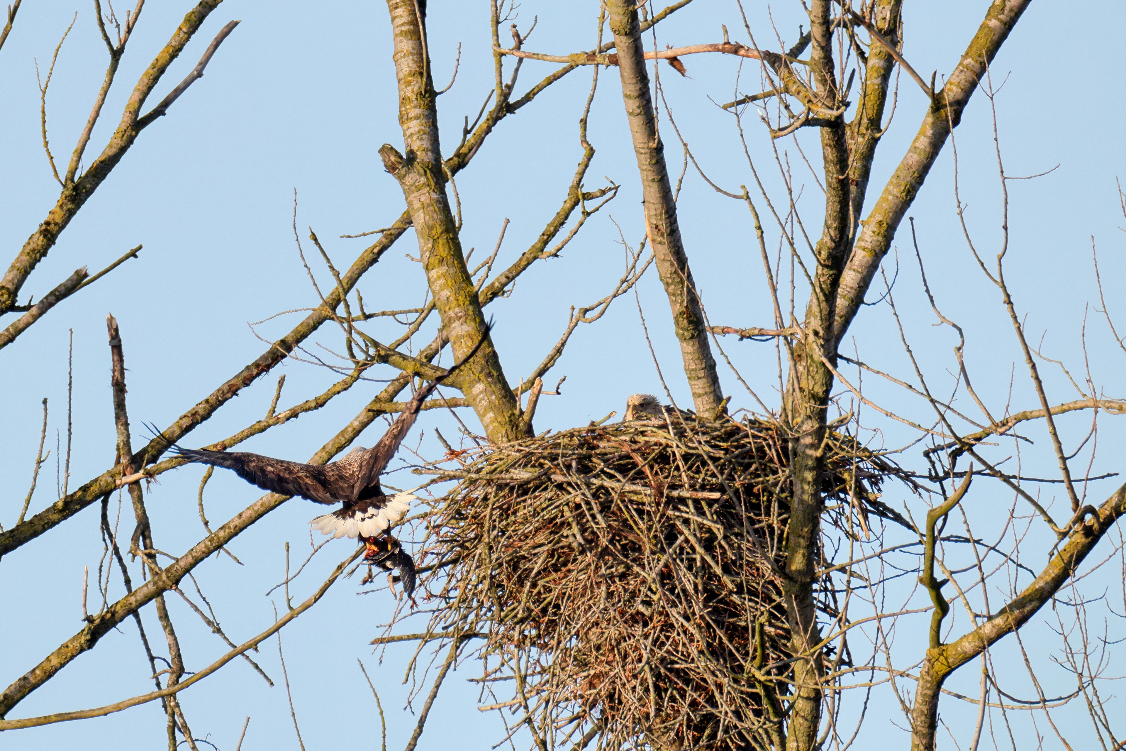 Vorbildlich sorgt das Seeadlermännchen für Nahrung, um den Nachwuchs zu versorgen