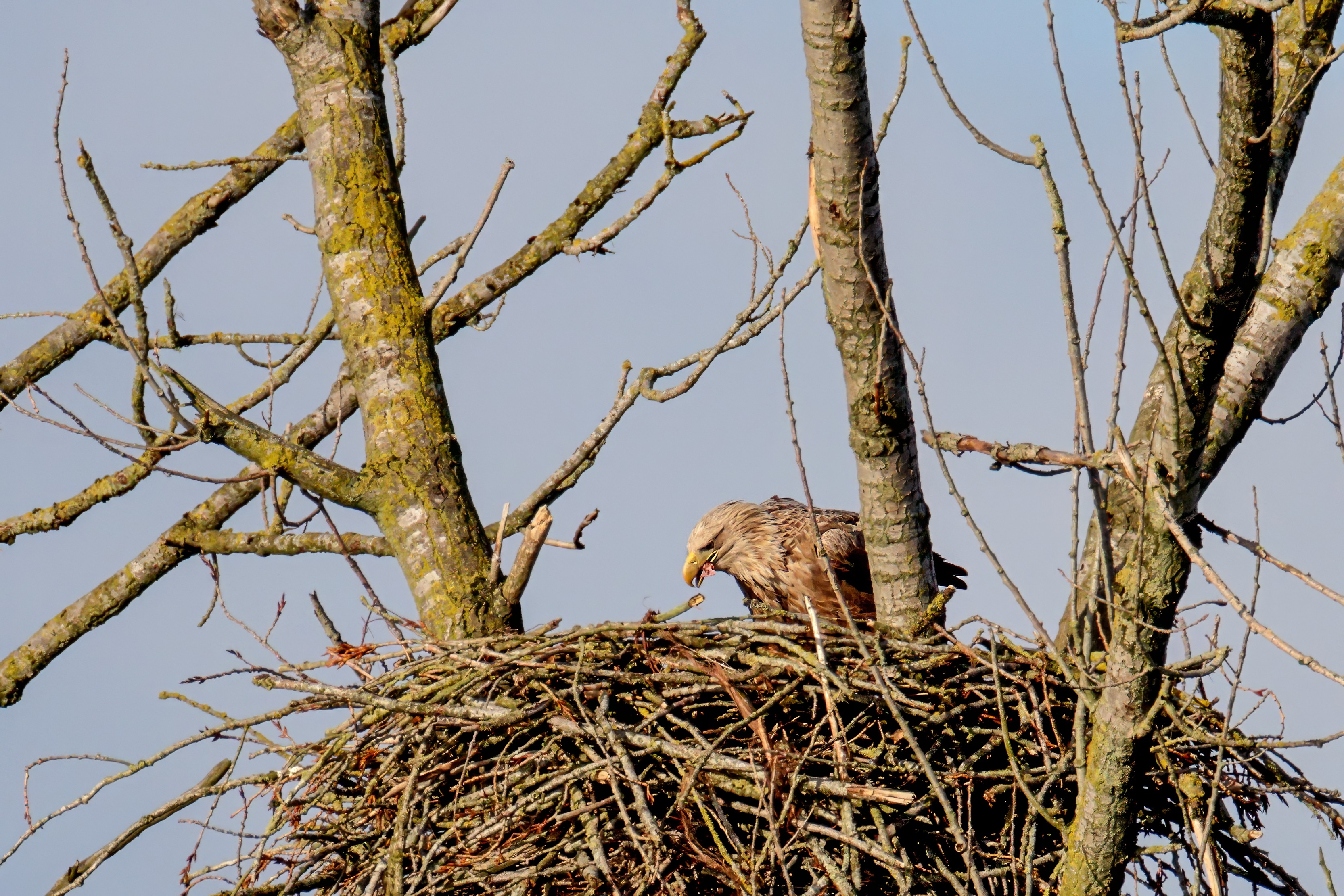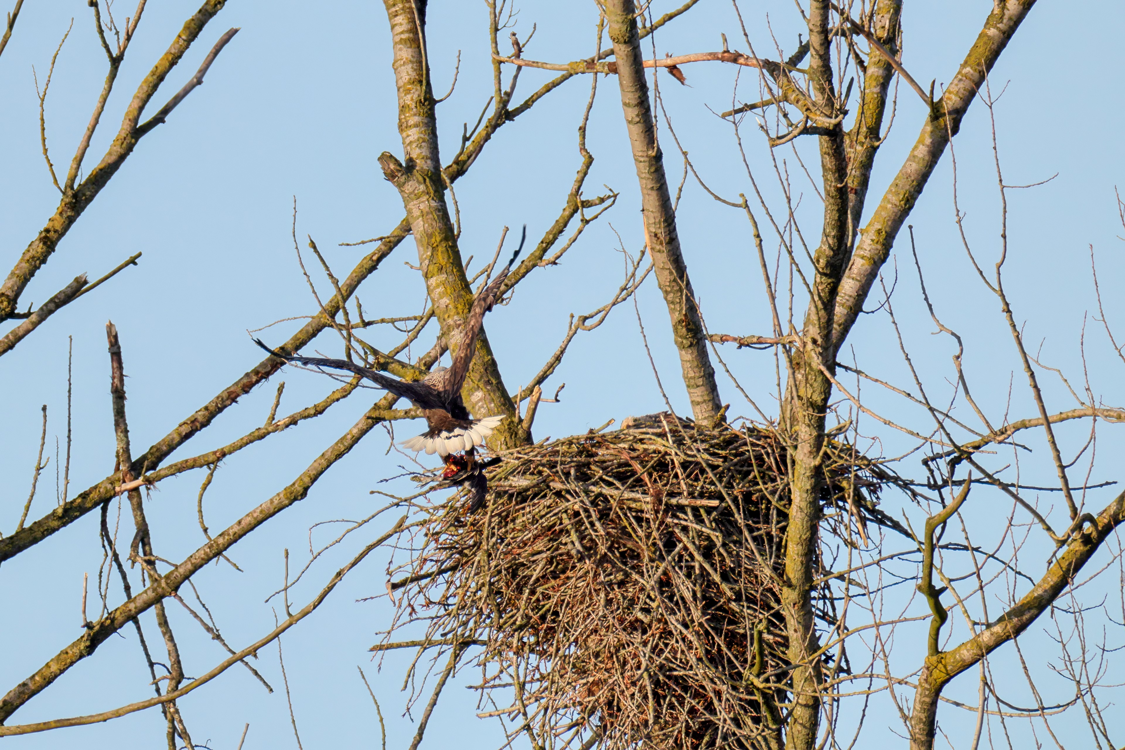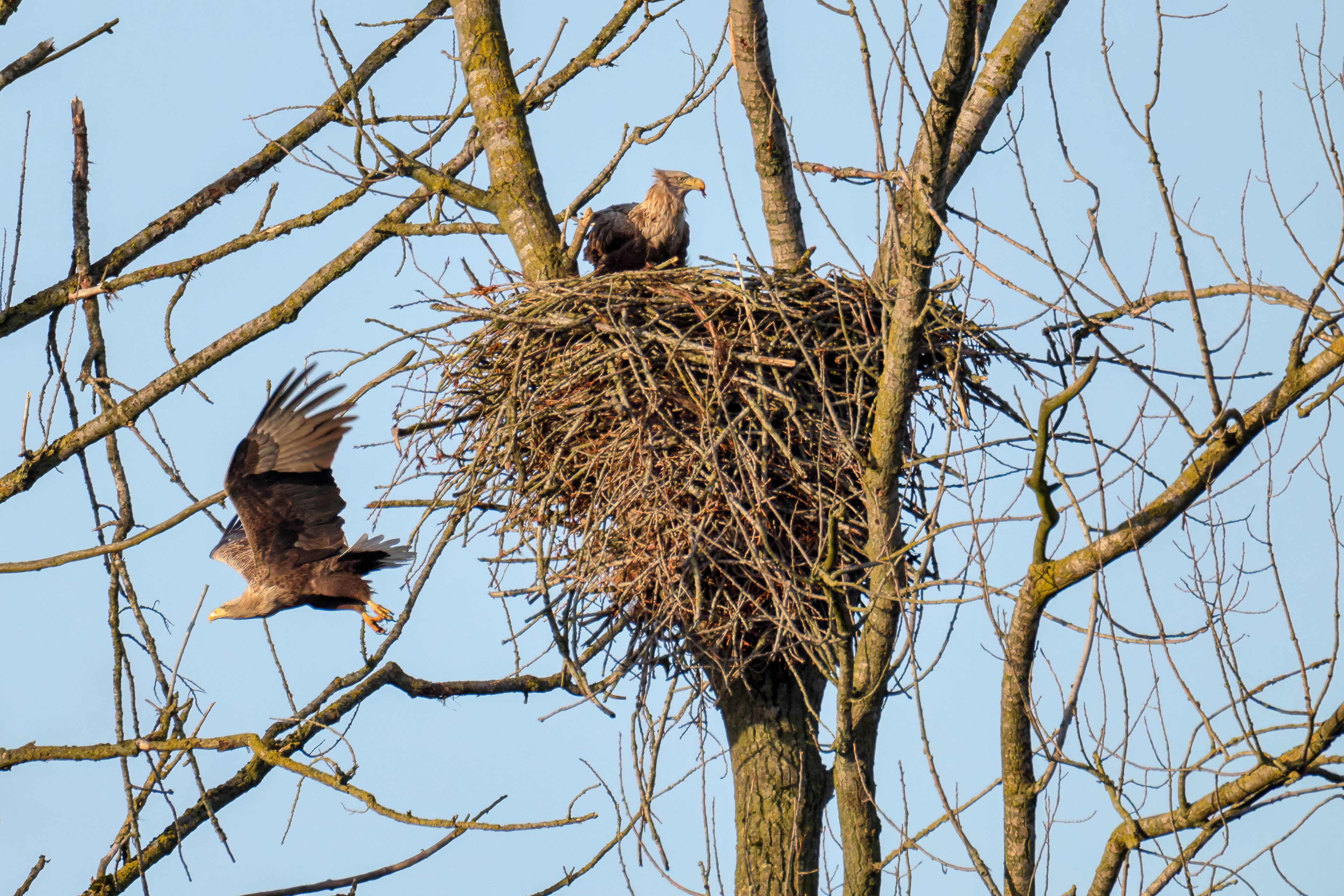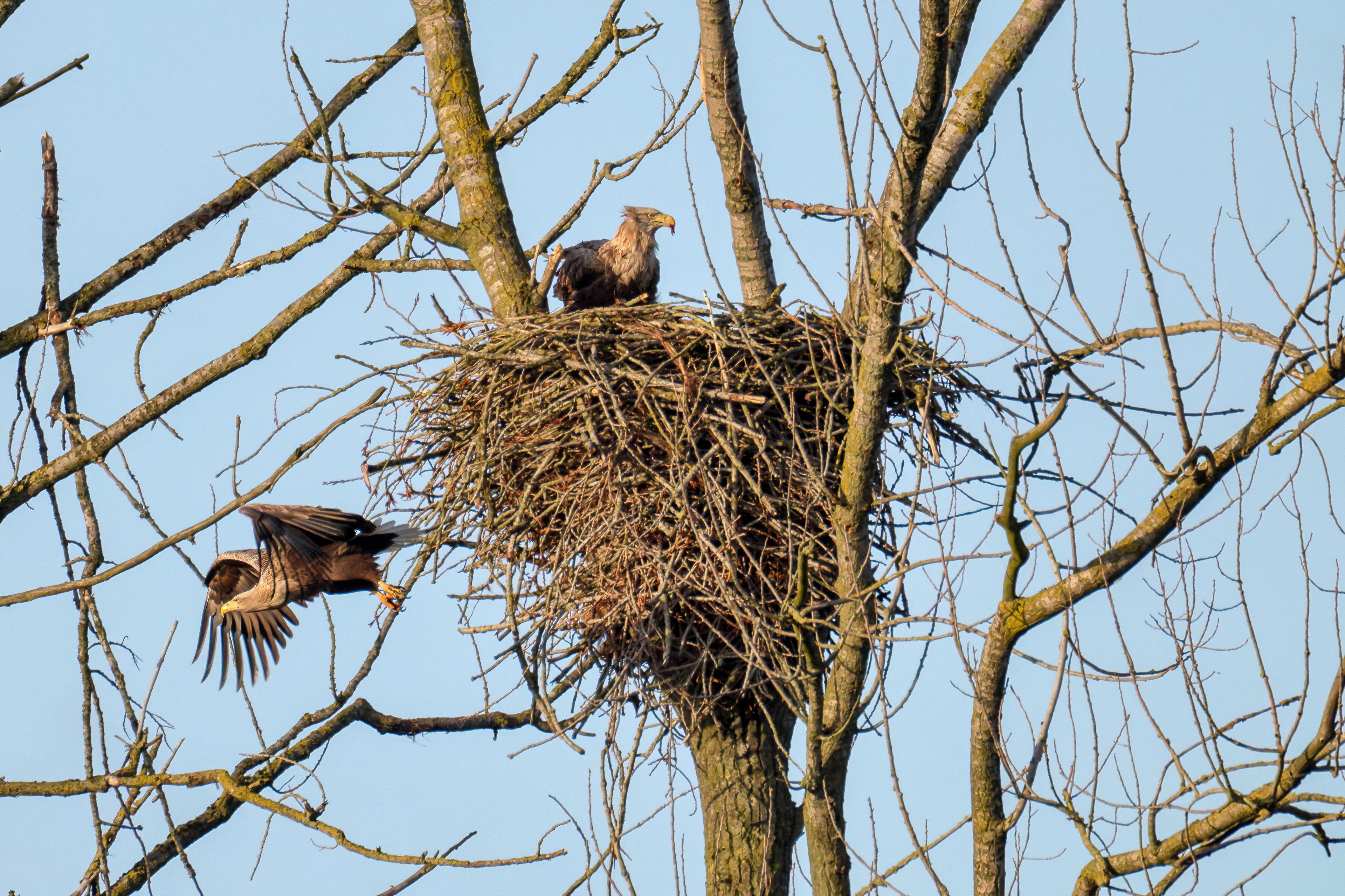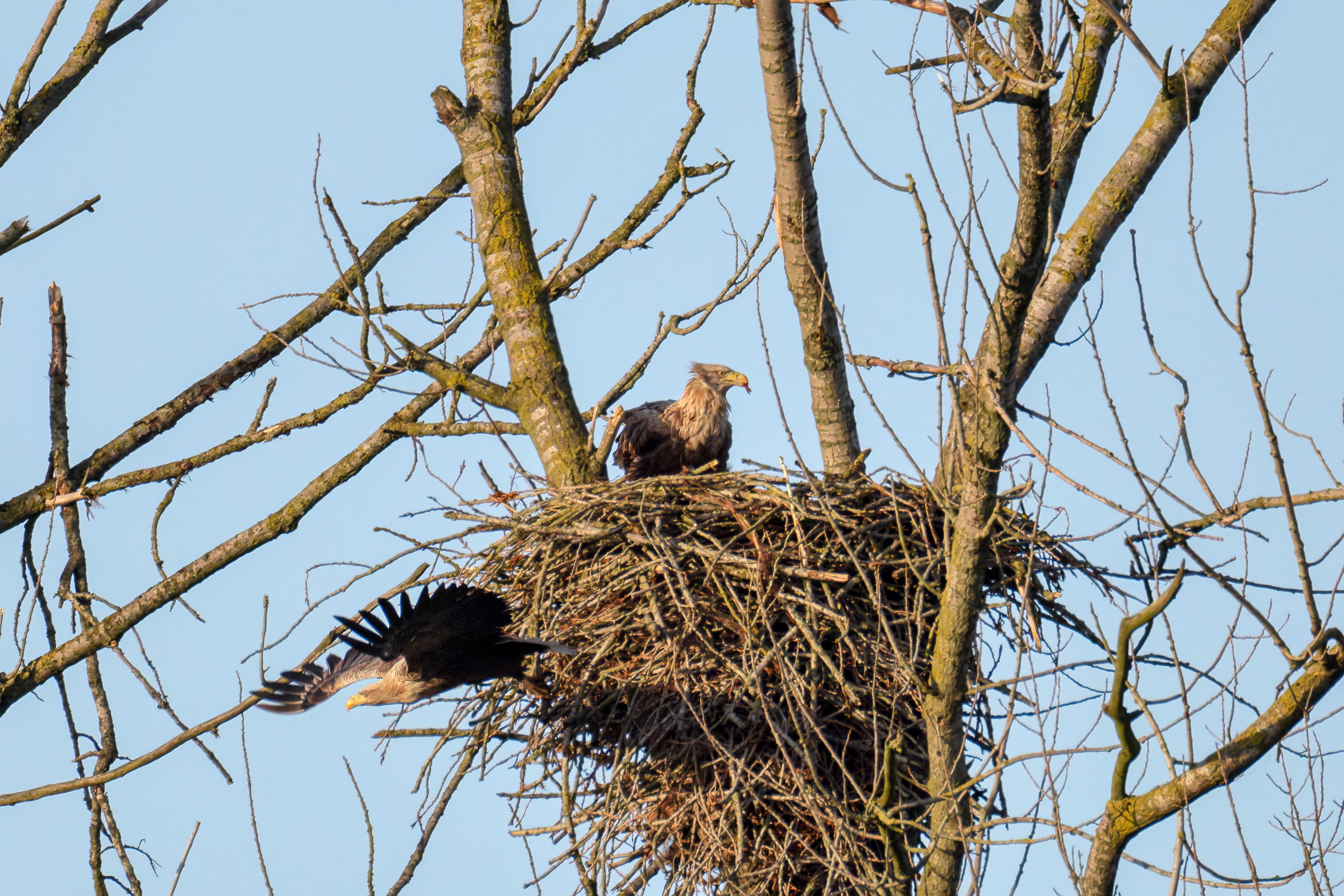 Vorbildlich sorgt das Seeadlermännchen für Nahrung, um den Nachwuchs zu versorgen