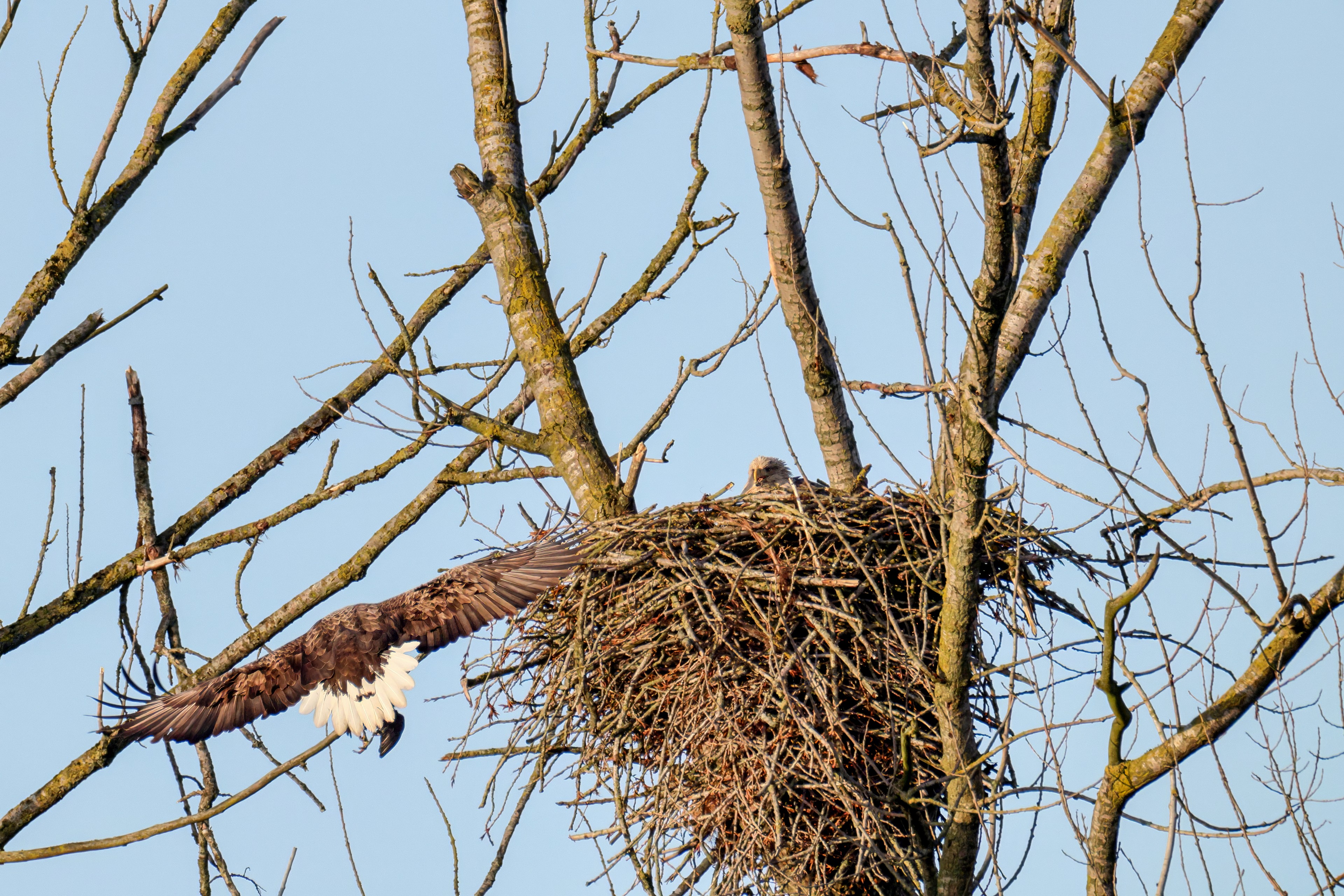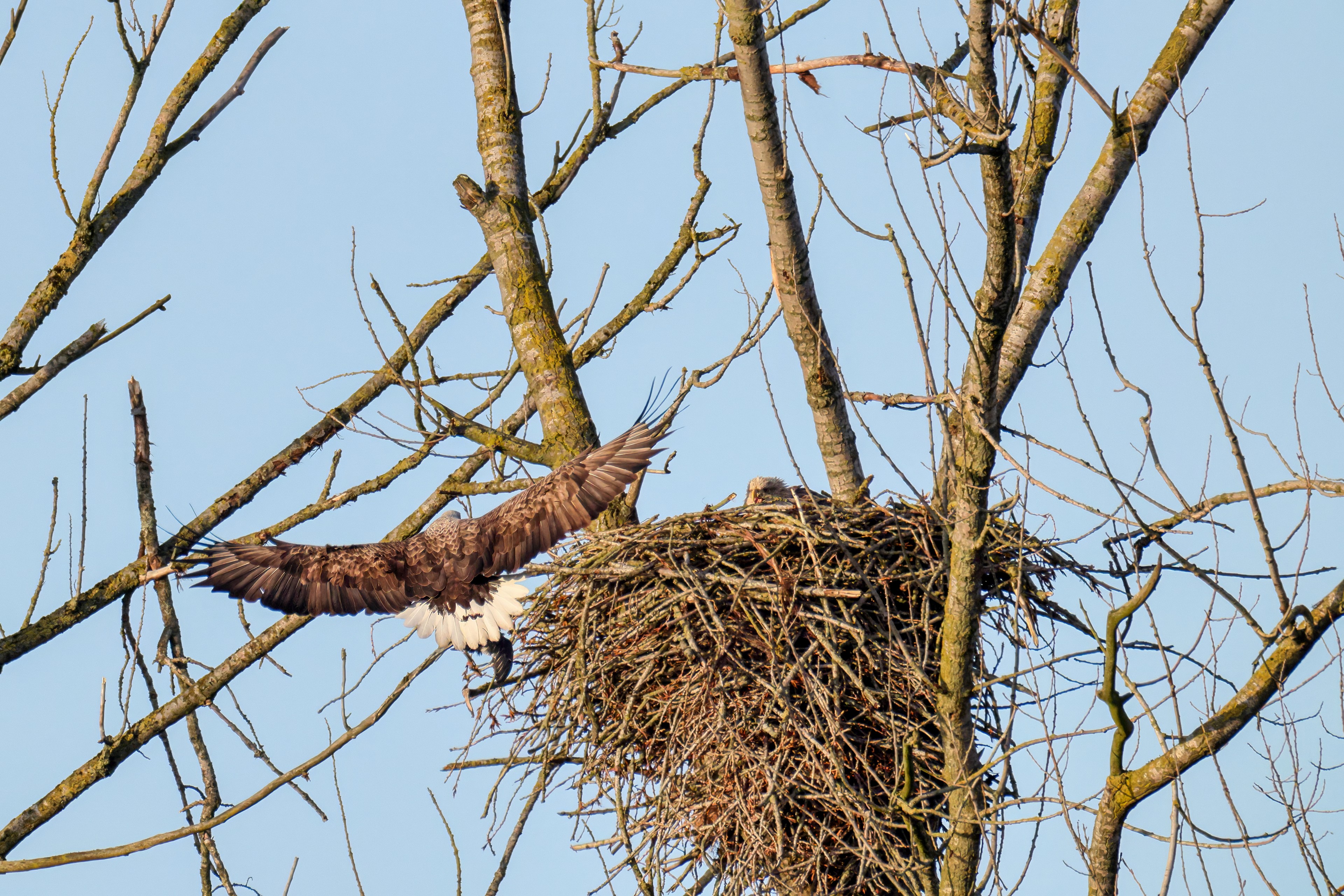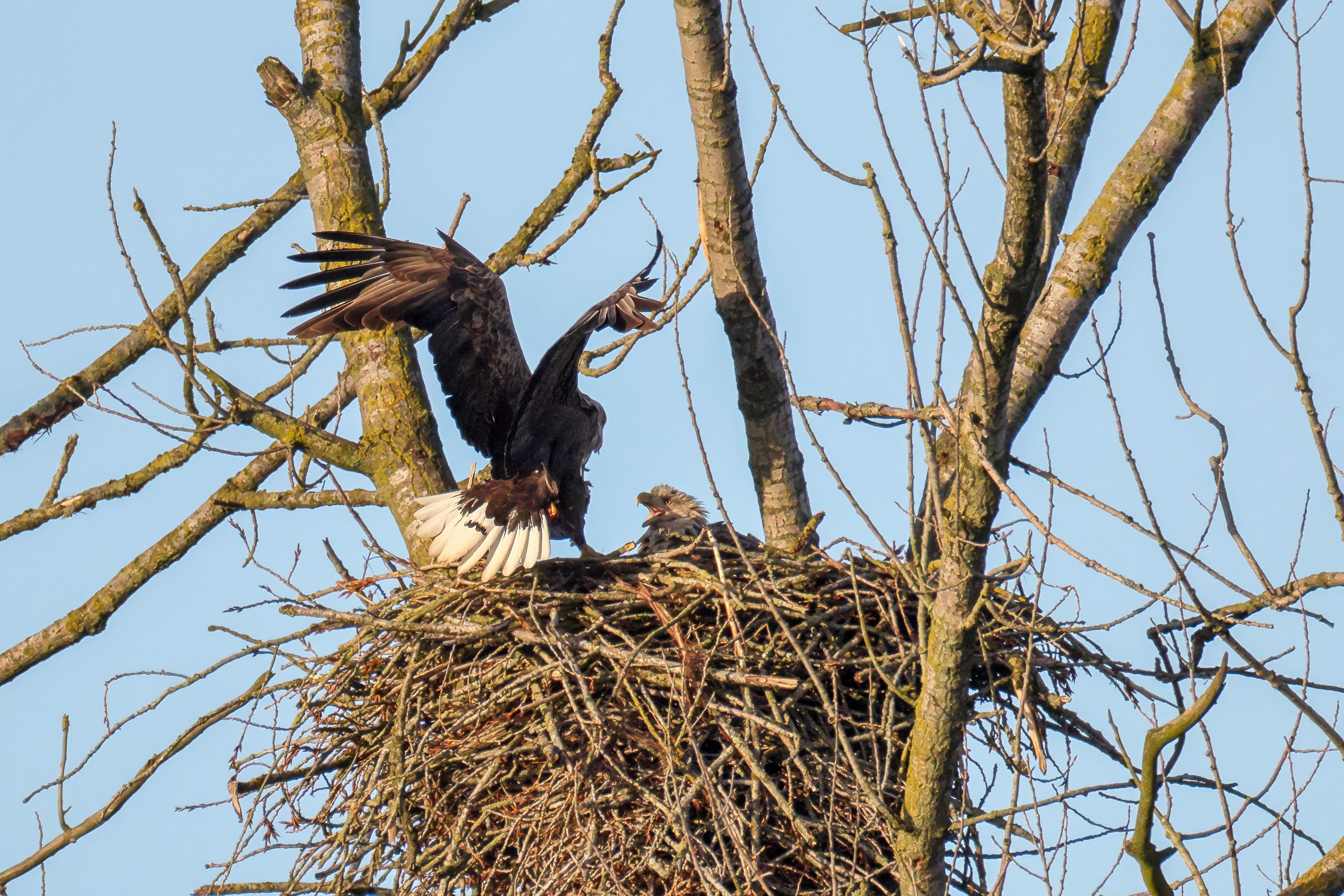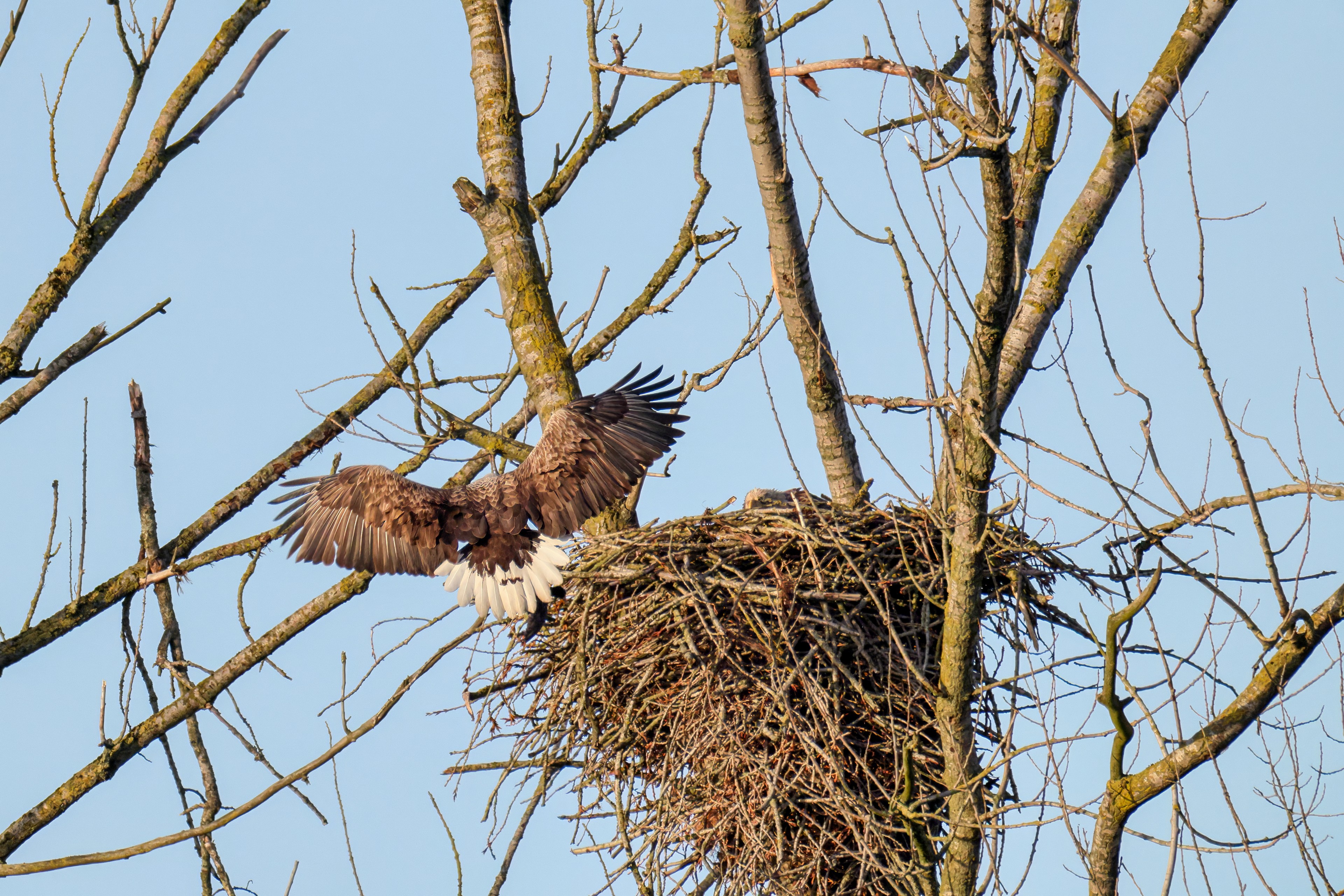 Vorbildlich sorgt das Seeadlermännchen für Nahrung, um den Nachwuchs zu versorgen