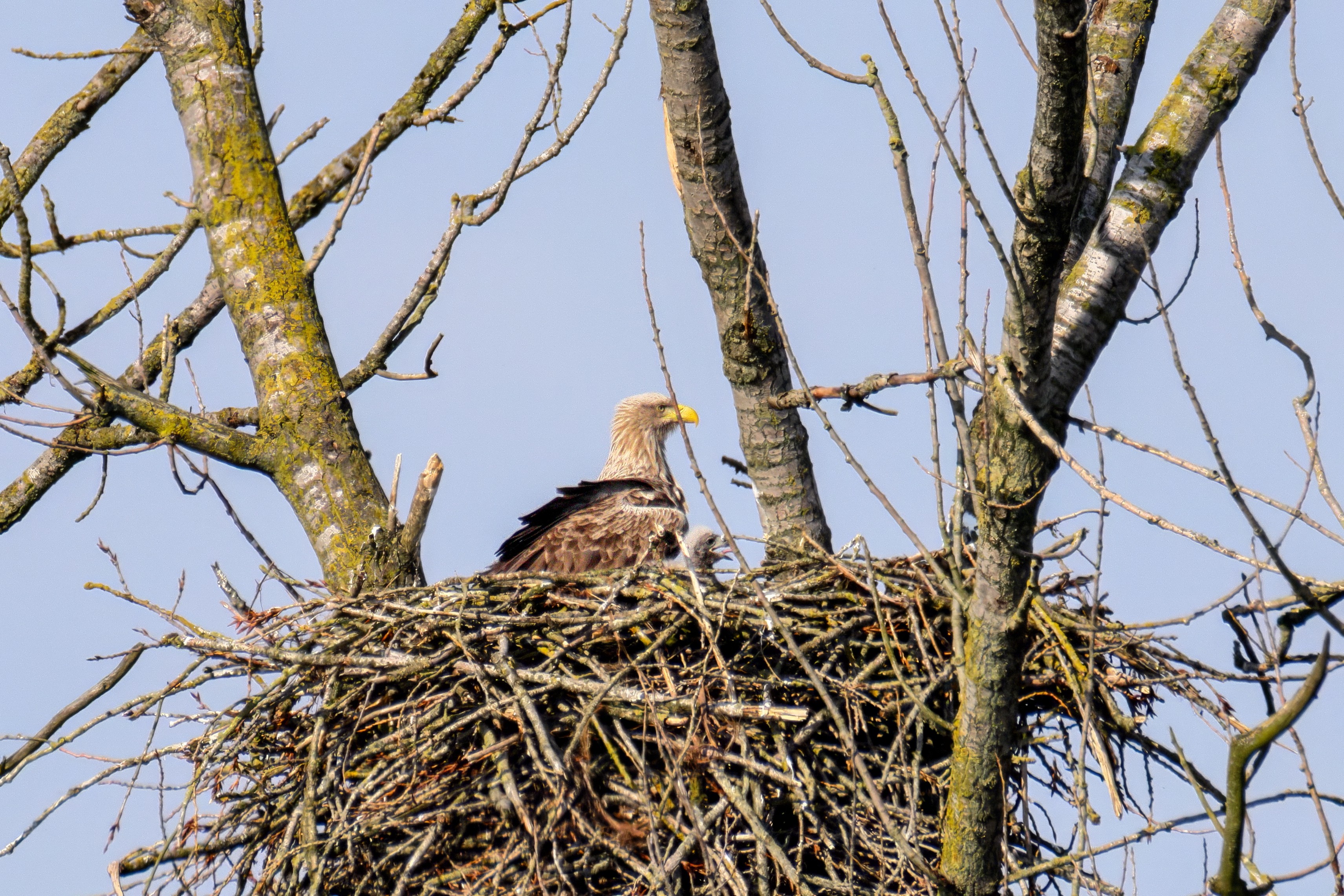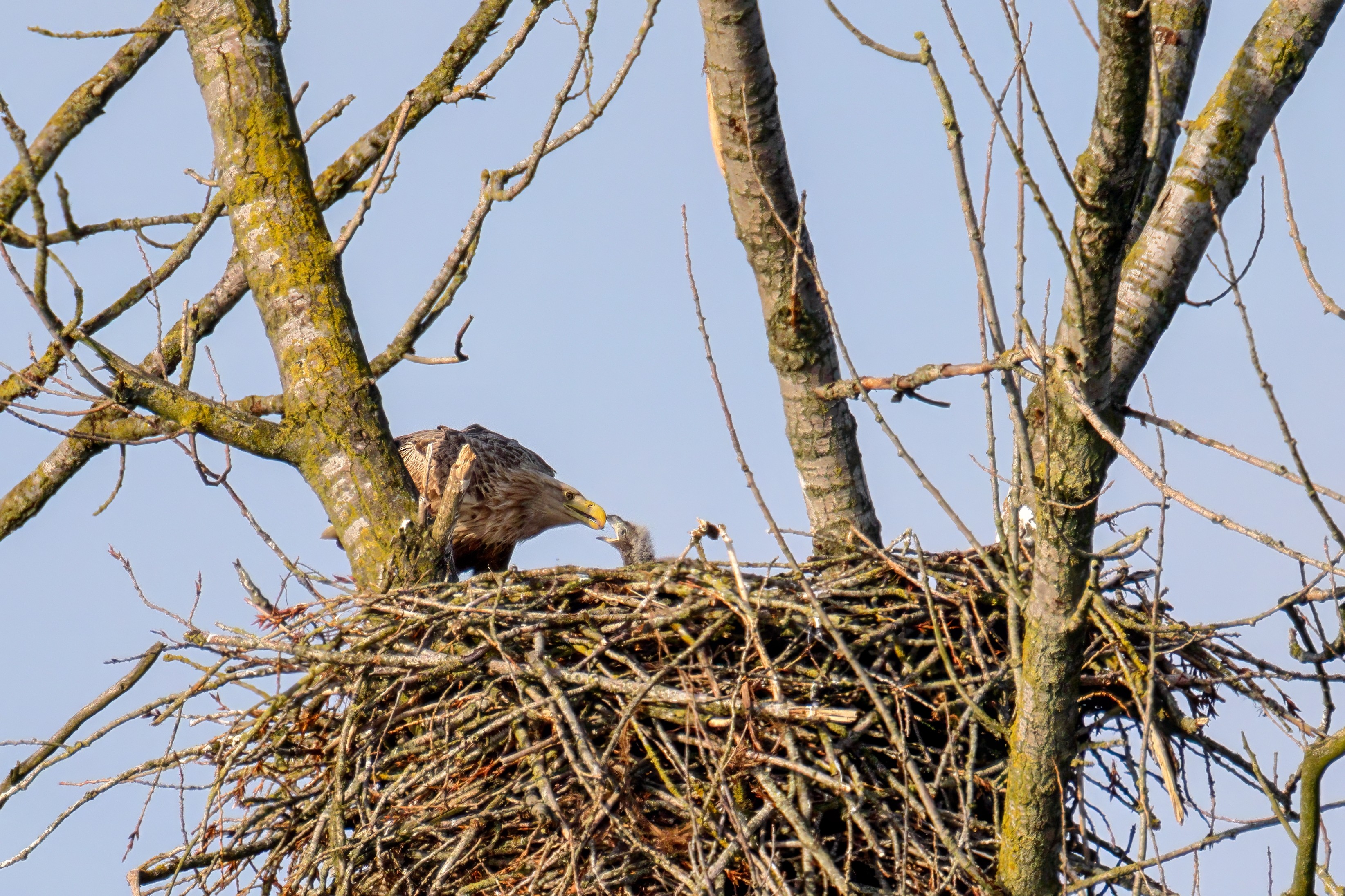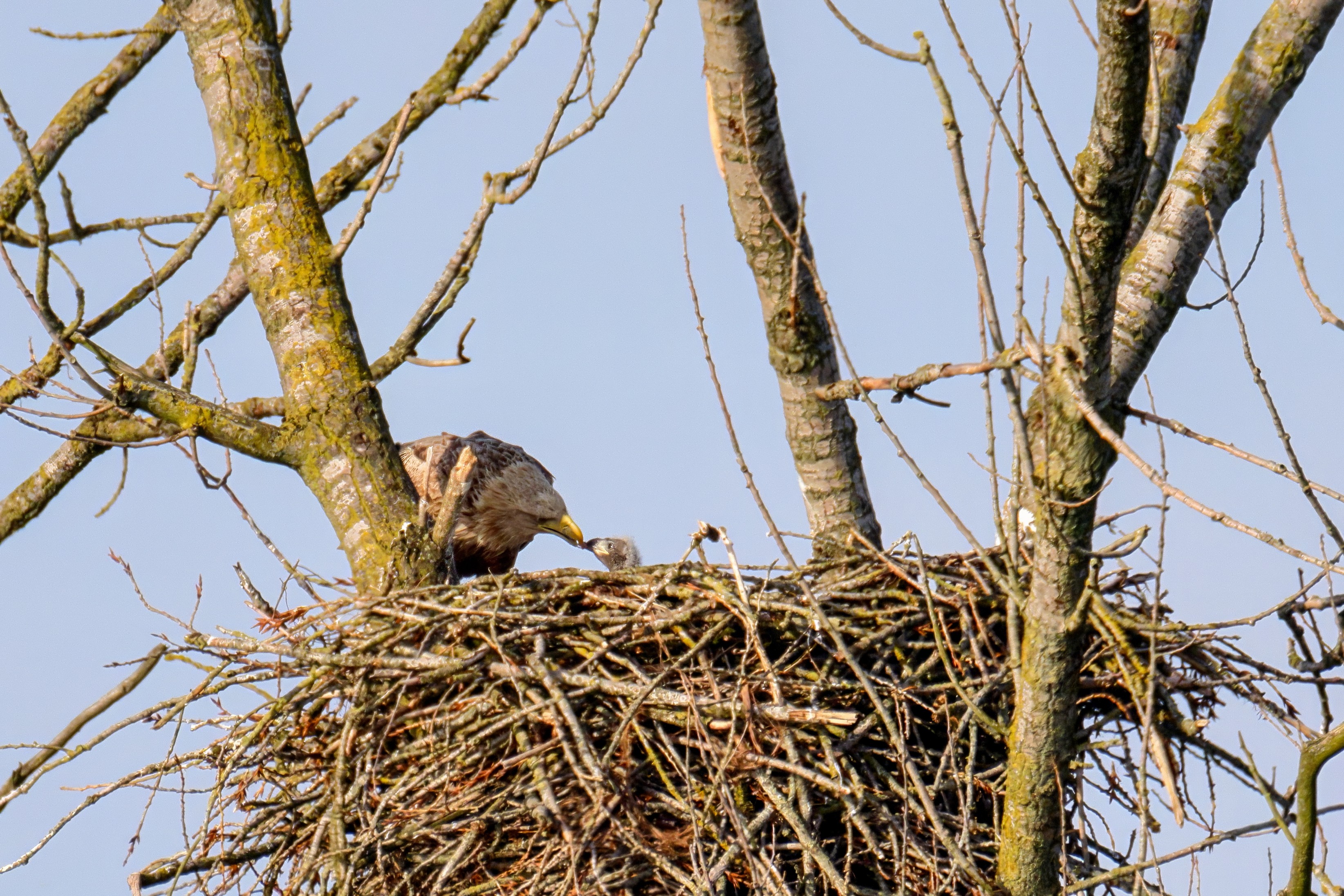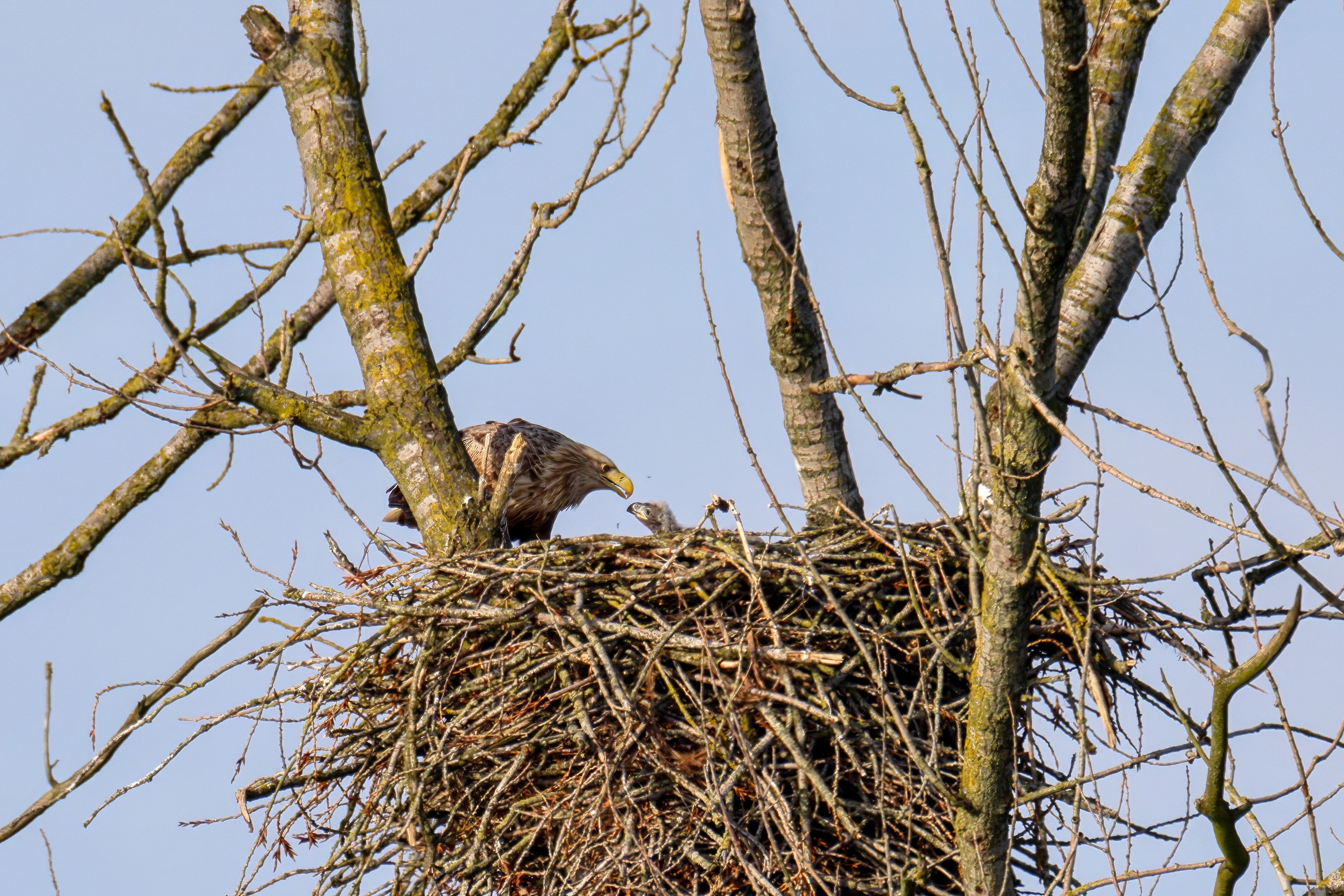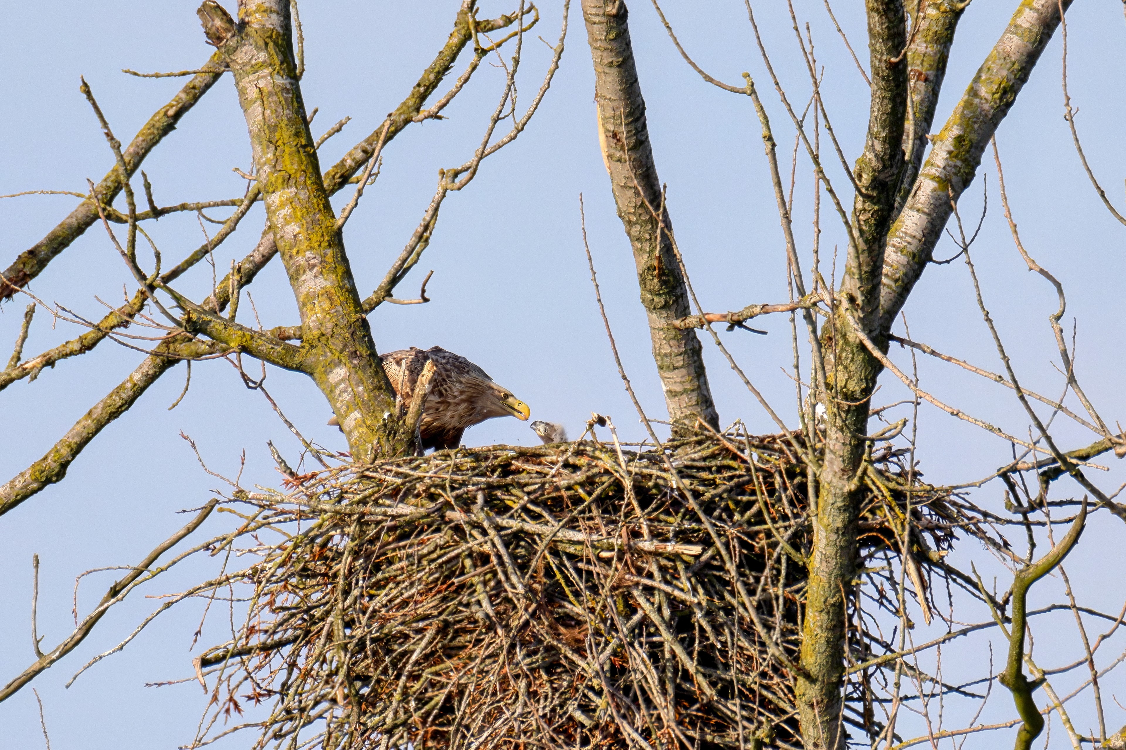 Vorbildlich versorgt das Seeadlereibchen ihre Nestlinge