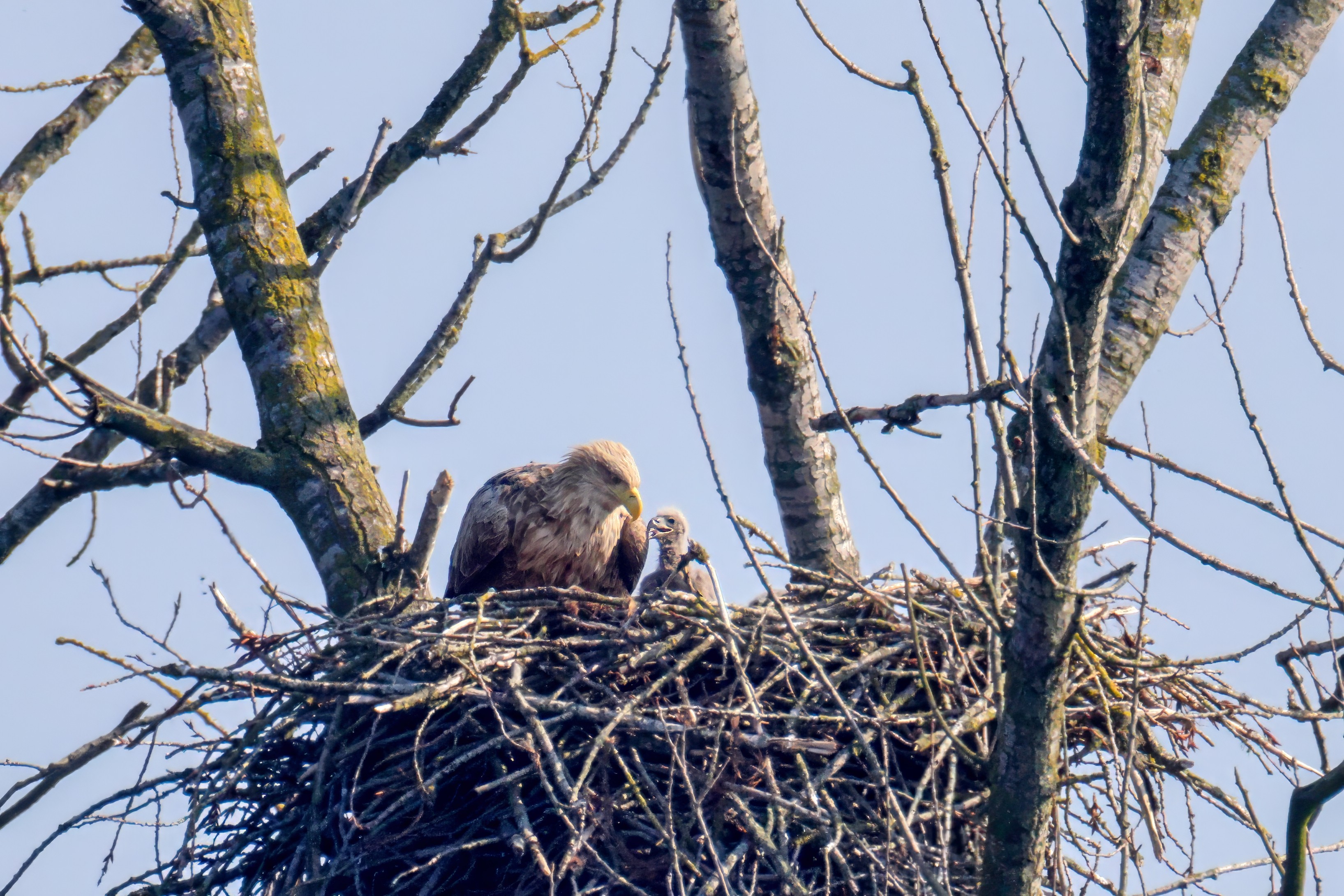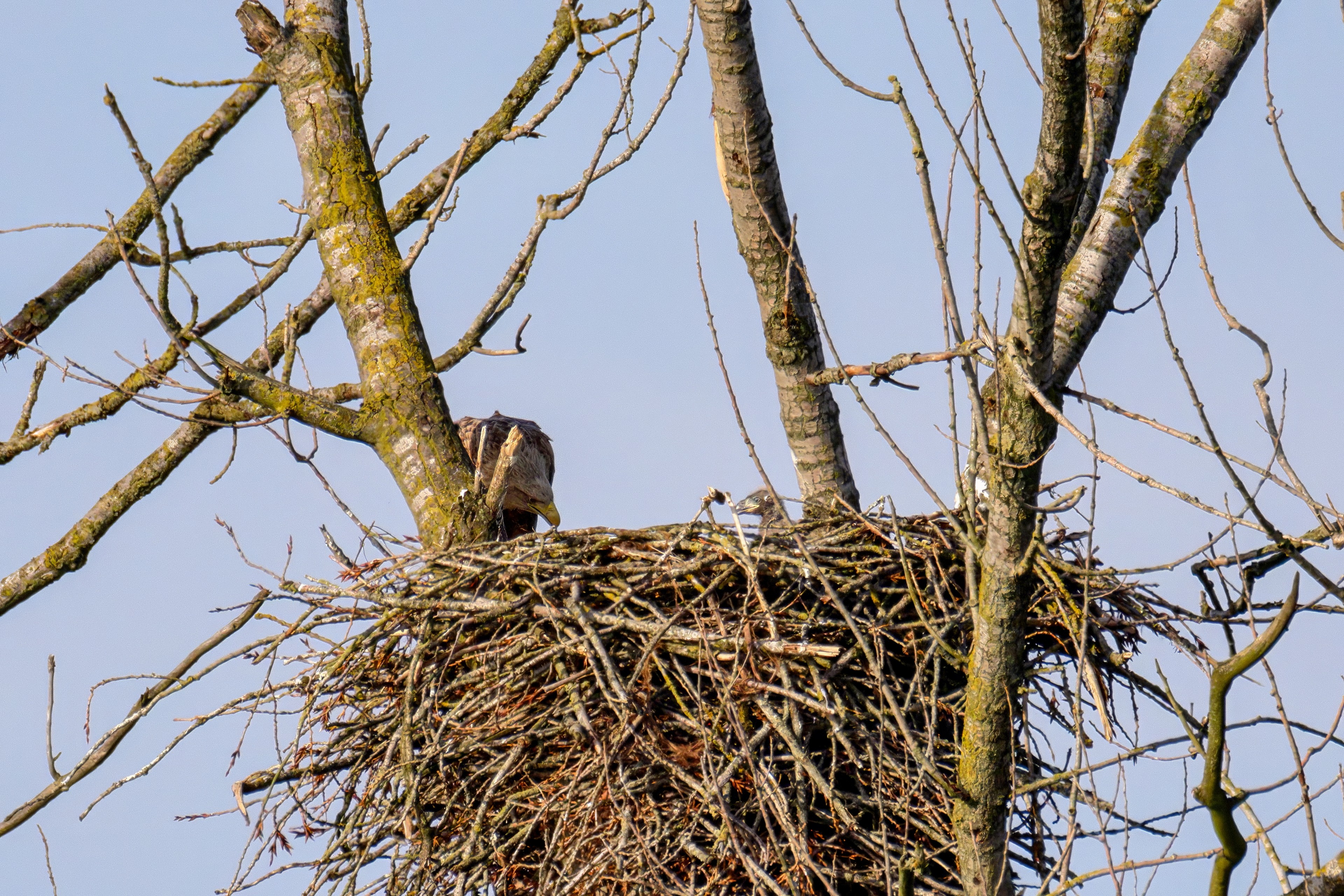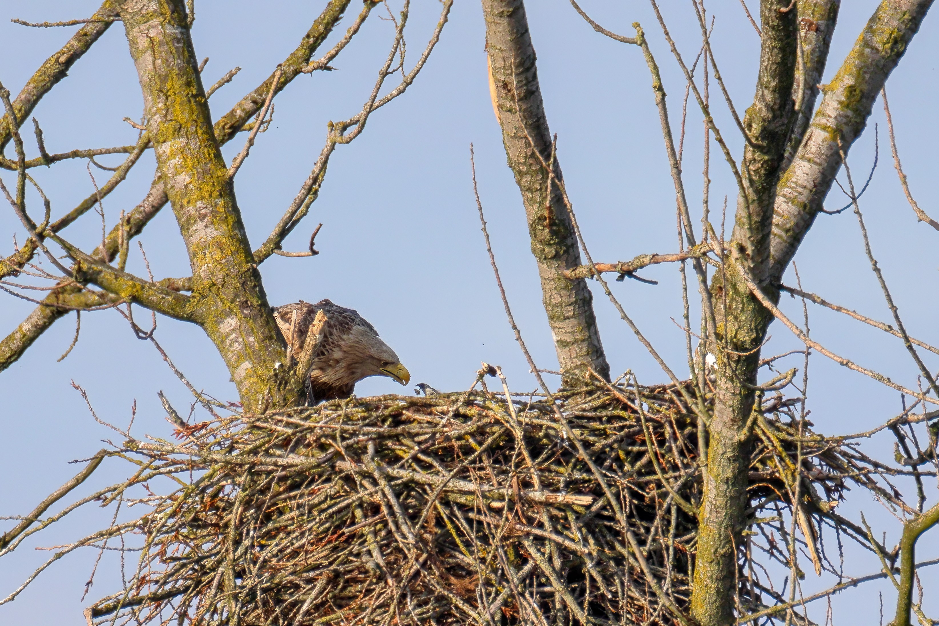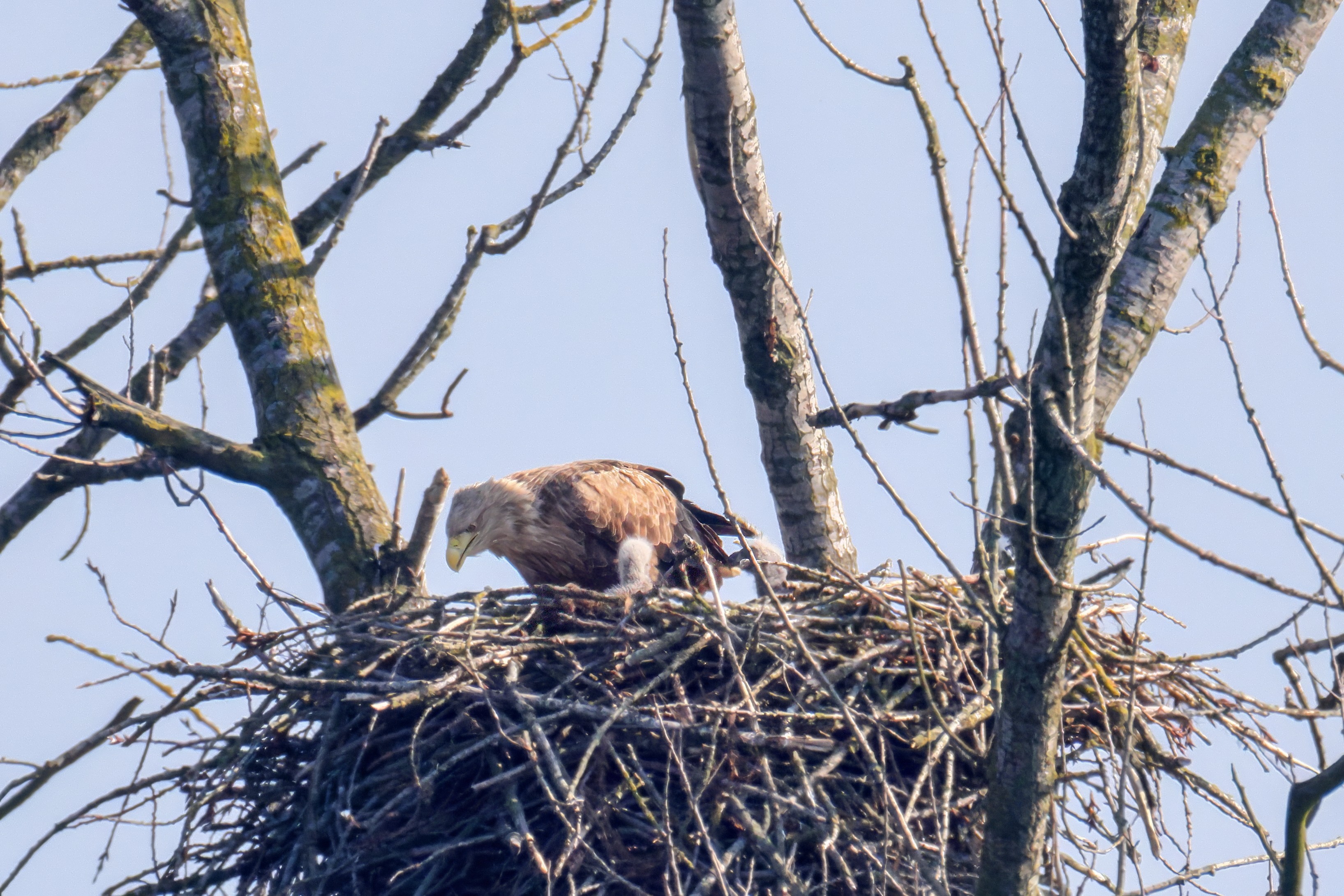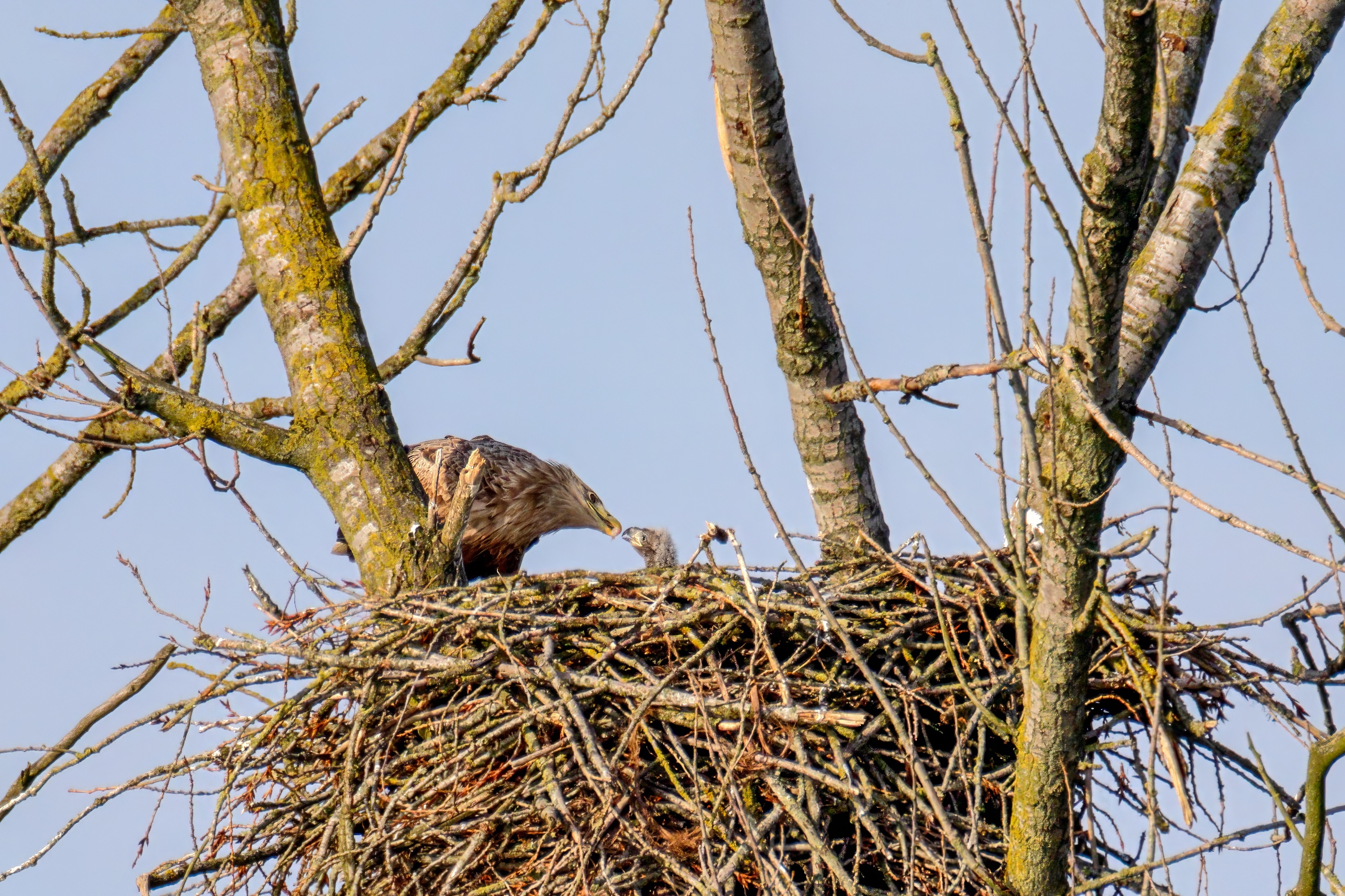 Vorbildlich versorgt das Seeadlereibchen ihre Nestlinge