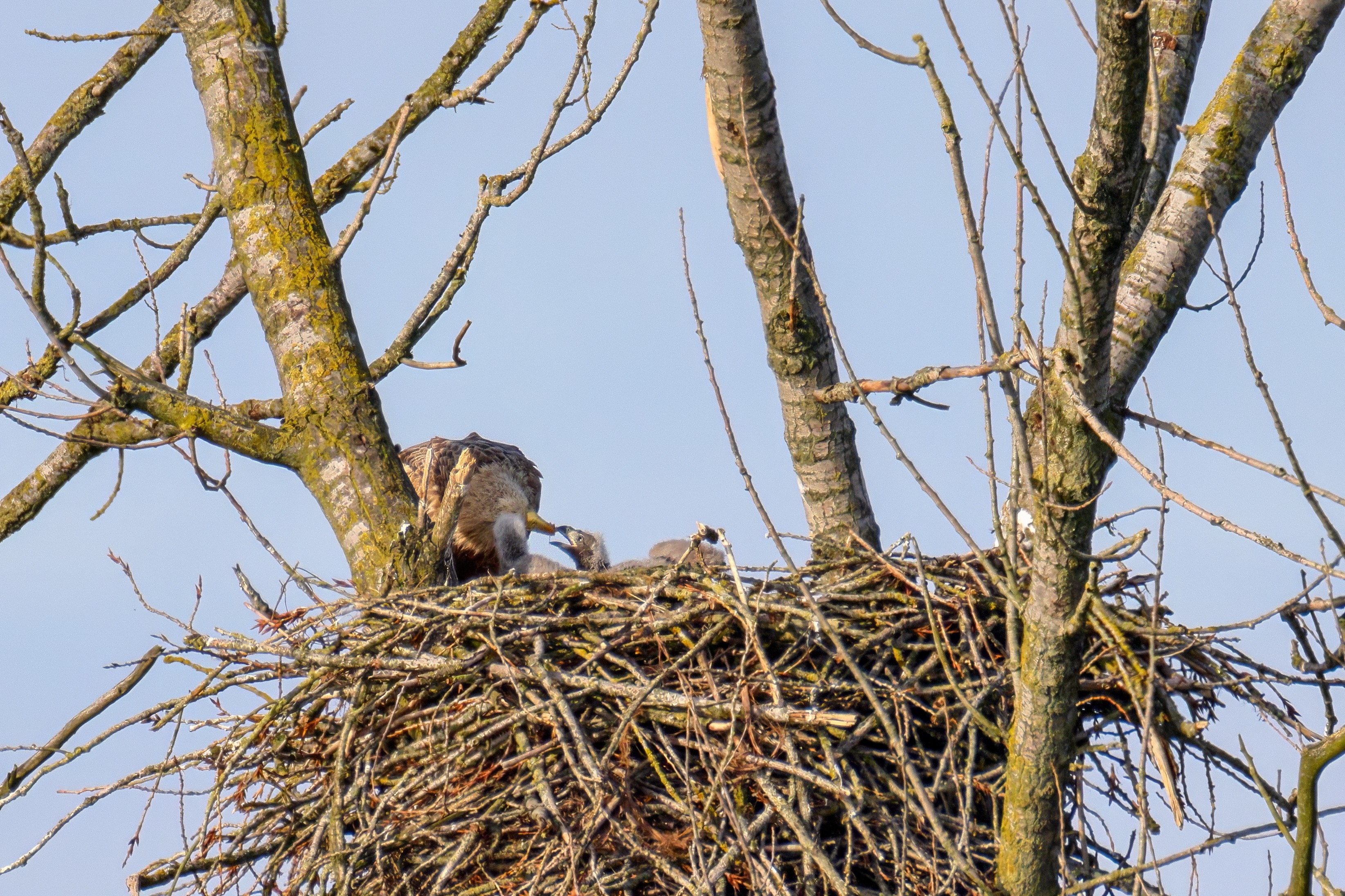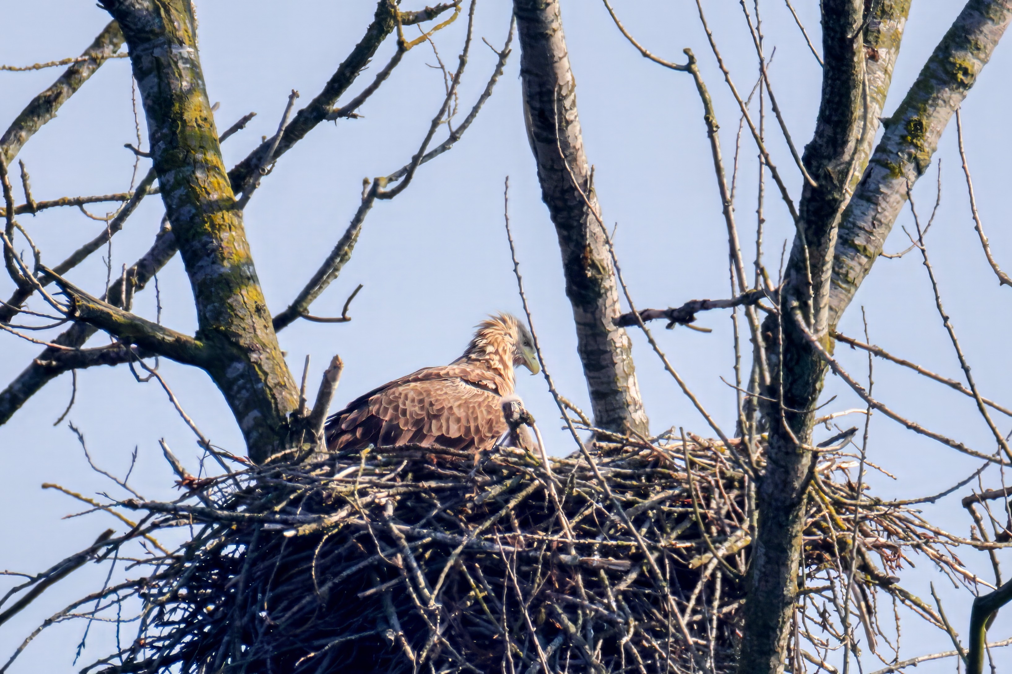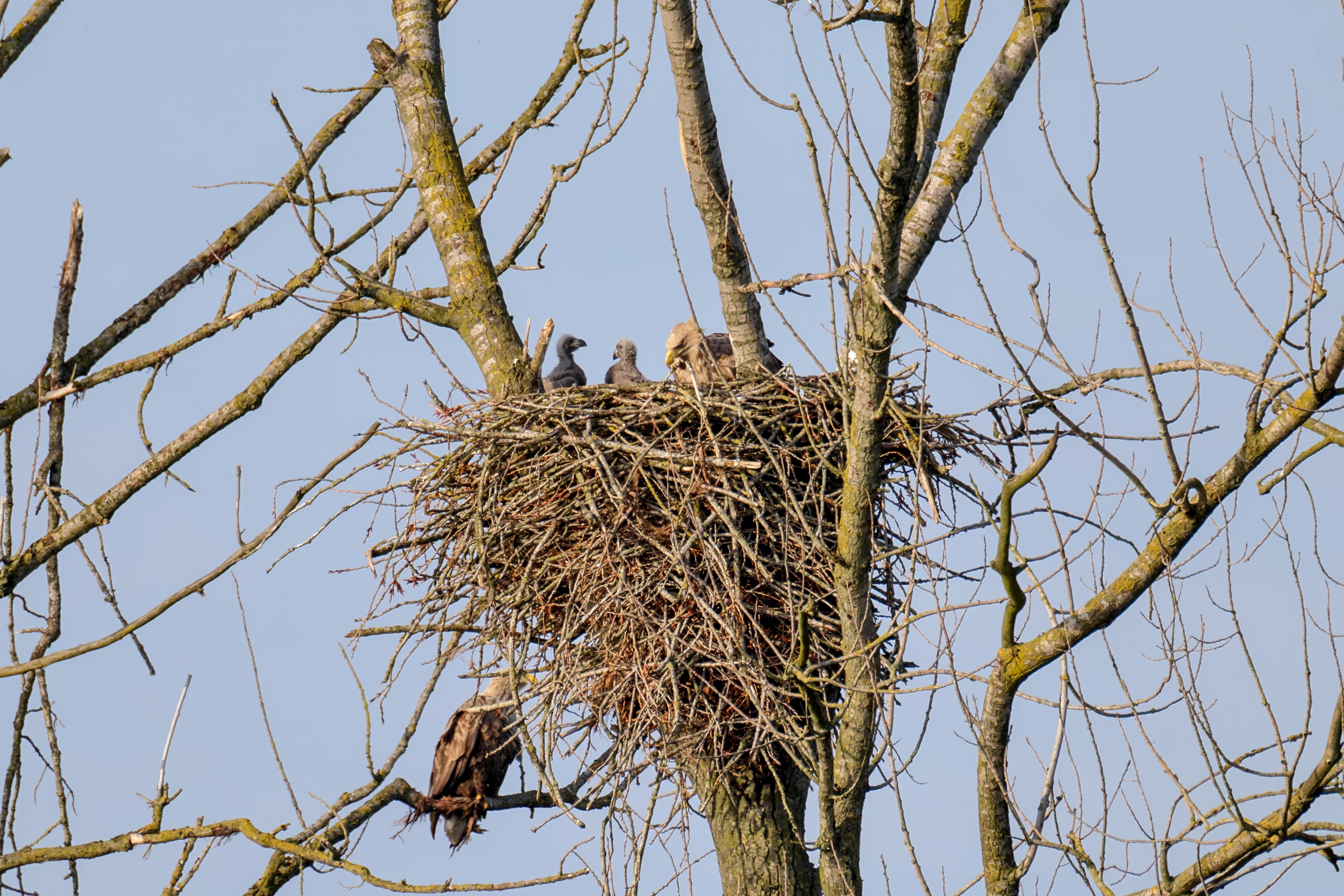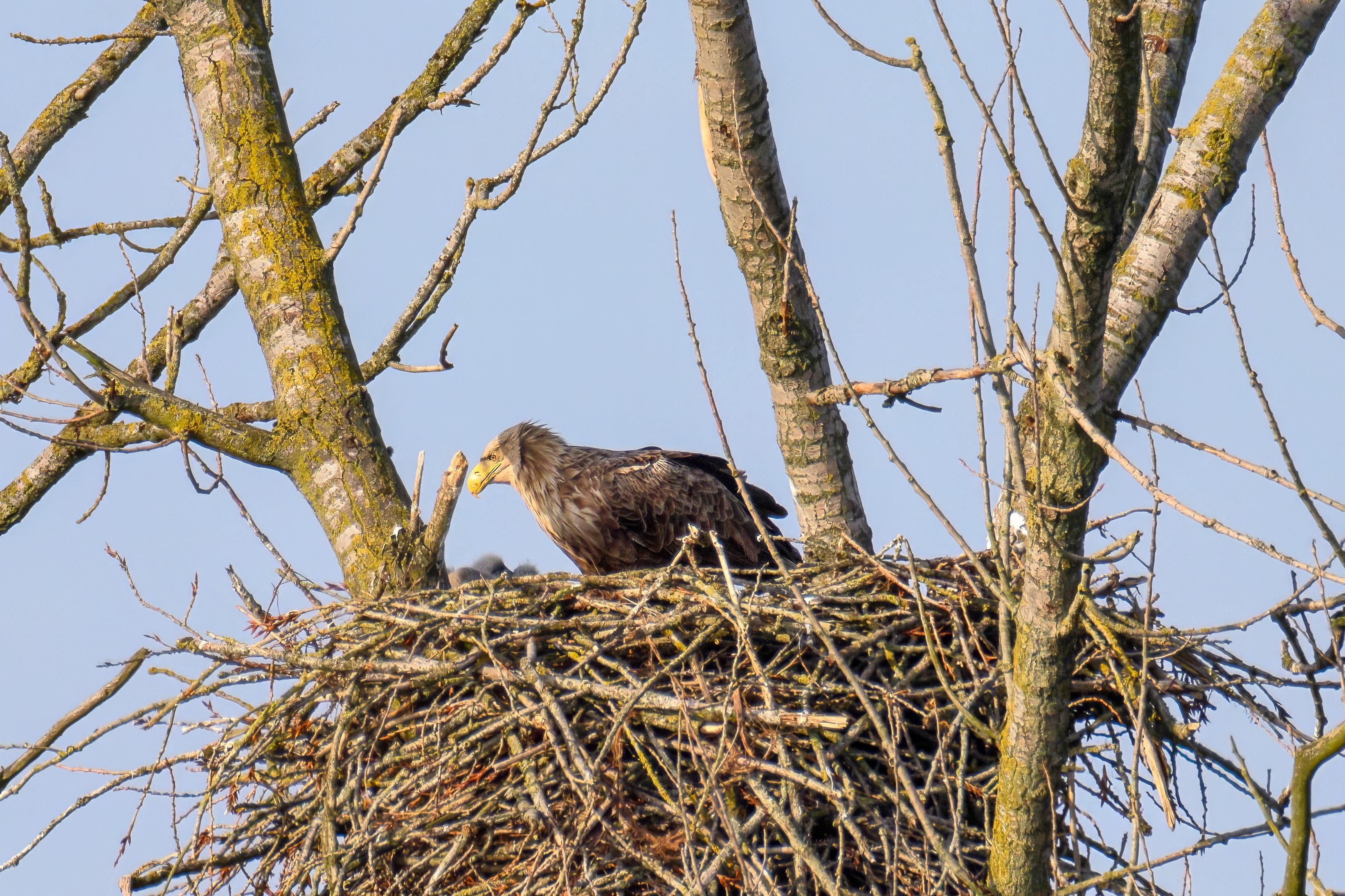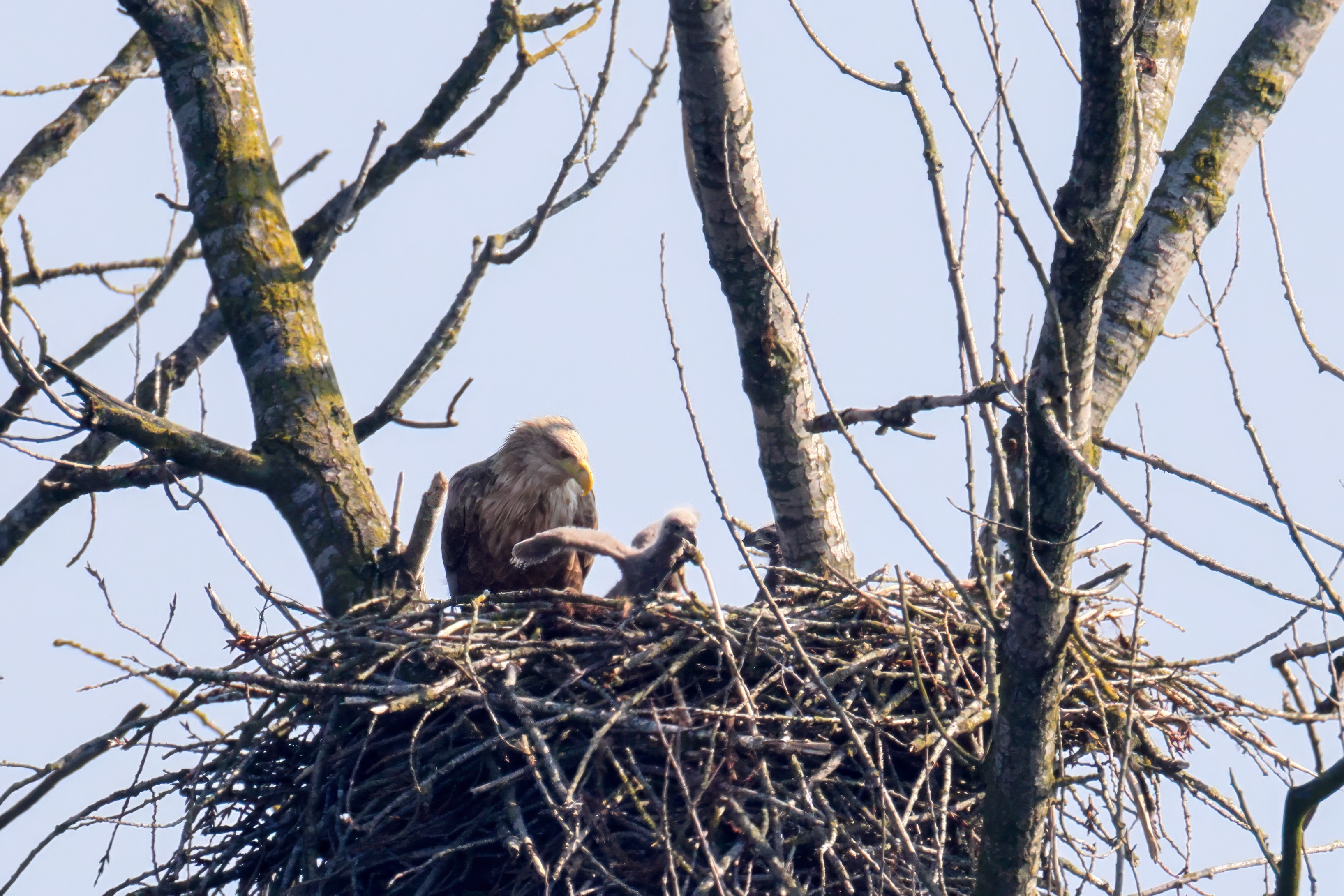 Vorbildlich versorgt das Seeadlereibchen ihre Nestlinge