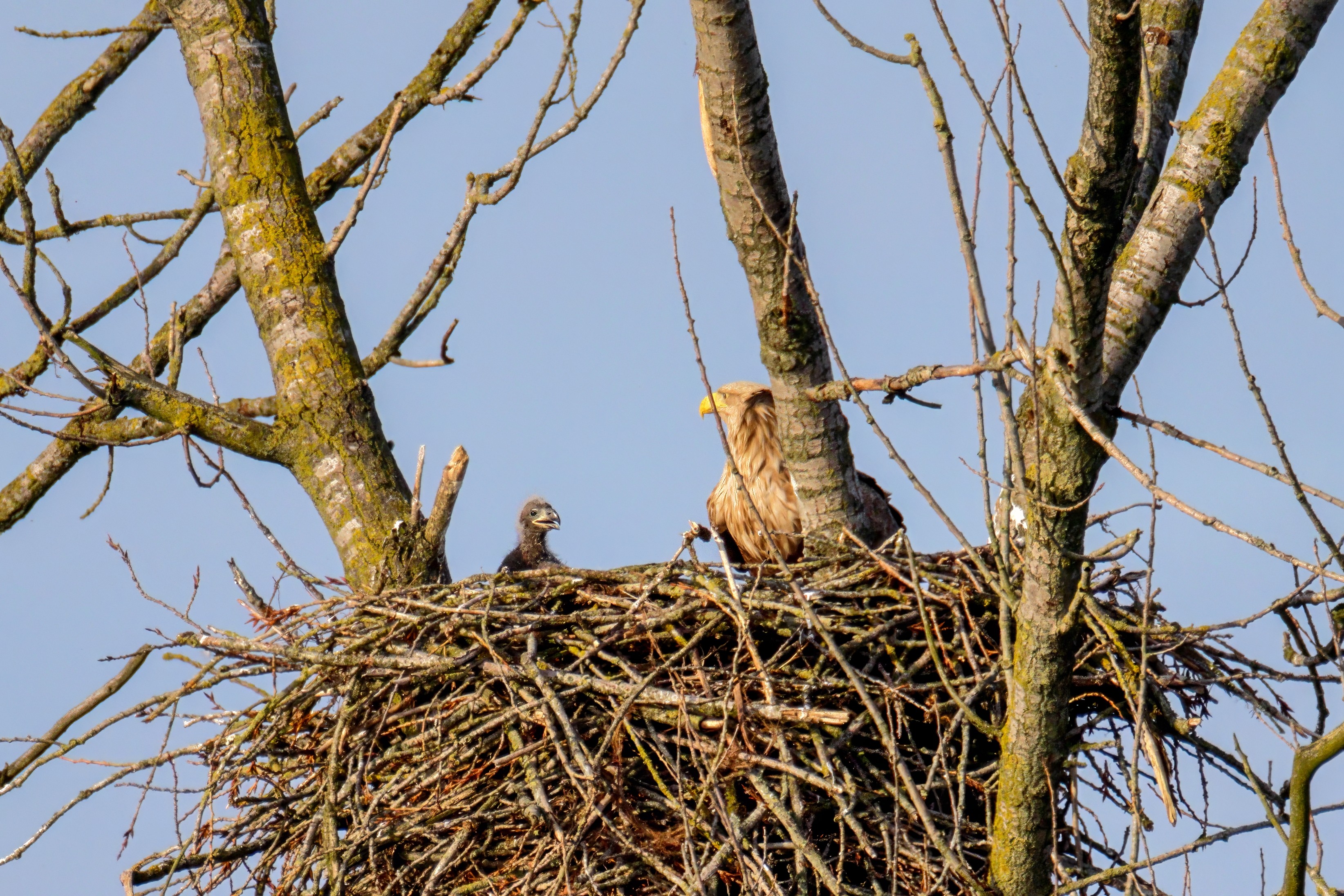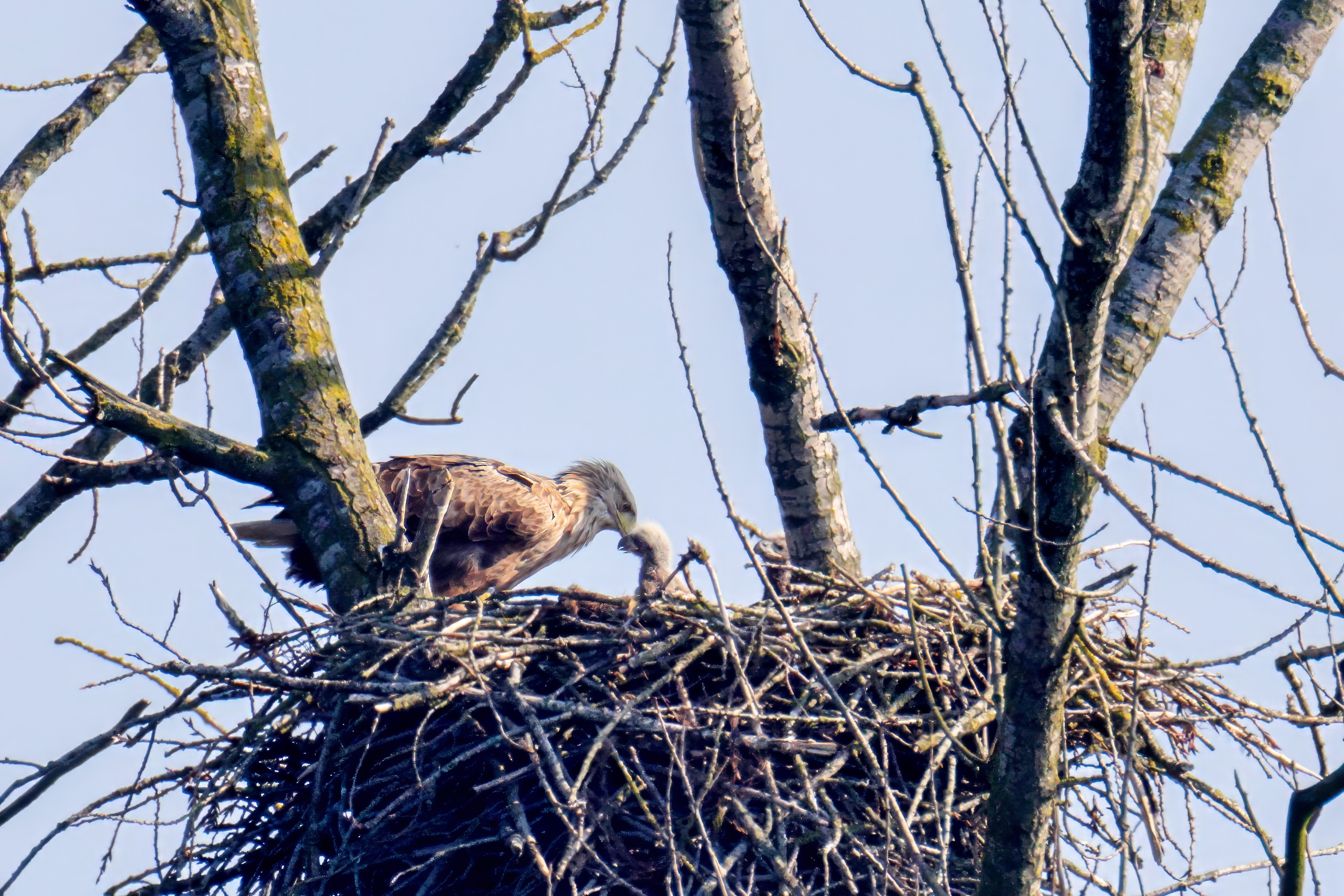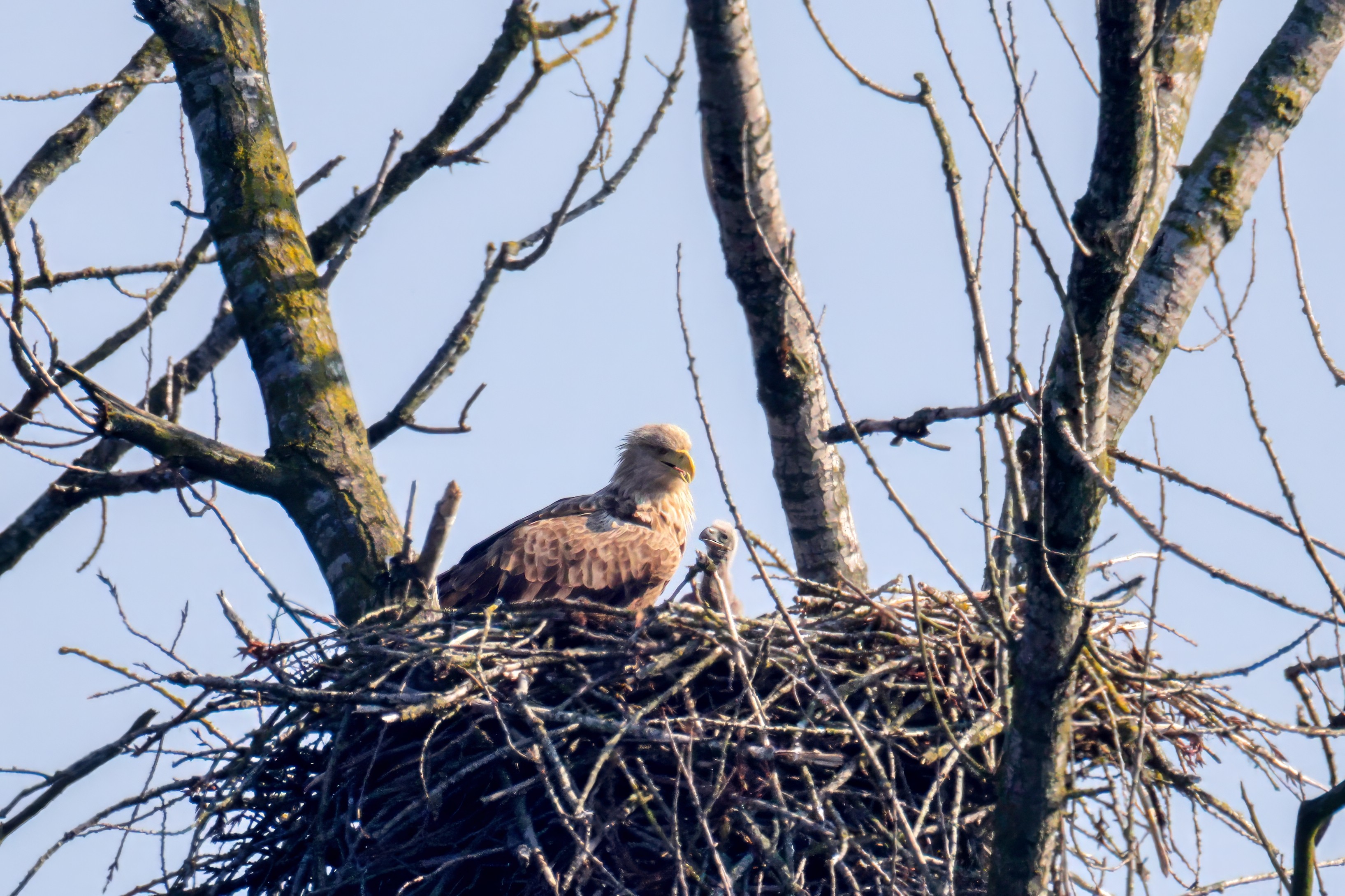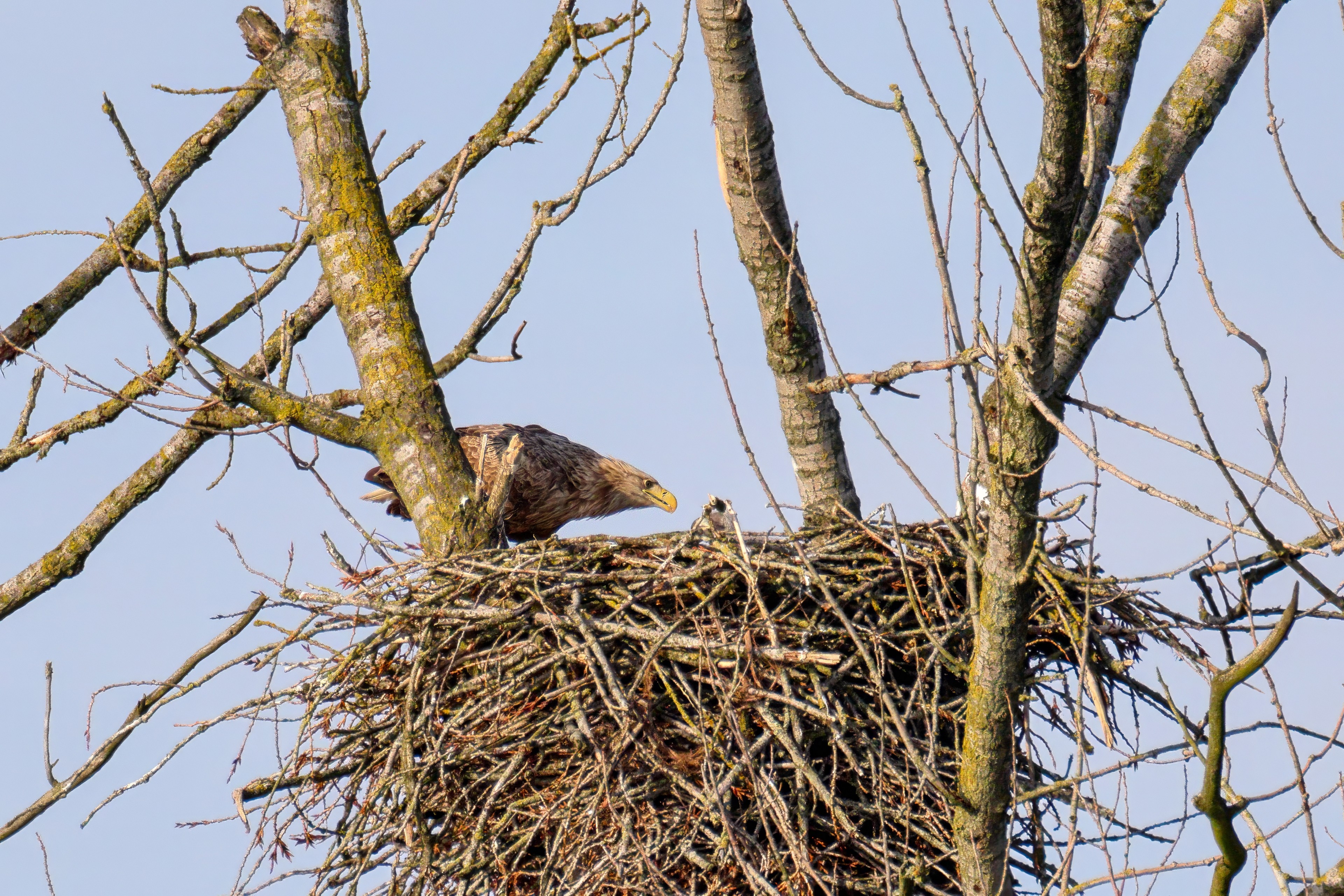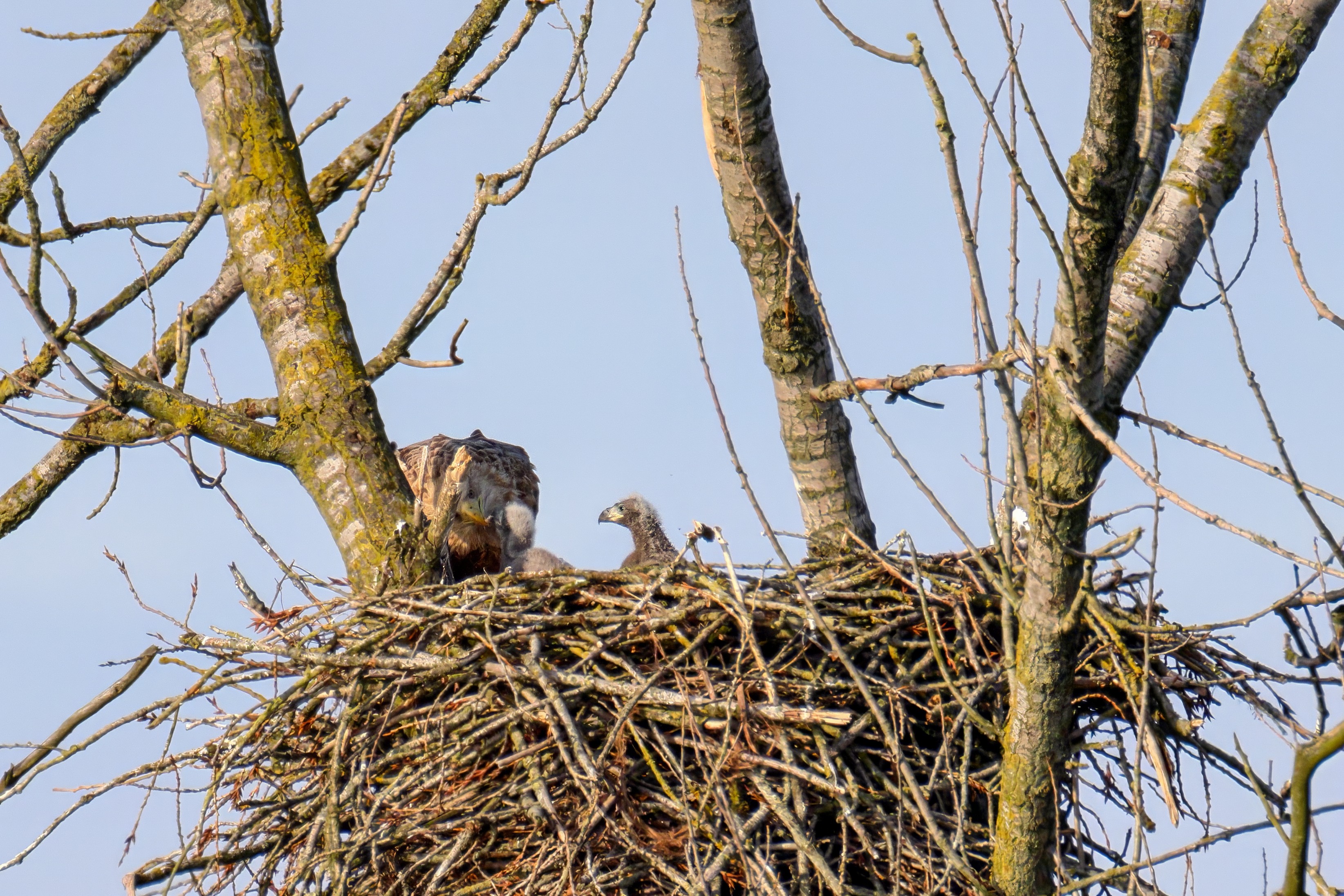 Vorbildlich versorgt das Seeadlereibchen ihre Nestlinge