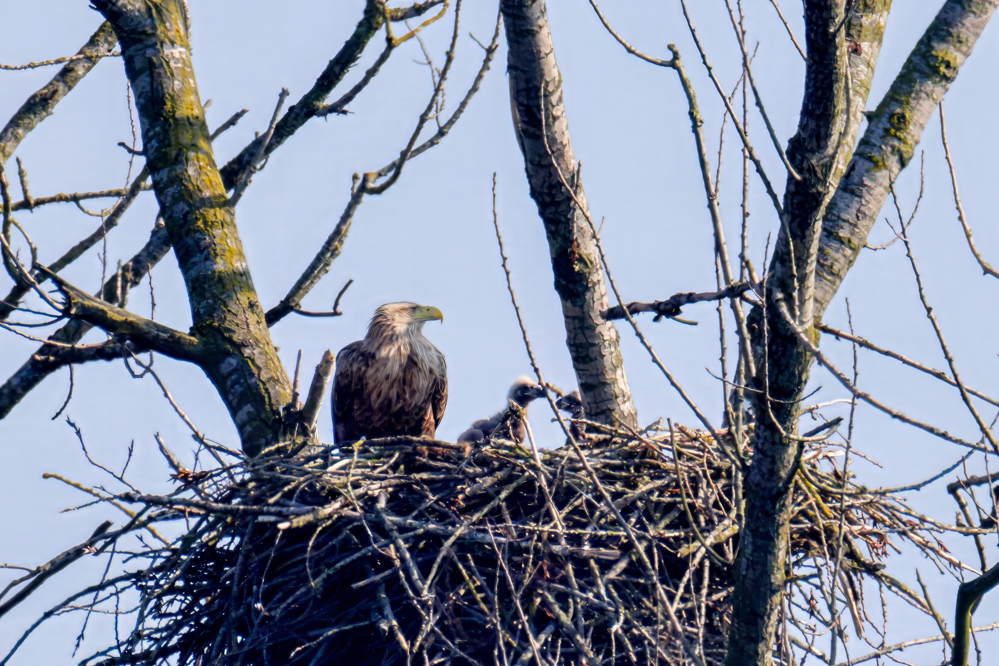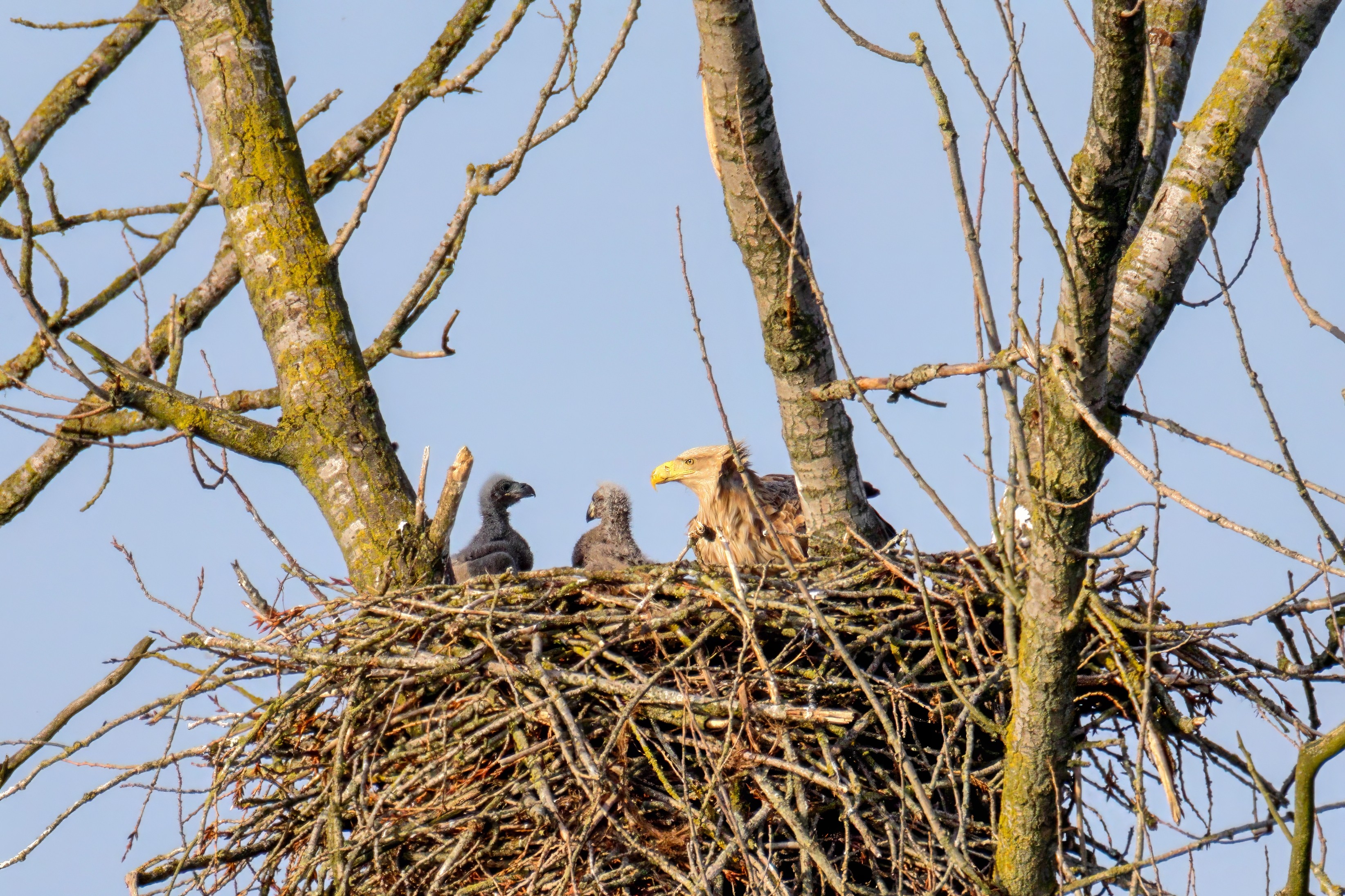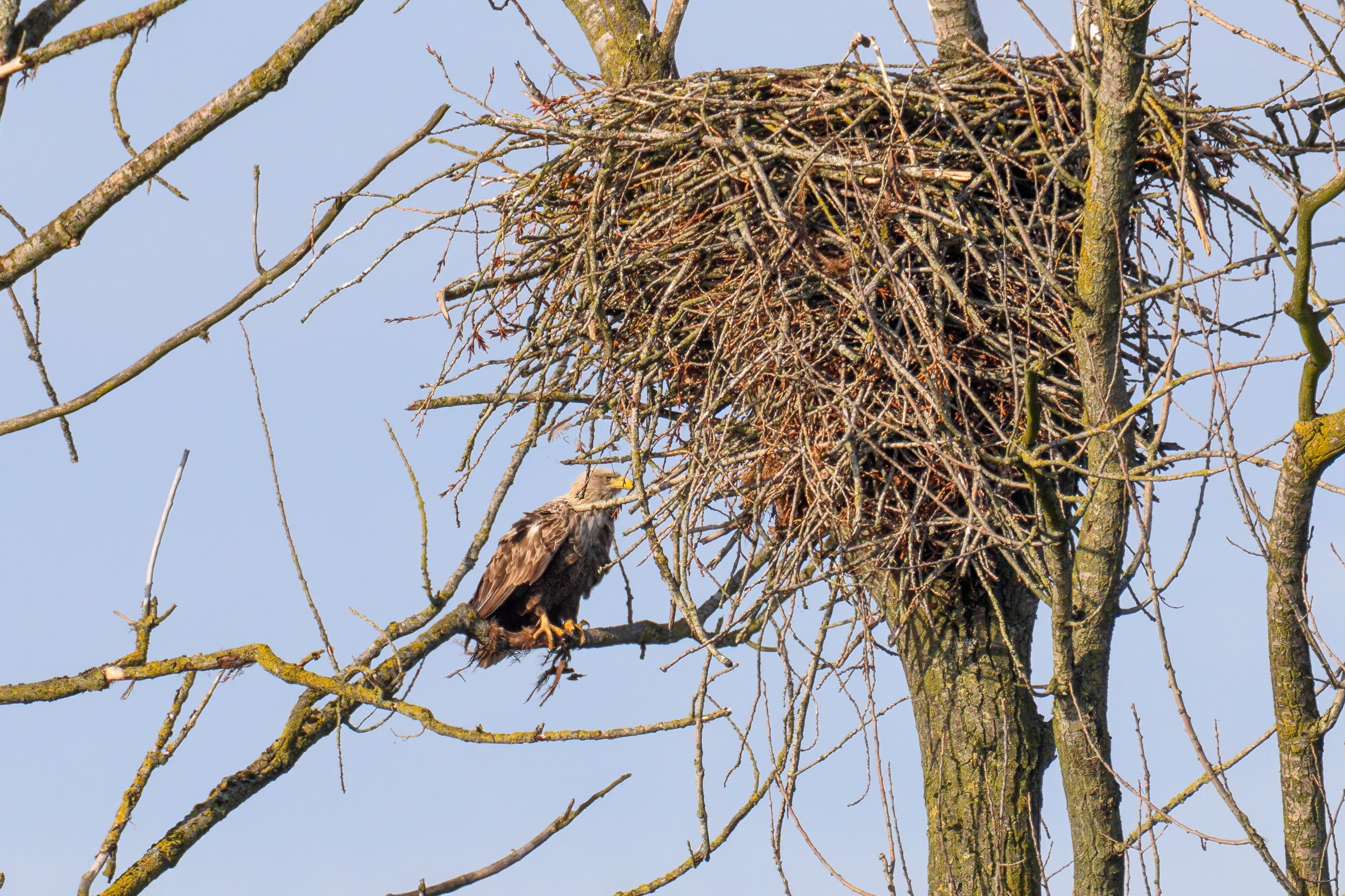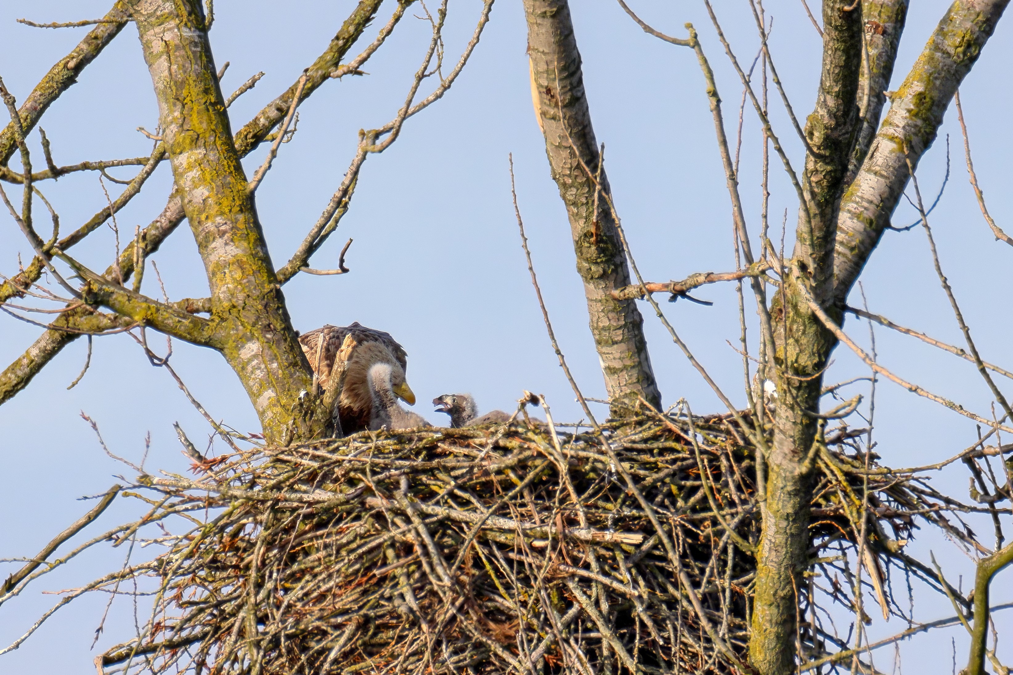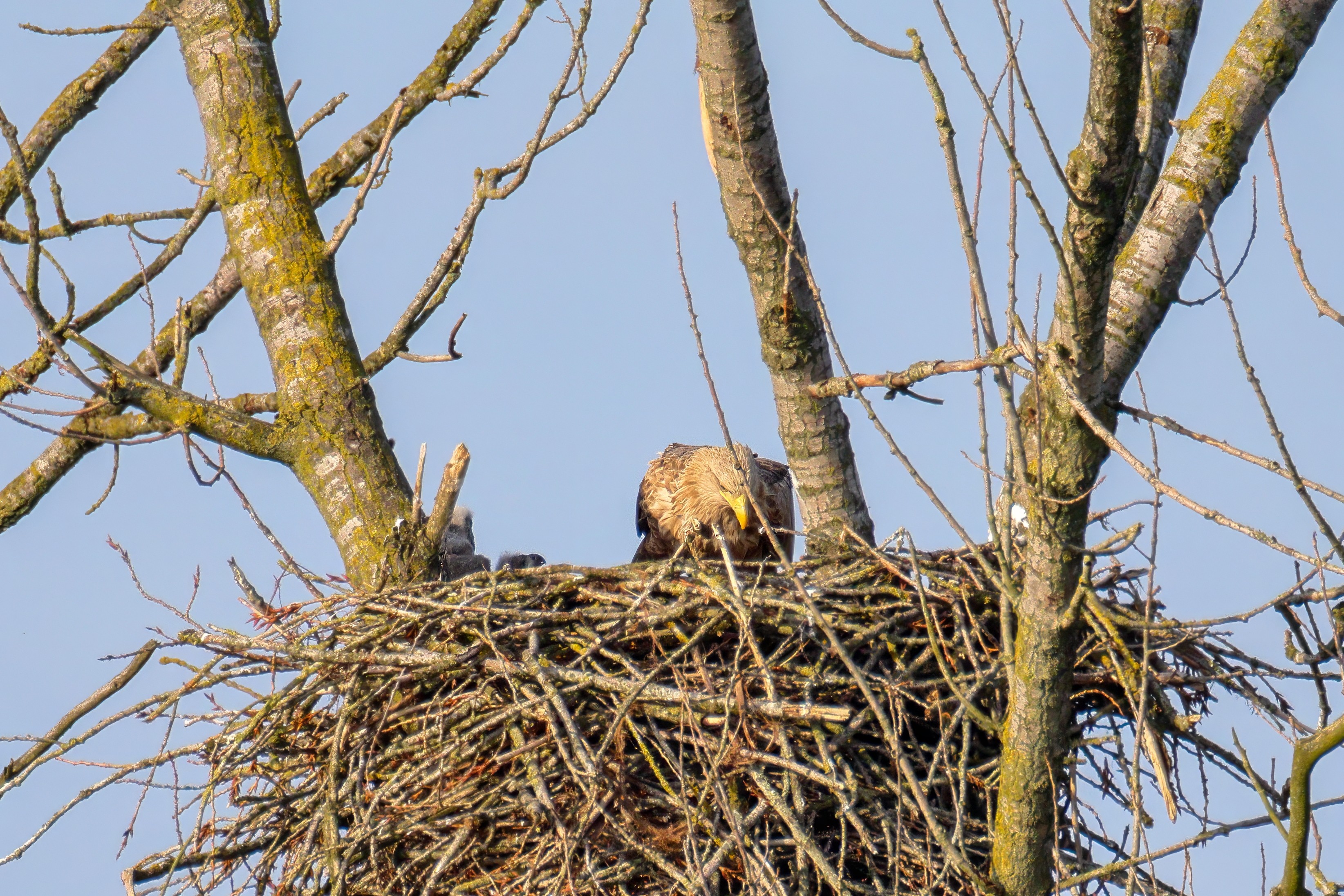 Vorbildlich versorgt das Seeadlereibchen ihre Nestlinge