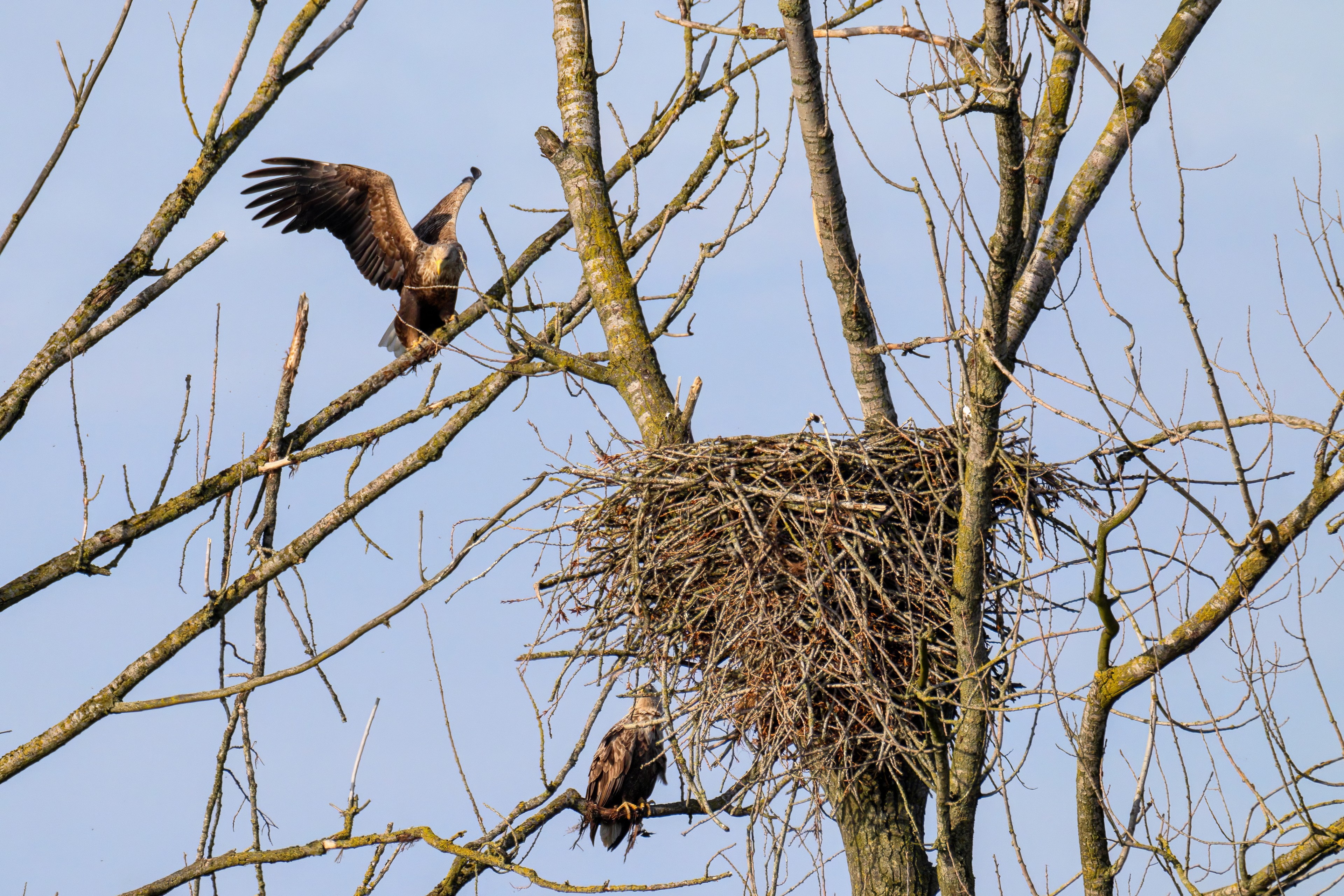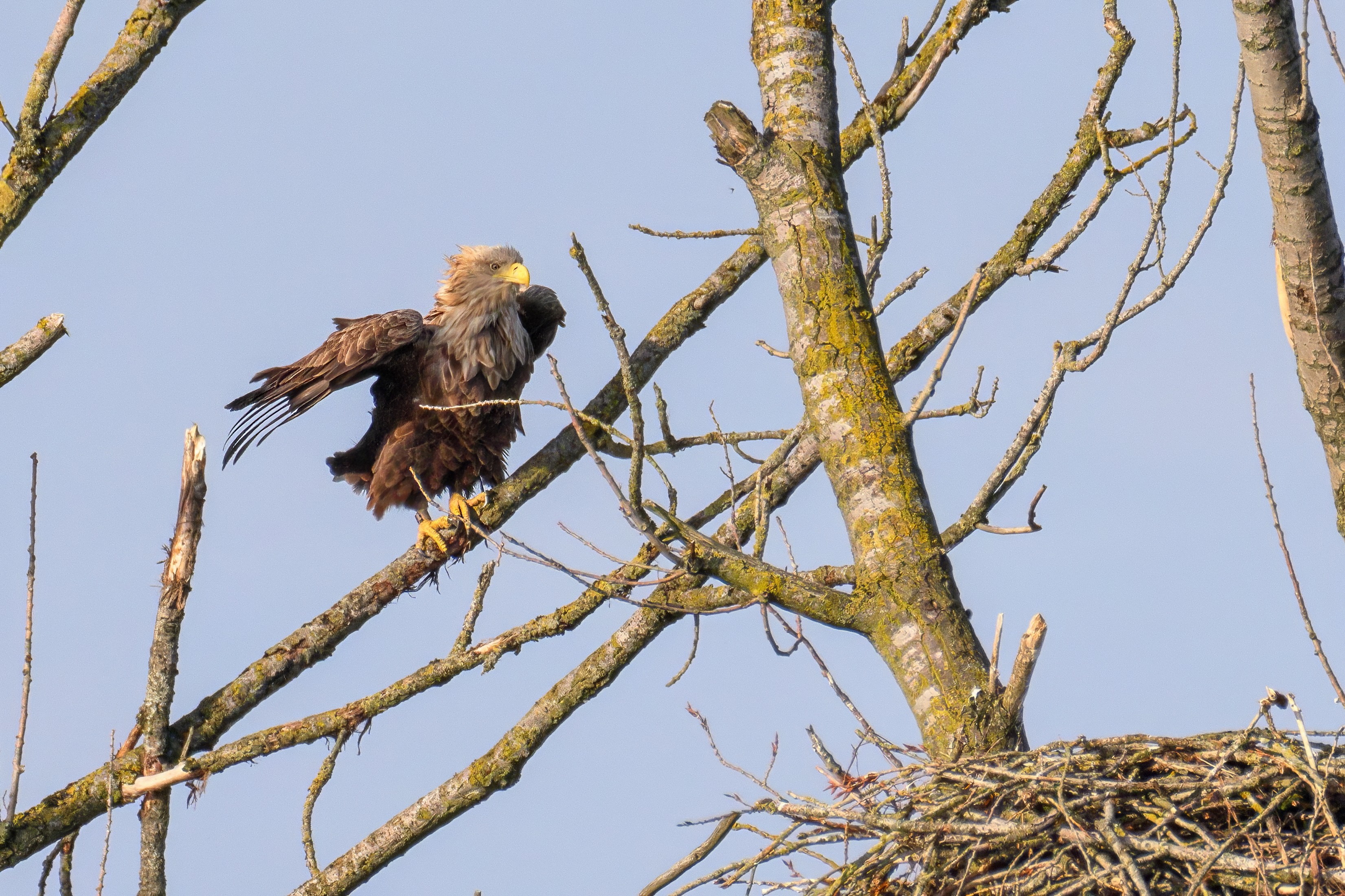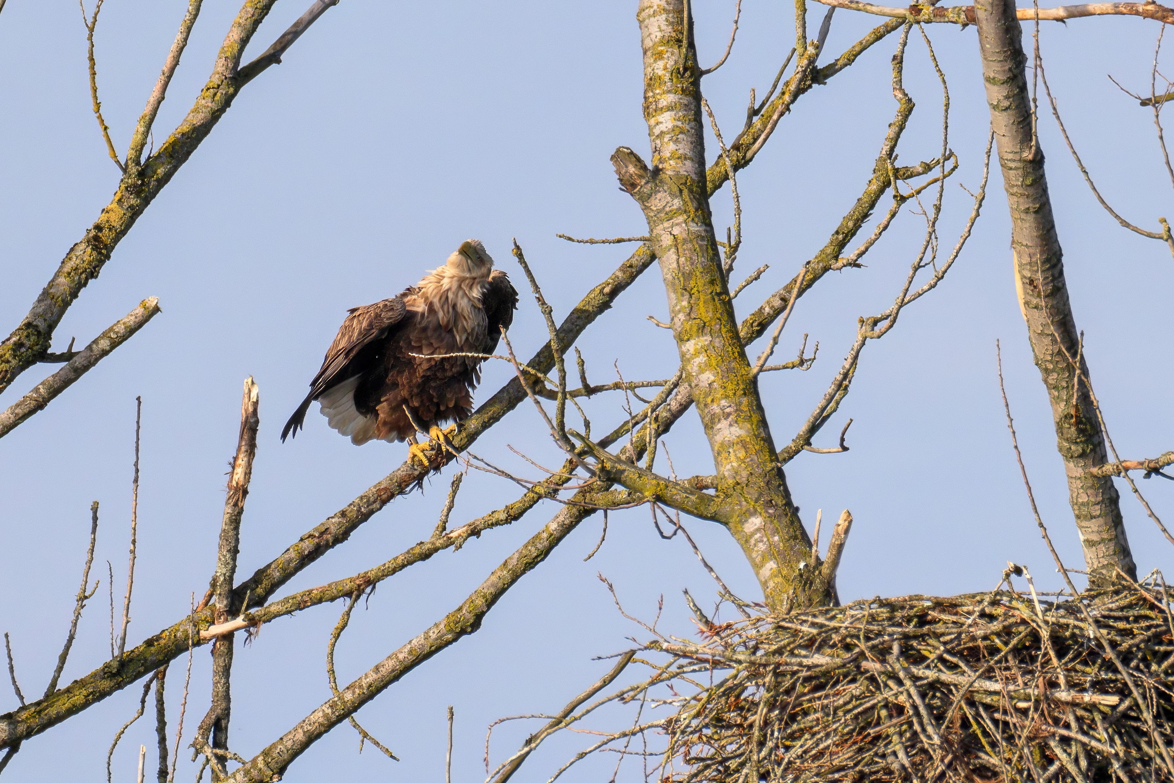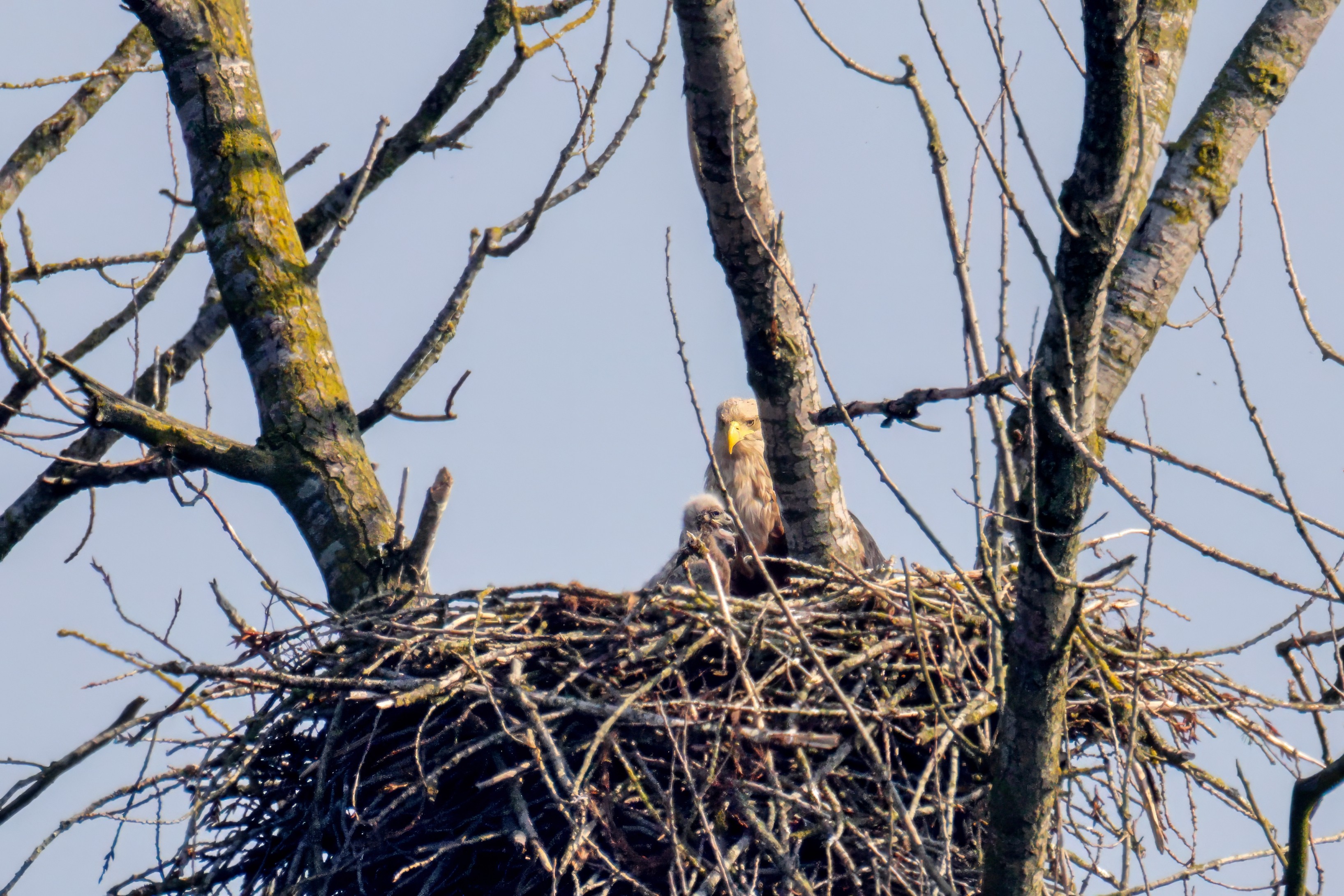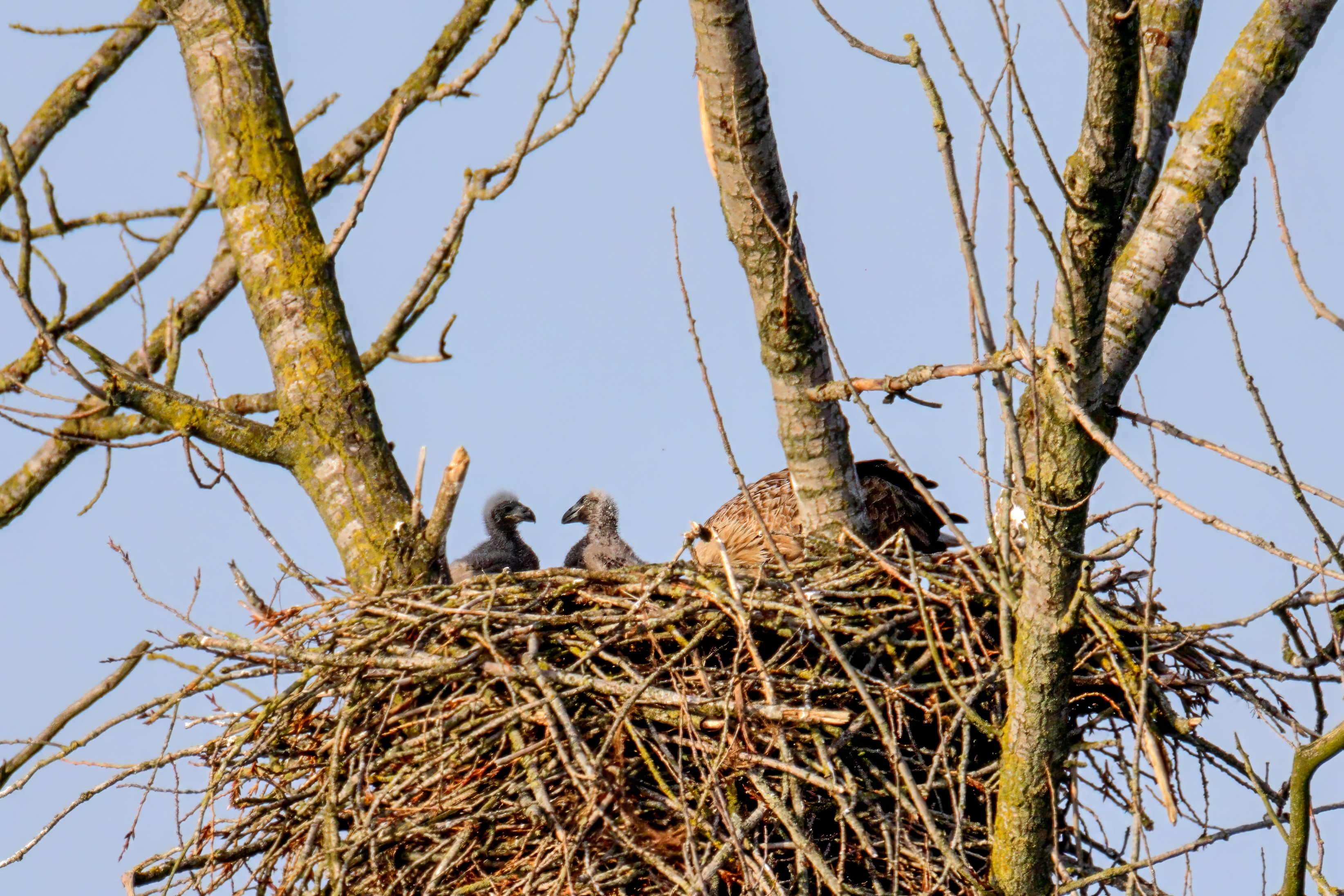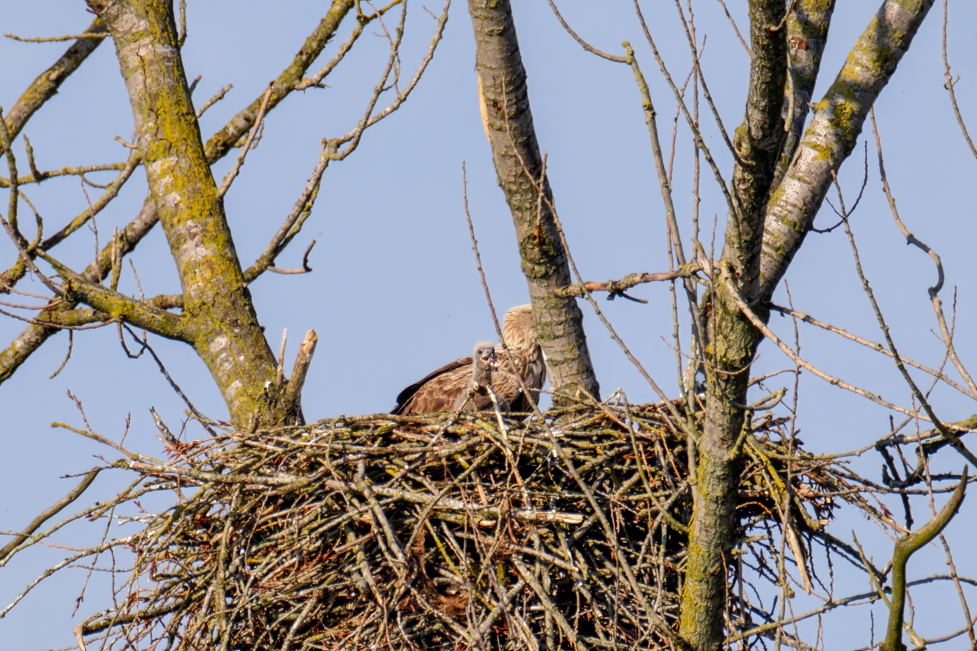 Vorbildlich versorgt das Seeadlereibchen ihre Nestlinge