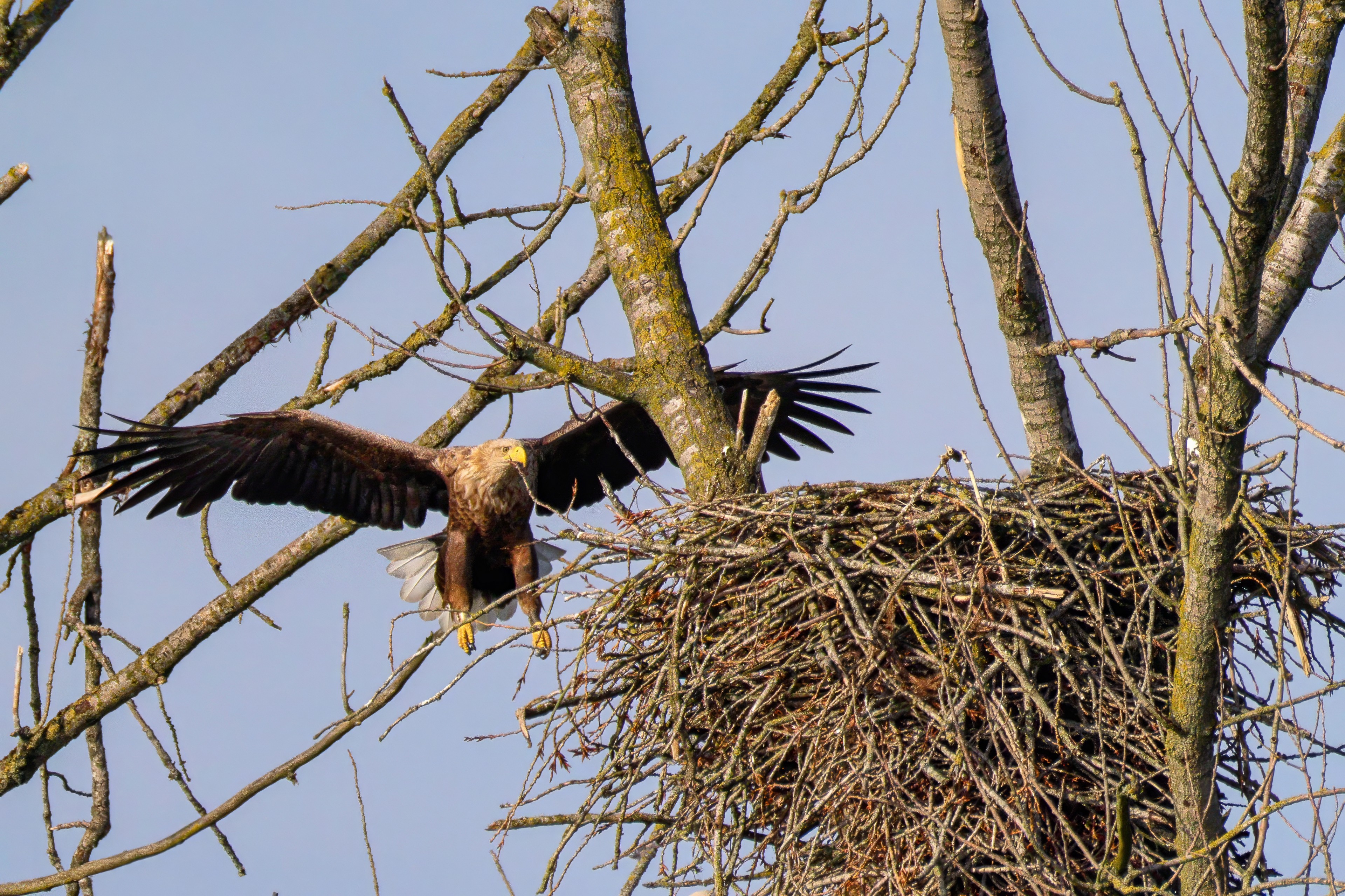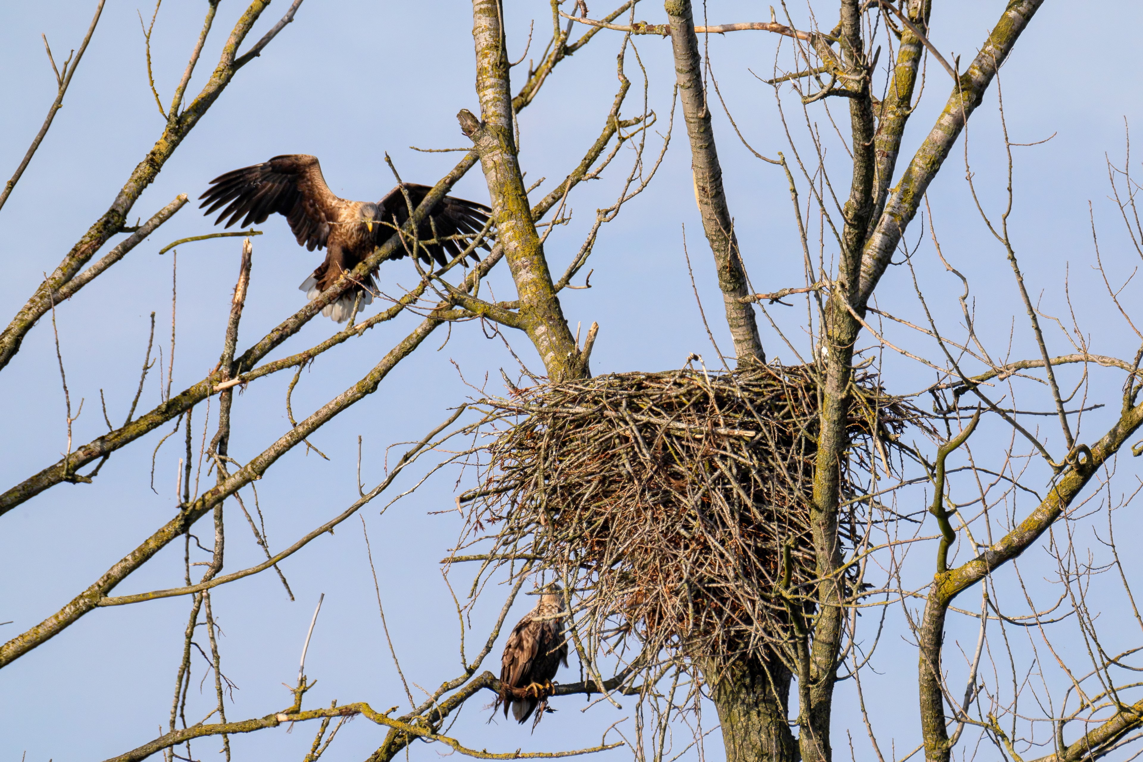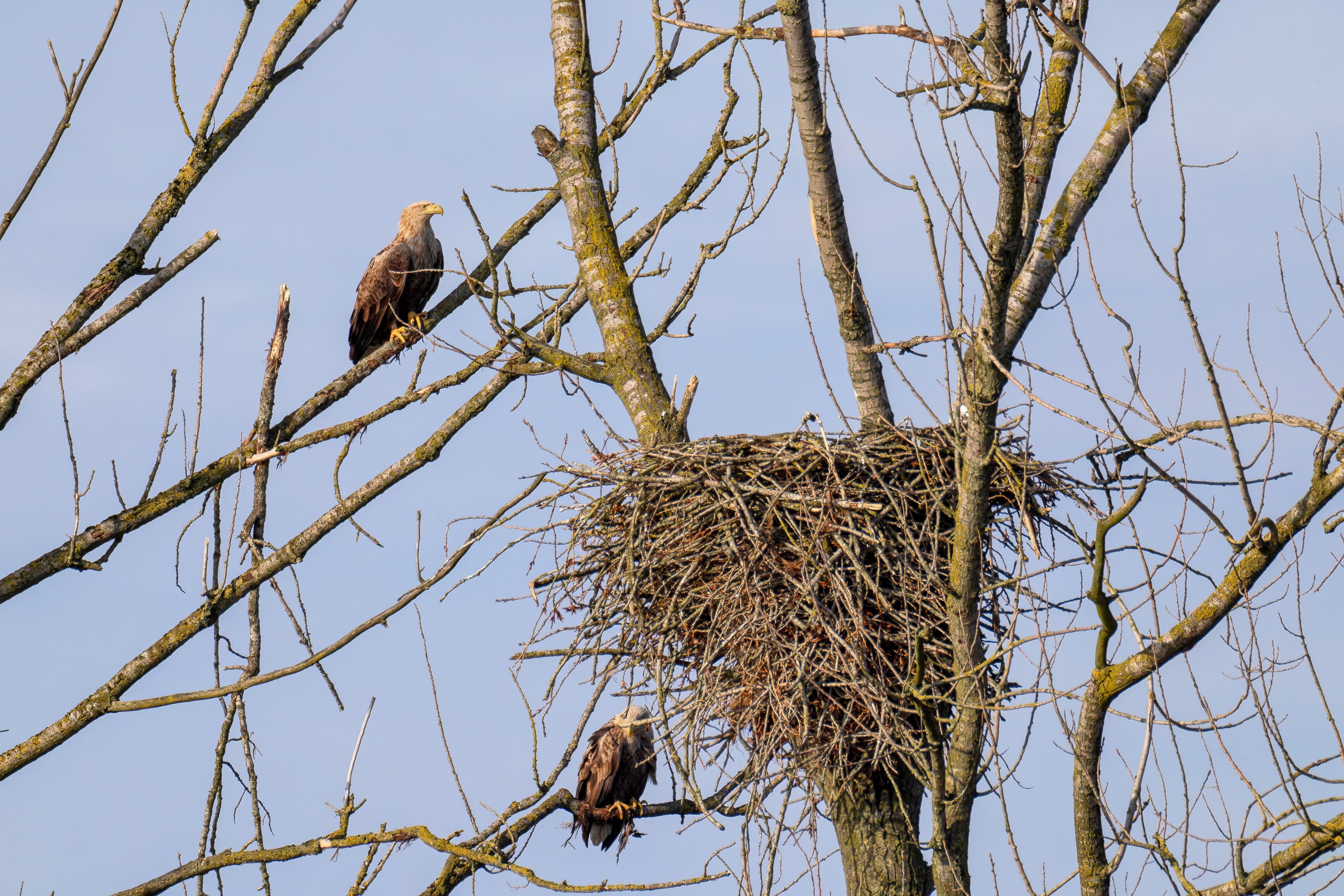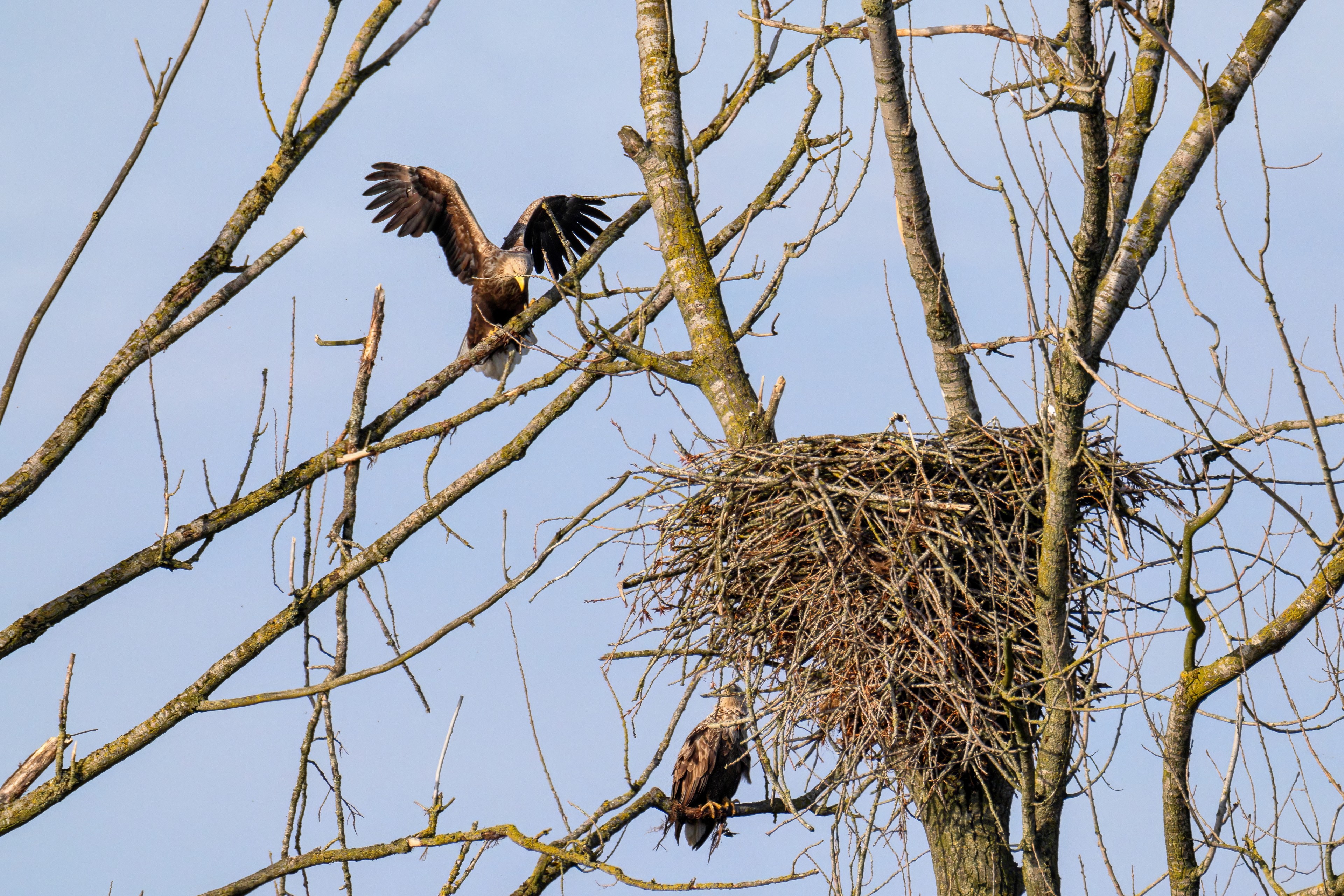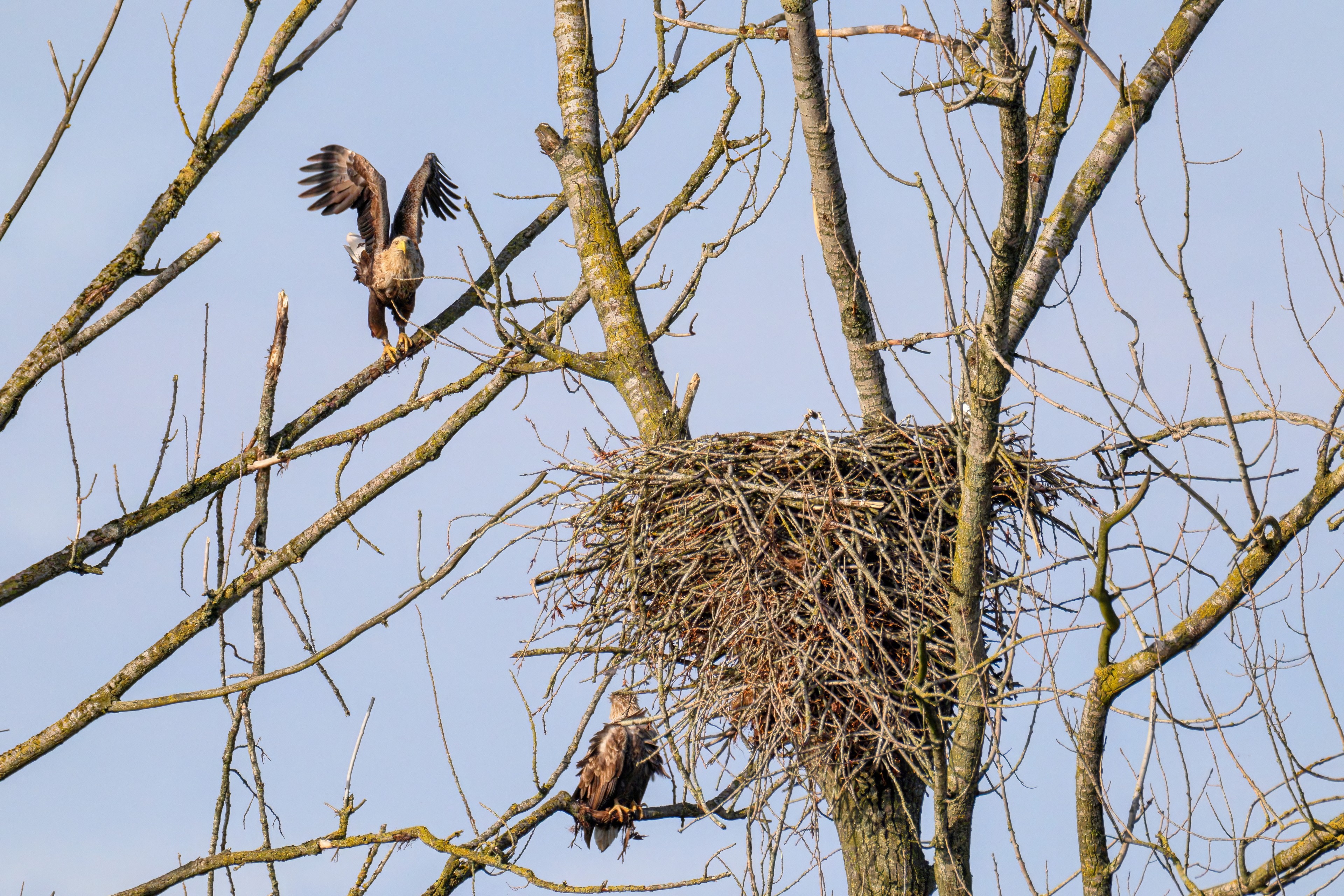 Vorbildlich versorgt das Seeadlereibchen ihre Nestlinge