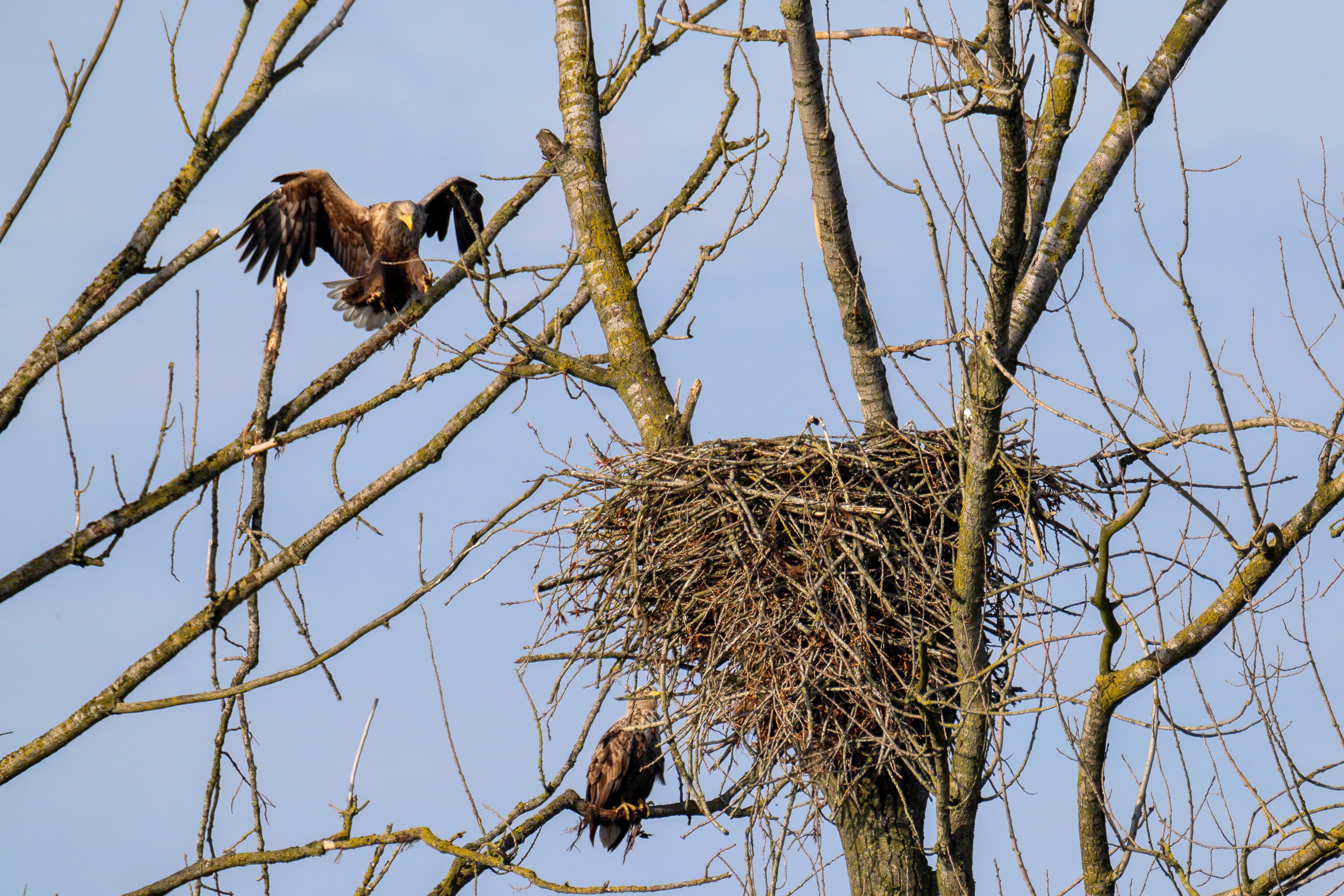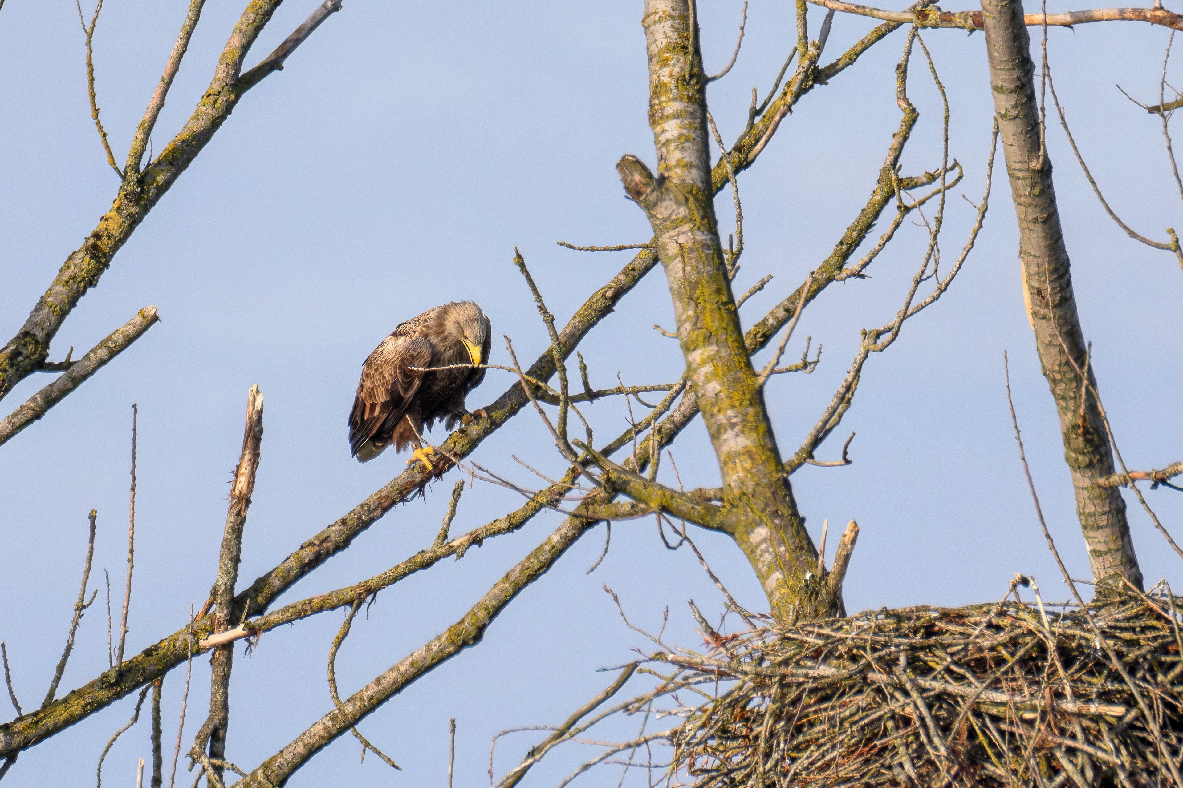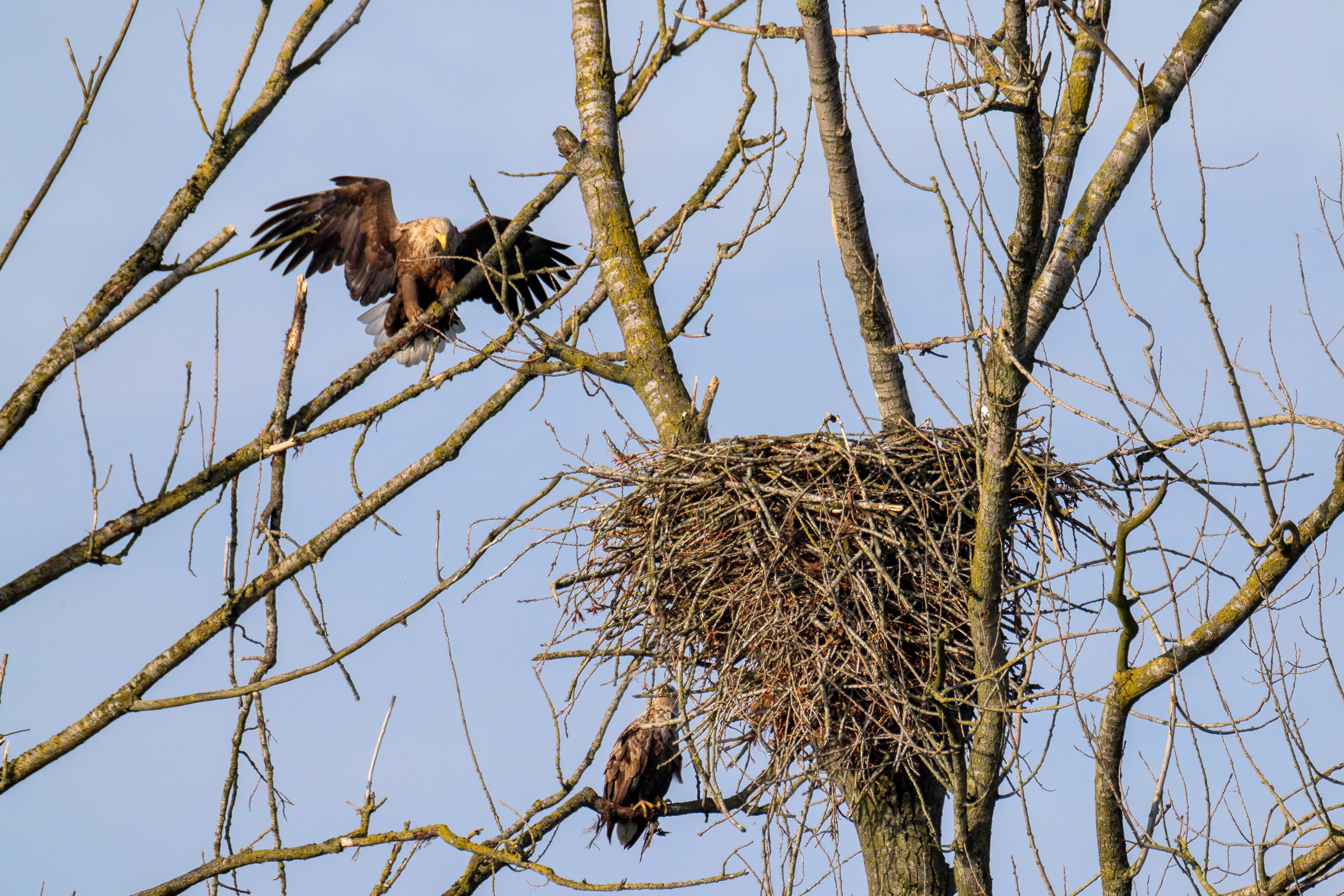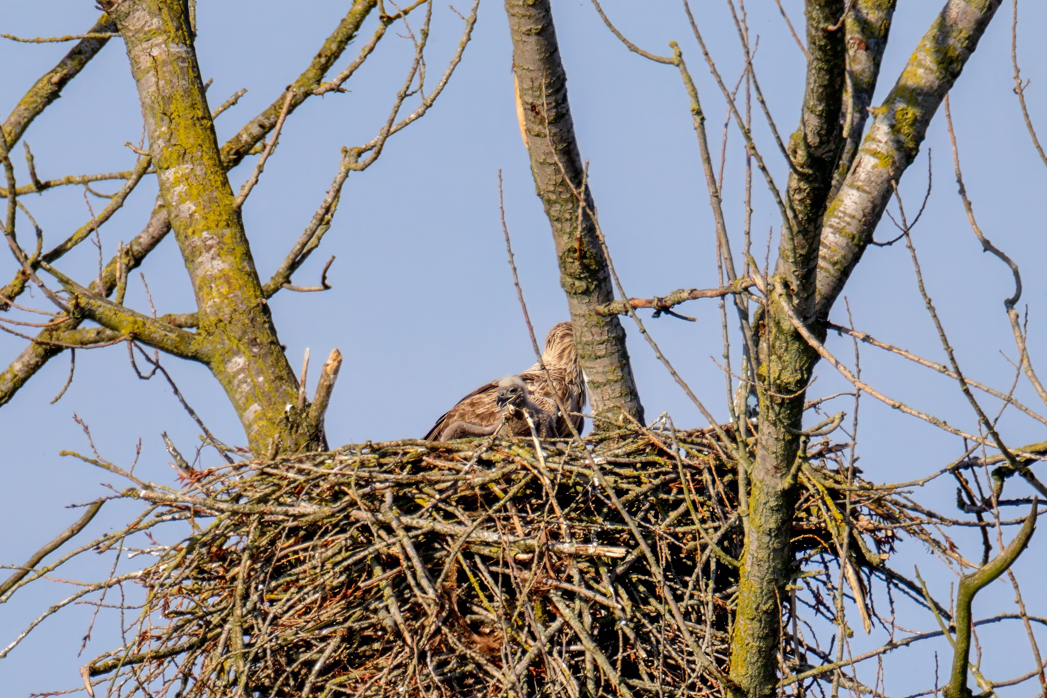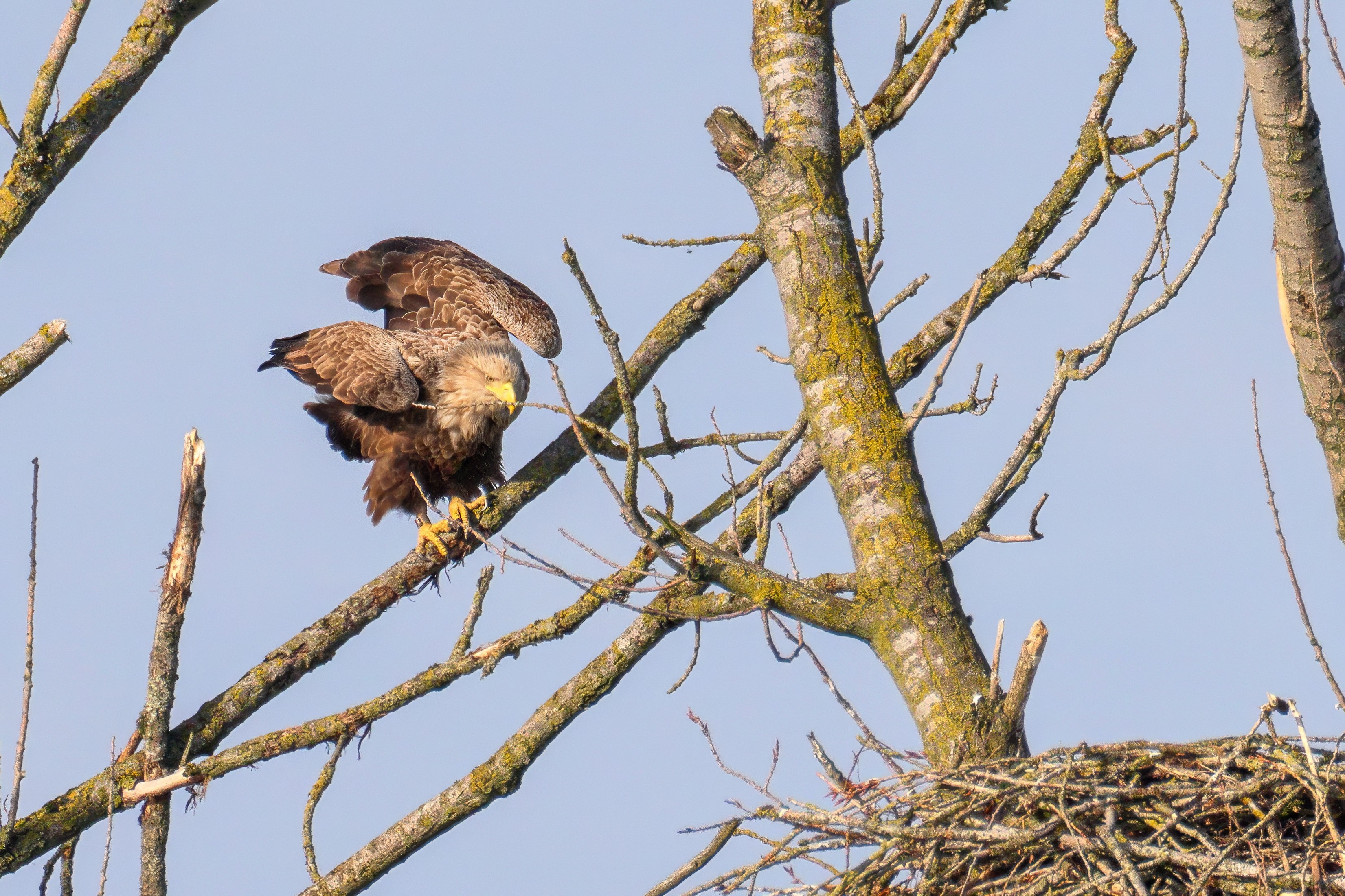 Vorbildlich versorgt das Seeadlereibchen ihre Nestlinge