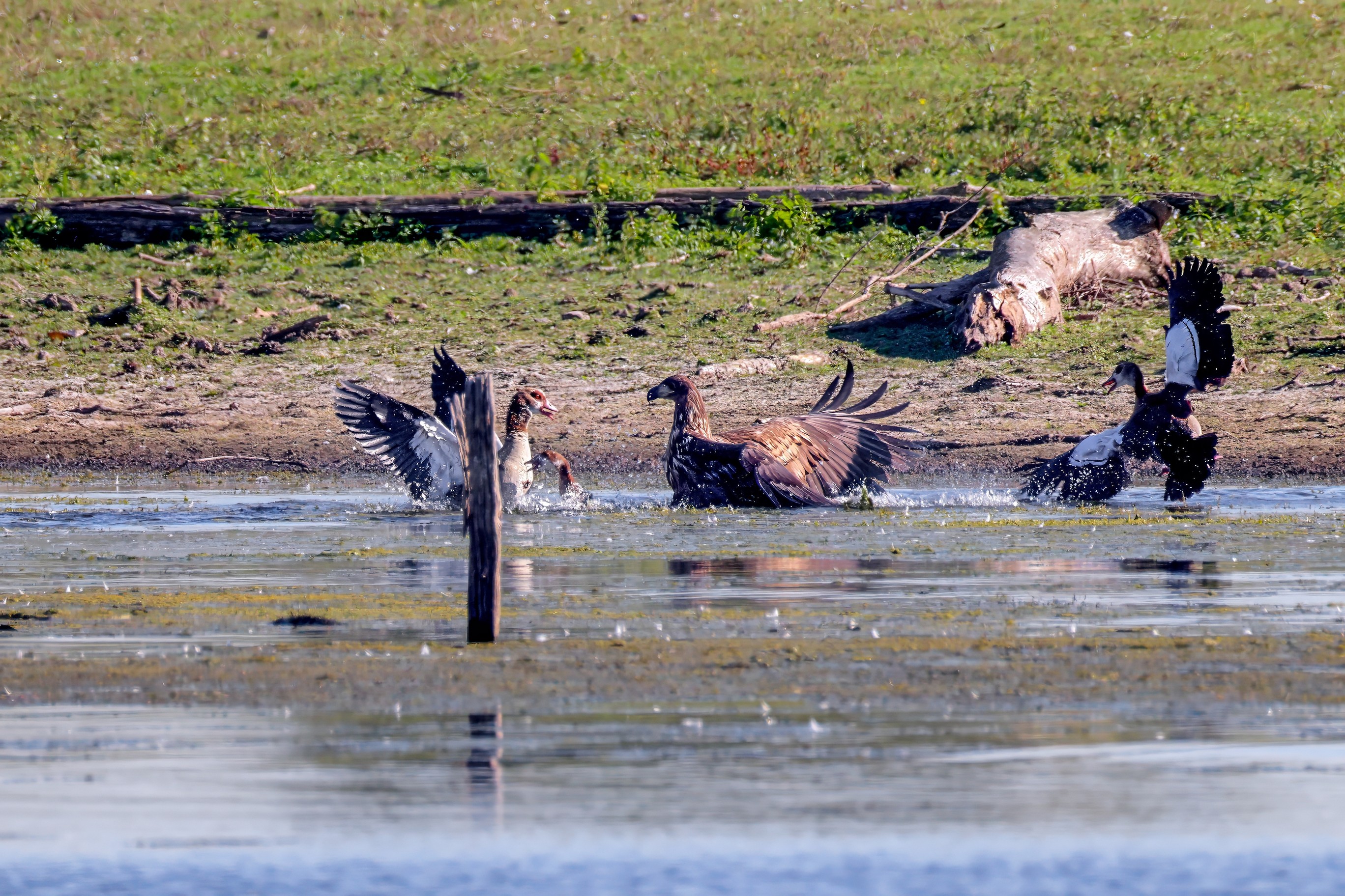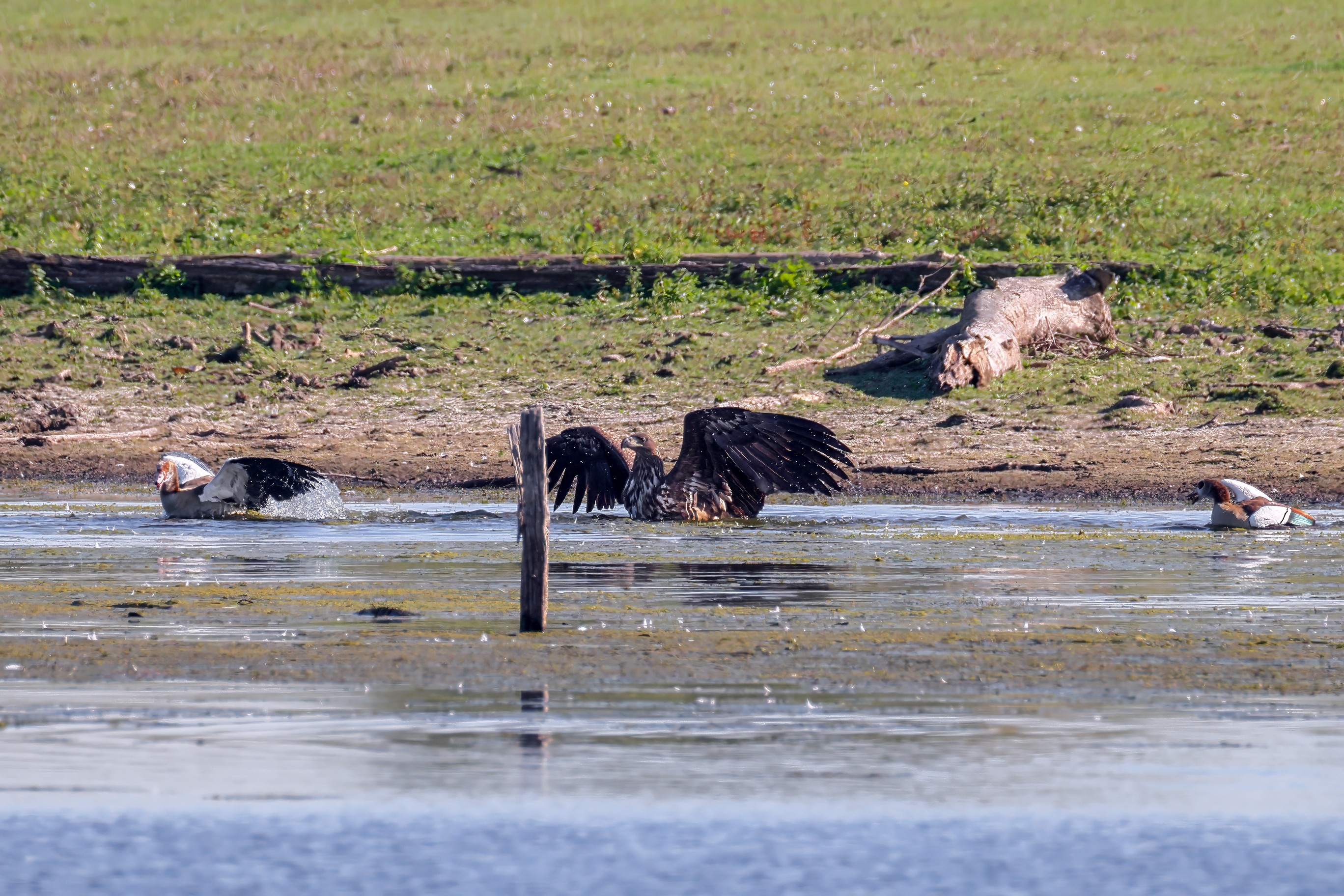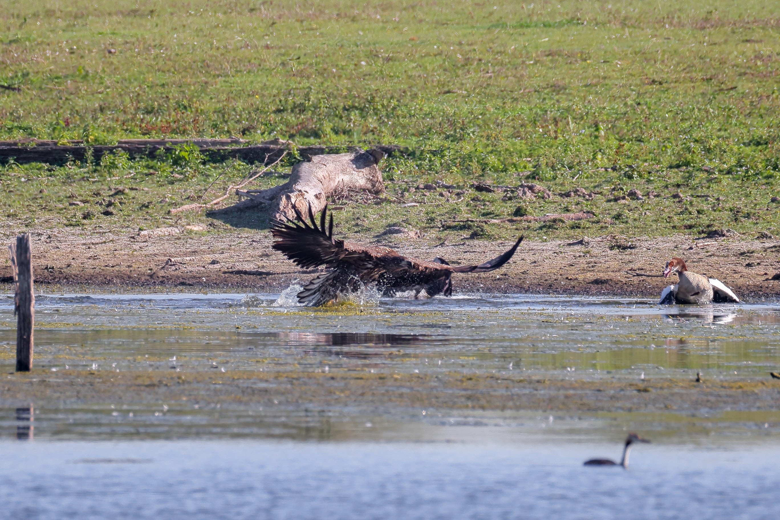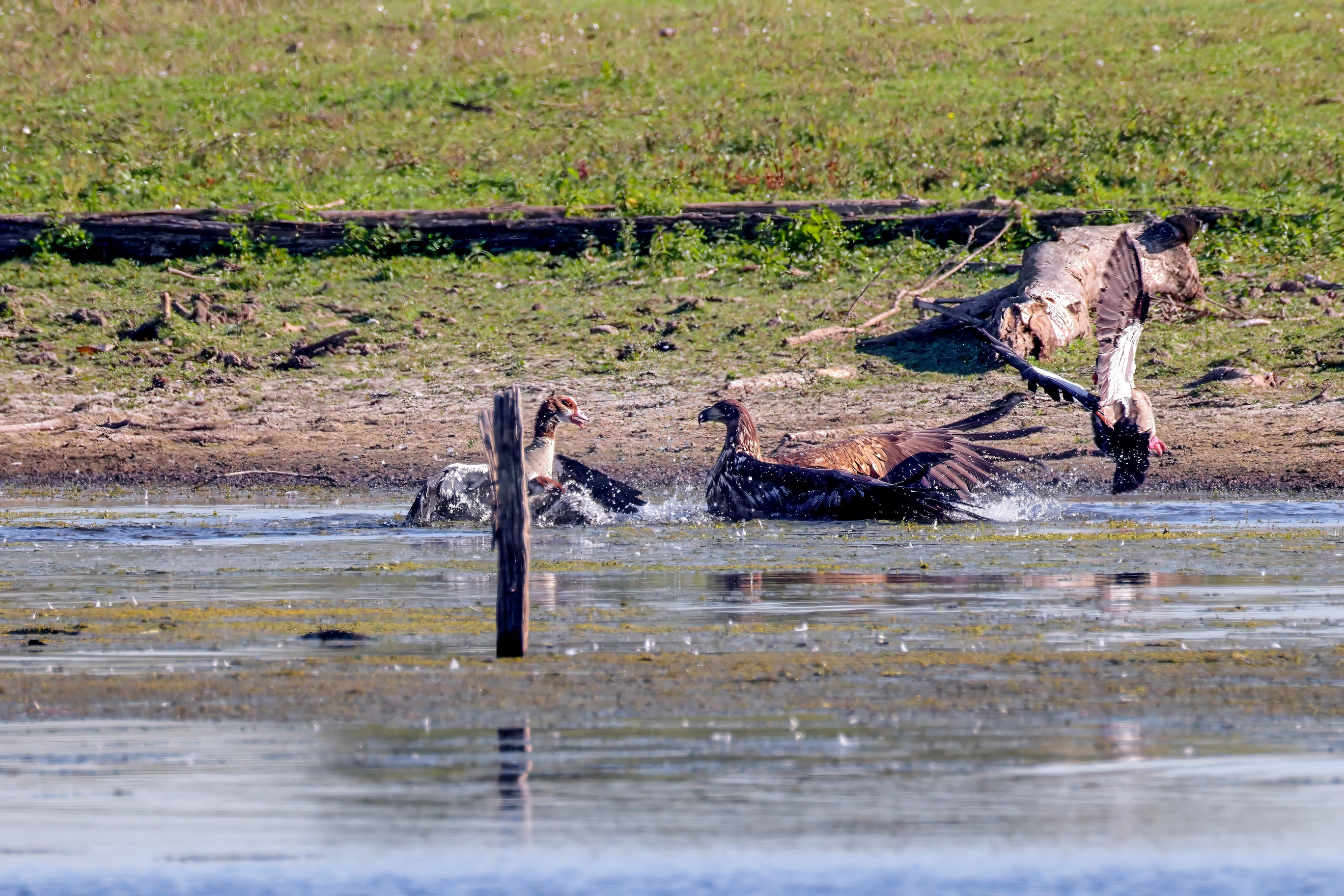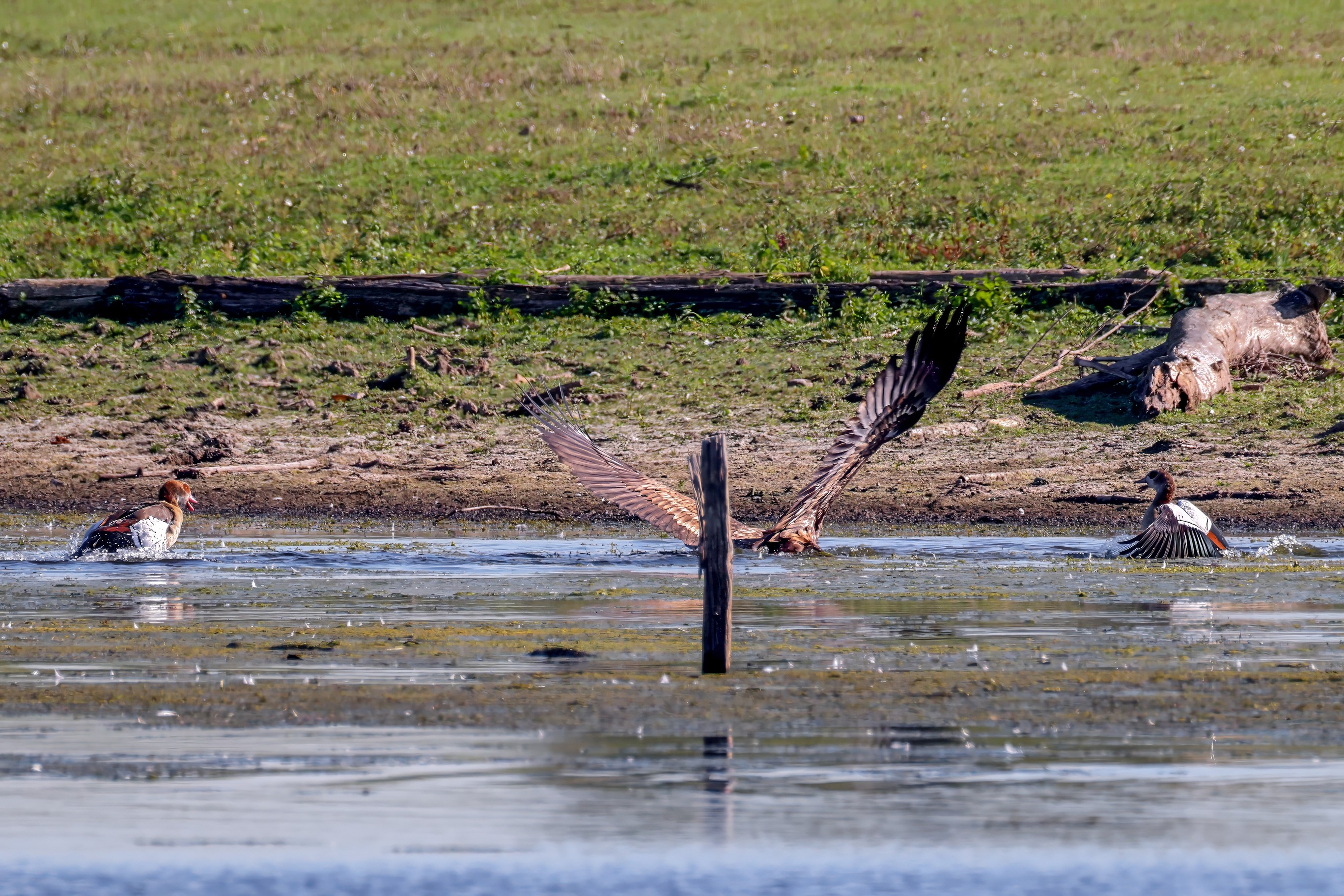 Ein besonders eindrucksvolles Erlebnis bot sich beim Versuch eine junge Nilgans zu erbeuten. Die entschlossene Abwehr der Nilganseltern überraschte den jungen Adler sichtlich und brachte ihm eine deutliche Lektion ein. Aus dieser Niederlage wird er lernen müssen künftig eine überlegtere Strategie zu wählen, wenn er sich an wehrhaft umsorgte Beute heranwagt.