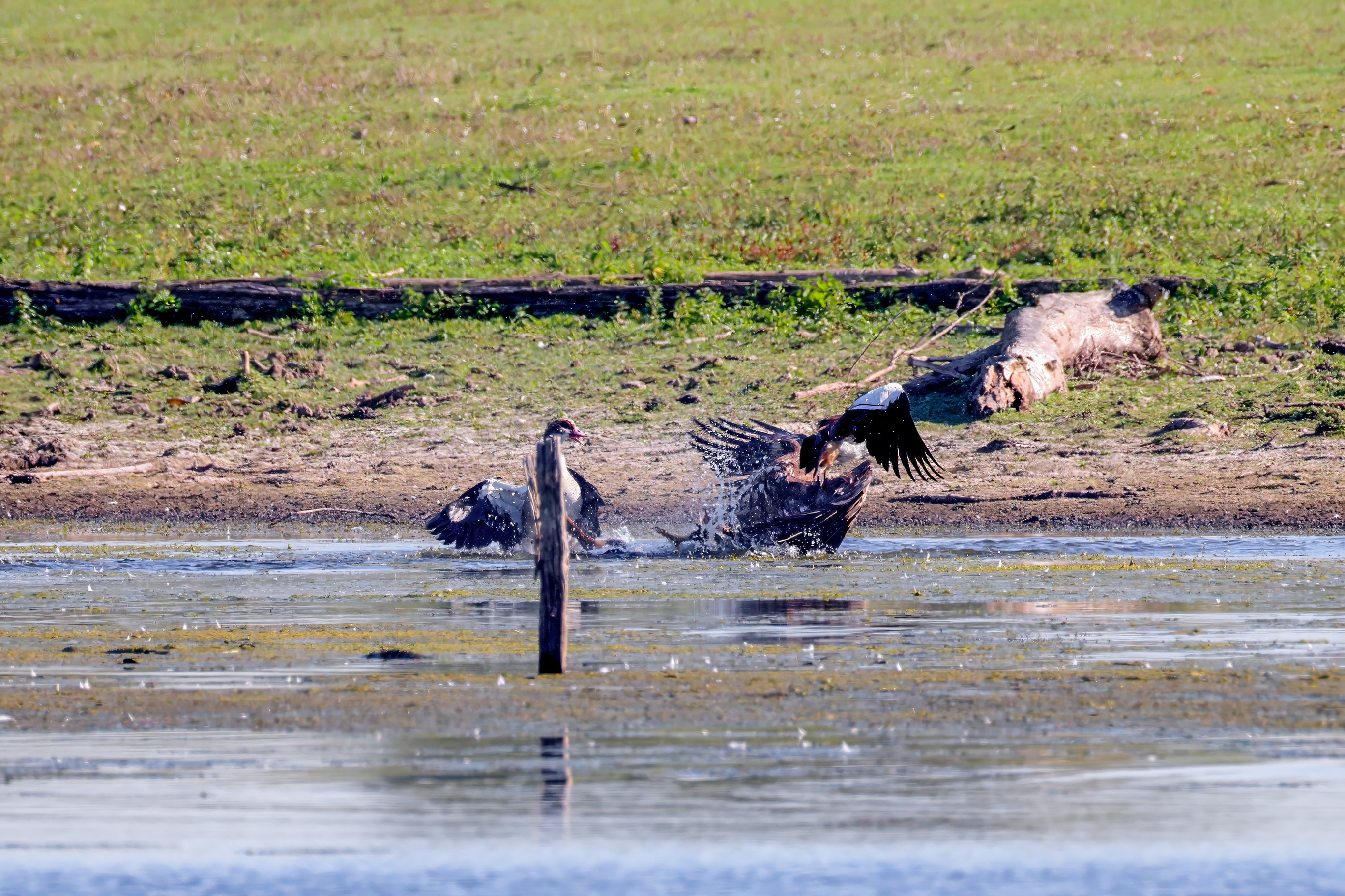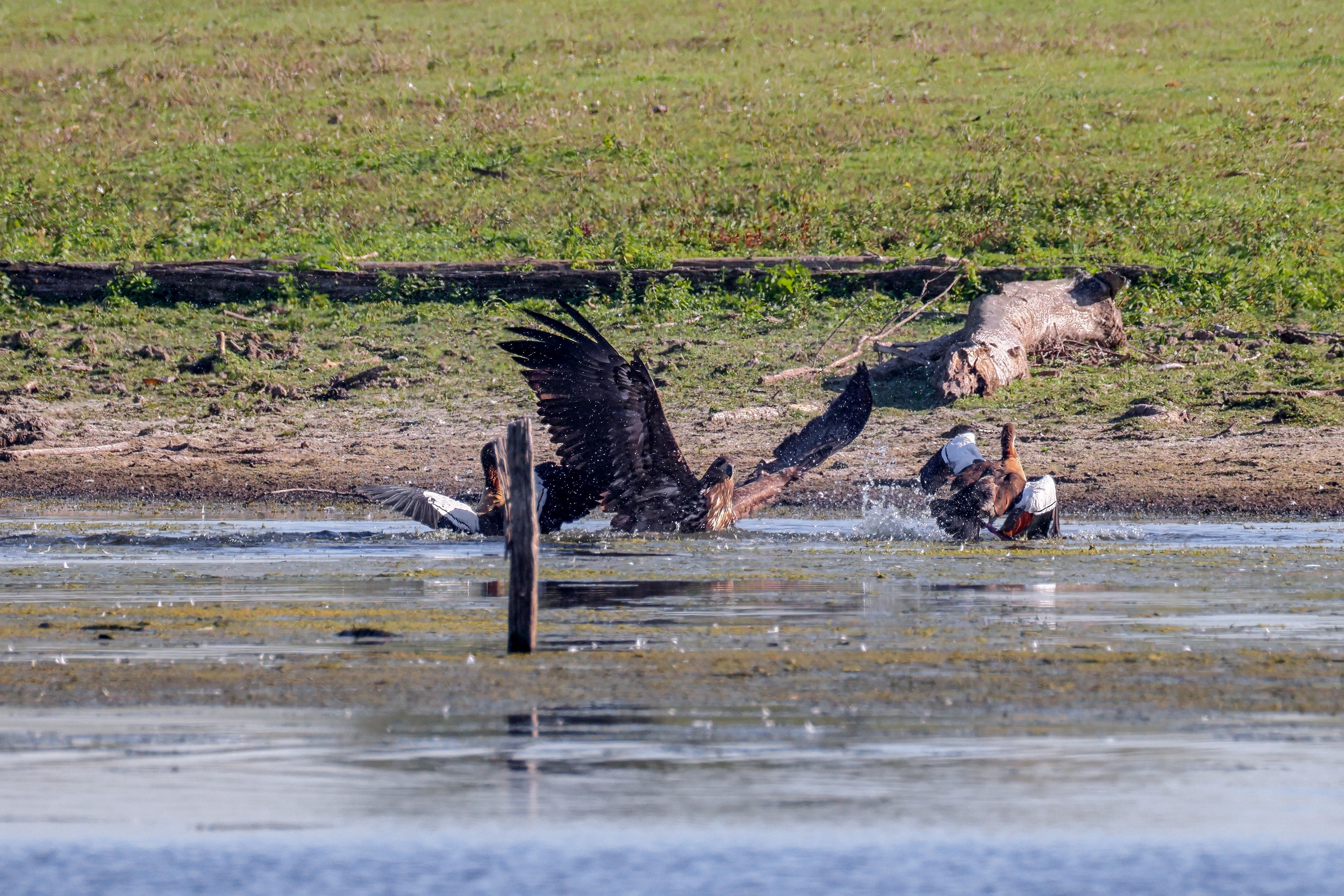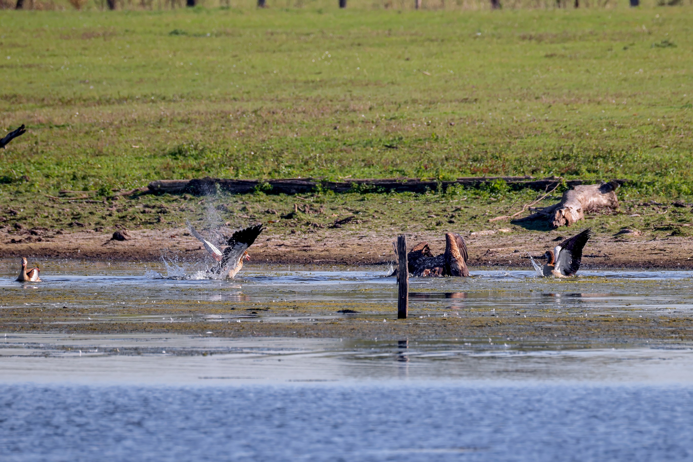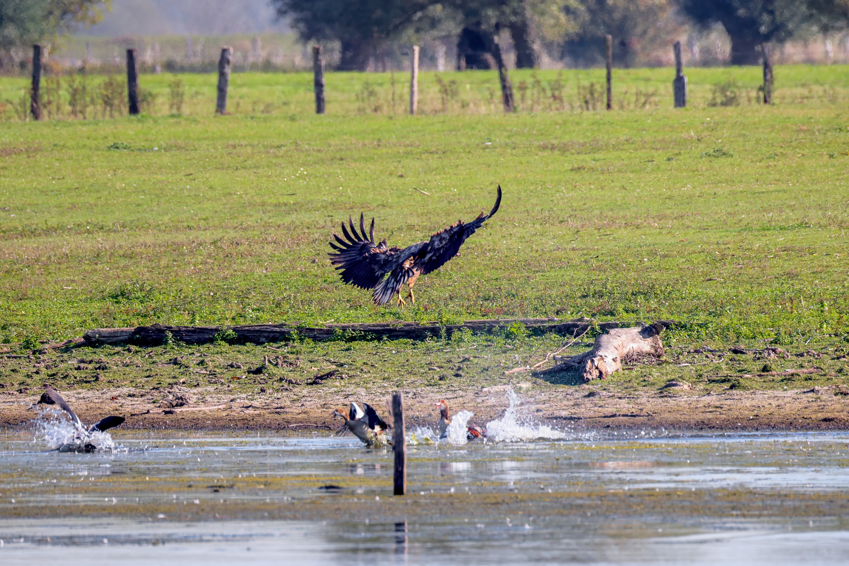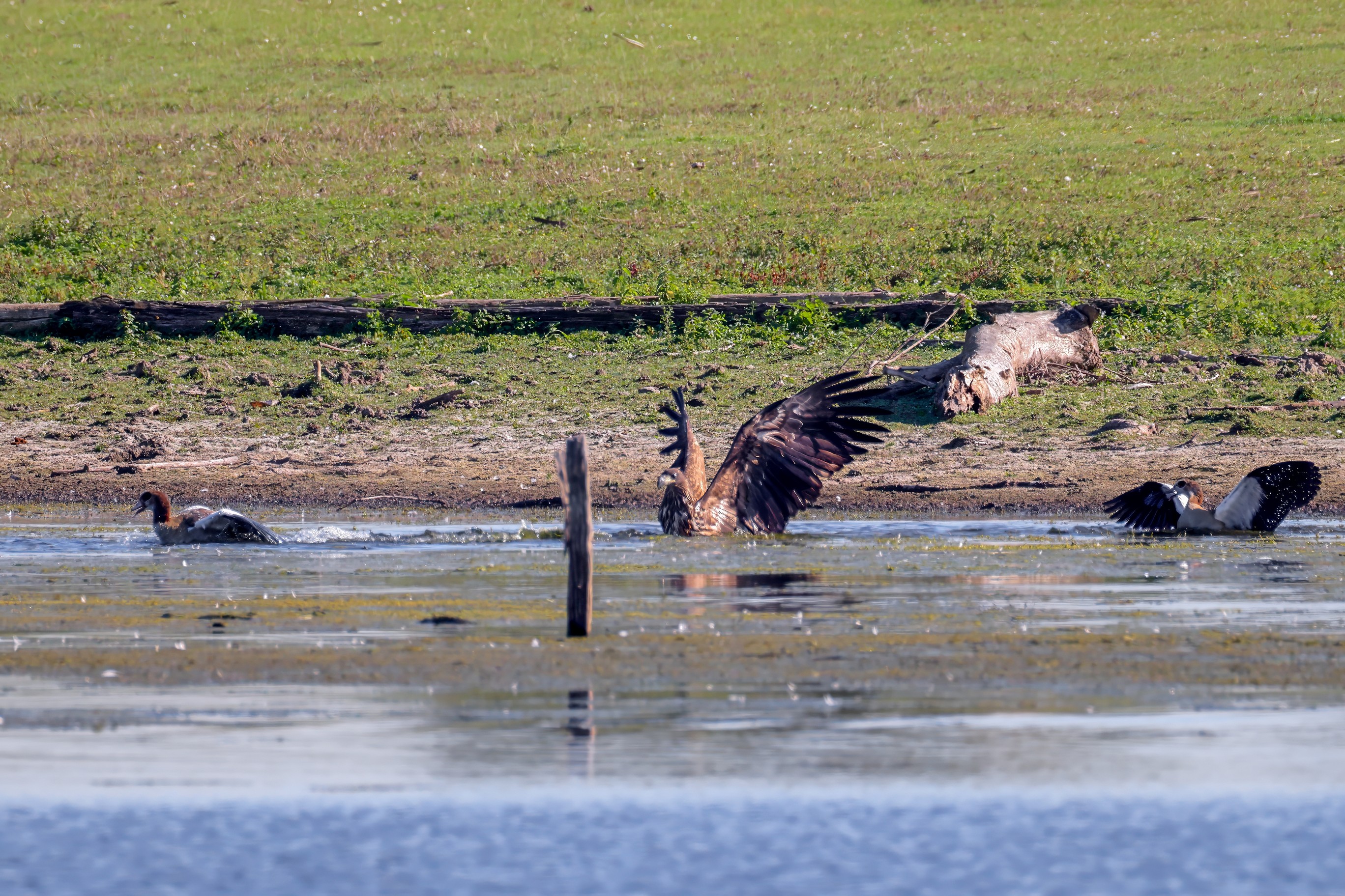 Ein besonders eindrucksvolles Erlebnis bot sich beim Versuch eine junge Nilgans zu erbeuten. Die entschlossene Abwehr der Nilganseltern überraschte den jungen Adler sichtlich und brachte ihm eine deutliche Lektion ein. Aus dieser Niederlage wird er lernen müssen künftig eine überlegtere Strategie zu wählen, wenn er sich an wehrhaft umsorgte Beute heranwagt.