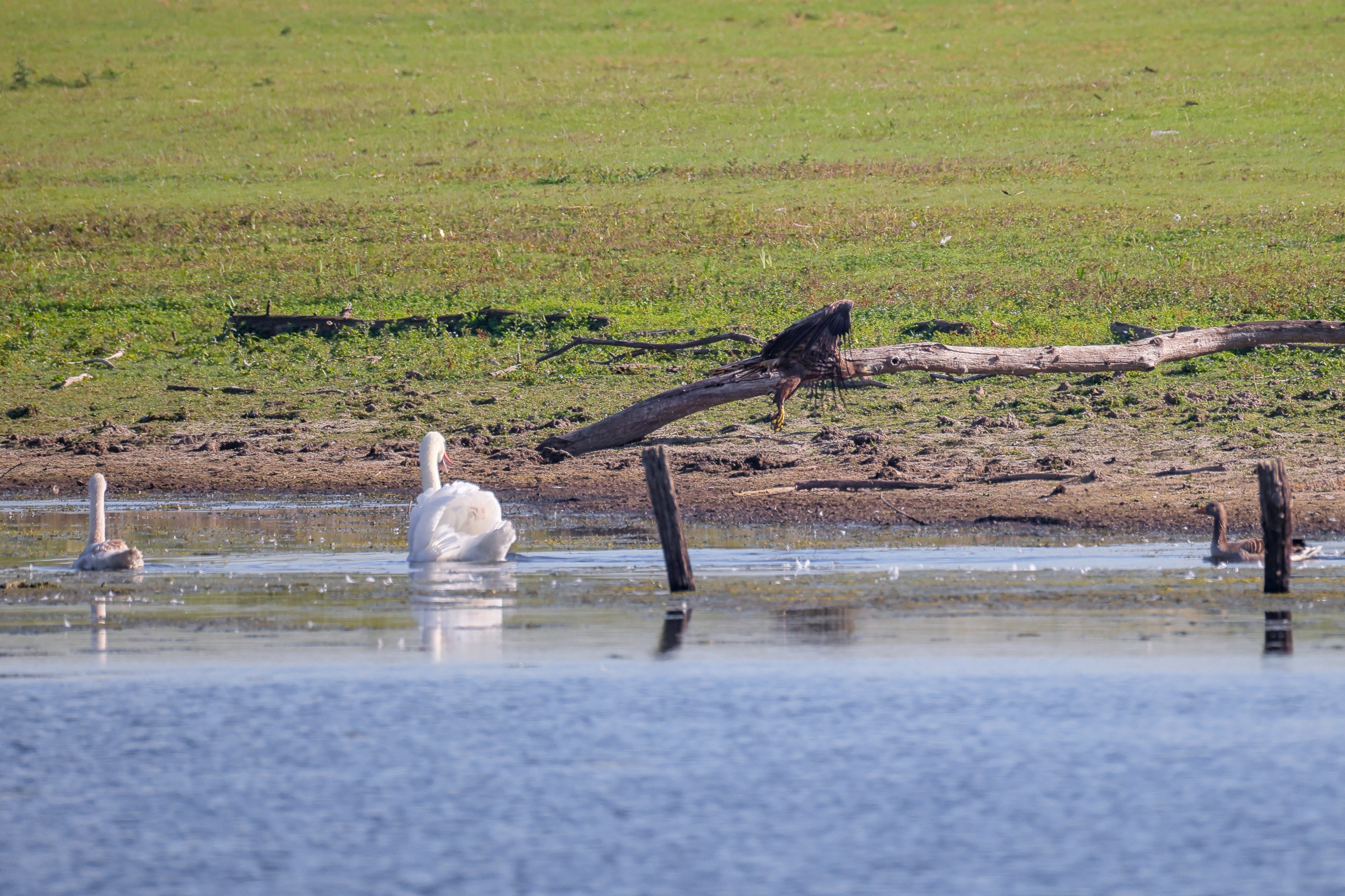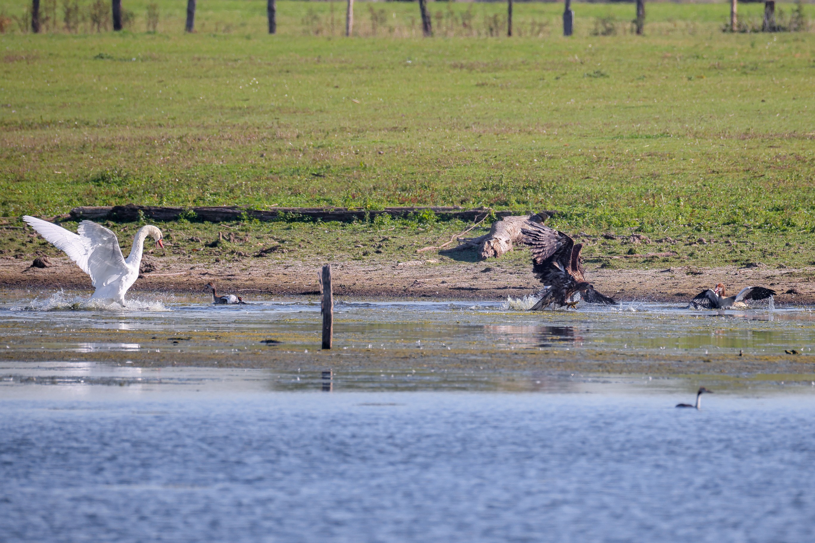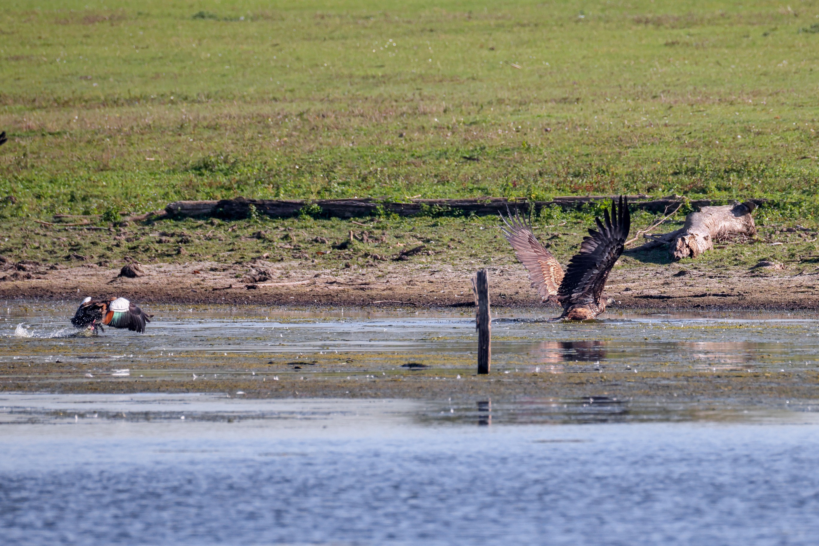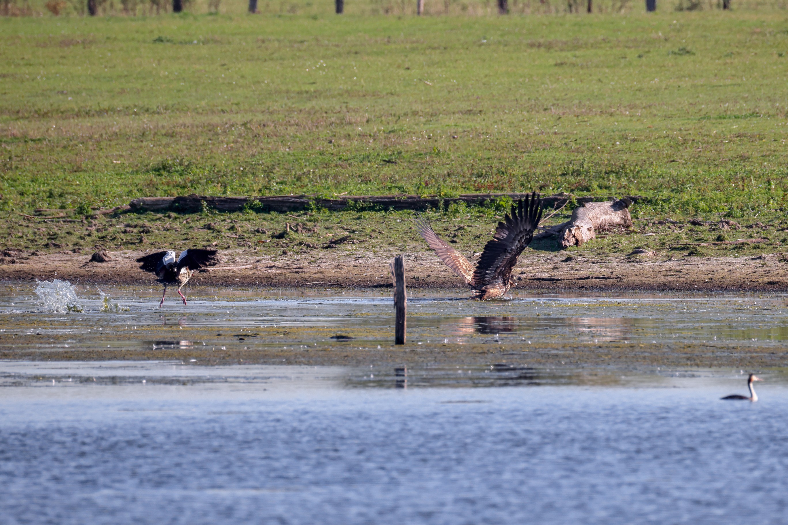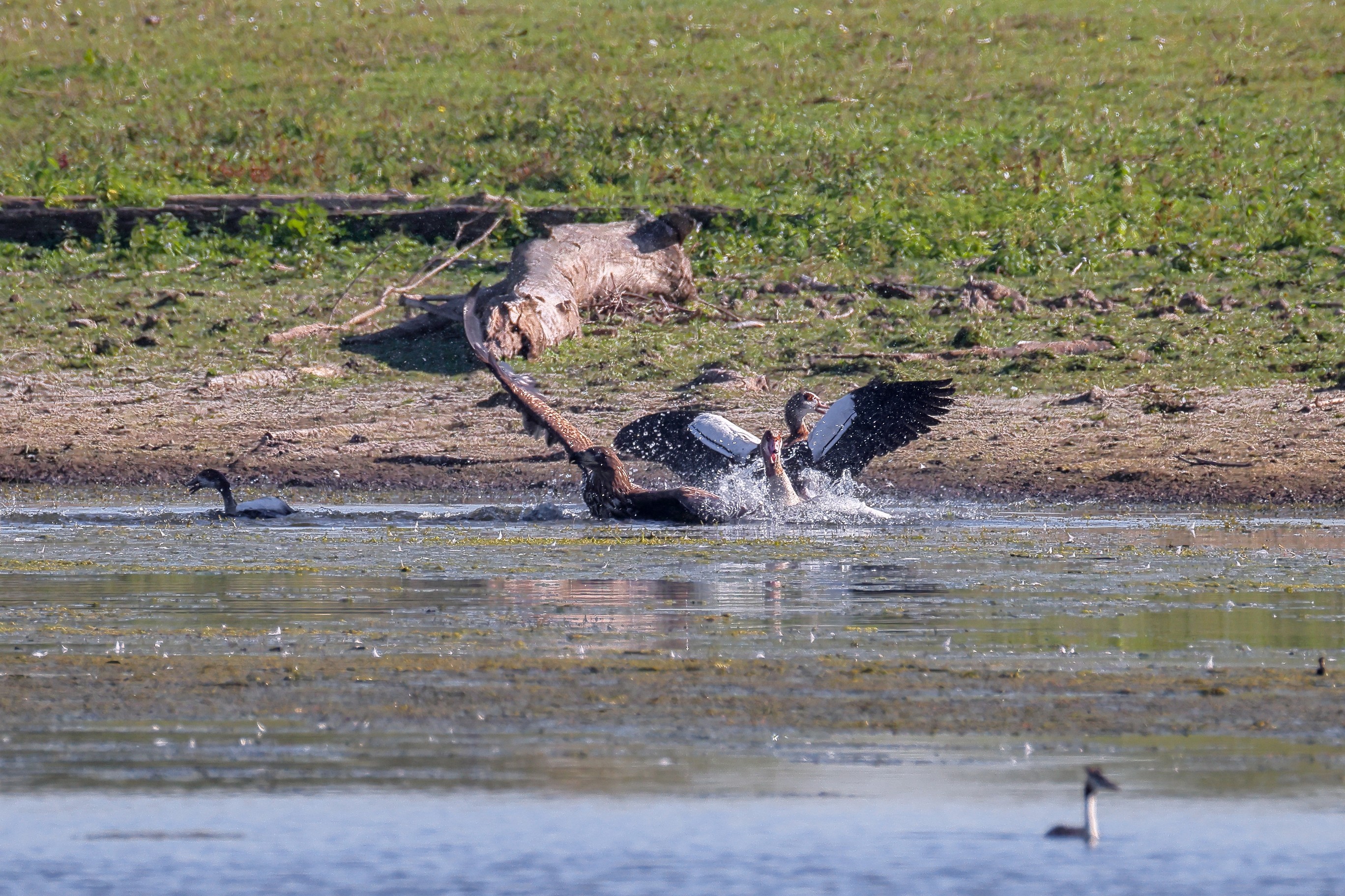Ein besonders eindrucksvolles Erlebnis bot sich beim Versuch eine junge Nilgans zu erbeuten. Die entschlossene Abwehr der Nilganseltern überraschte den jungen Adler sichtlich und brachte ihm eine deutliche Lektion ein. Aus dieser Niederlage wird er lernen müssen künftig eine überlegtere Strategie zu wählen, wenn er sich an wehrhaft umsorgte Beute heranwagt.