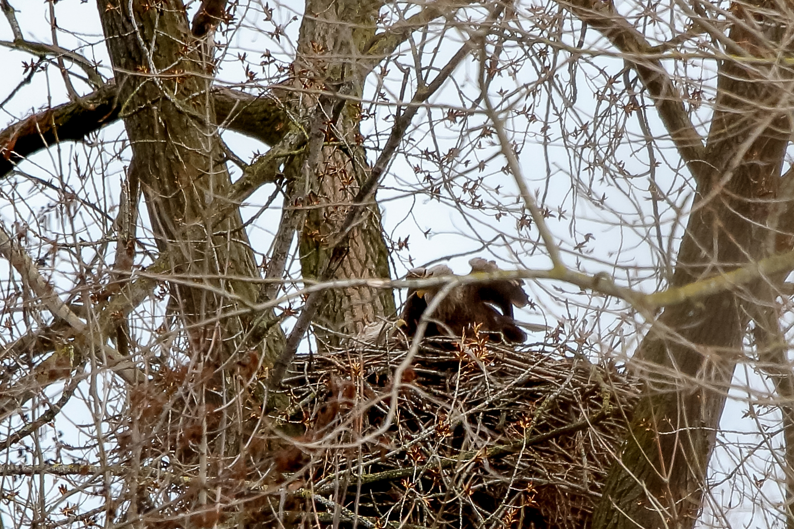 Anfang März wurde der Niederrhein durch ein Sturmtief mit heftigen Orkanböen heimgesucht. Der Horst sowie die Seeadler haben das Wetter gut überstanden.