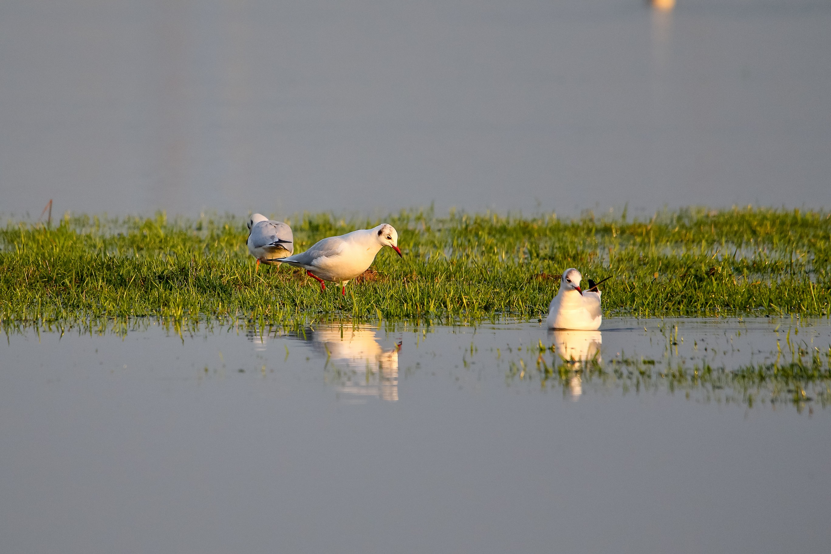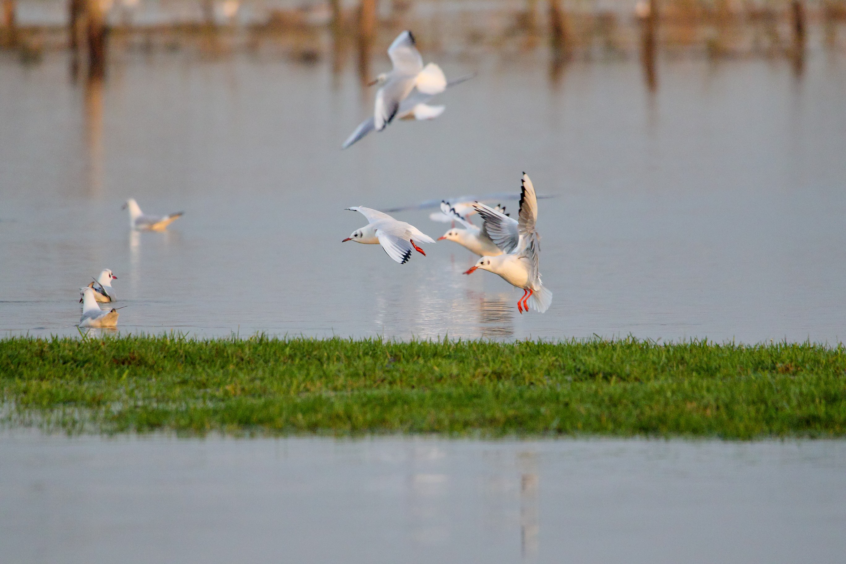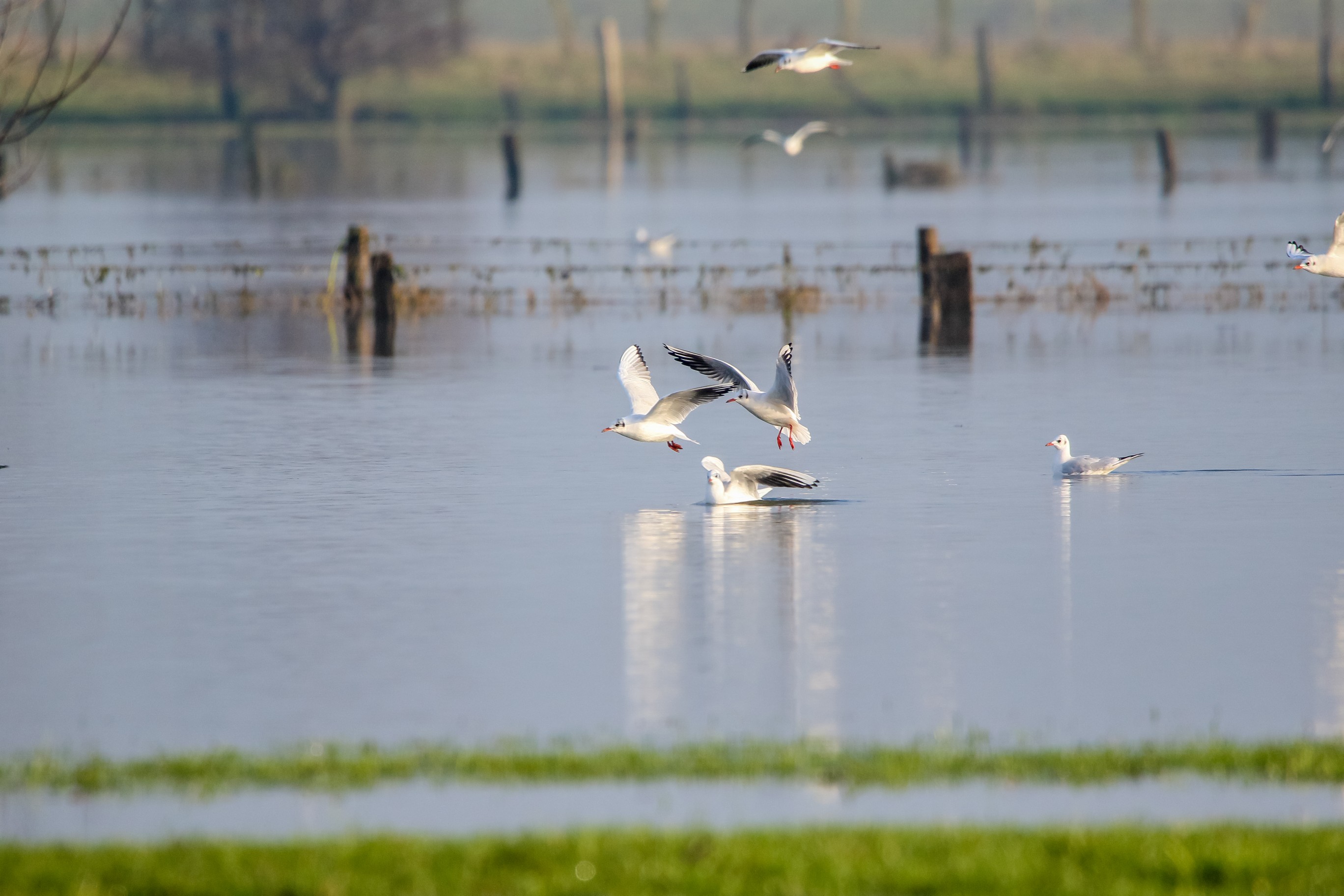 Die jährlich auftretende Hochwassersituation in der Auenlandschaft Bislicher Insel erschwert das Leben vieler Tierarten. Die Möwen erfreuen sich an den überfluteten Wiesen und fischen sich die kleinen Leckerbissen, die im Wasser aufsteigen.