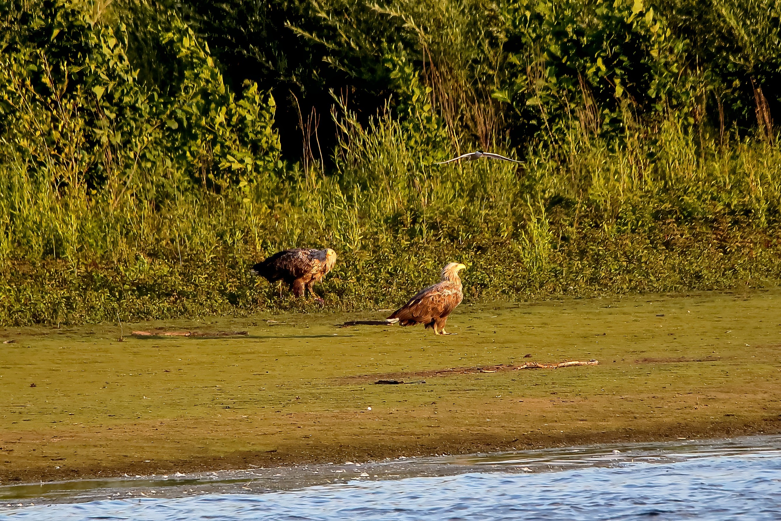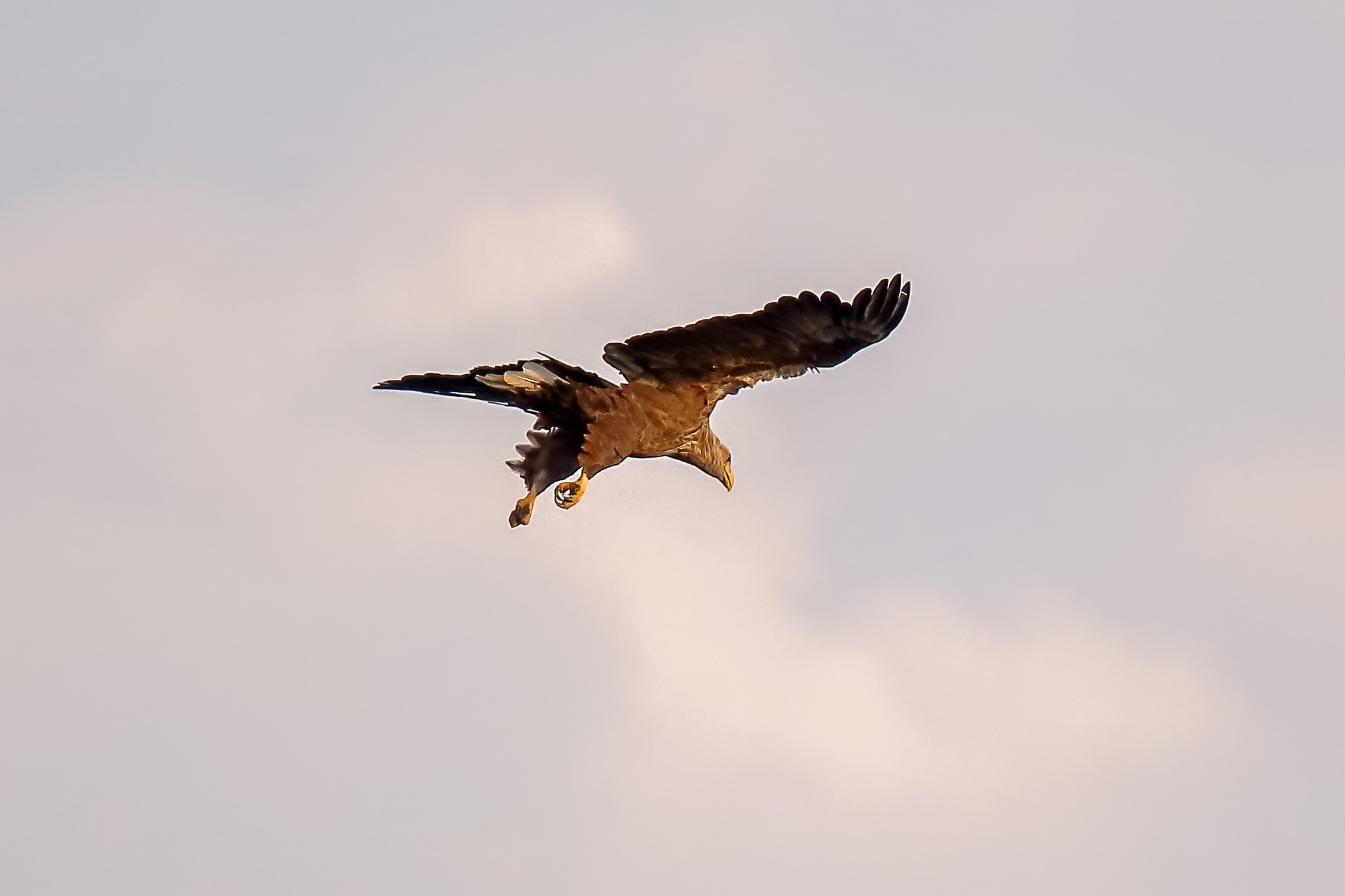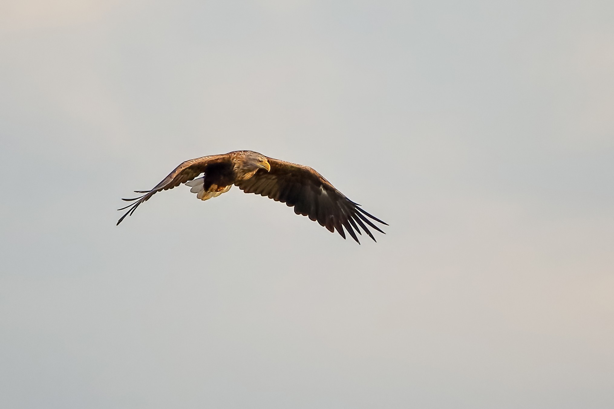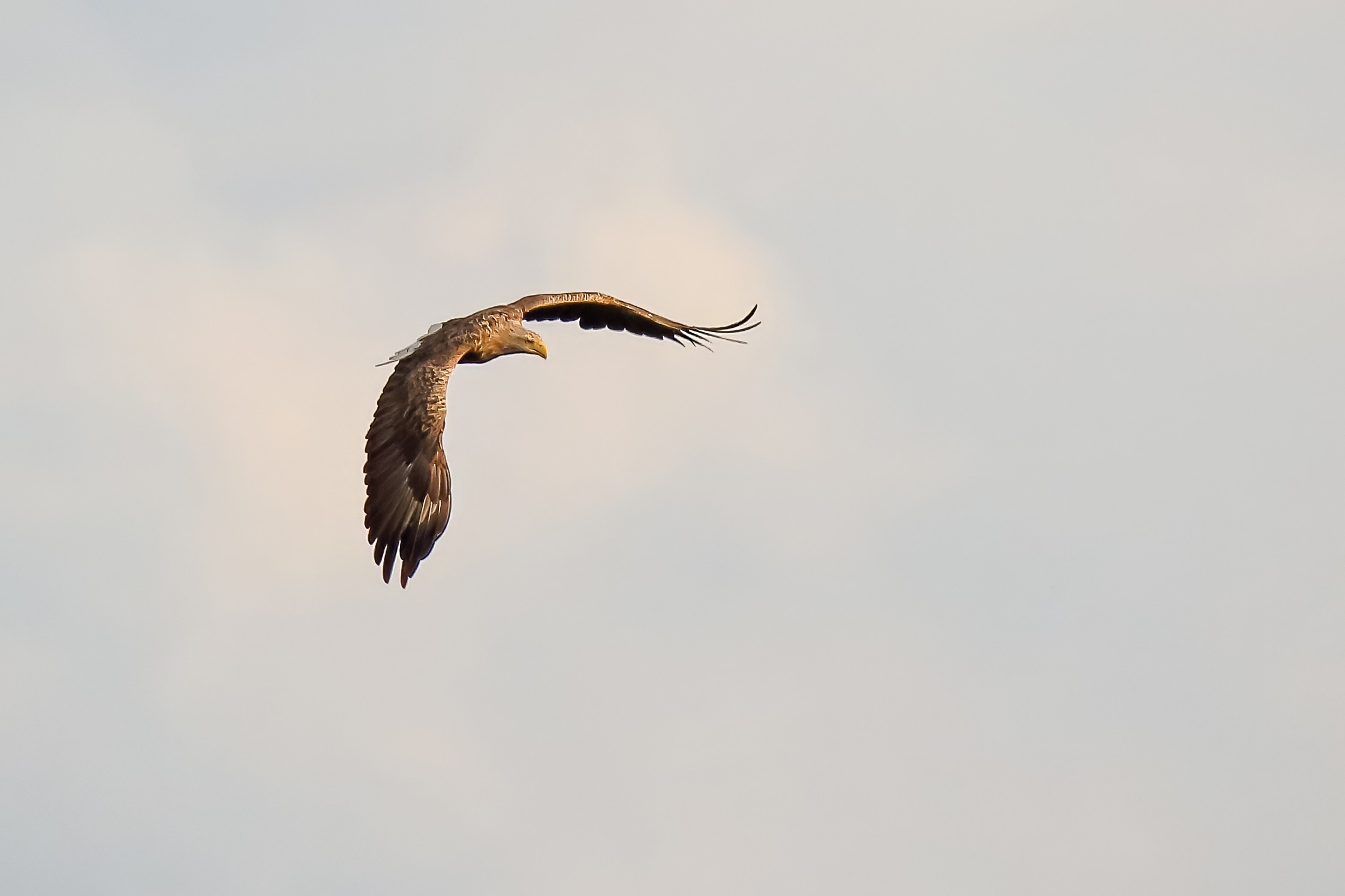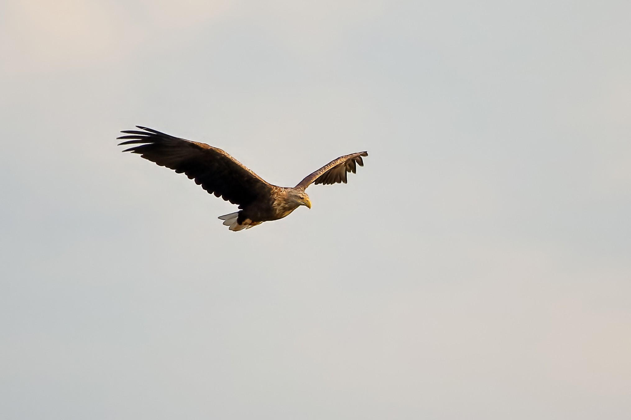 Spät, kurz vor Sonnenuntergang, zeigen sich die Seeadler bei der Fischjagd