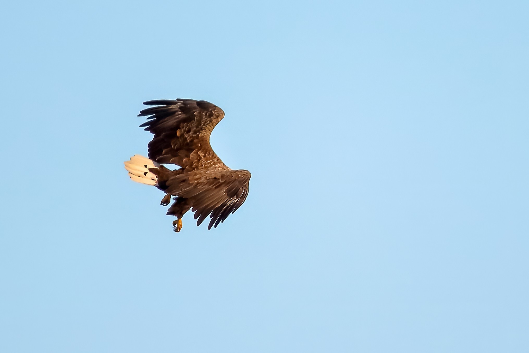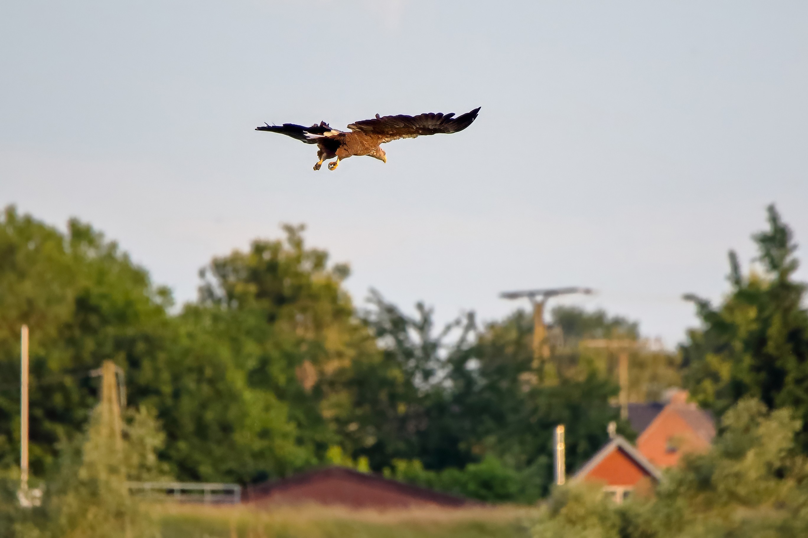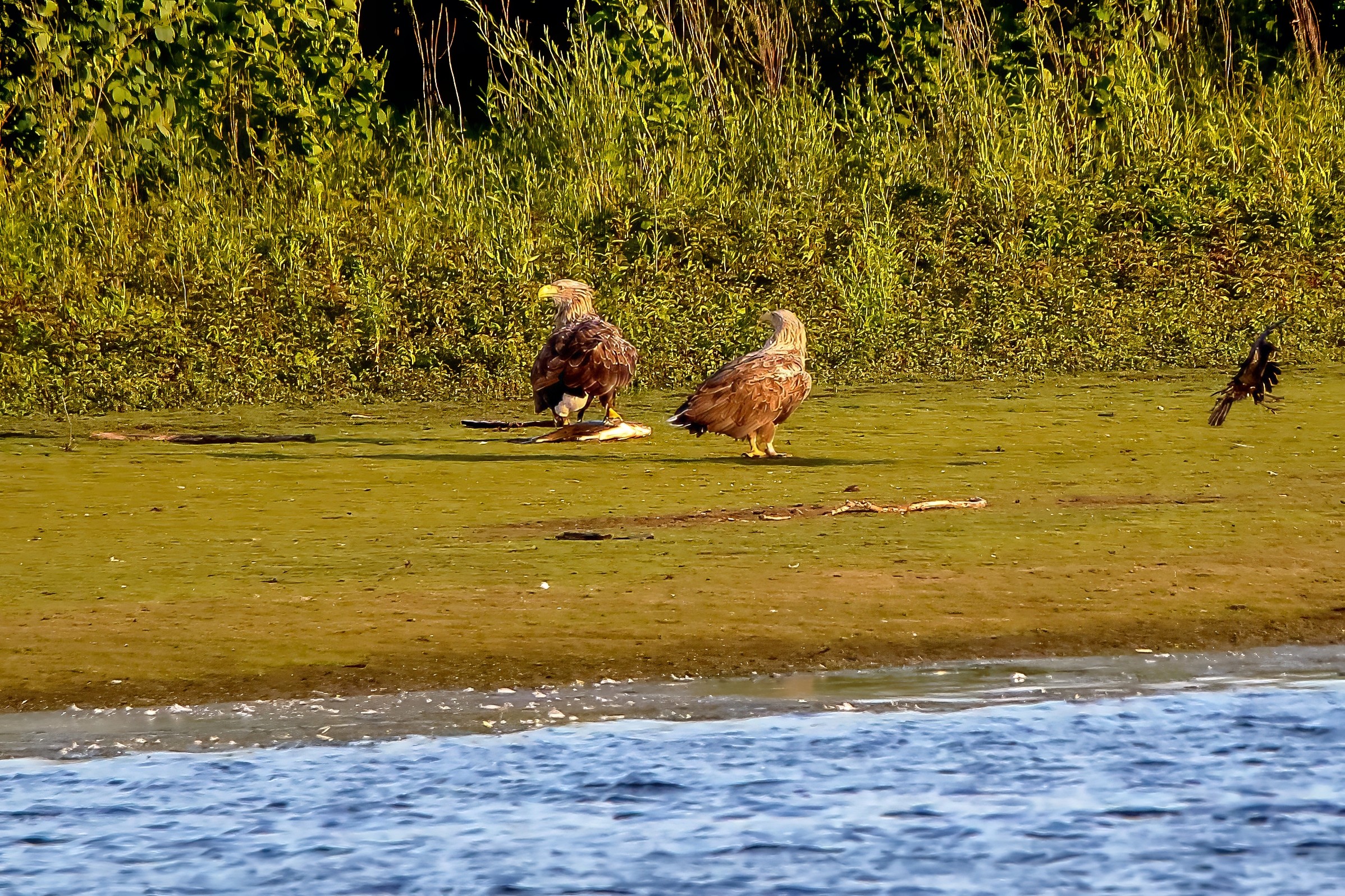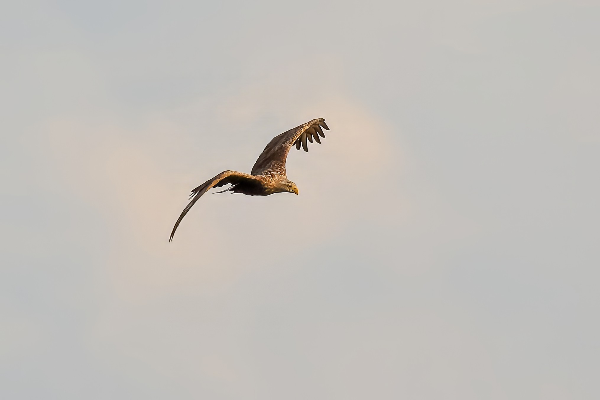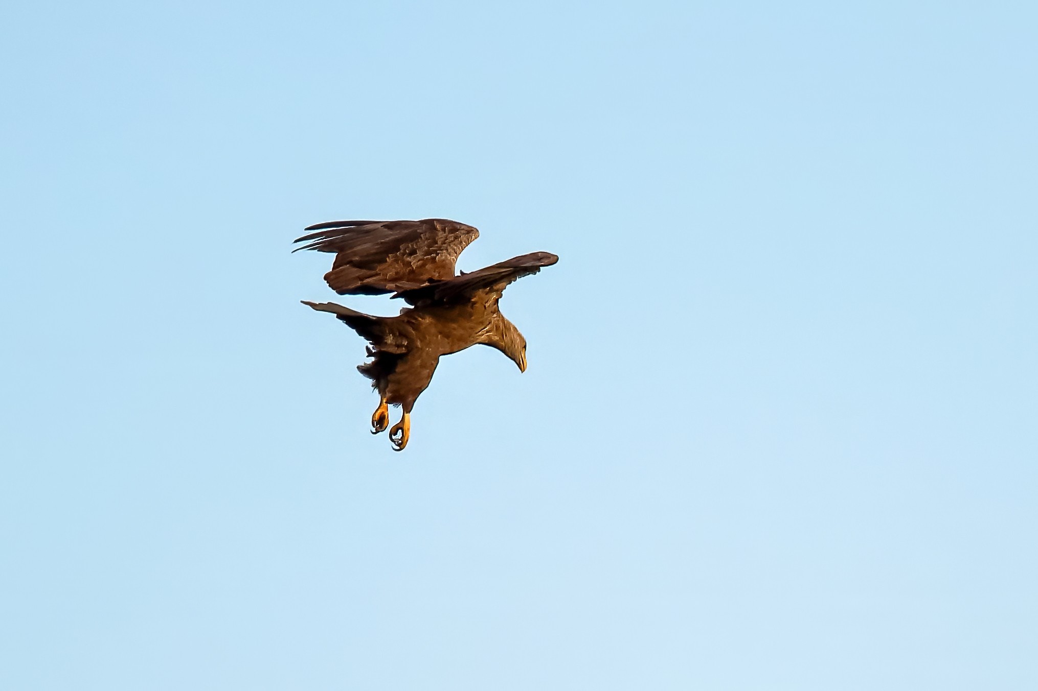 Spät, kurz vor Sonnenuntergang, zeigen sich die Seeadler bei der Fischjagd