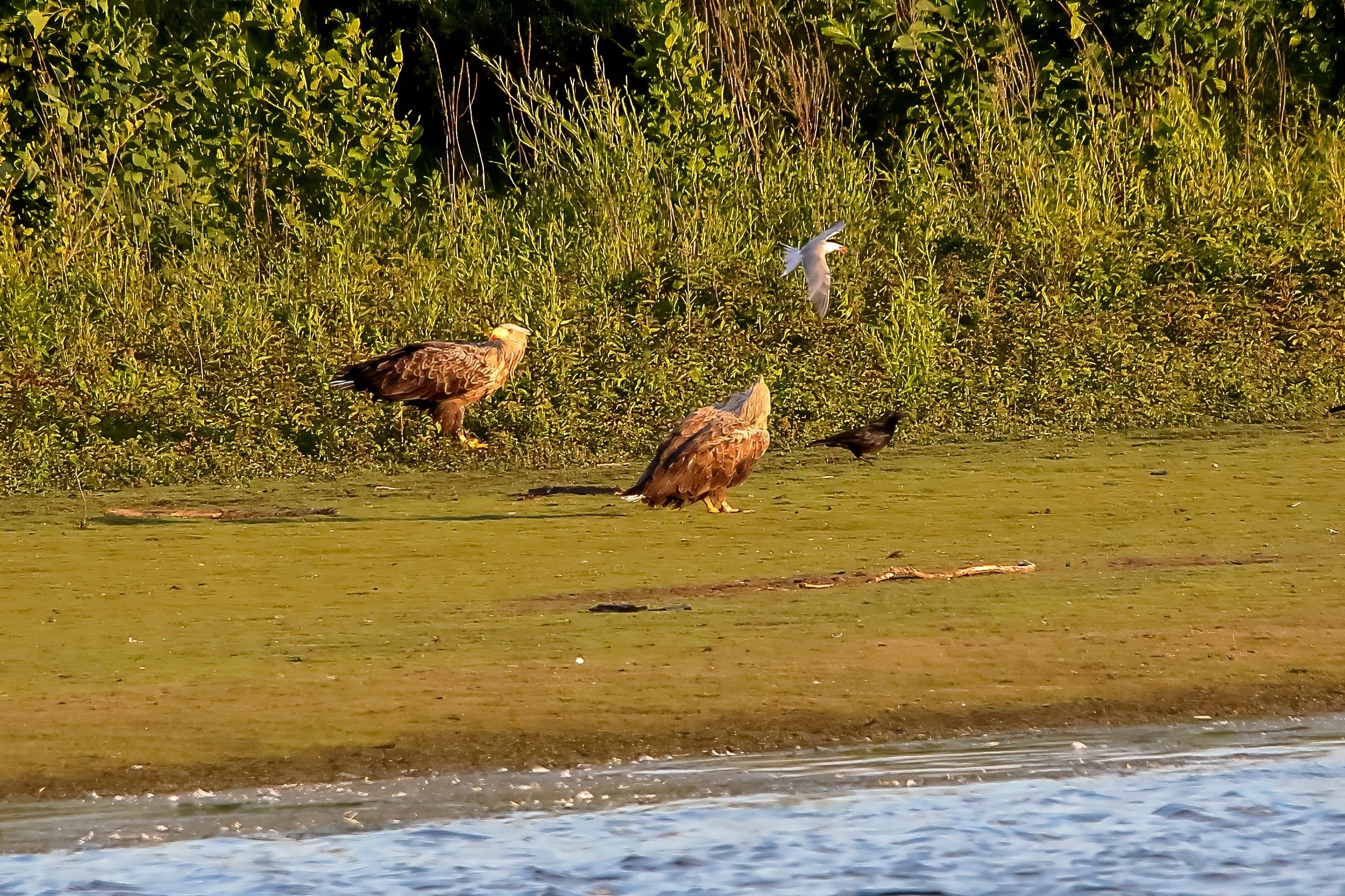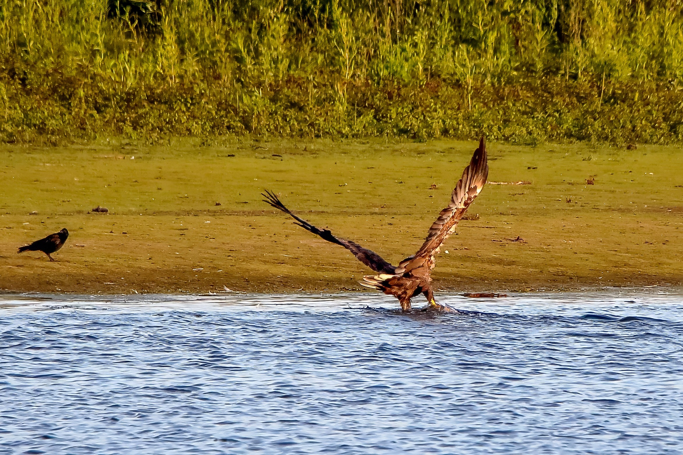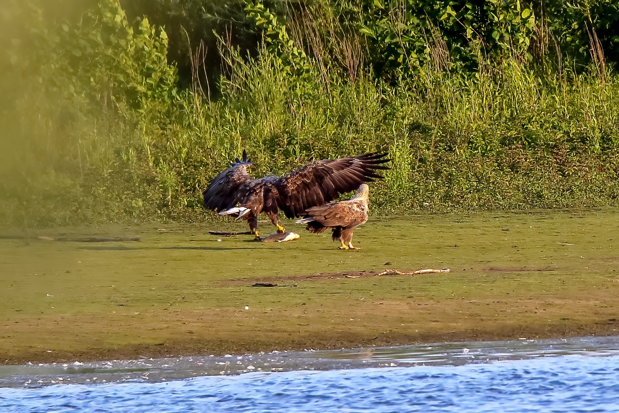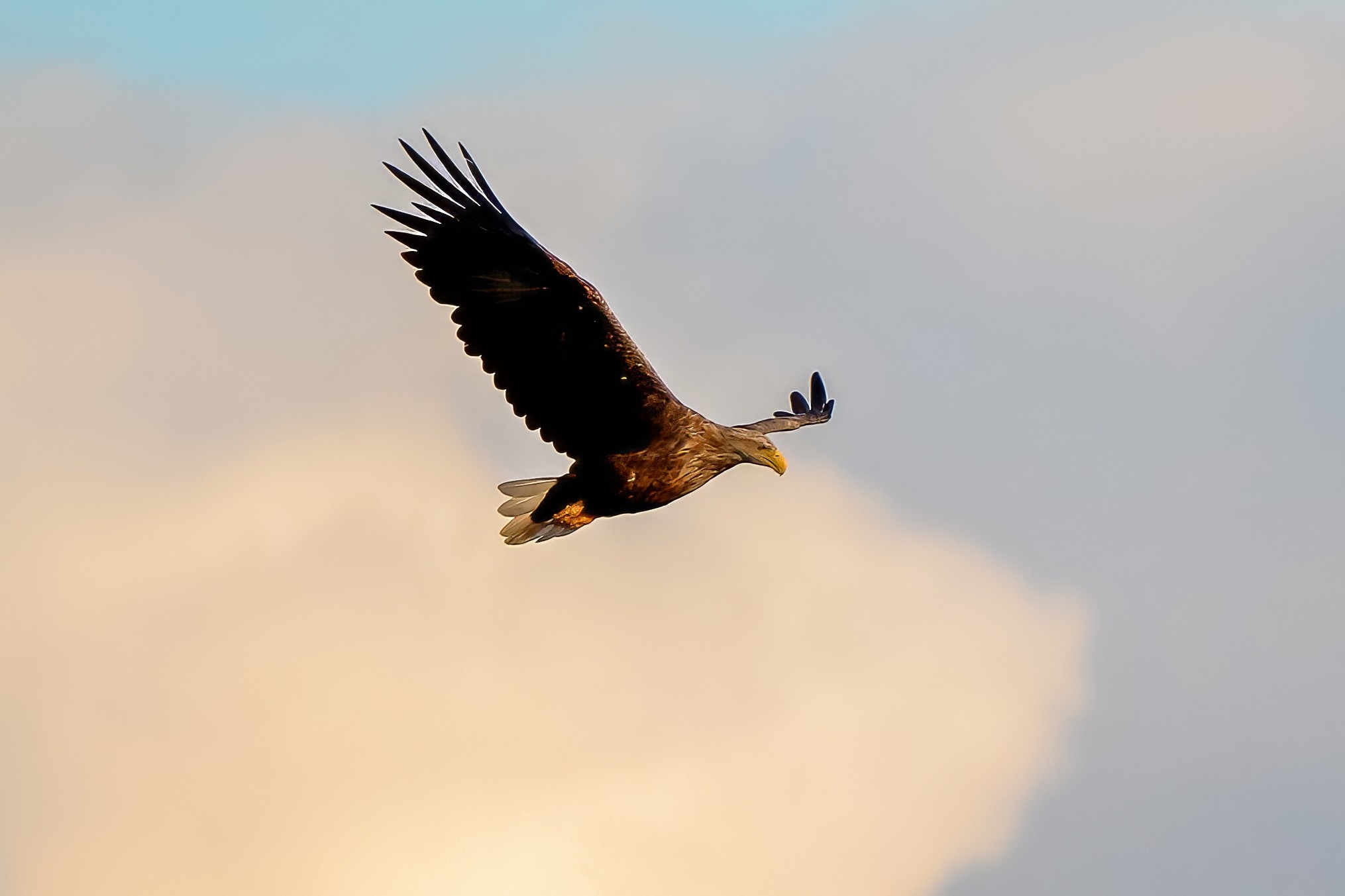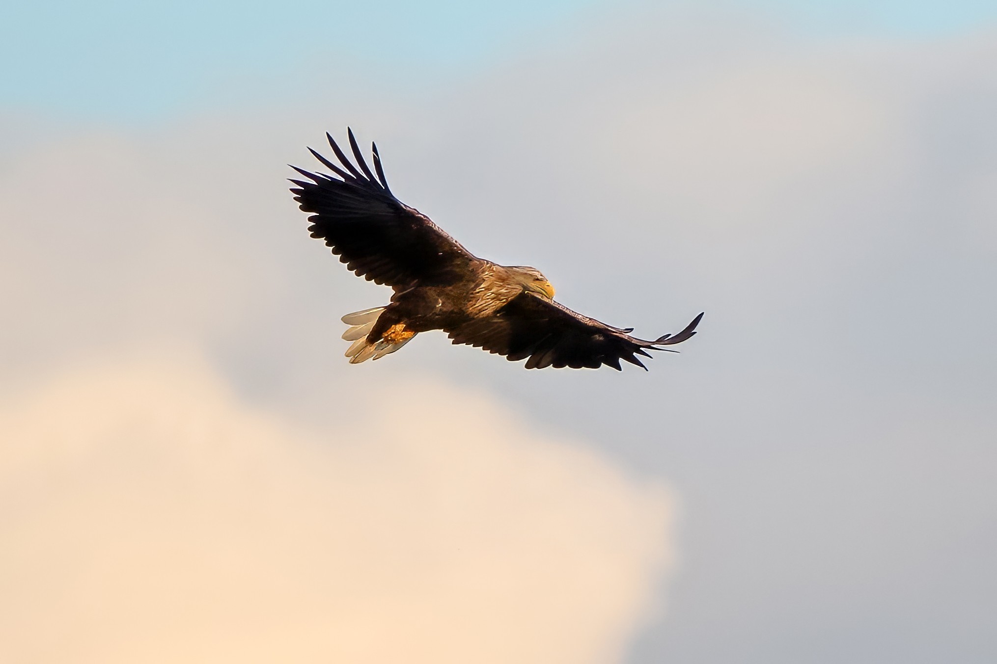 Spät, kurz vor Sonnenuntergang, zeigen sich die Seeadler bei der Fischjagd