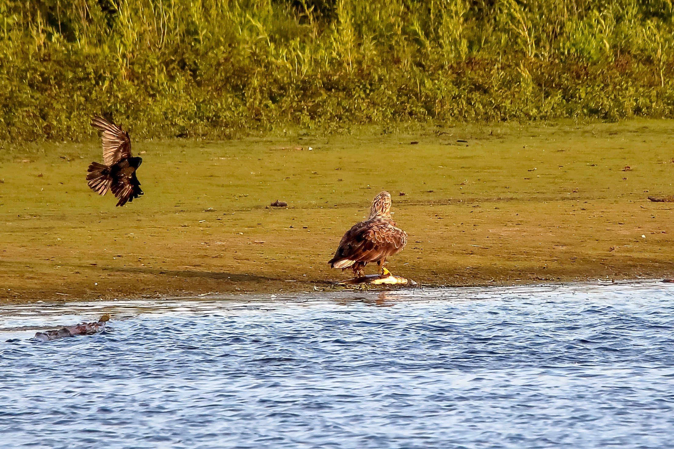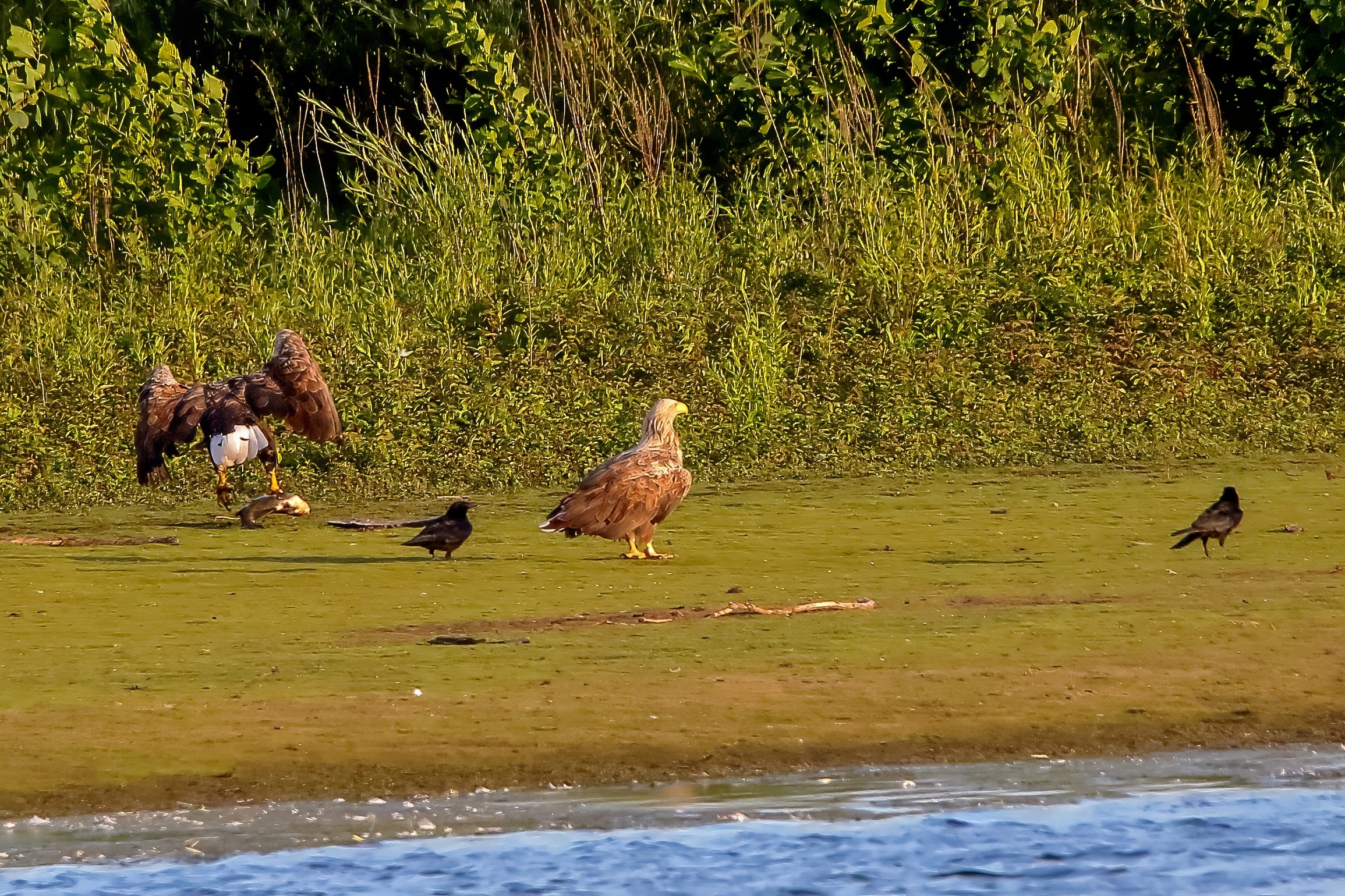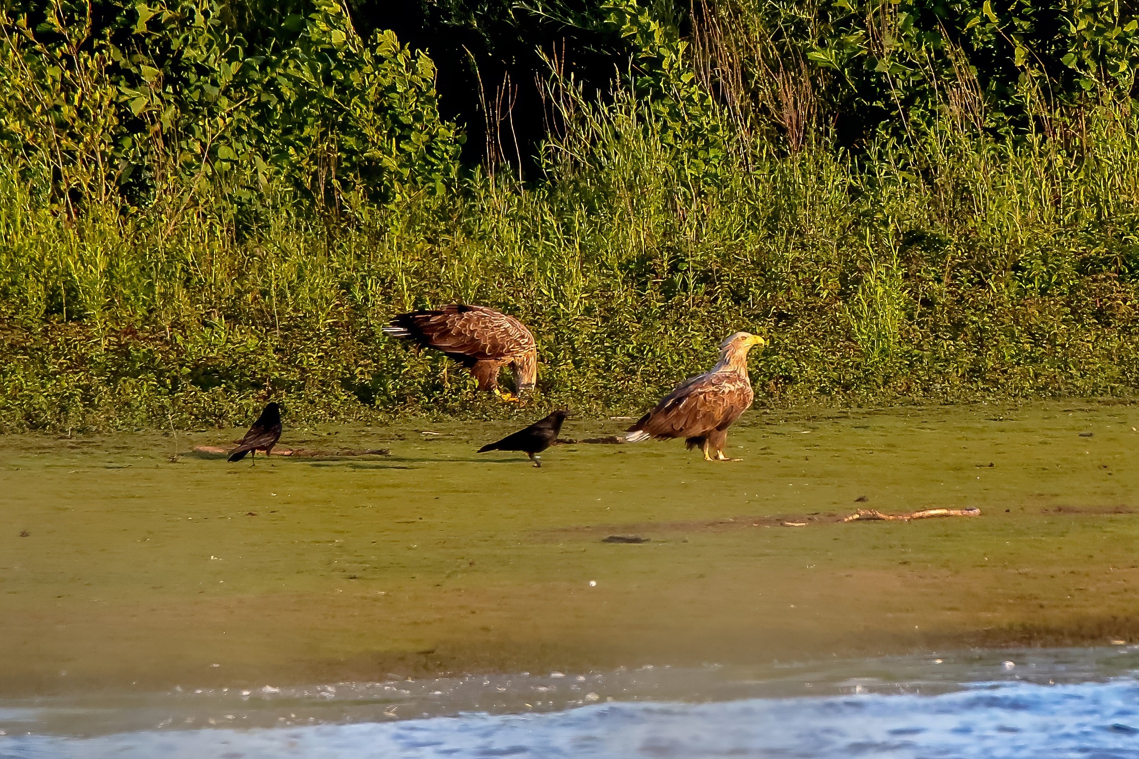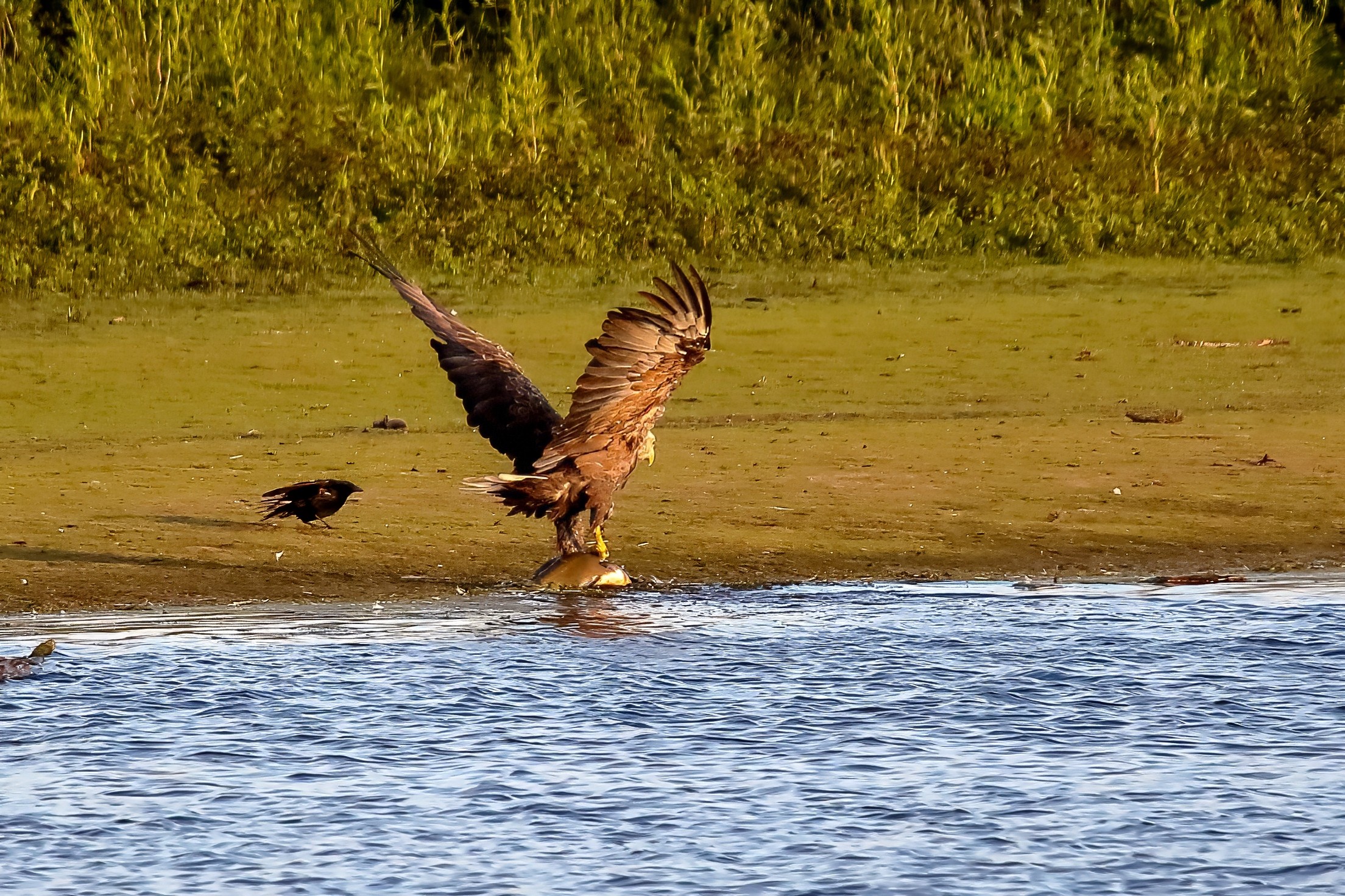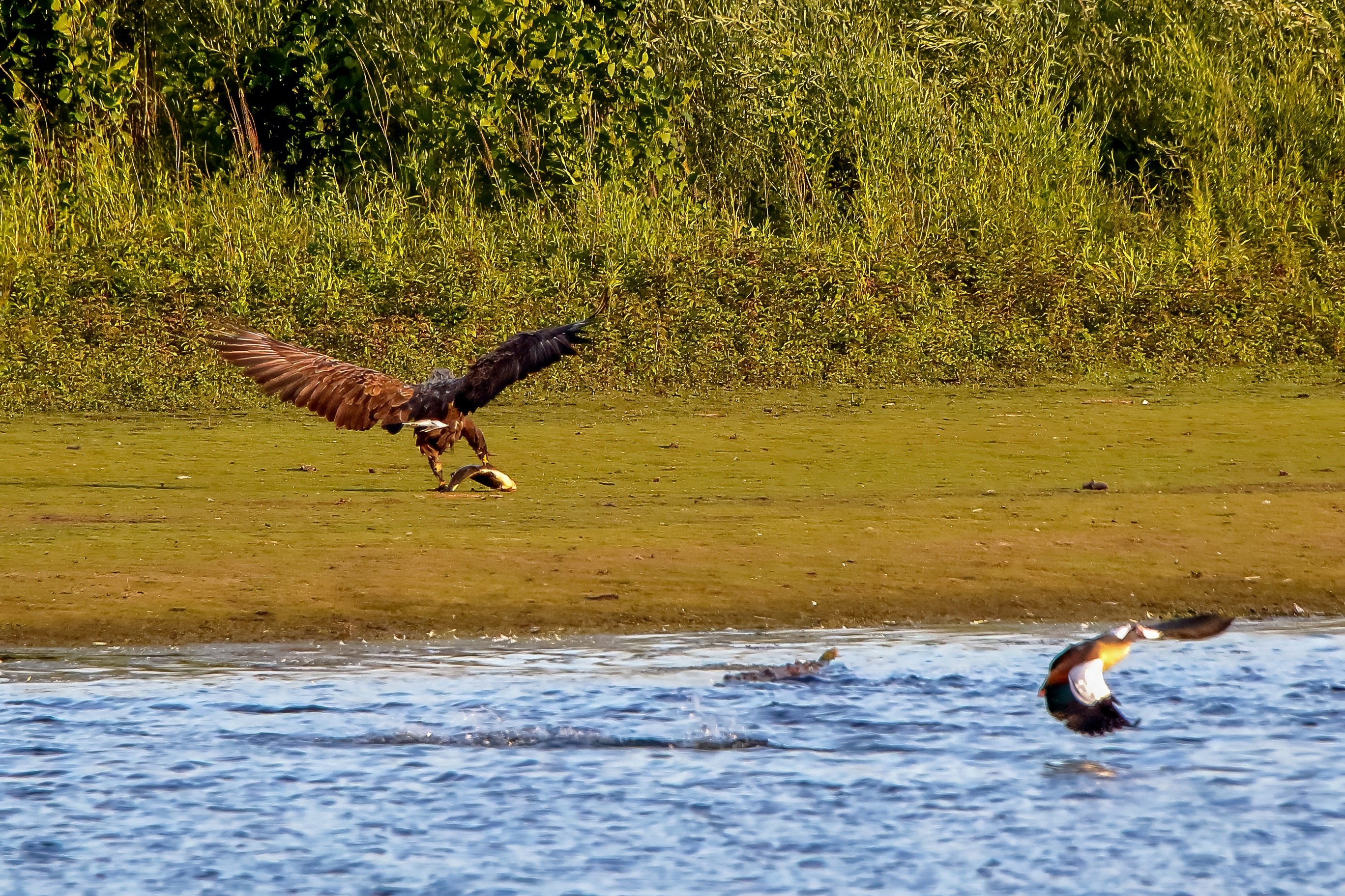 Spät, kurz vor Sonnenuntergang, zeigen sich die Seeadler bei der Fischjagd