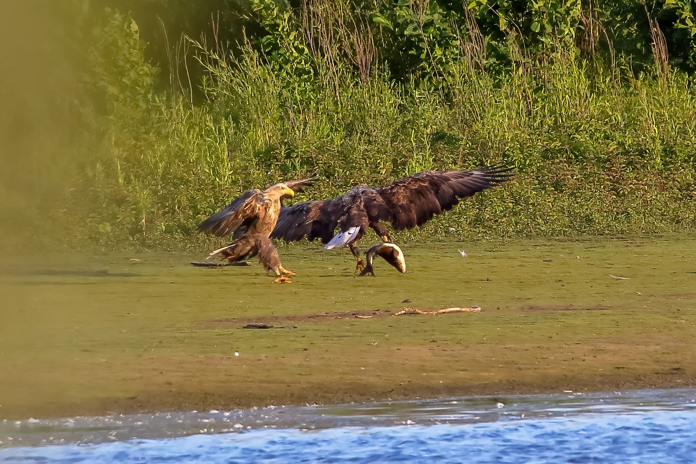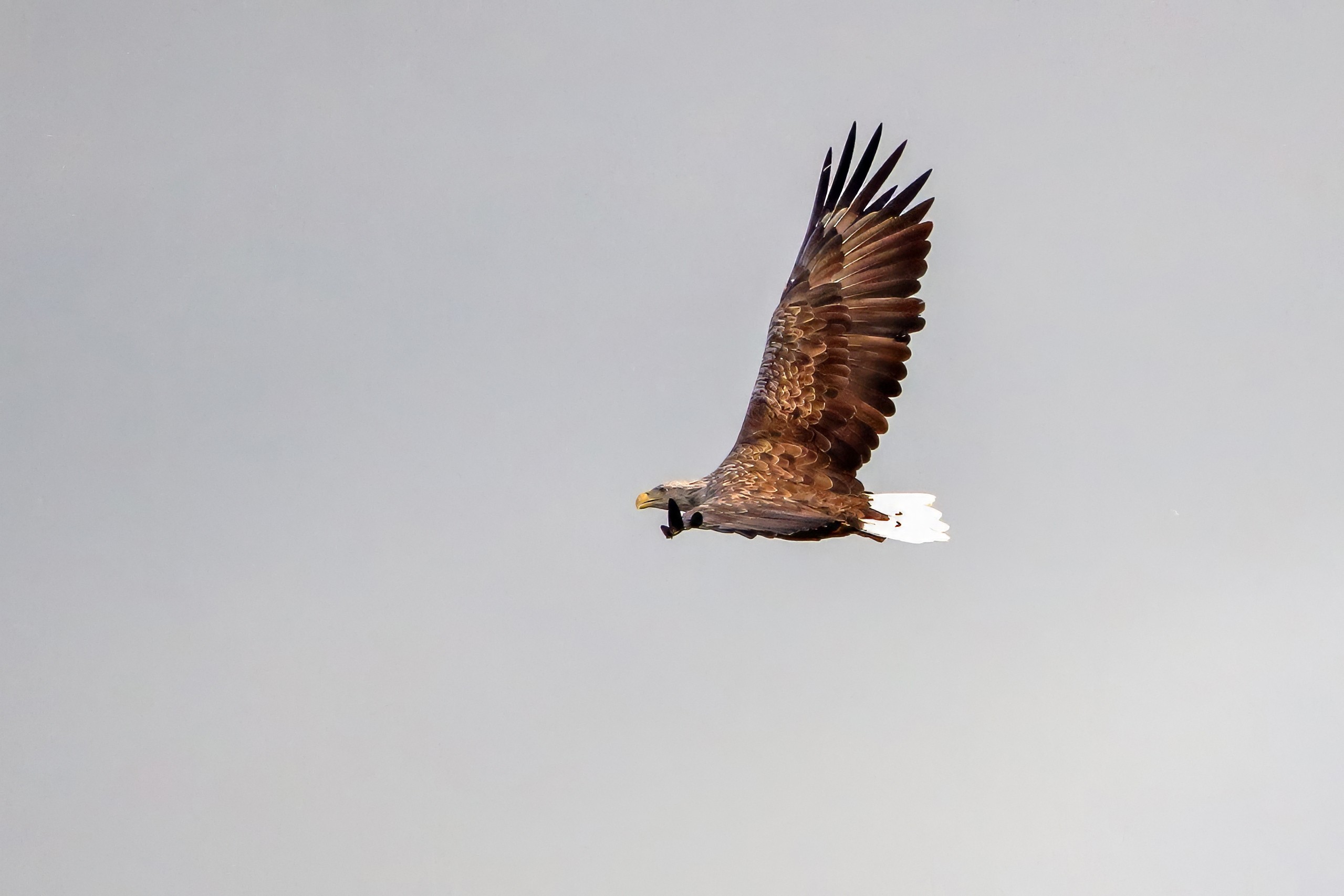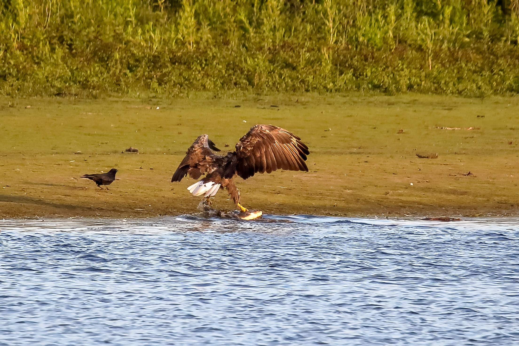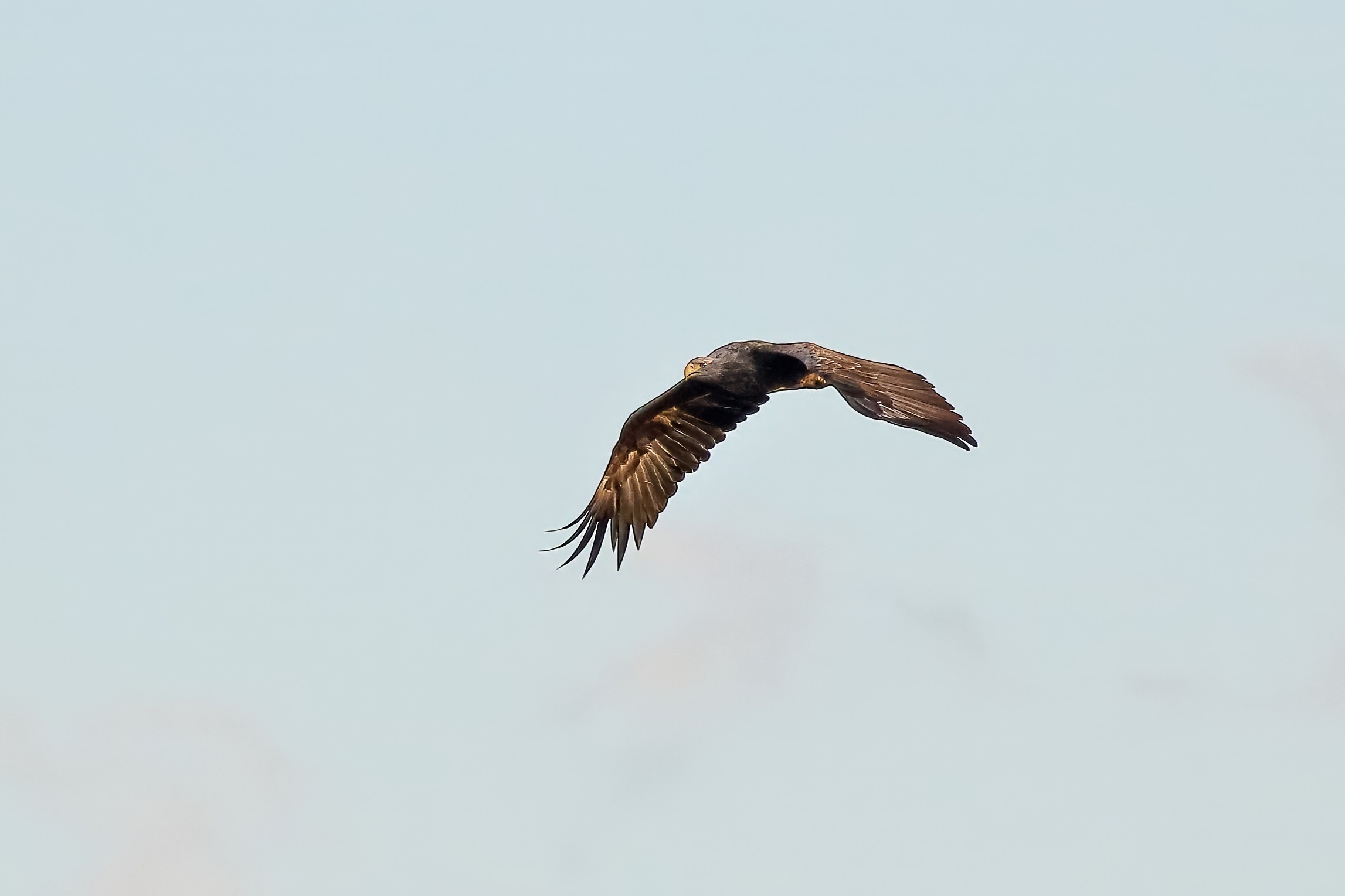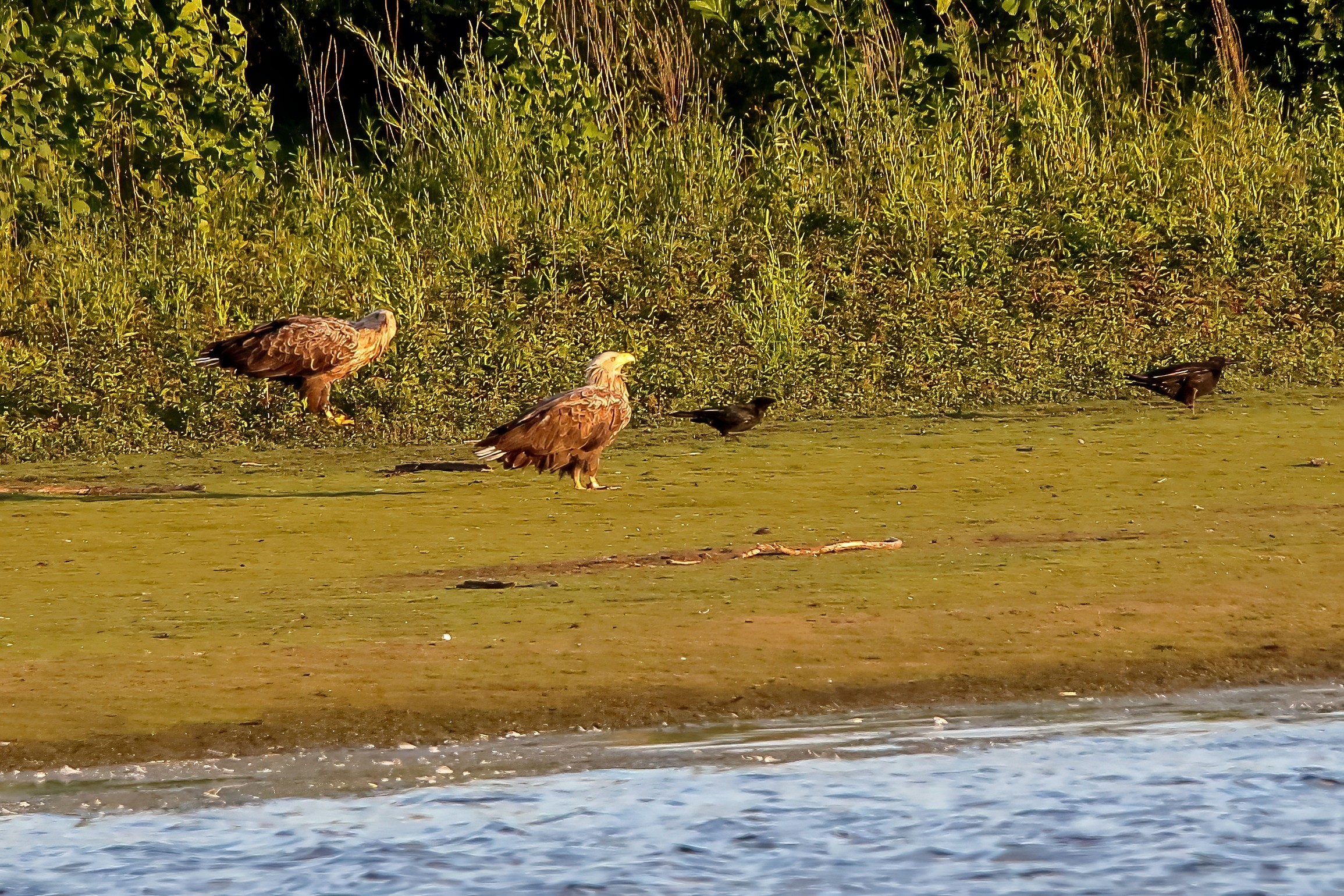 Spät, kurz vor Sonnenuntergang, zeigen sich die Seeadler bei der Fischjagd