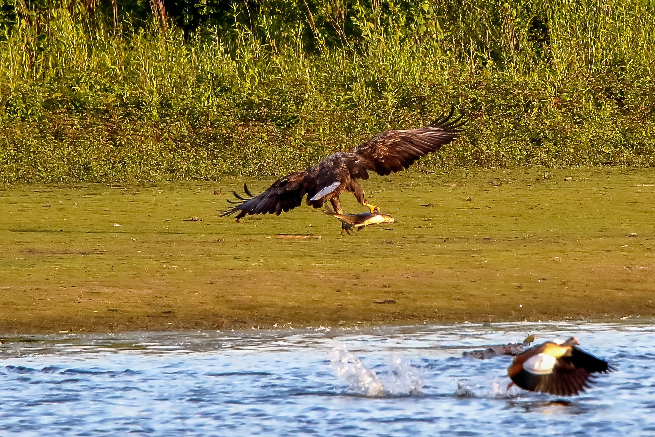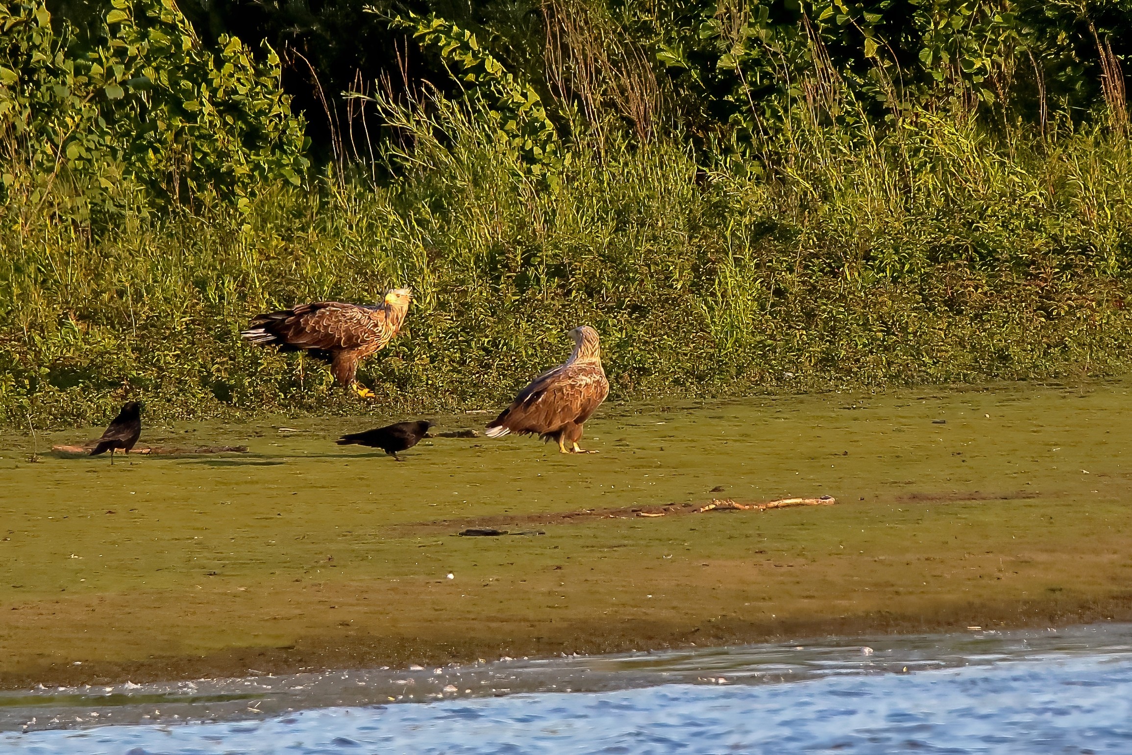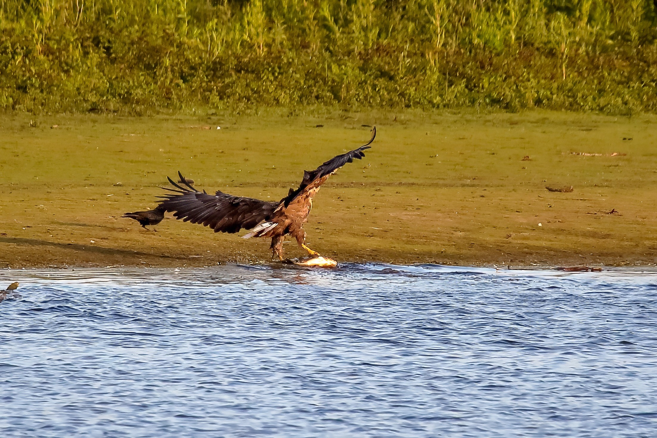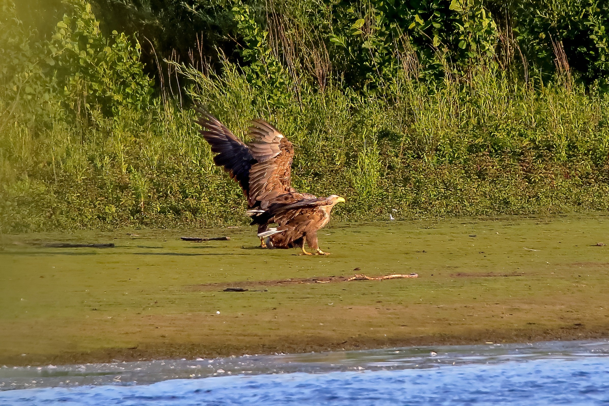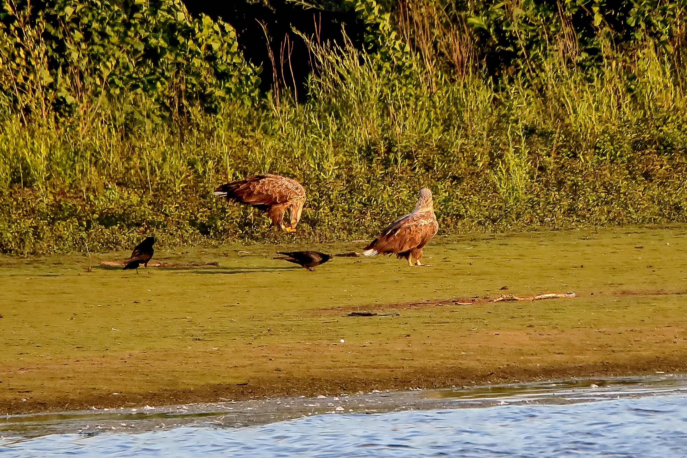 Spät, kurz vor Sonnenuntergang, zeigen sich die Seeadler bei der Fischjagd