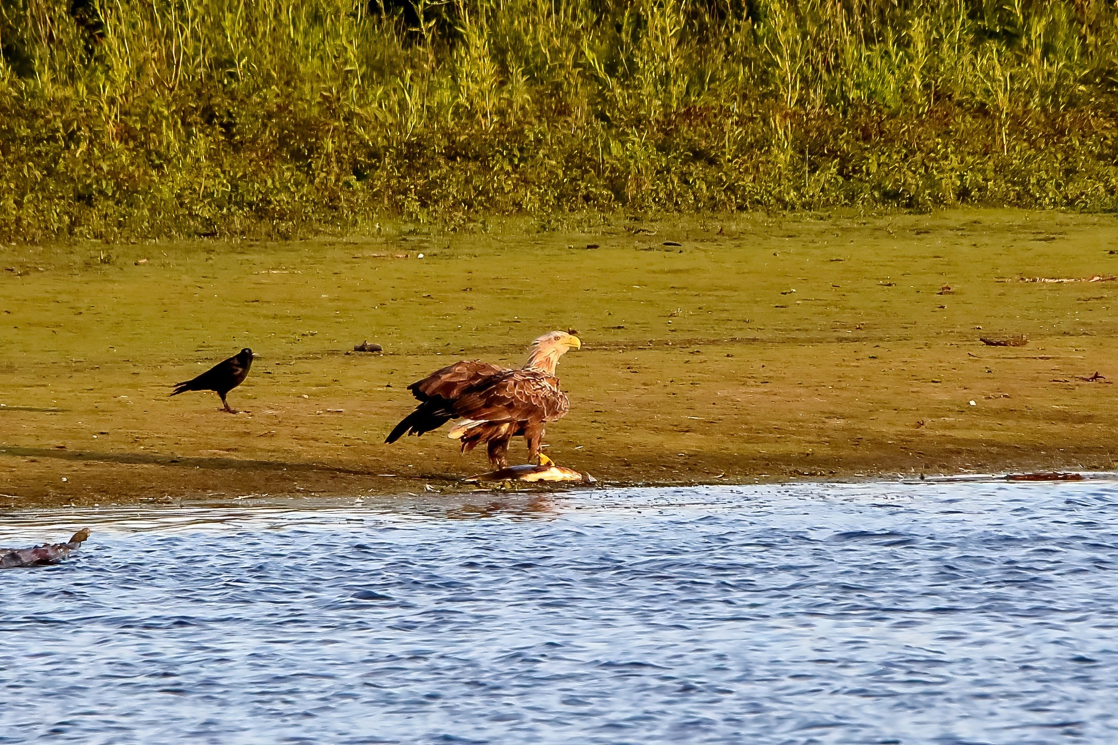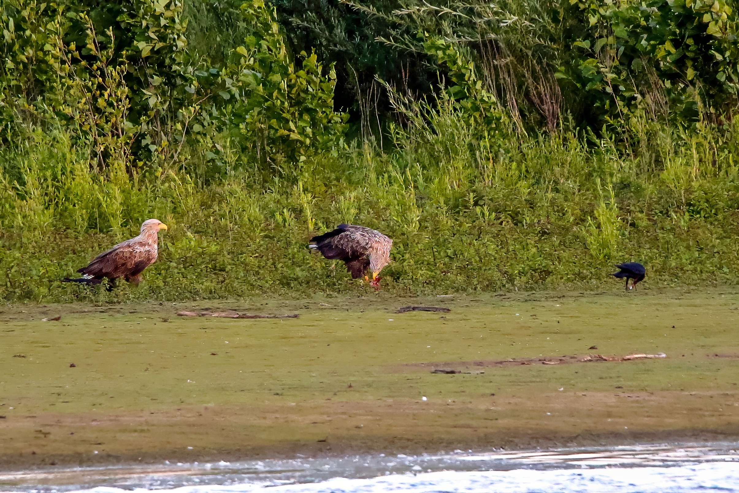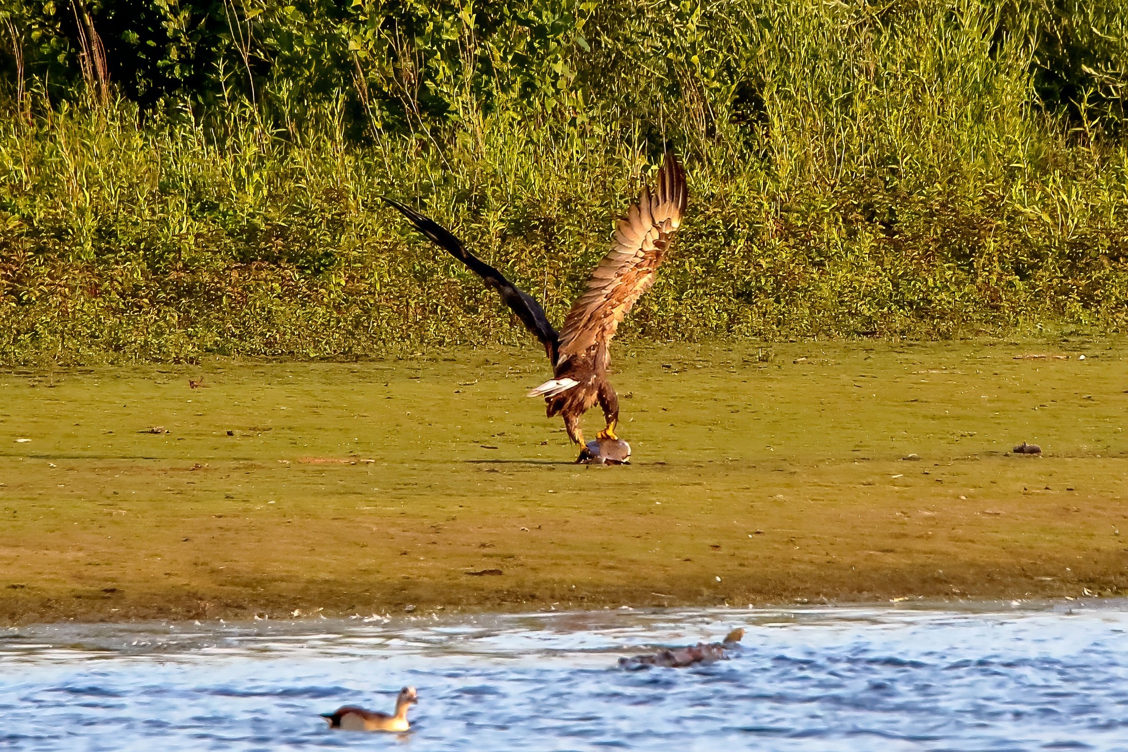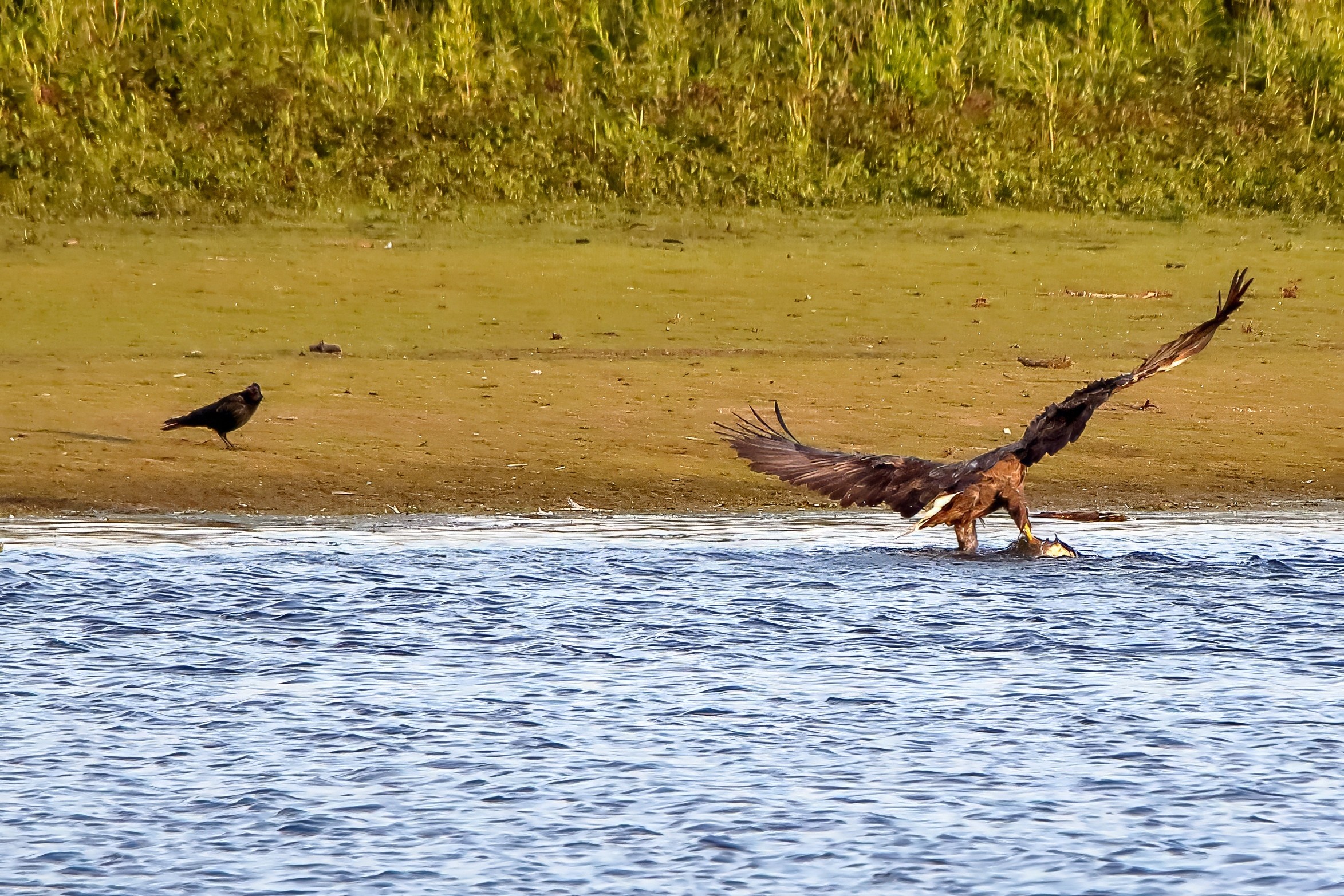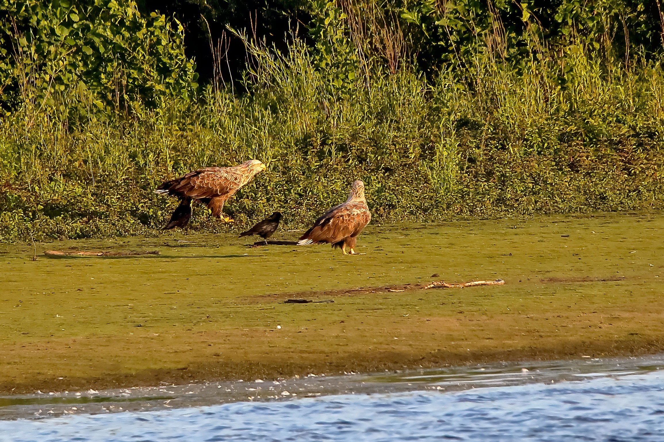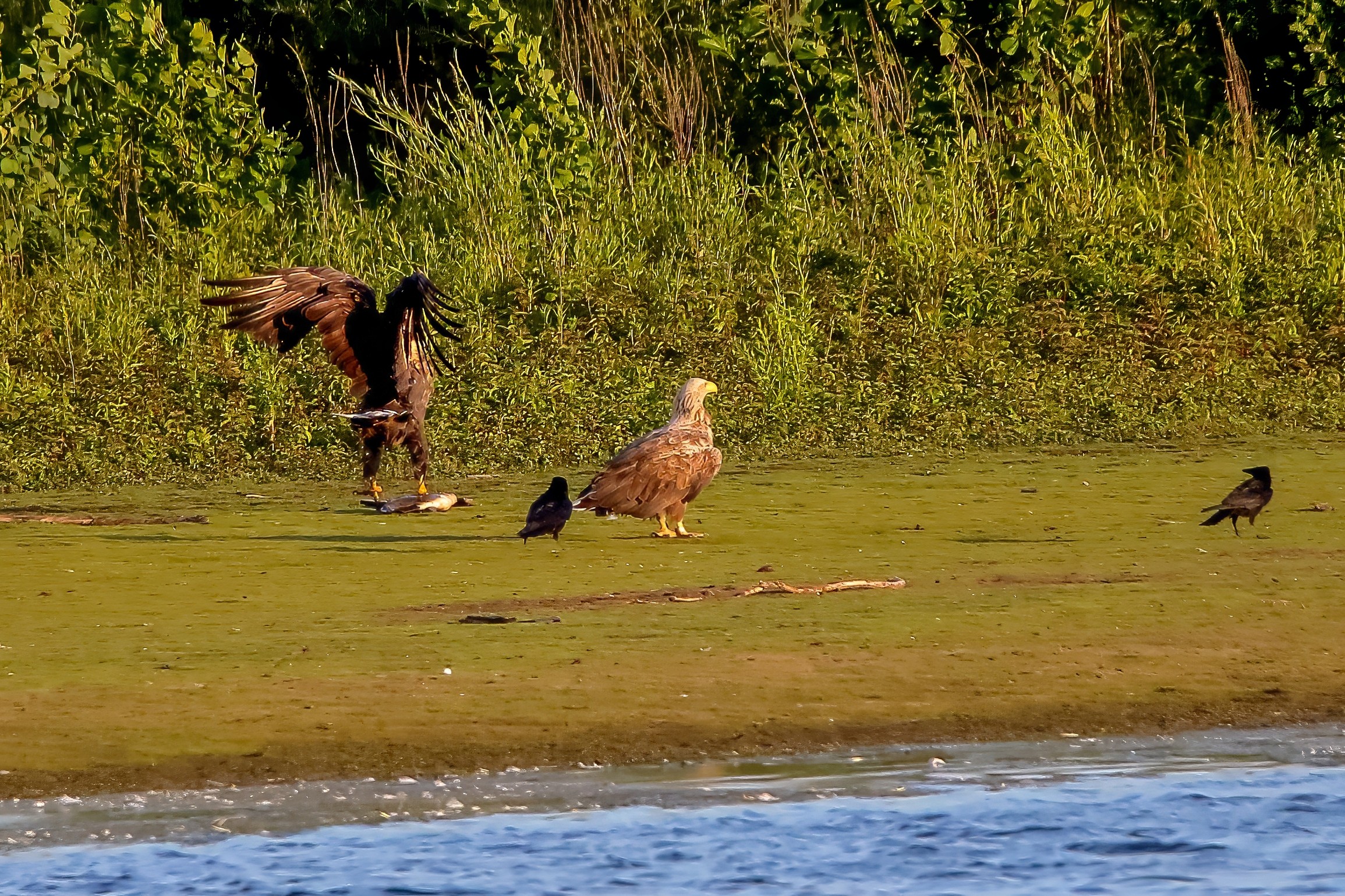 Spät, kurz vor Sonnenuntergang, zeigen sich die Seeadler bei der Fischjagd