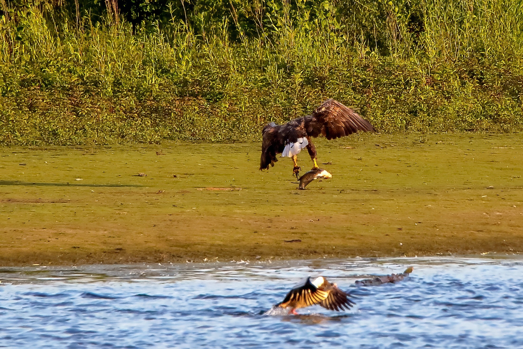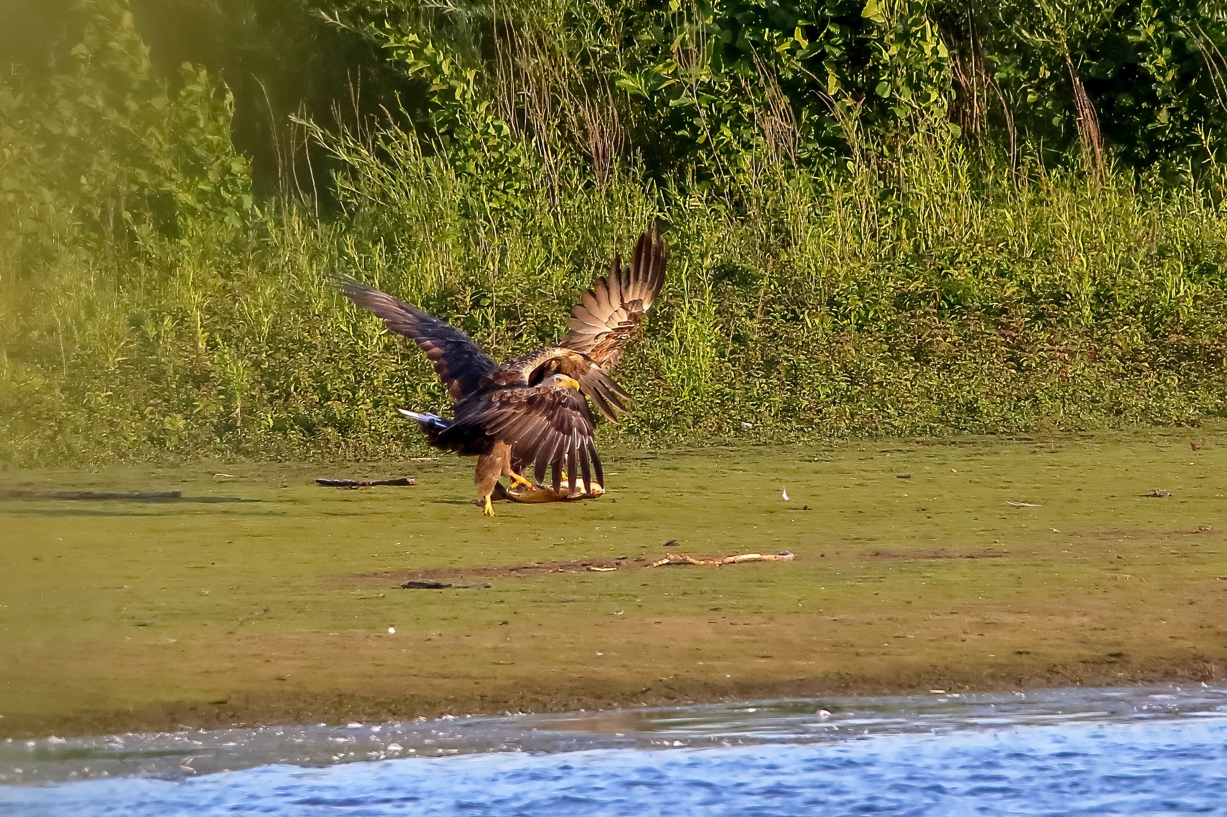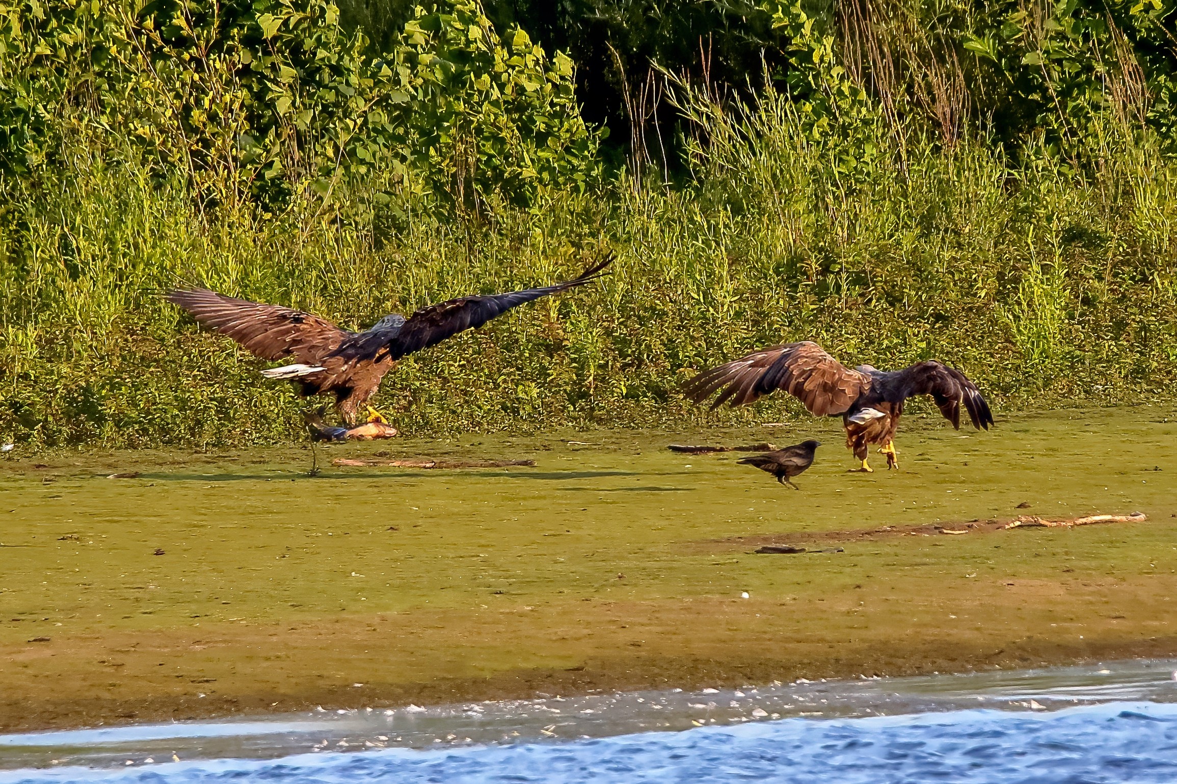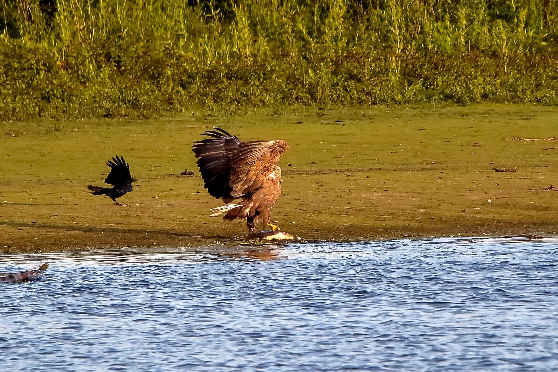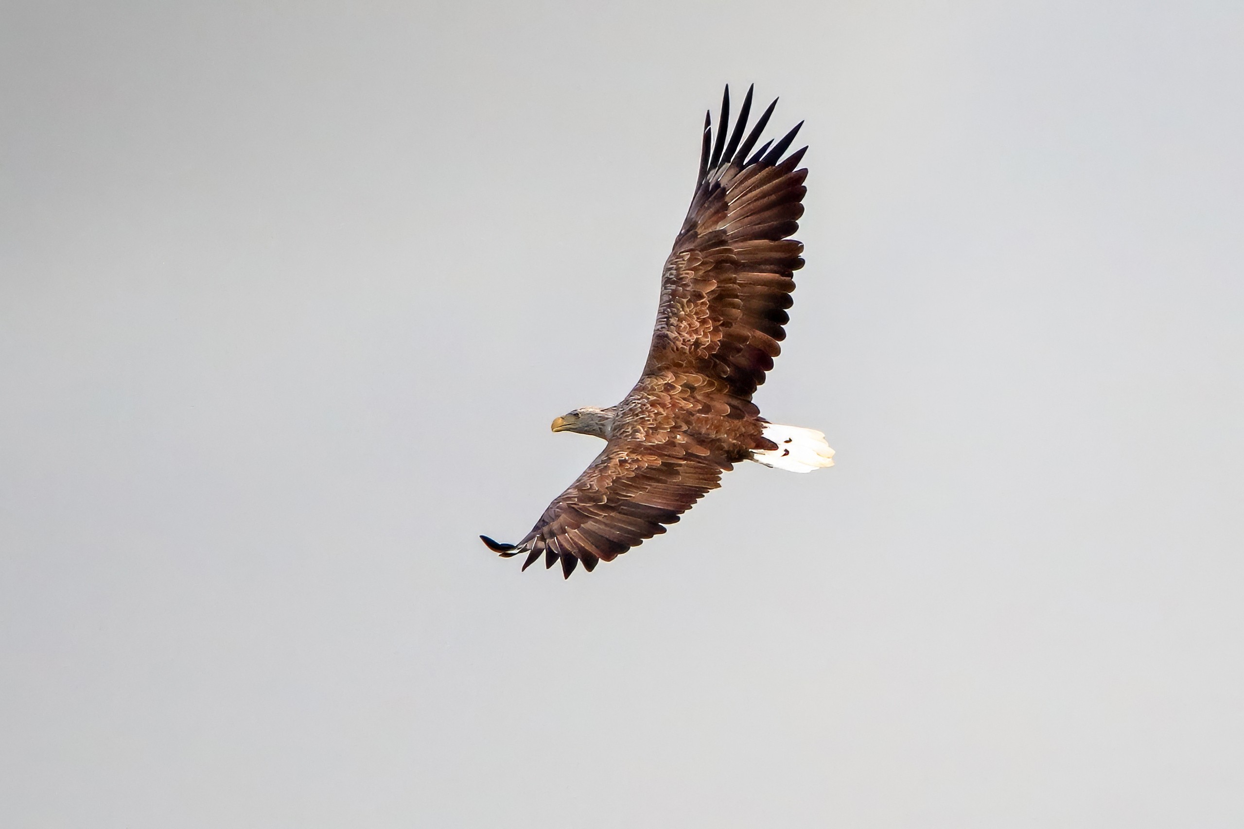 Spät, kurz vor Sonnenuntergang, zeigen sich die Seeadler bei der Fischjagd