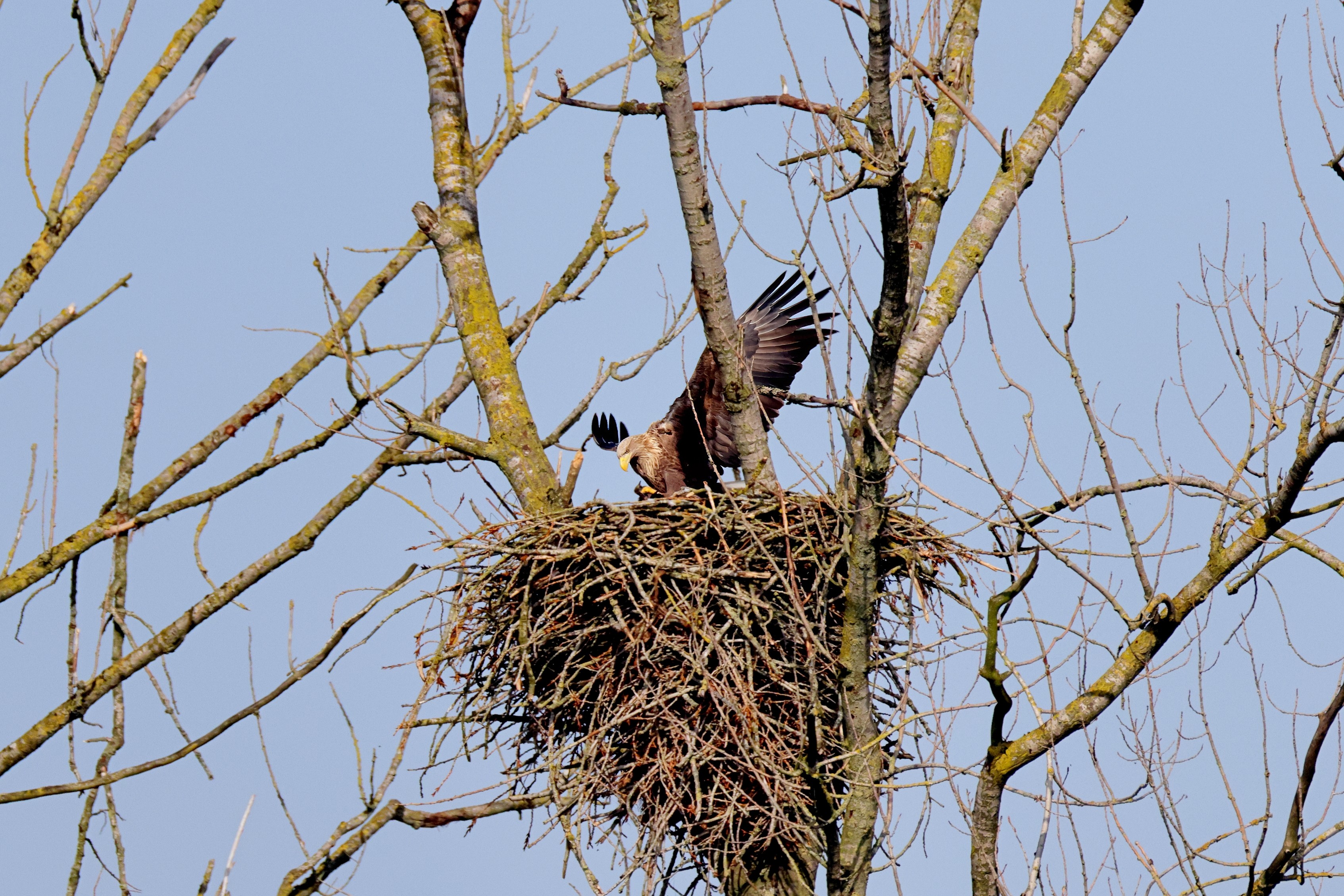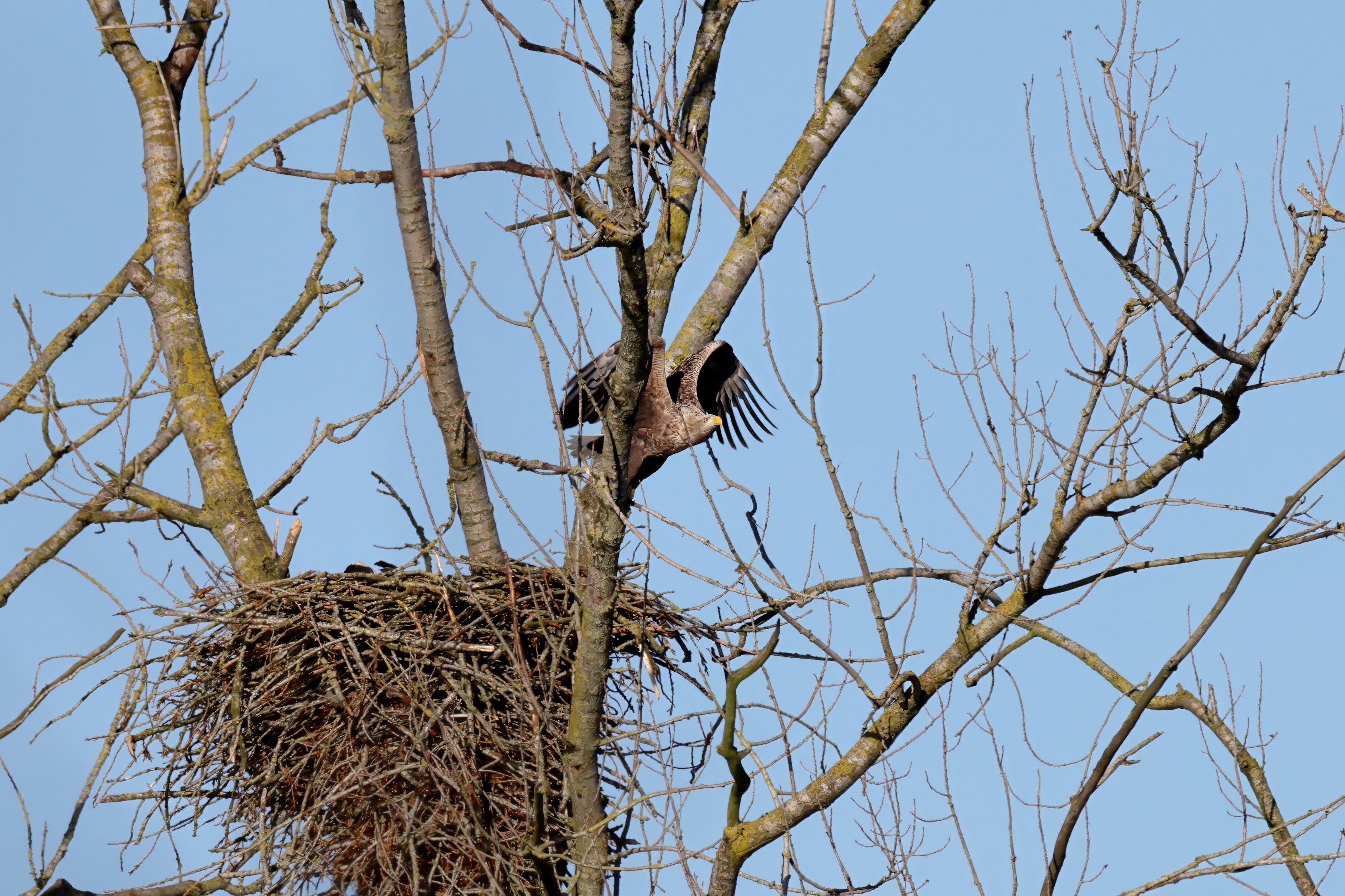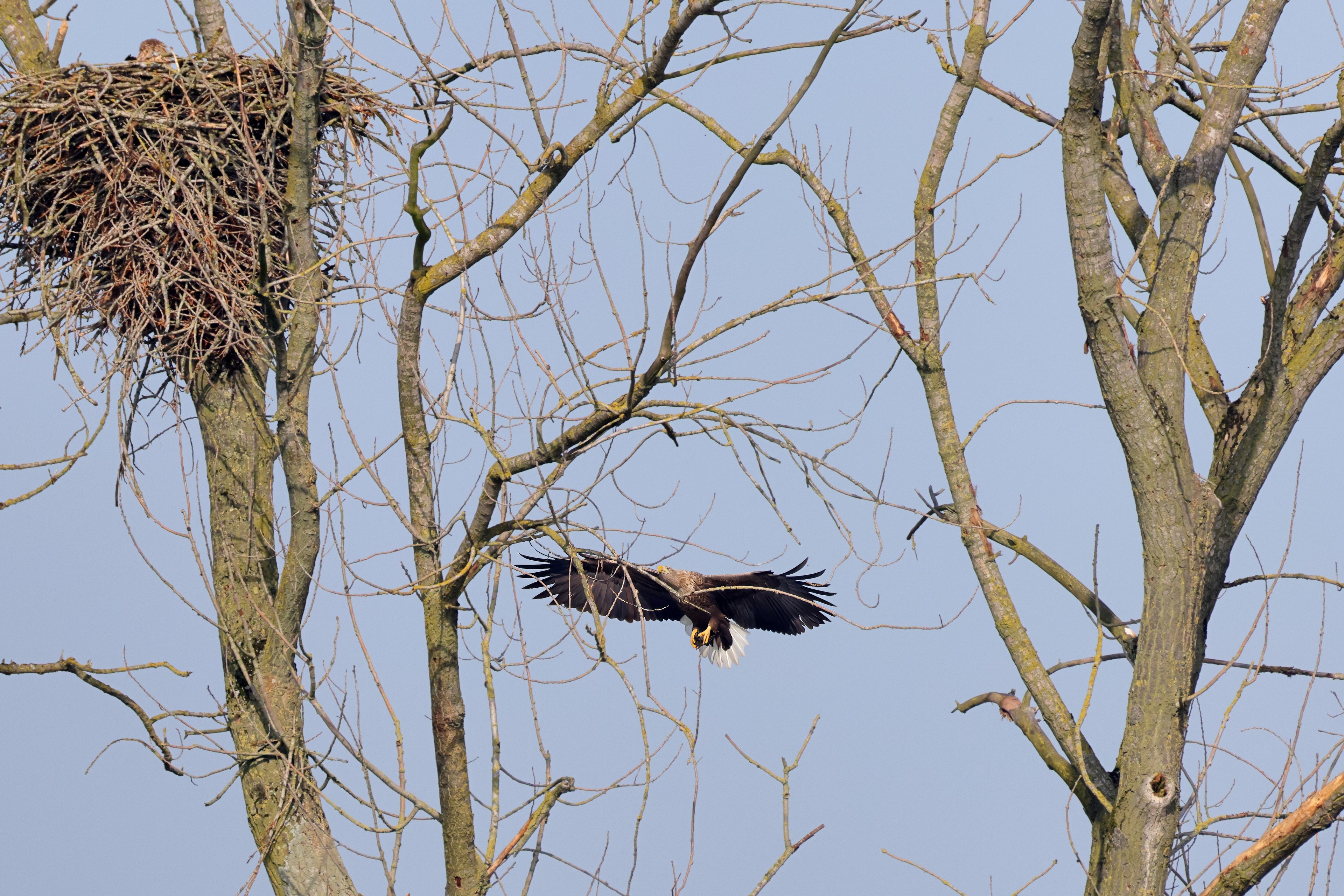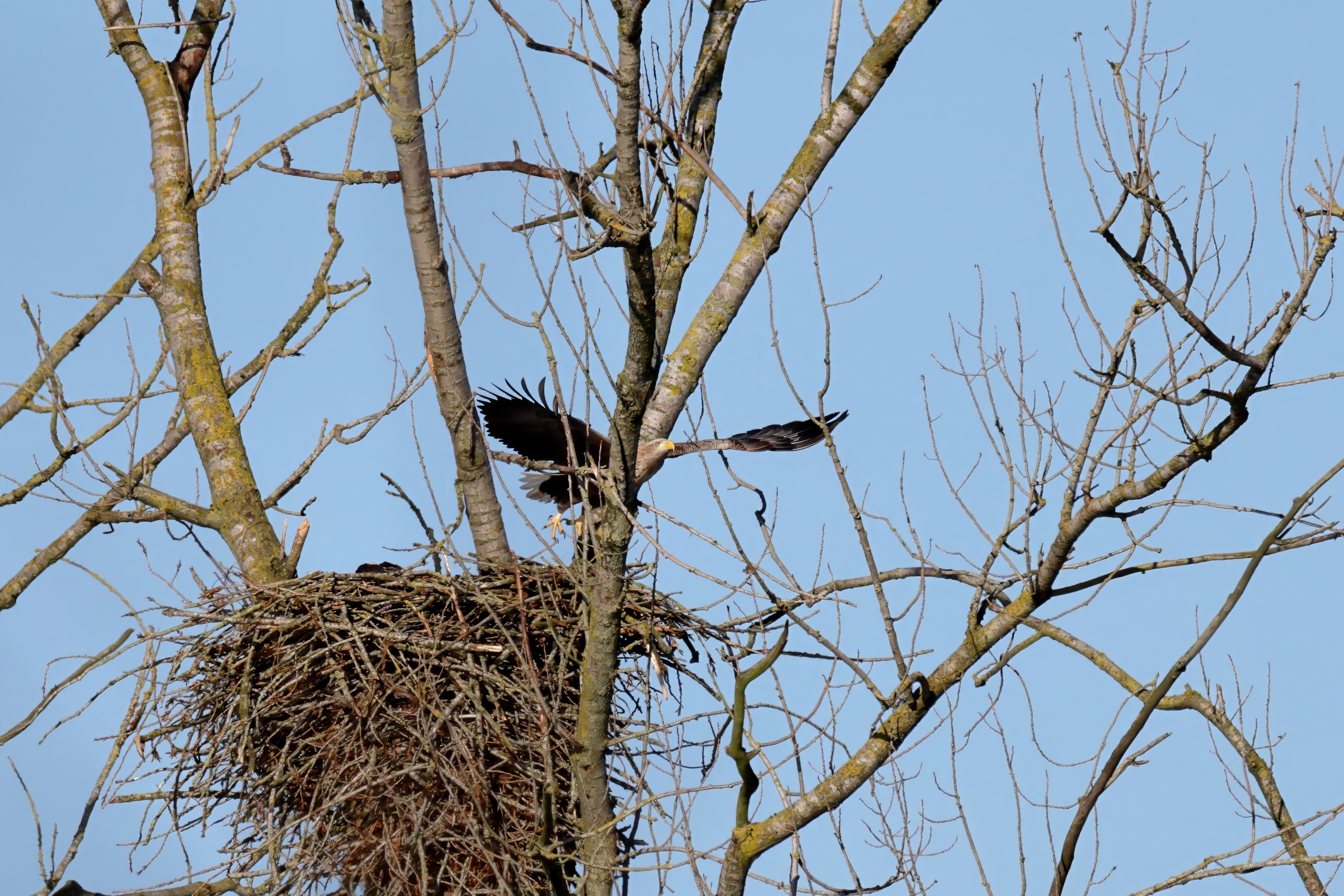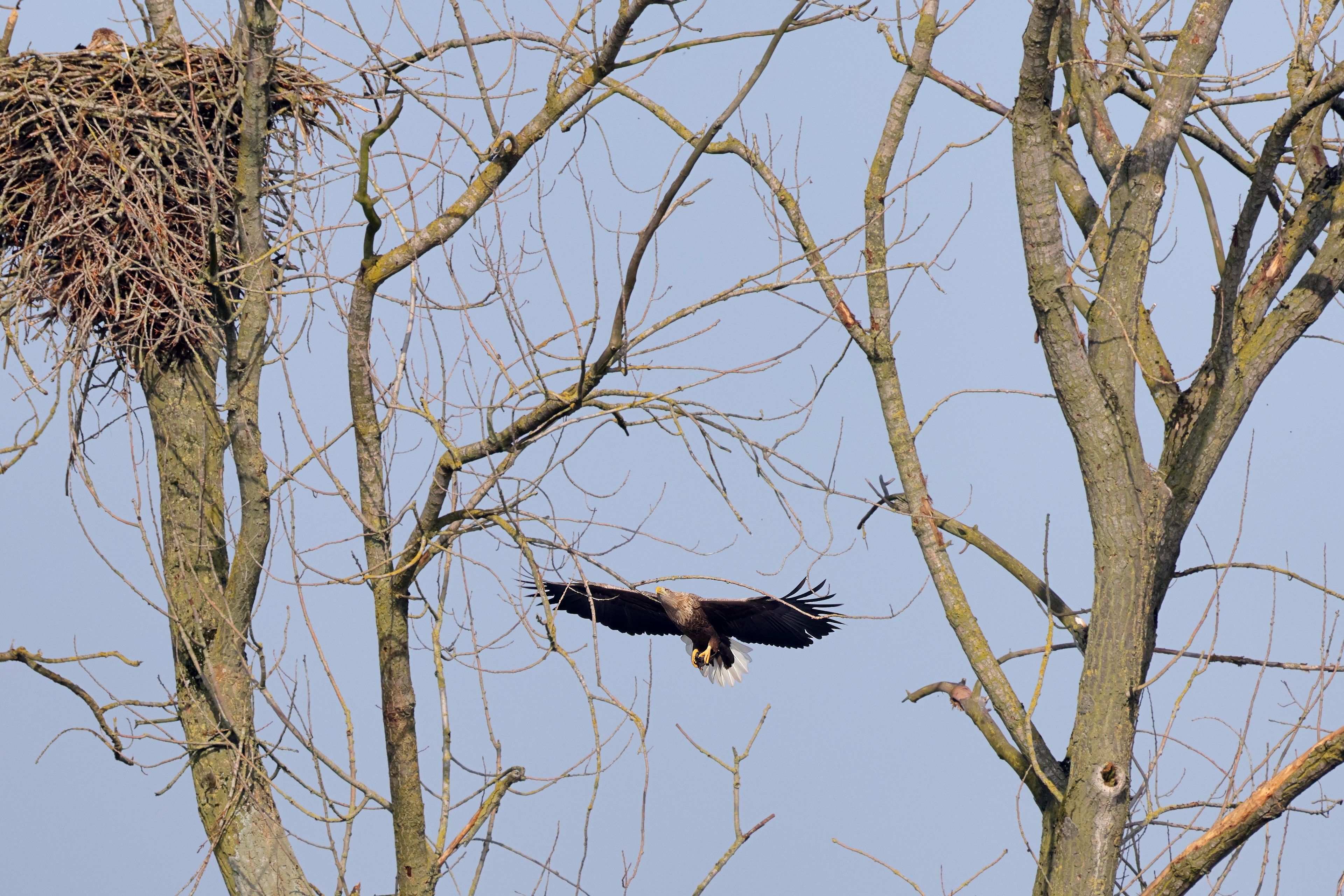 Während der etwa 38 bis 42 Tage dauernden Brutzeit der Seeadler kommt es meist nur zu kurzen Ablösungen zwischen den Partnern. Doch wenn gutes Wetter, die Tageszeit und der natürliche Bewegungsdrang nach den langen Brutsitzungen zusammentreffen, lassen sich vom abgelösten Partner manchmal ganz besondere Aufnahmen gestalten.