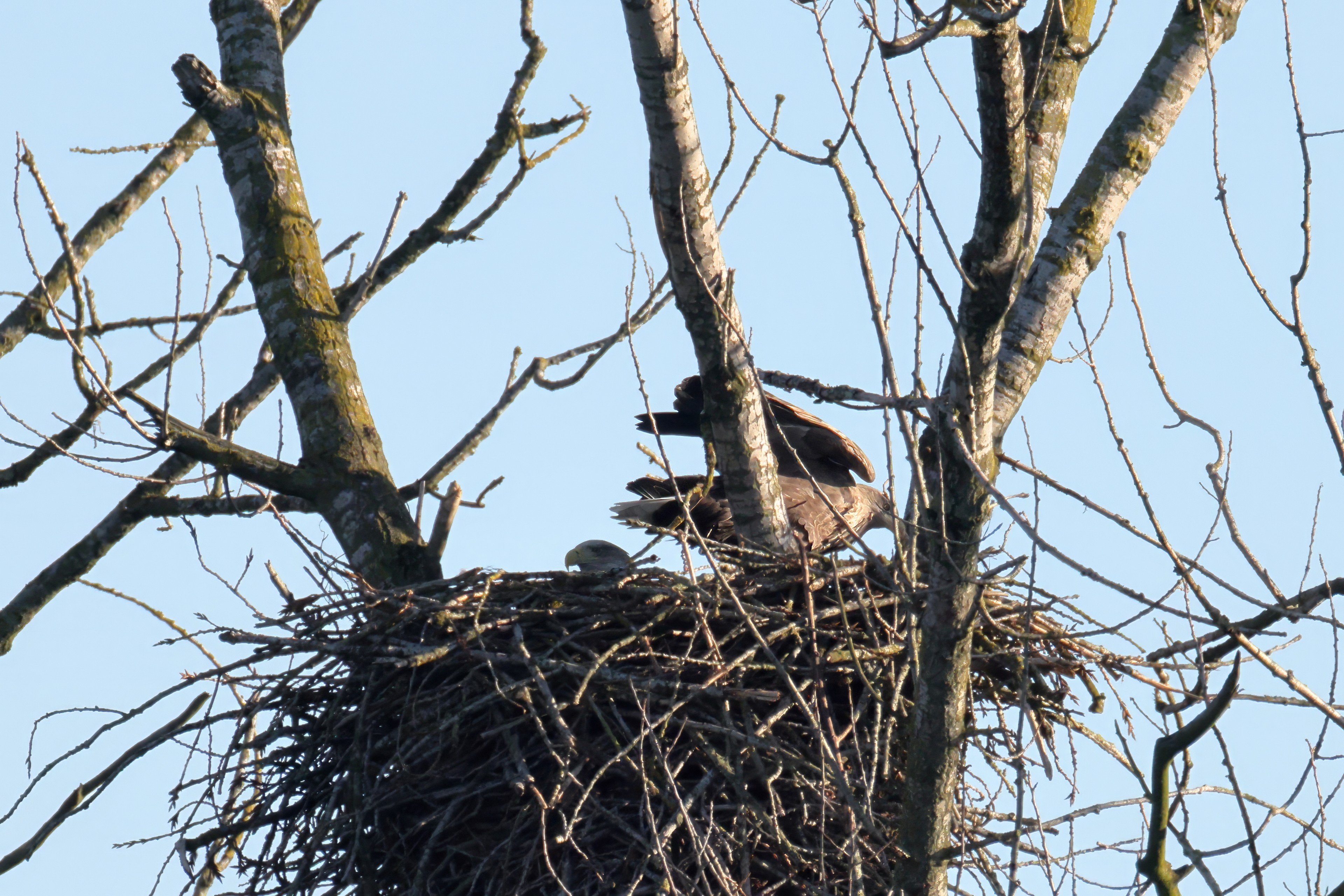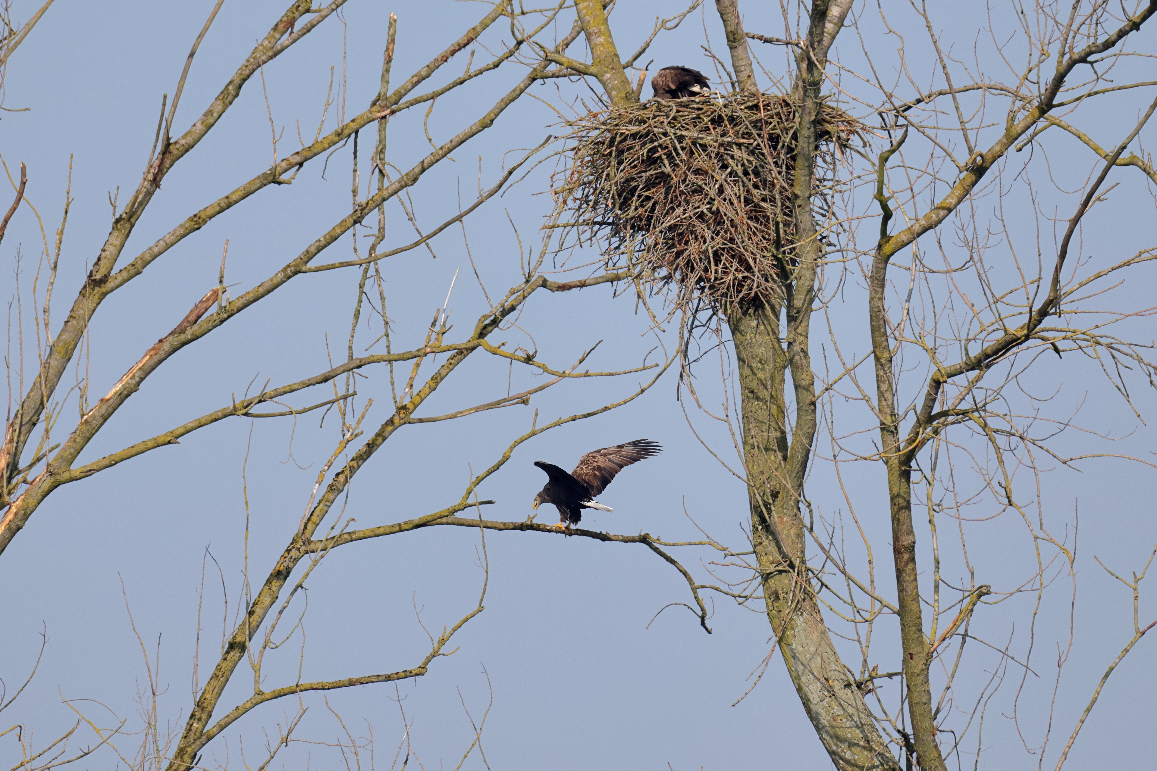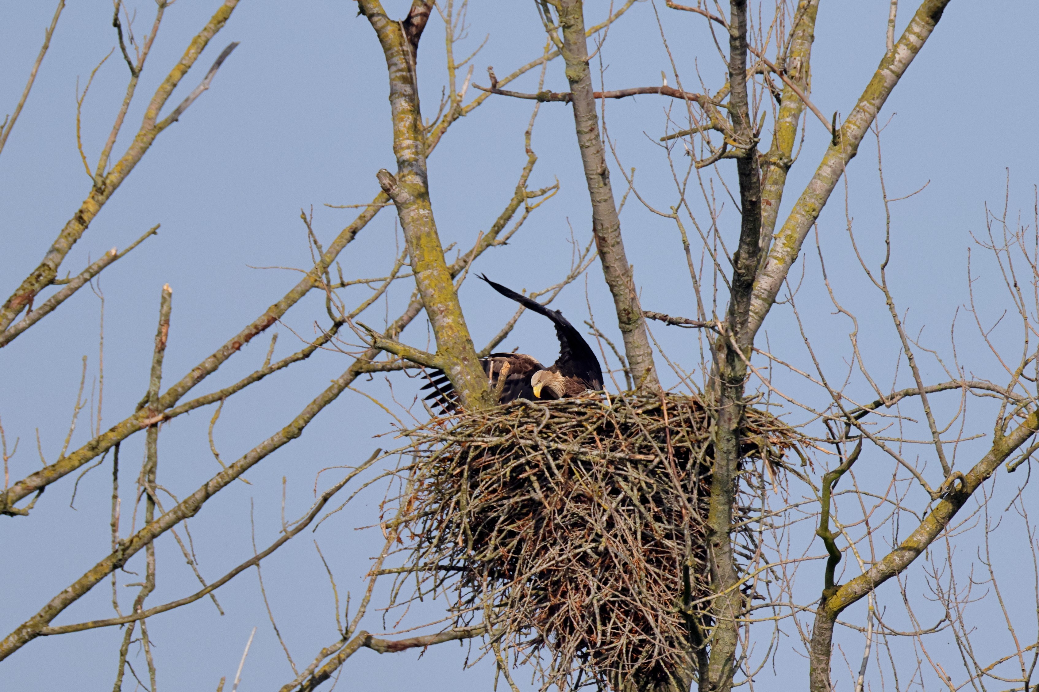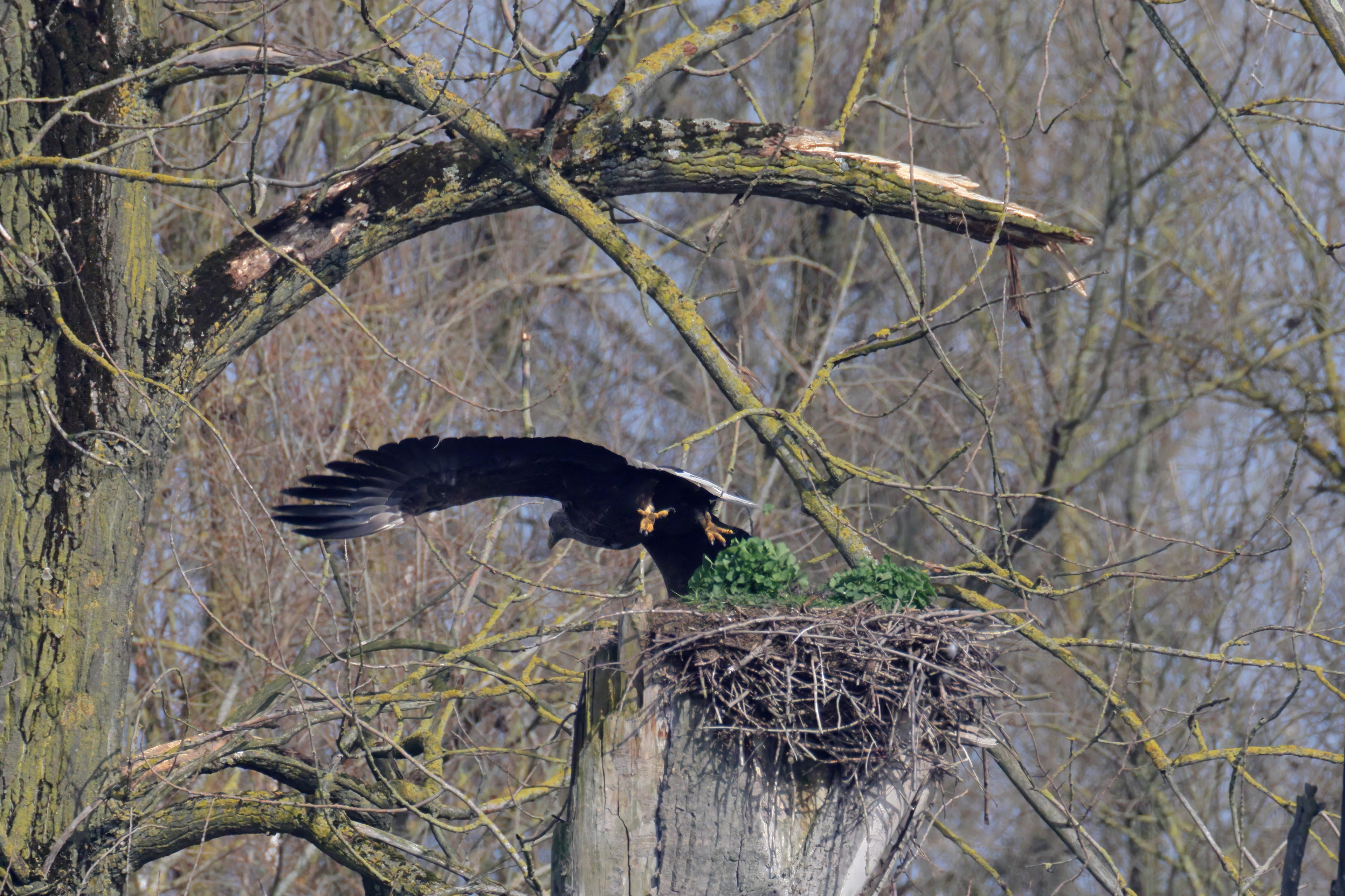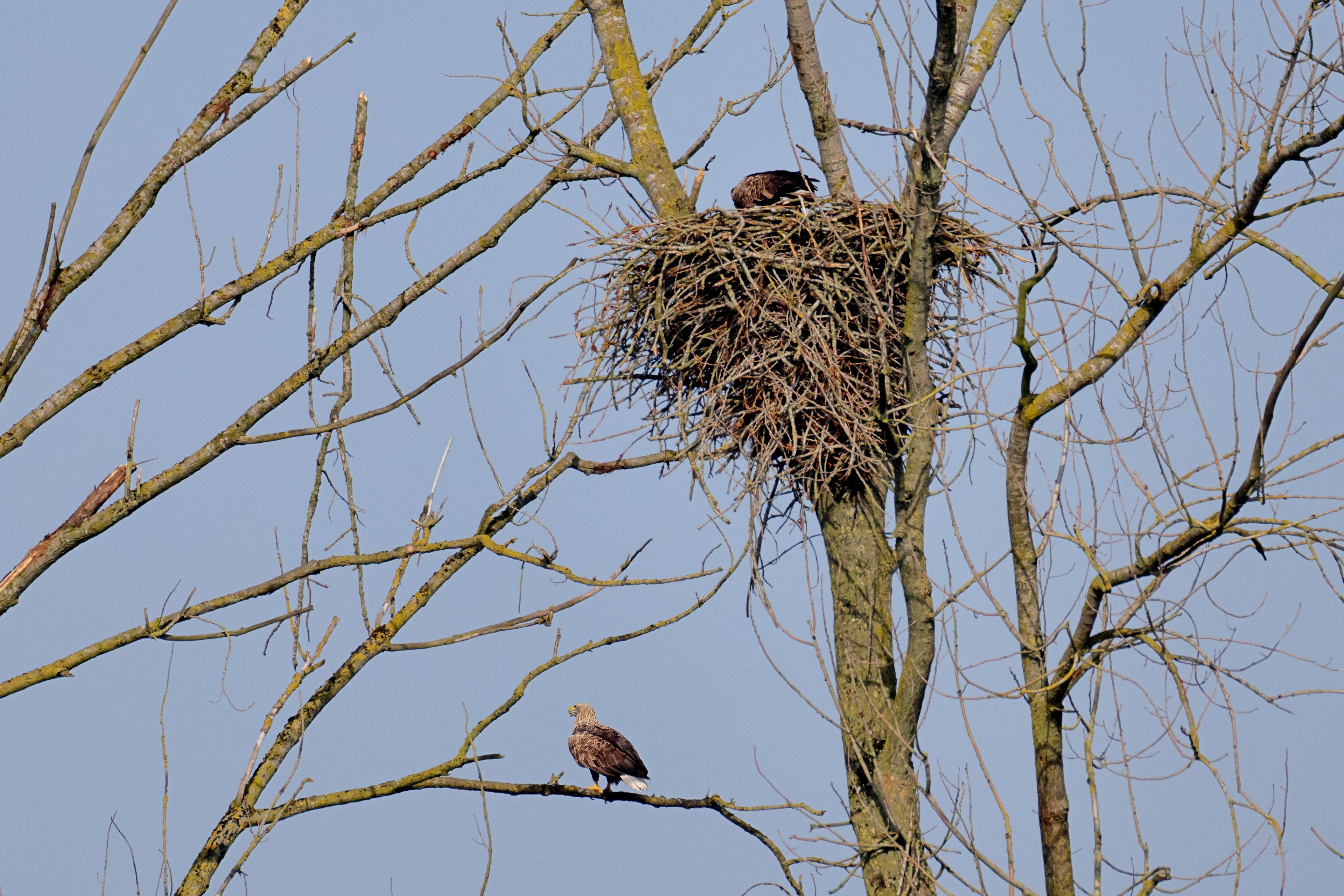 Während der etwa 38 bis 42 Tage dauernden Brutzeit der Seeadler kommt es meist nur zu kurzen Ablösungen zwischen den Partnern. Doch wenn gutes Wetter, die Tageszeit und der natürliche Bewegungsdrang nach den langen Brutsitzungen zusammentreffen, lassen sich vom abgelösten Partner manchmal ganz besondere Aufnahmen gestalten.