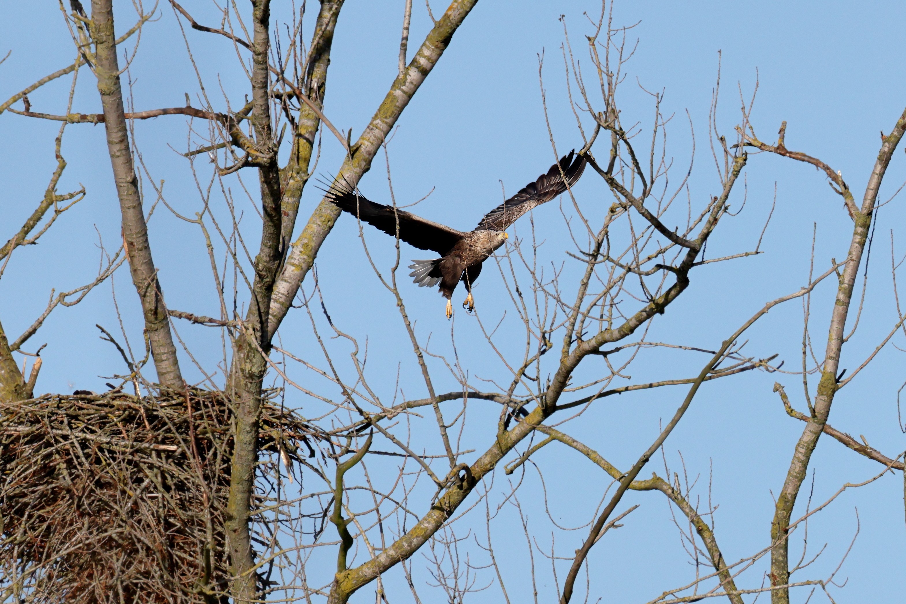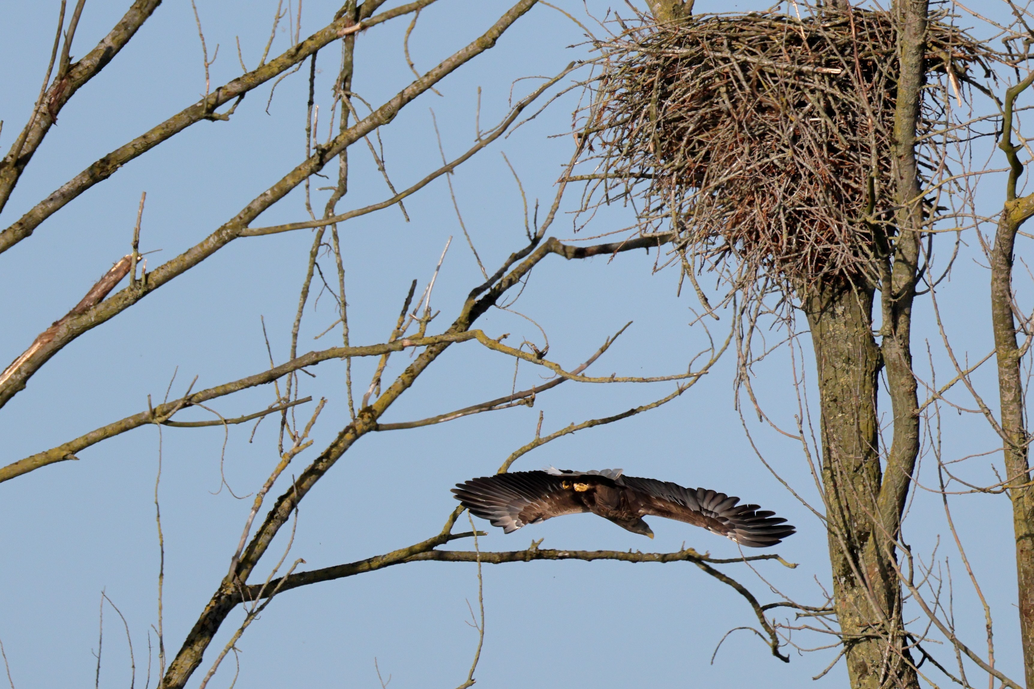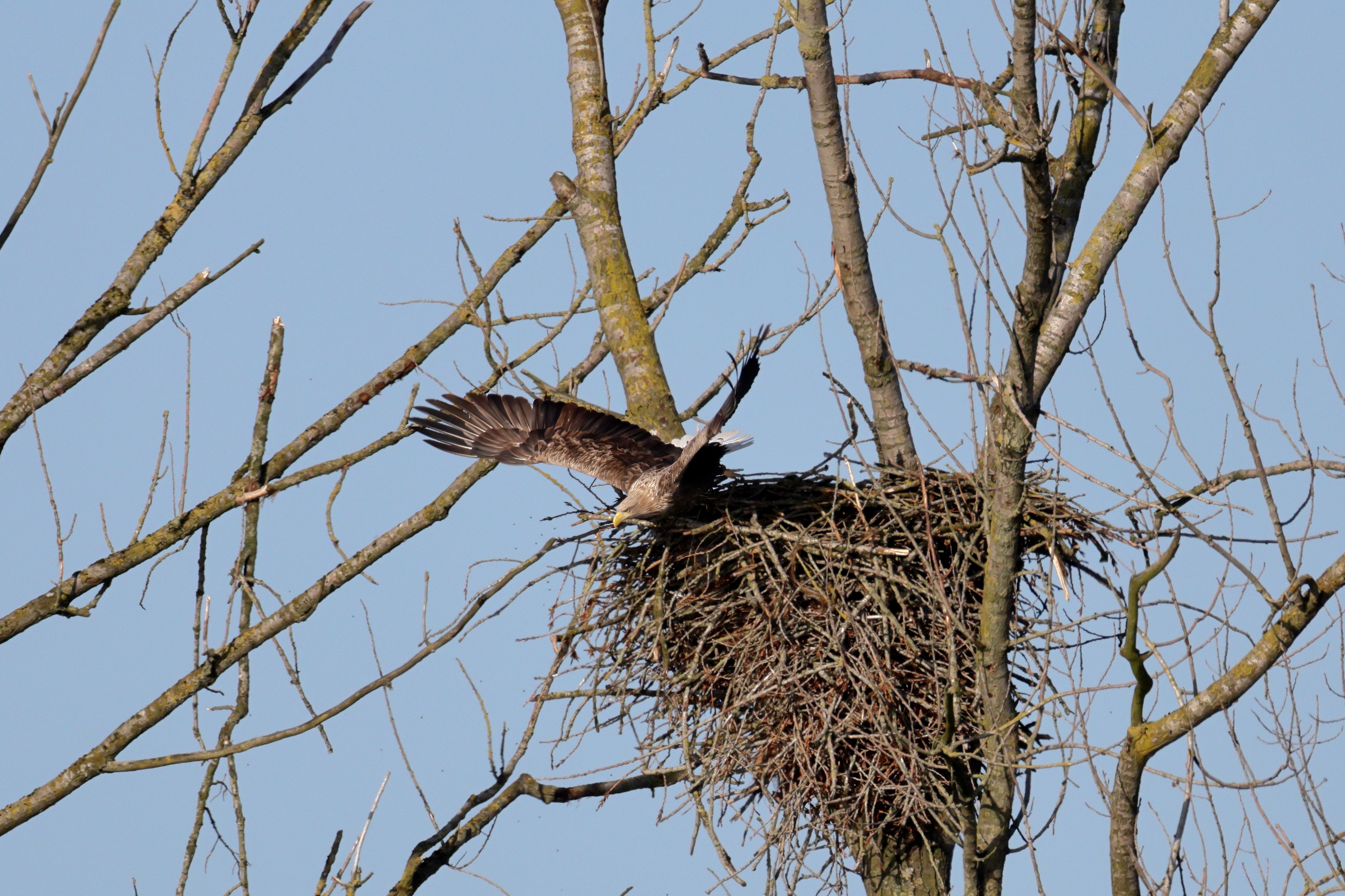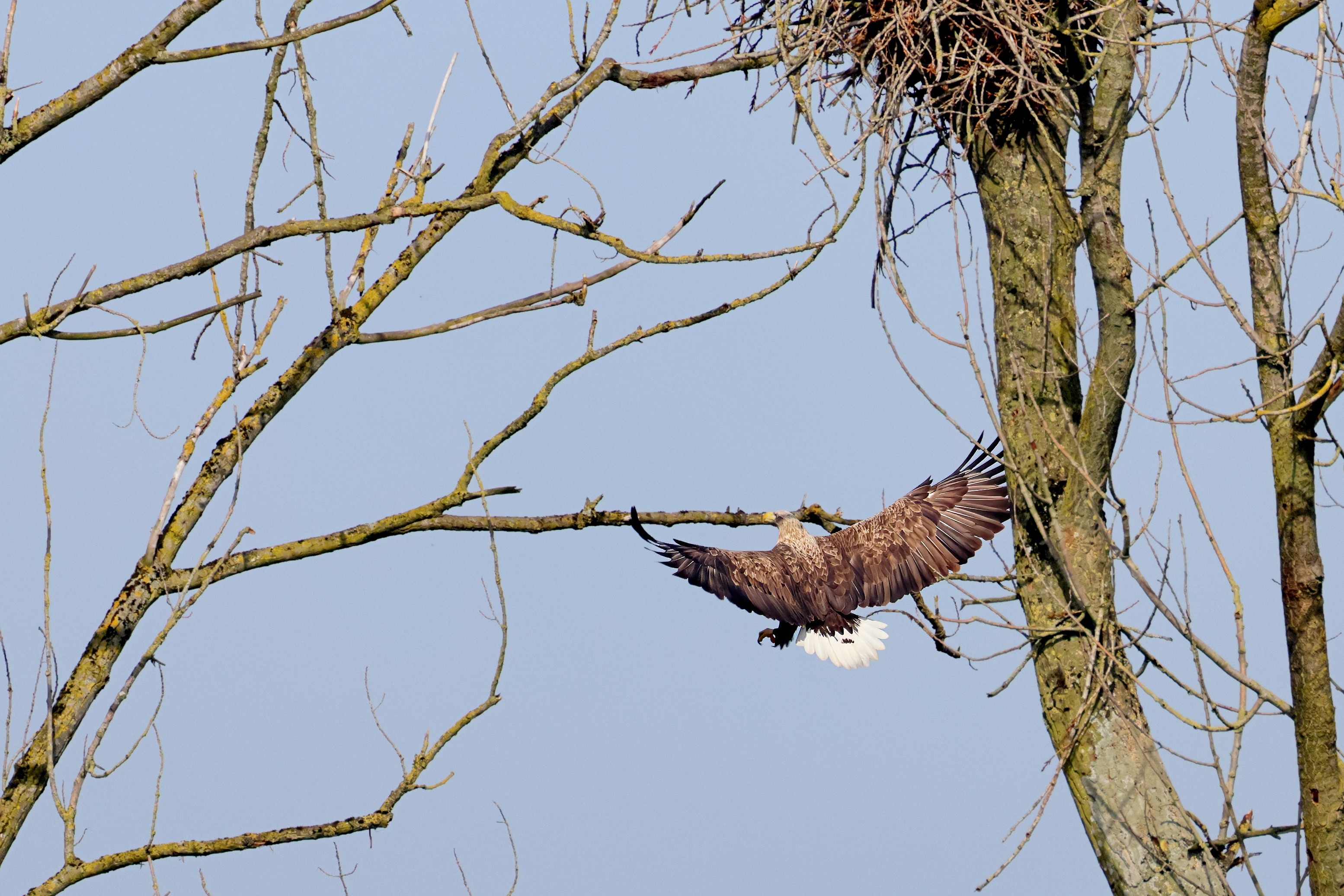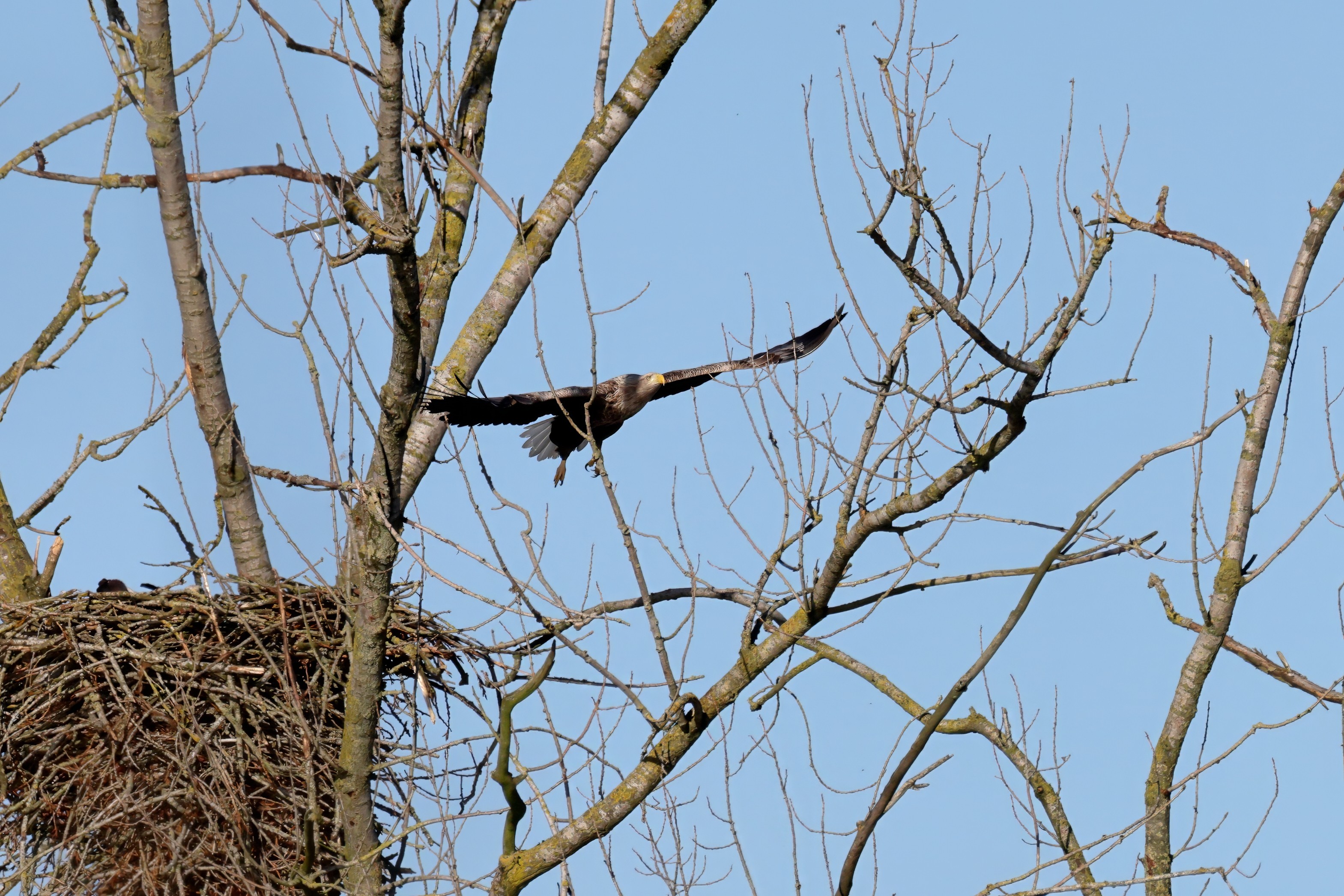 Während der etwa 38 bis 42 Tage dauernden Brutzeit der Seeadler kommt es meist nur zu kurzen Ablösungen zwischen den Partnern. Doch wenn gutes Wetter, die Tageszeit und der natürliche Bewegungsdrang nach den langen Brutsitzungen zusammentreffen, lassen sich vom abgelösten Partner manchmal ganz besondere Aufnahmen gestalten.
