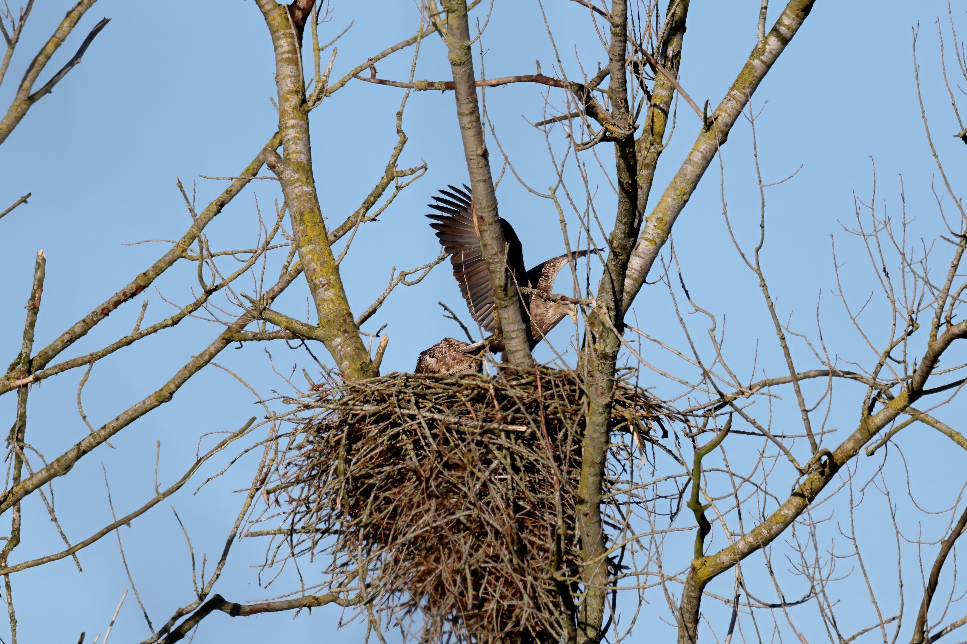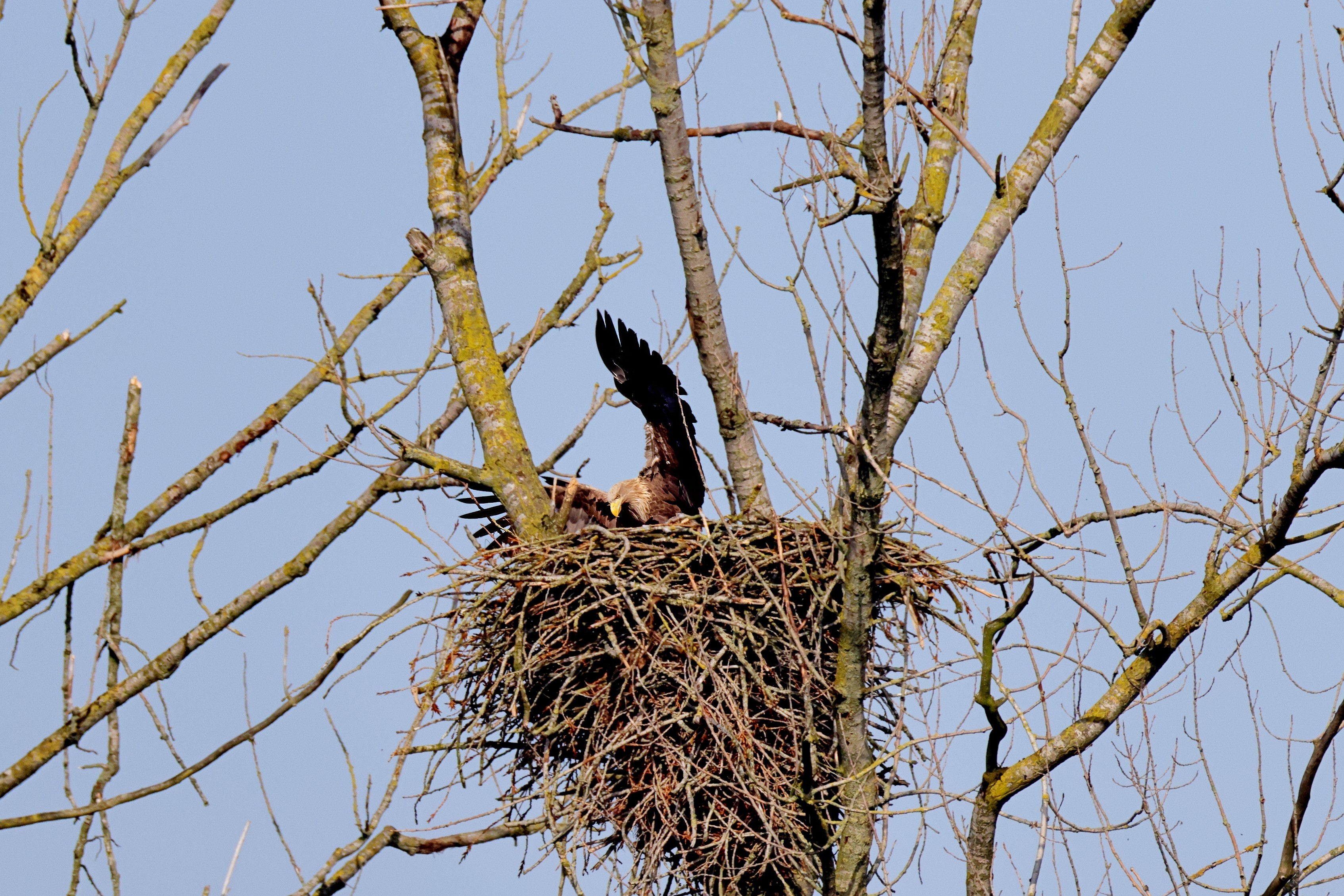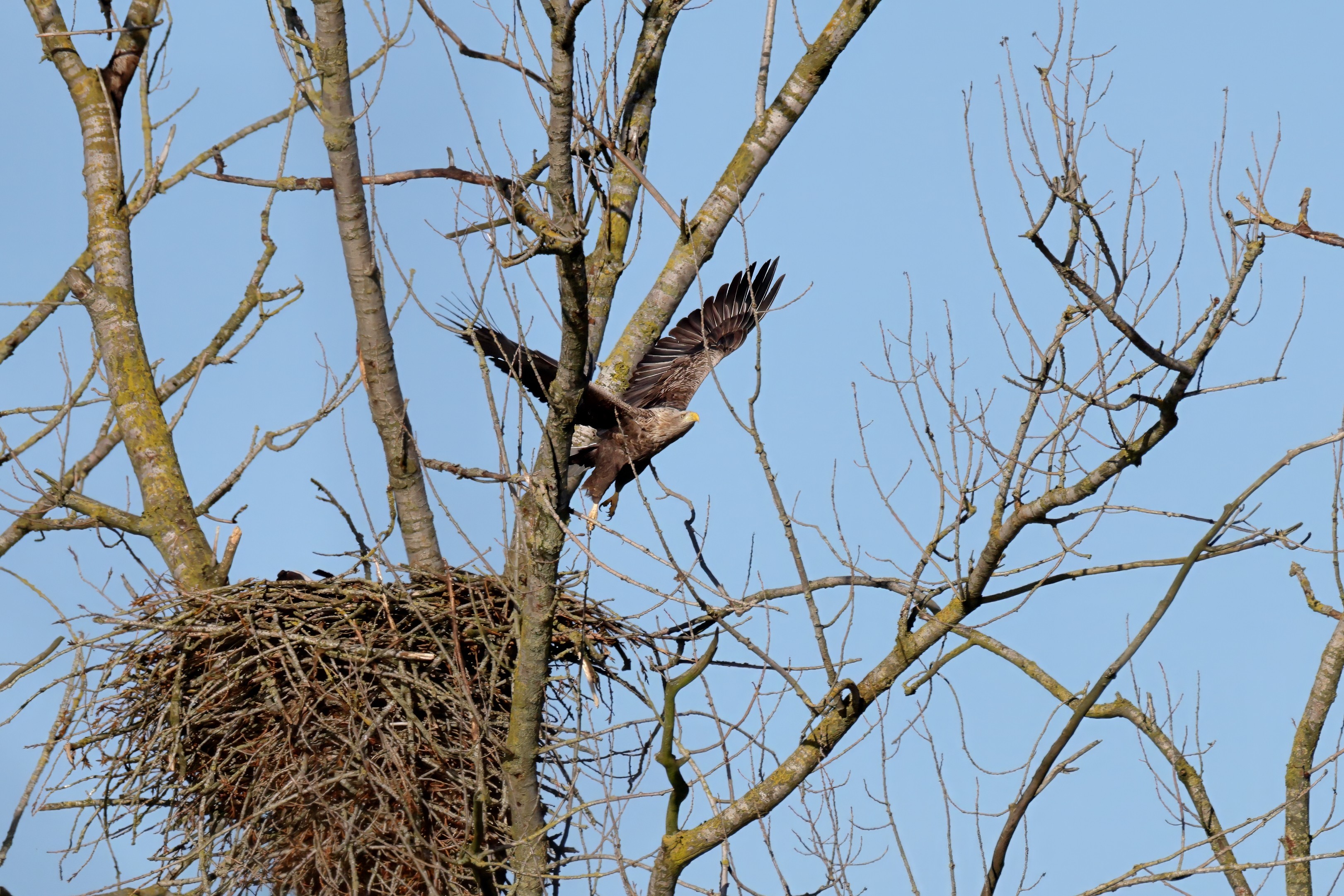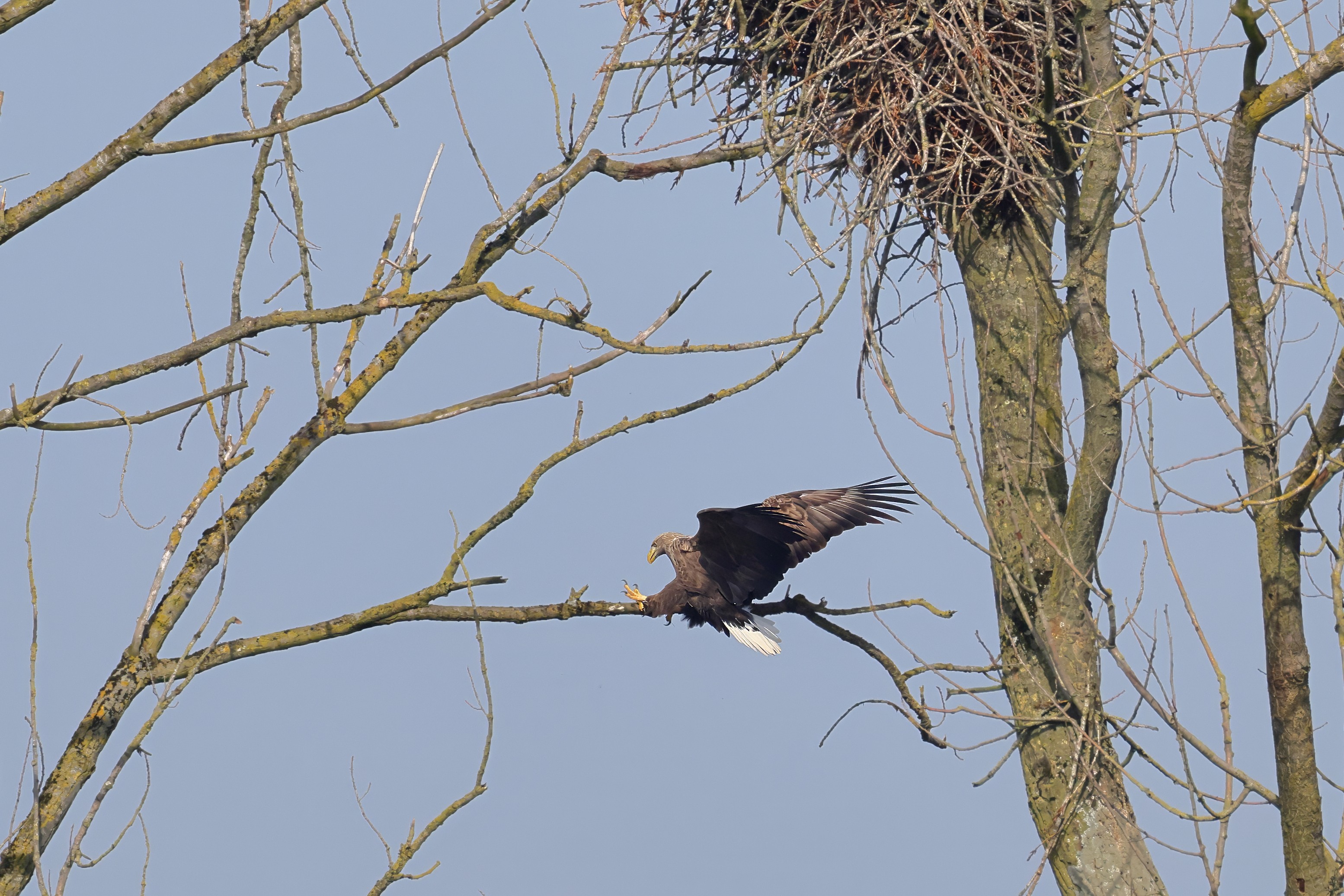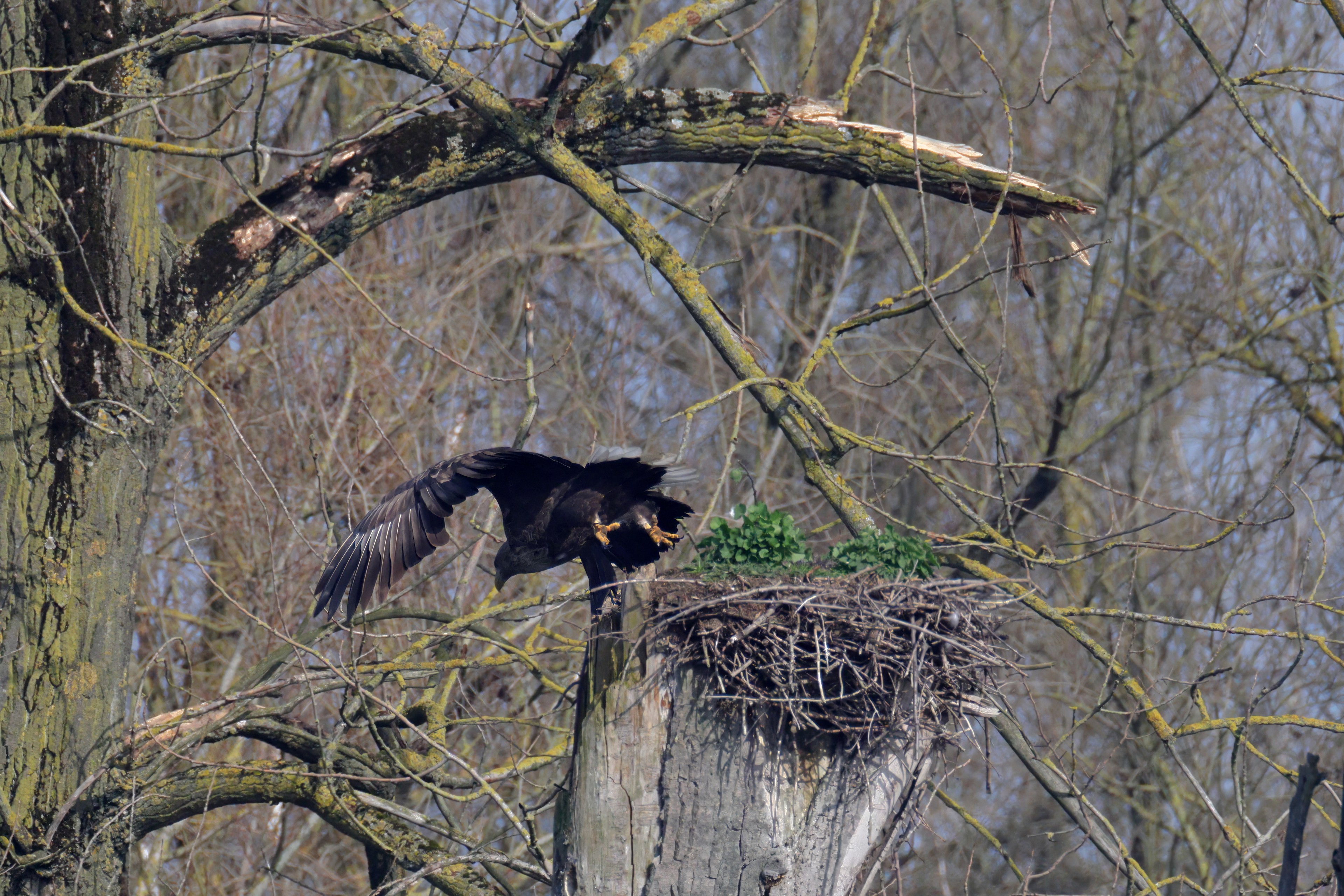 Während der etwa 38 bis 42 Tage dauernden Brutzeit der Seeadler kommt es meist nur zu kurzen Ablösungen zwischen den Partnern. Doch wenn gutes Wetter, die Tageszeit und der natürliche Bewegungsdrang nach den langen Brutsitzungen zusammentreffen, lassen sich vom abgelösten Partner manchmal ganz besondere Aufnahmen gestalten.