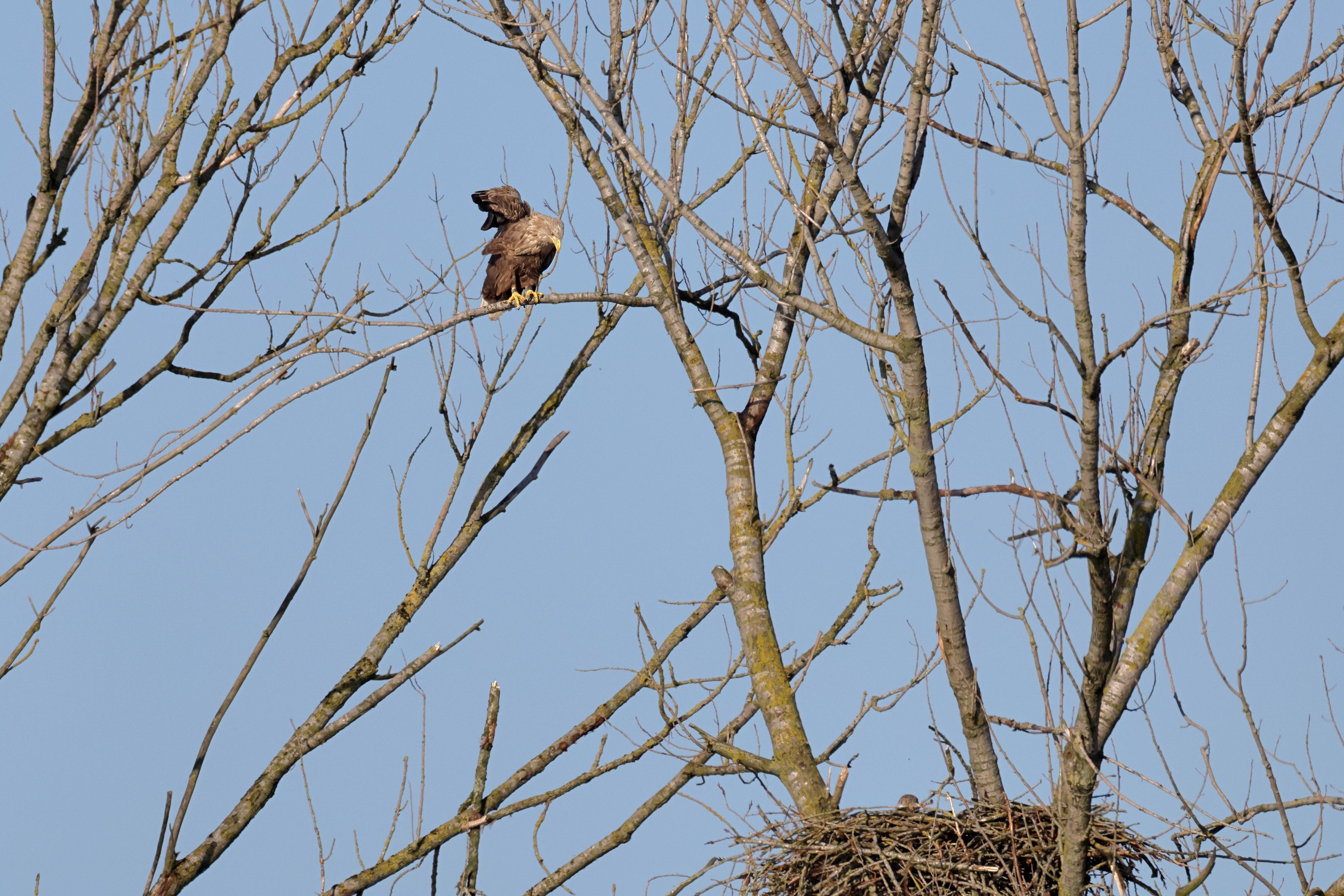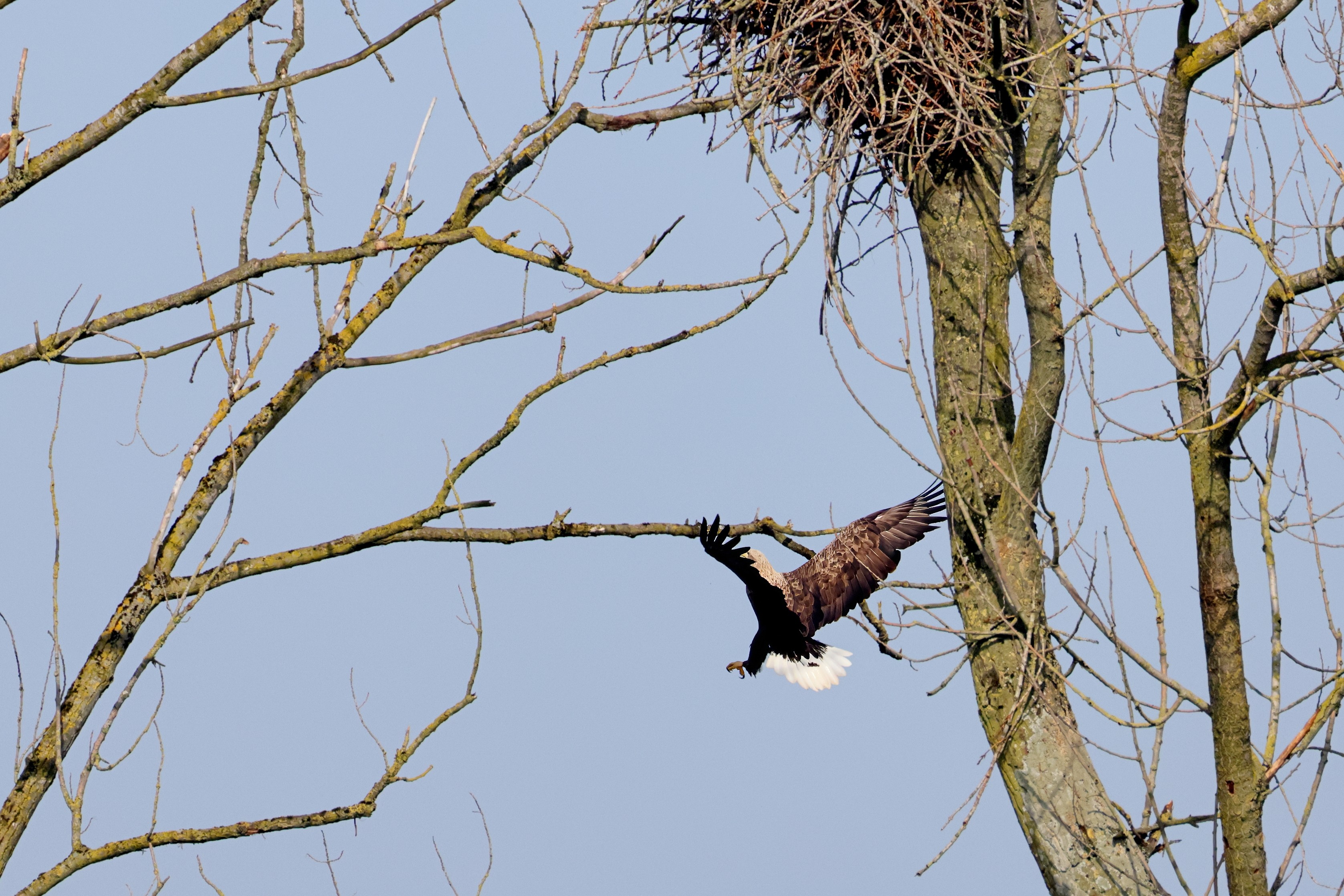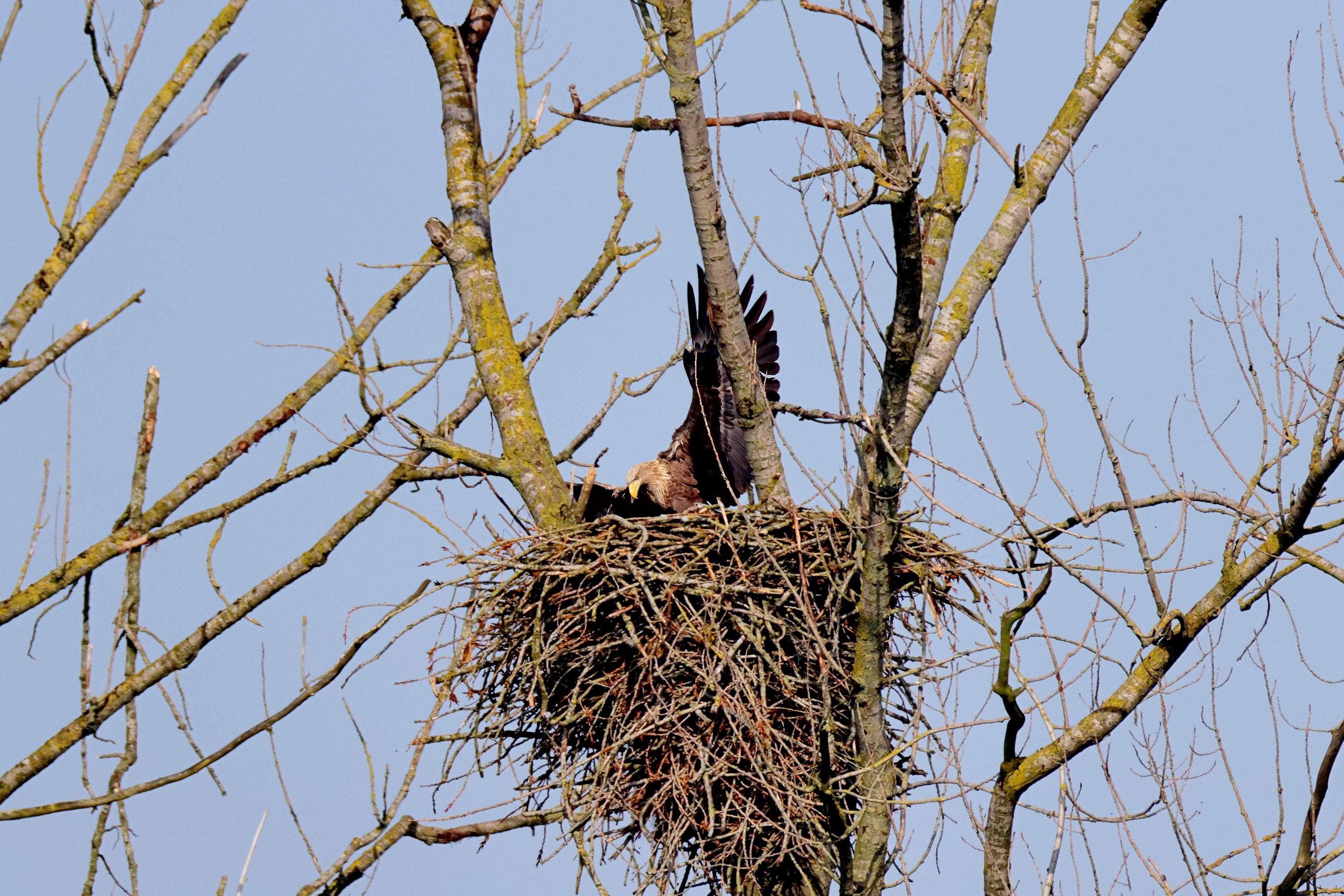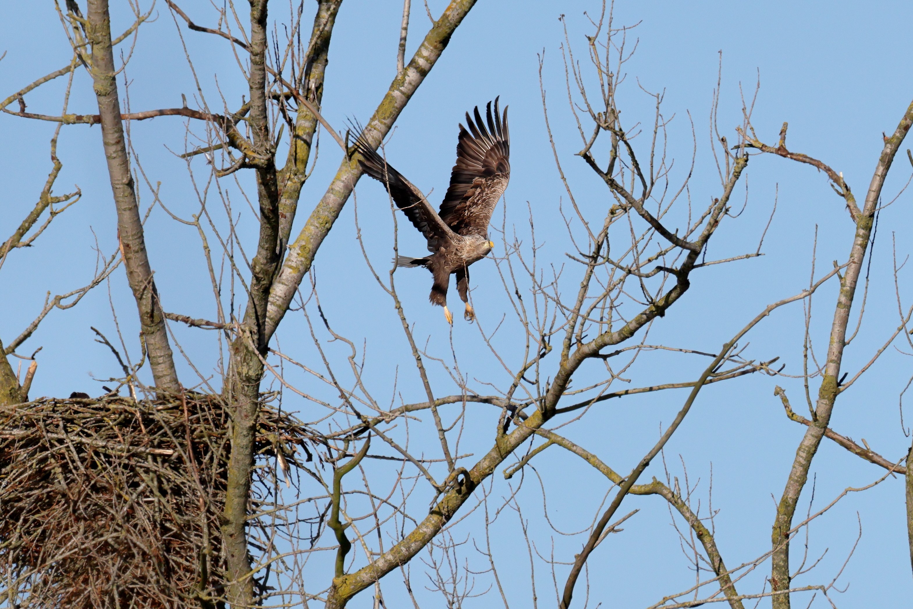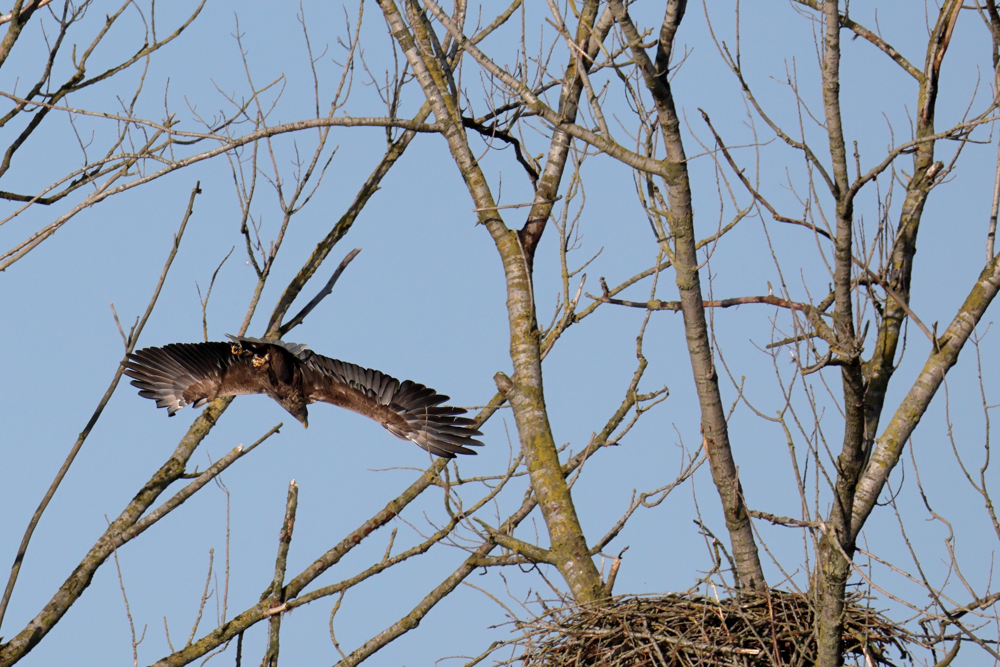 Während der etwa 38 bis 42 Tage dauernden Brutzeit der Seeadler kommt es meist nur zu kurzen Ablösungen zwischen den Partnern. Doch wenn gutes Wetter, die Tageszeit und der natürliche Bewegungsdrang nach den langen Brutsitzungen zusammentreffen, lassen sich vom abgelösten Partner manchmal ganz besondere Aufnahmen gestalten.