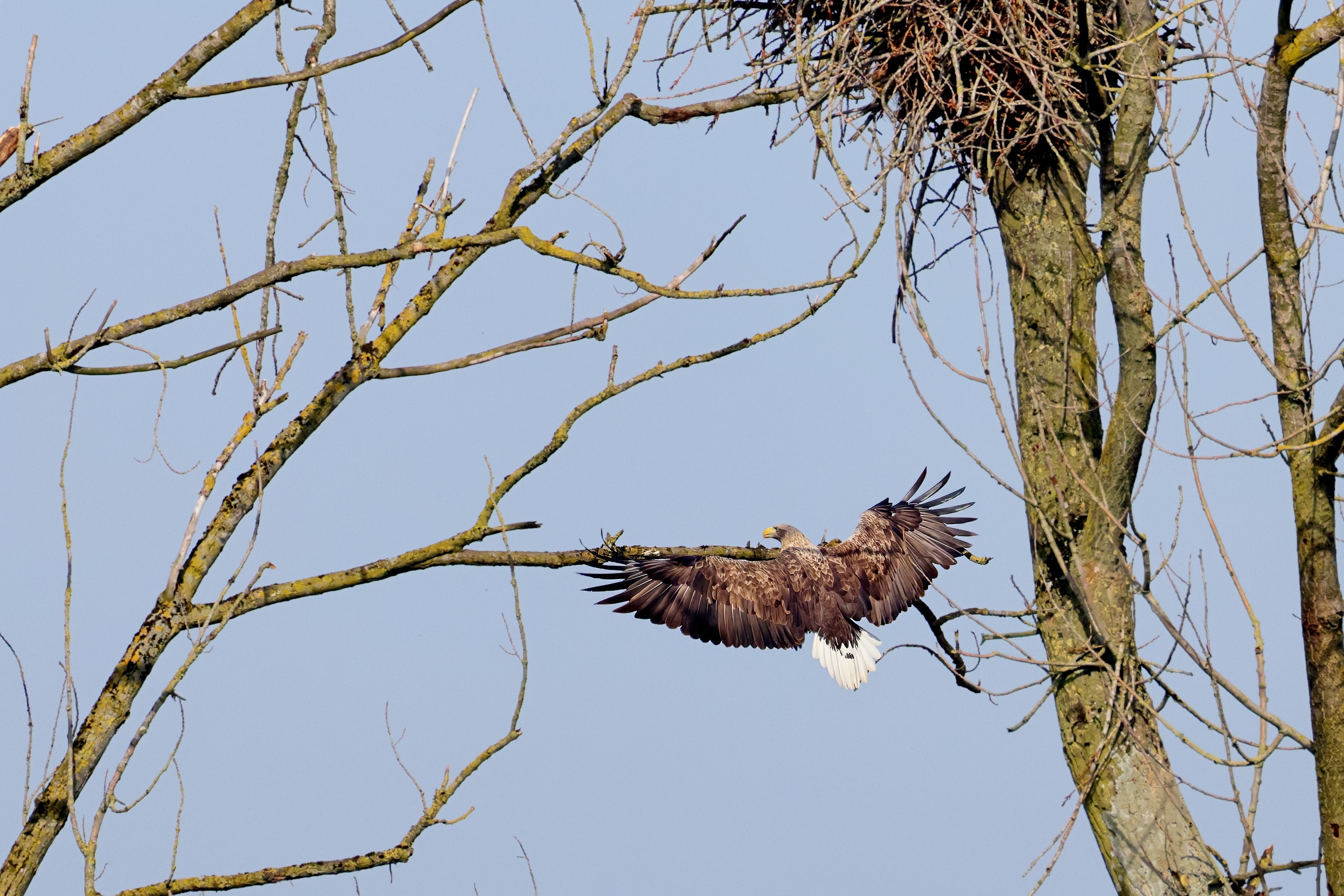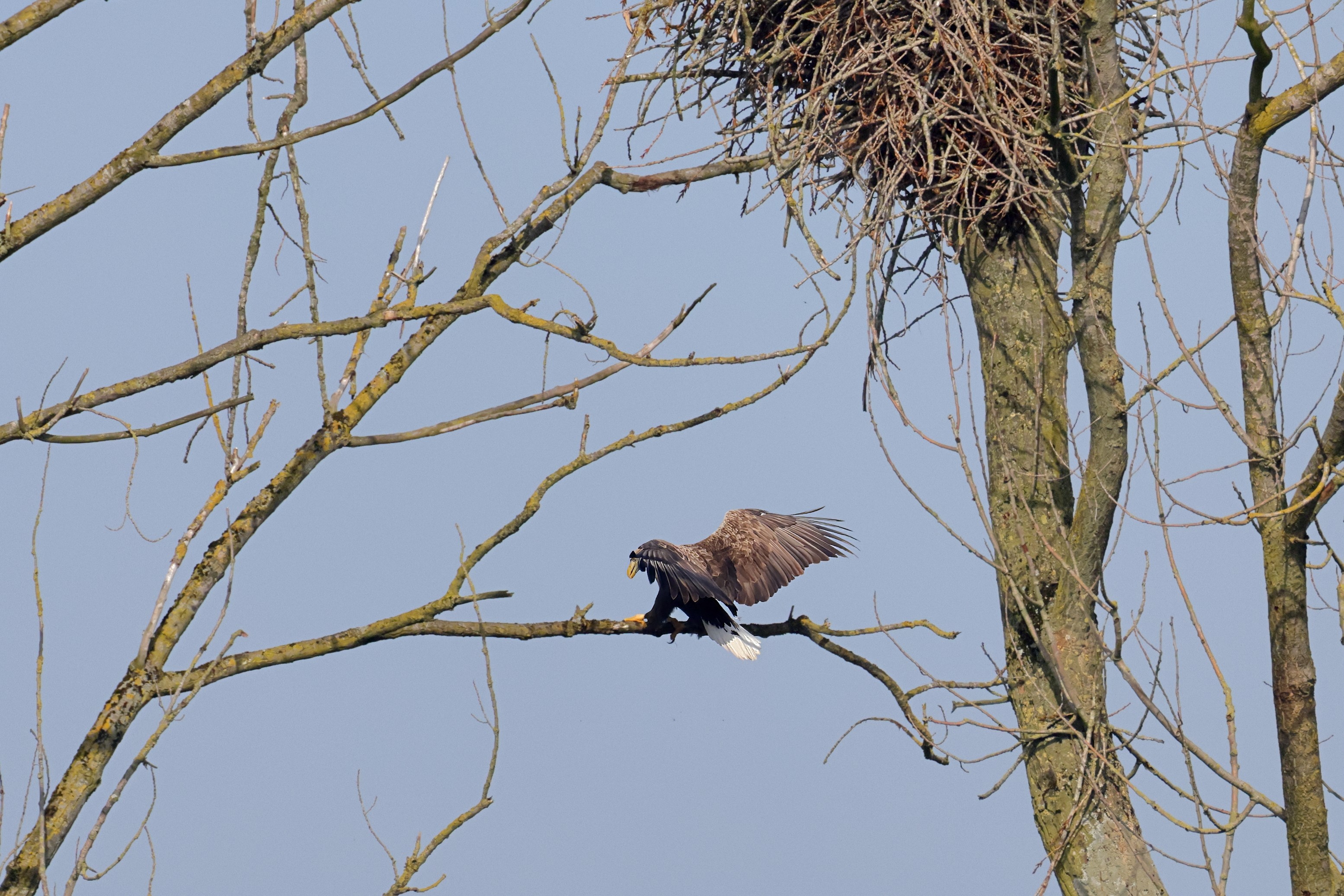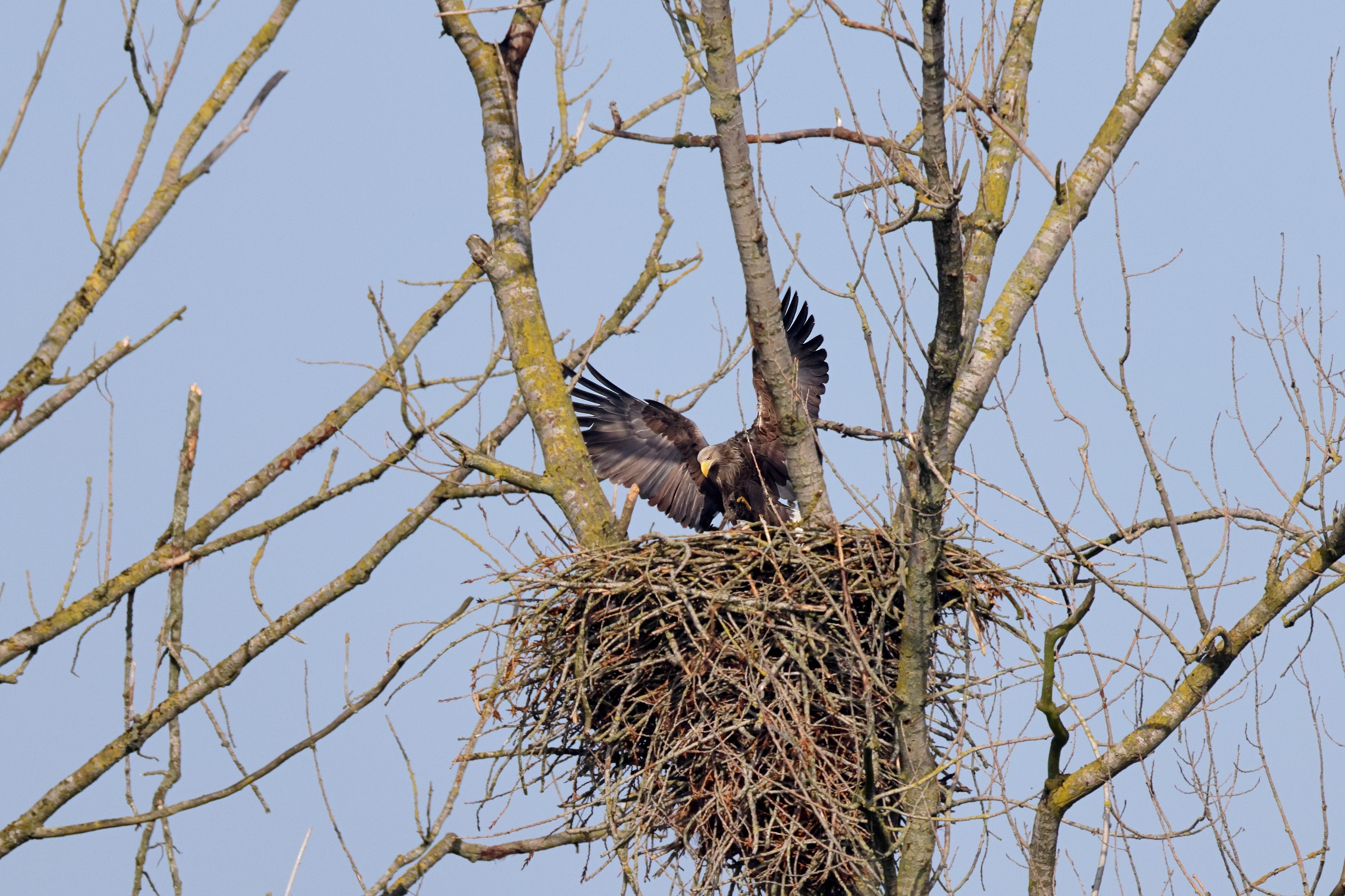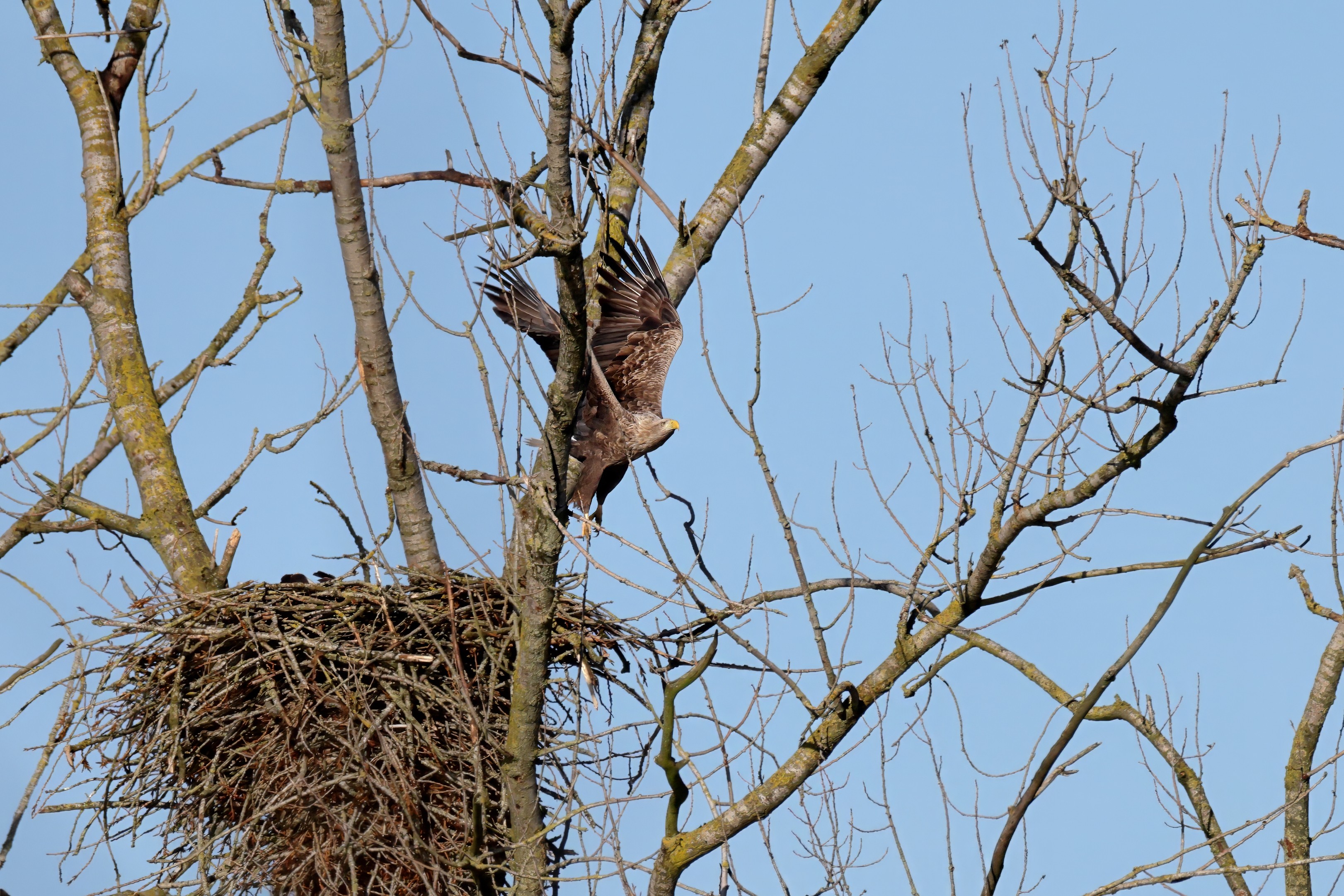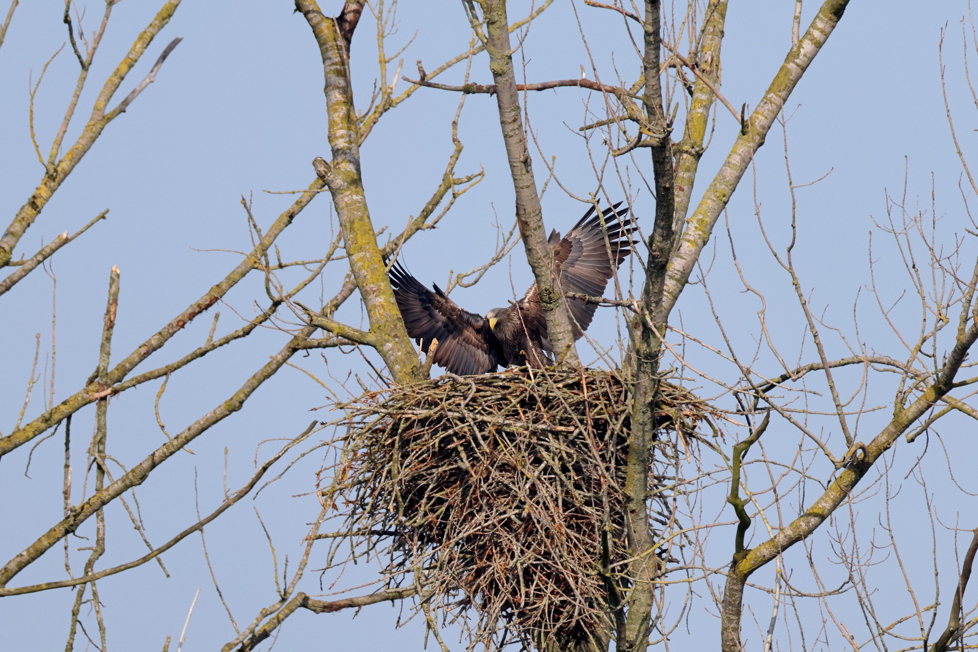 Während der etwa 38 bis 42 Tage dauernden Brutzeit der Seeadler kommt es meist nur zu kurzen Ablösungen zwischen den Partnern. Doch wenn gutes Wetter, die Tageszeit und der natürliche Bewegungsdrang nach den langen Brutsitzungen zusammentreffen, lassen sich vom abgelösten Partner manchmal ganz besondere Aufnahmen gestalten.