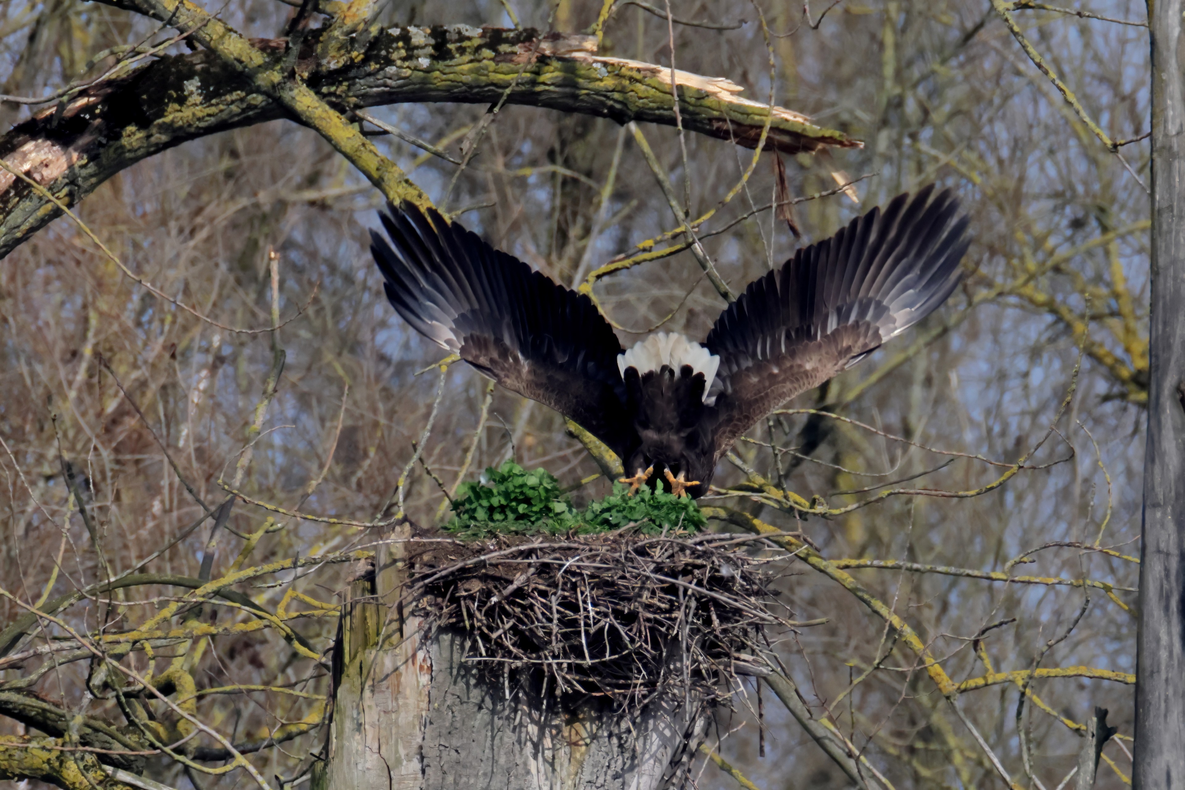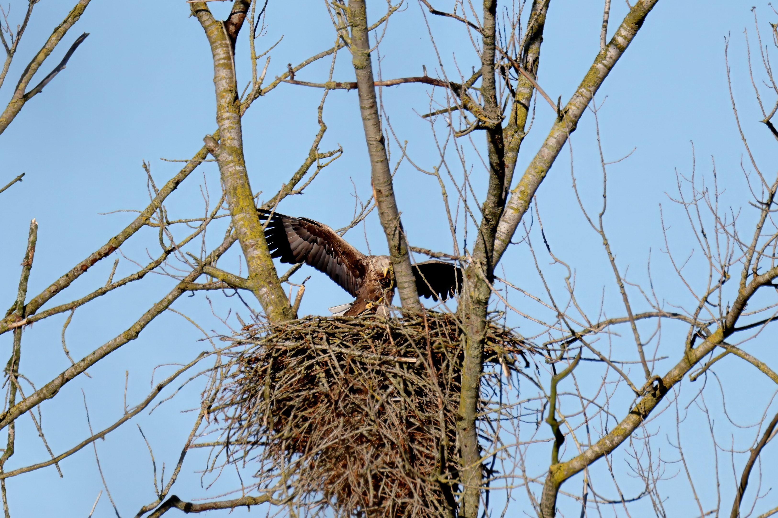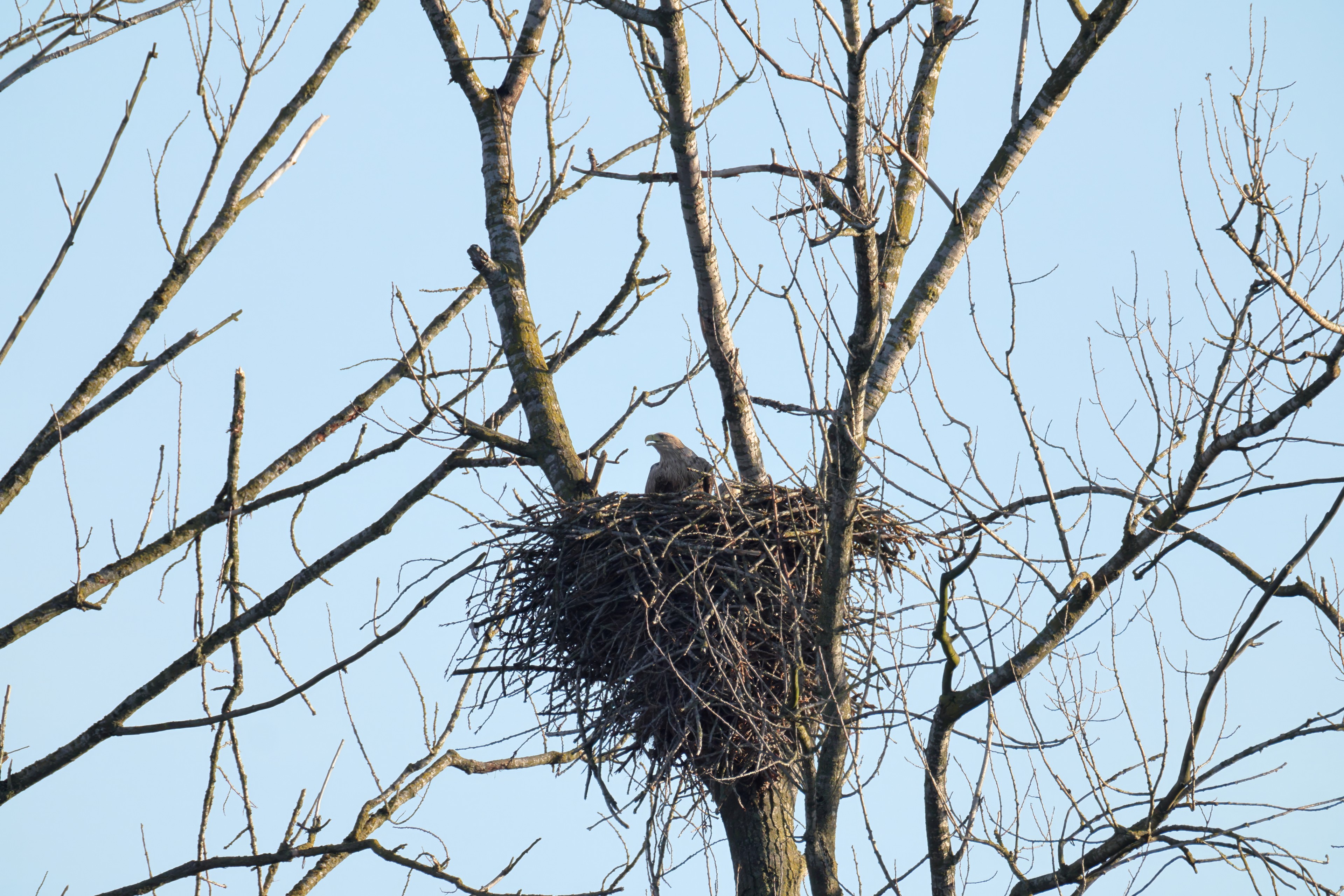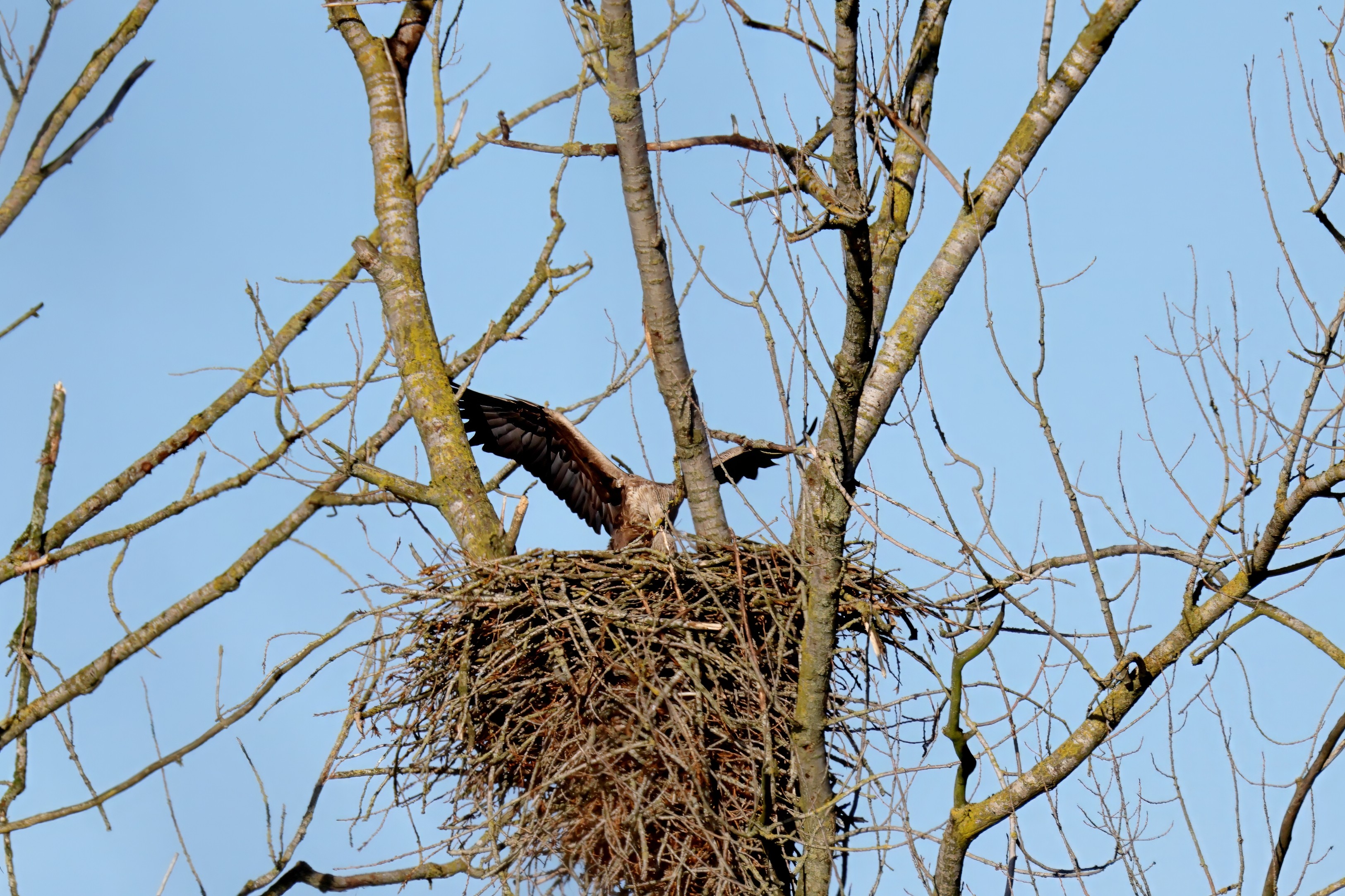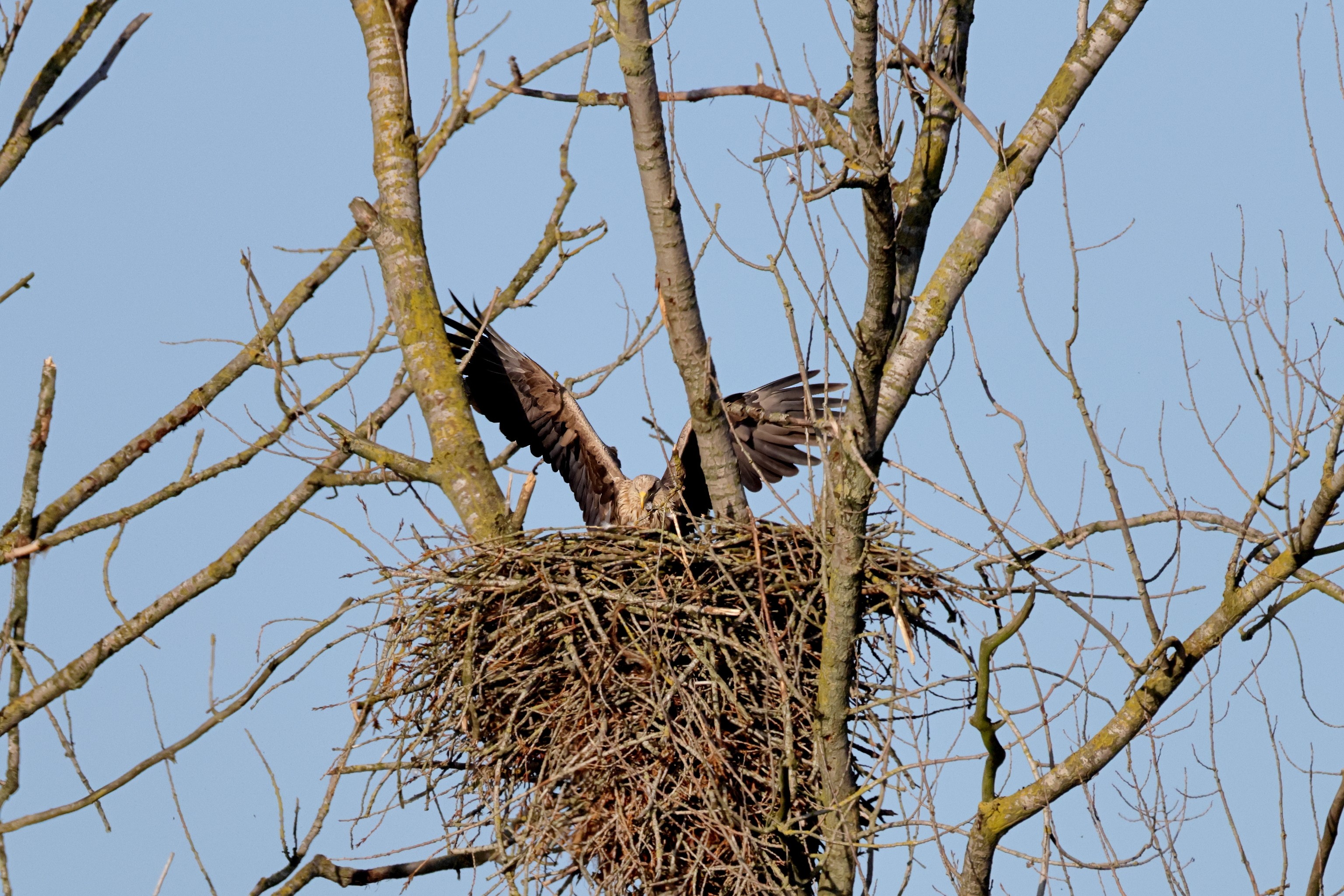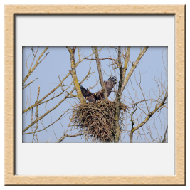 Während der etwa 38 bis 42 Tage dauernden Brutzeit der Seeadler kommt es meist nur zu kurzen Ablösungen zwischen den Partnern. Doch wenn gutes Wetter, die Tageszeit und der natürliche Bewegungsdrang nach den langen Brutsitzungen zusammentreffen, lassen sich vom abgelösten Partner manchmal ganz besondere Aufnahmen gestalten.