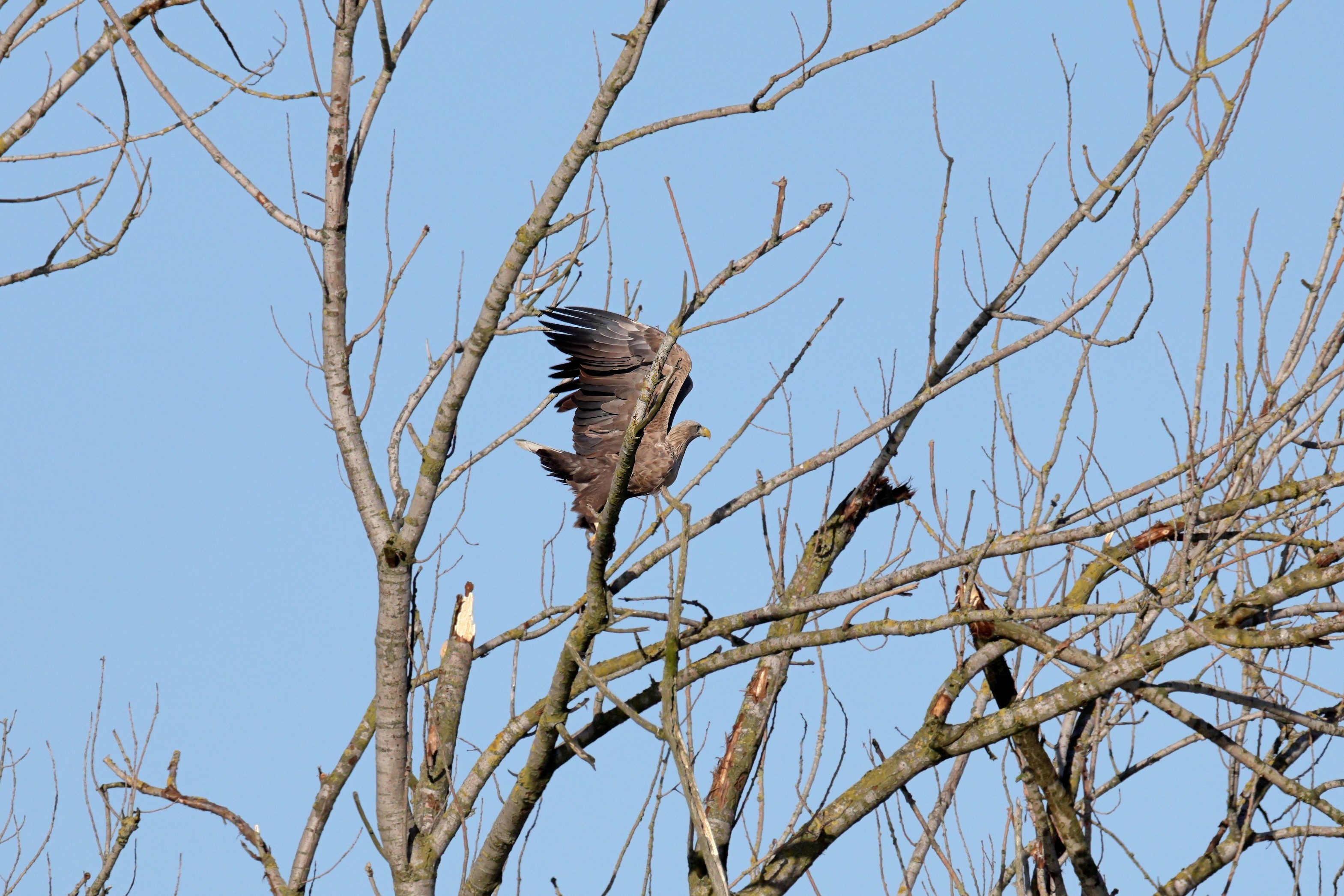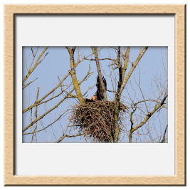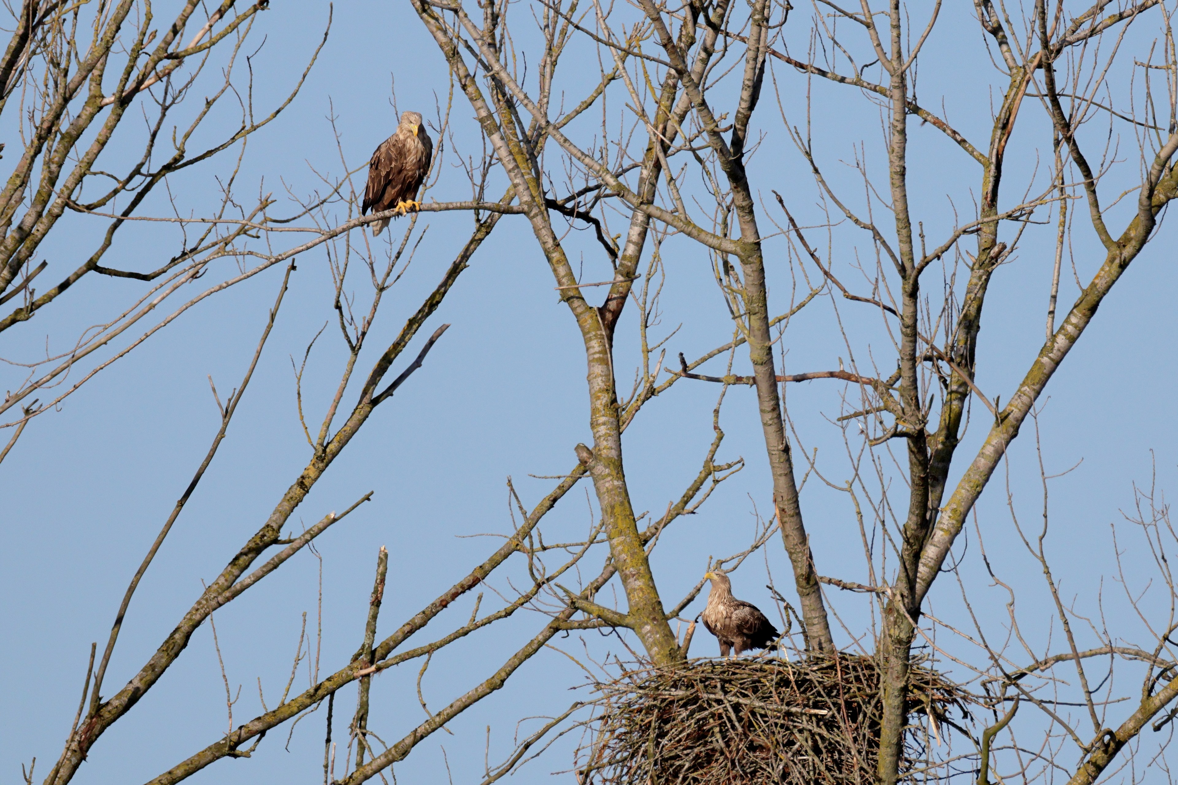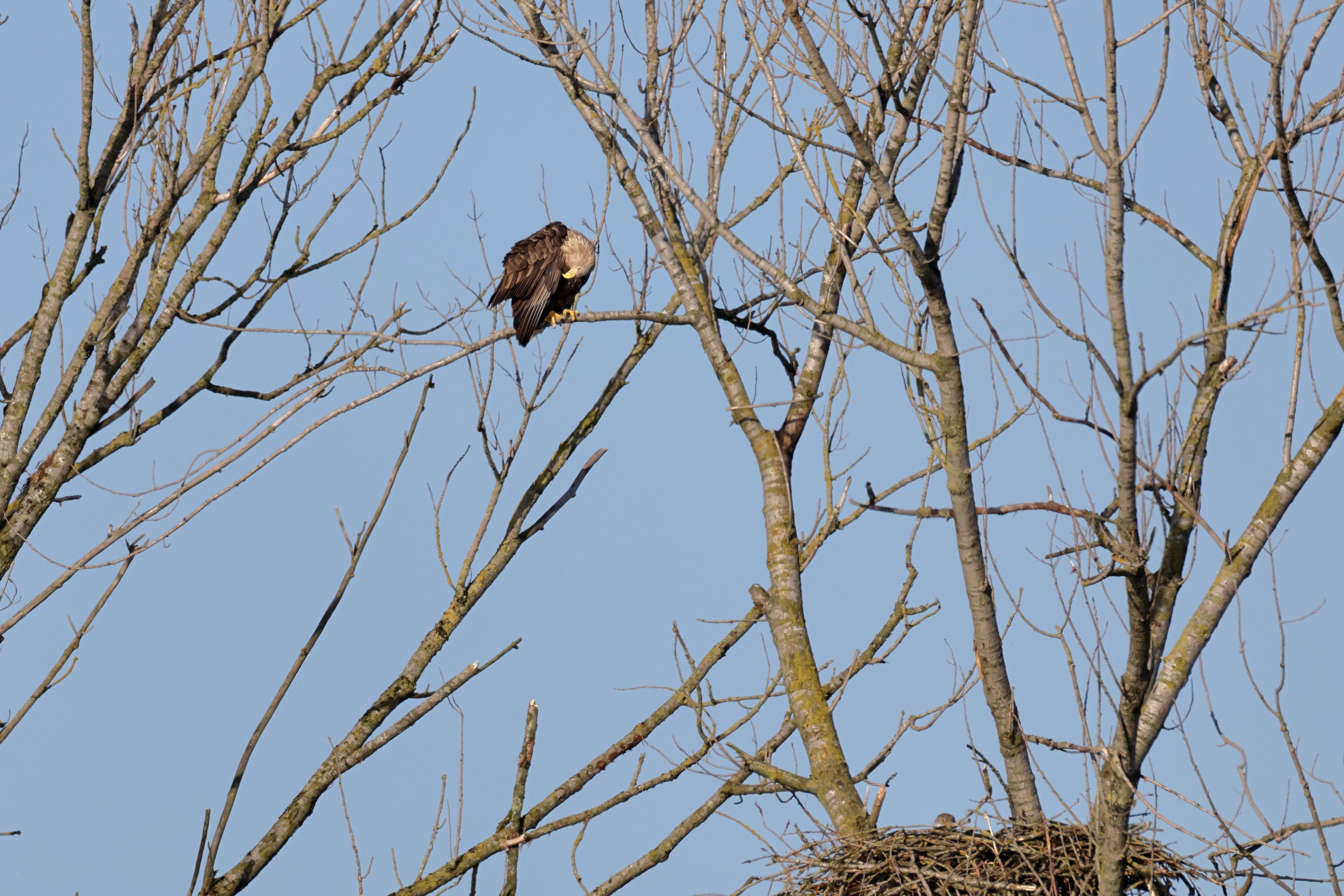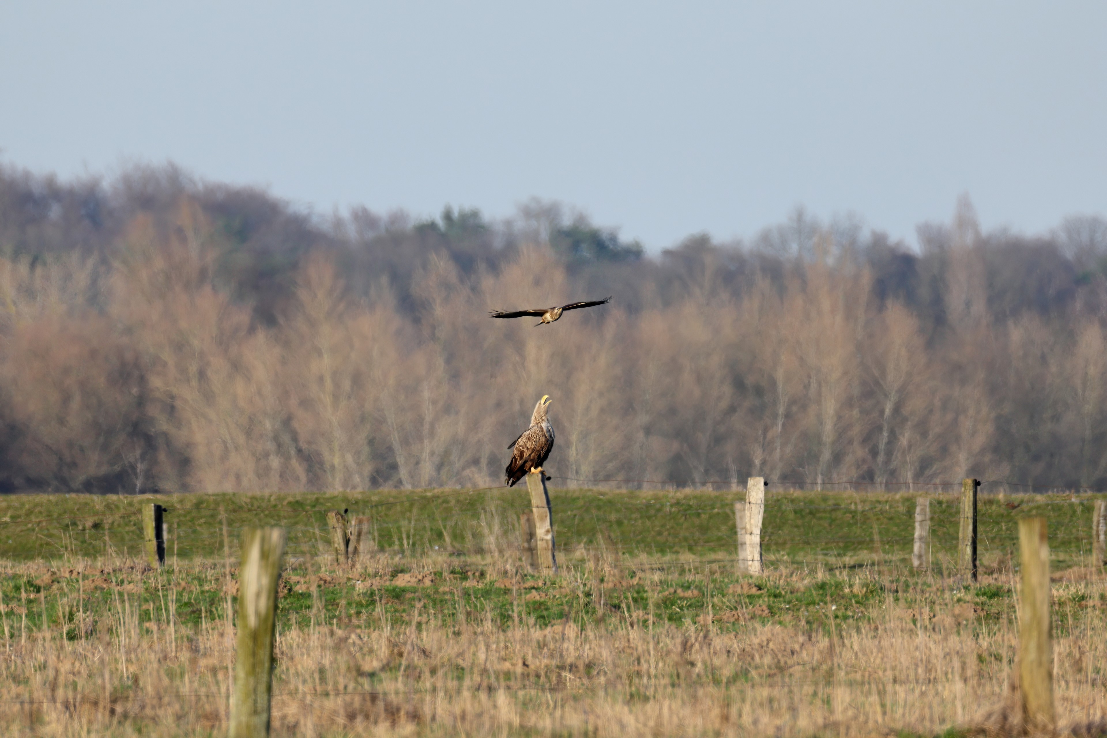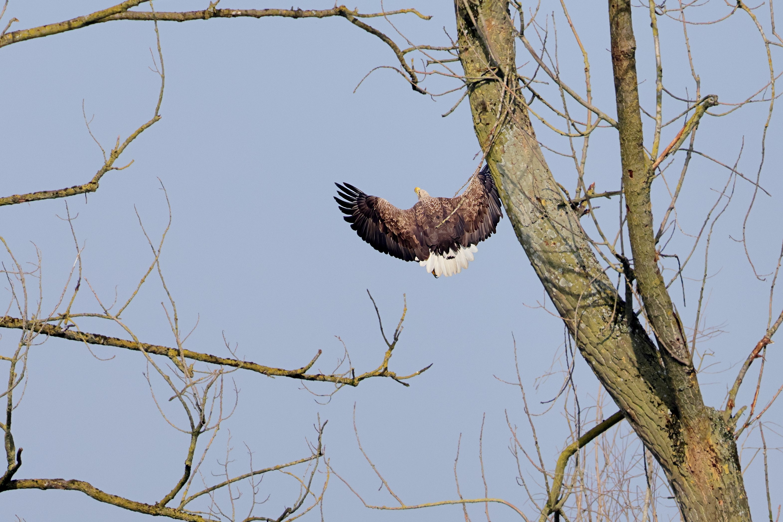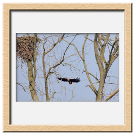 Während der etwa 38 bis 42 Tage dauernden Brutzeit der Seeadler kommt es meist nur zu kurzen Ablösungen zwischen den Partnern. Doch wenn gutes Wetter, die Tageszeit und der natürliche Bewegungsdrang nach den langen Brutsitzungen zusammentreffen, lassen sich vom abgelösten Partner manchmal ganz besondere Aufnahmen gestalten.
