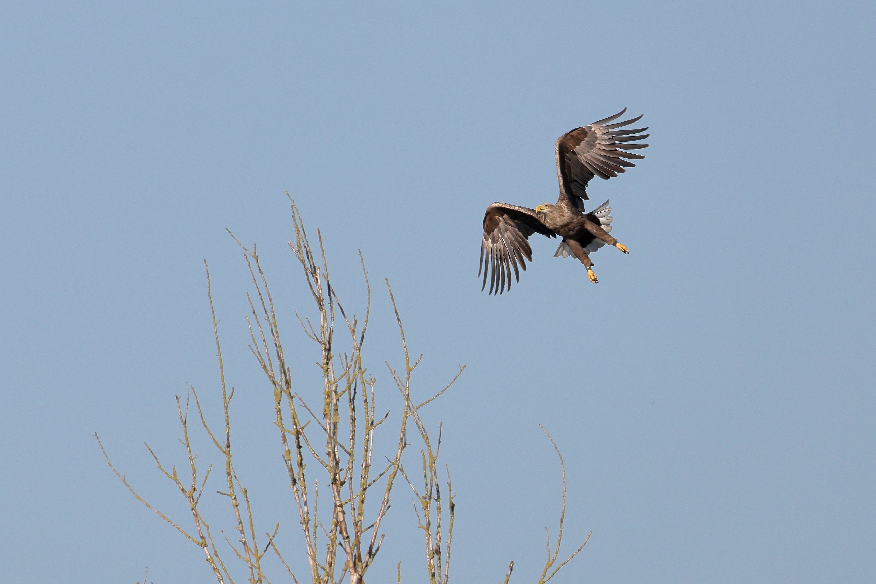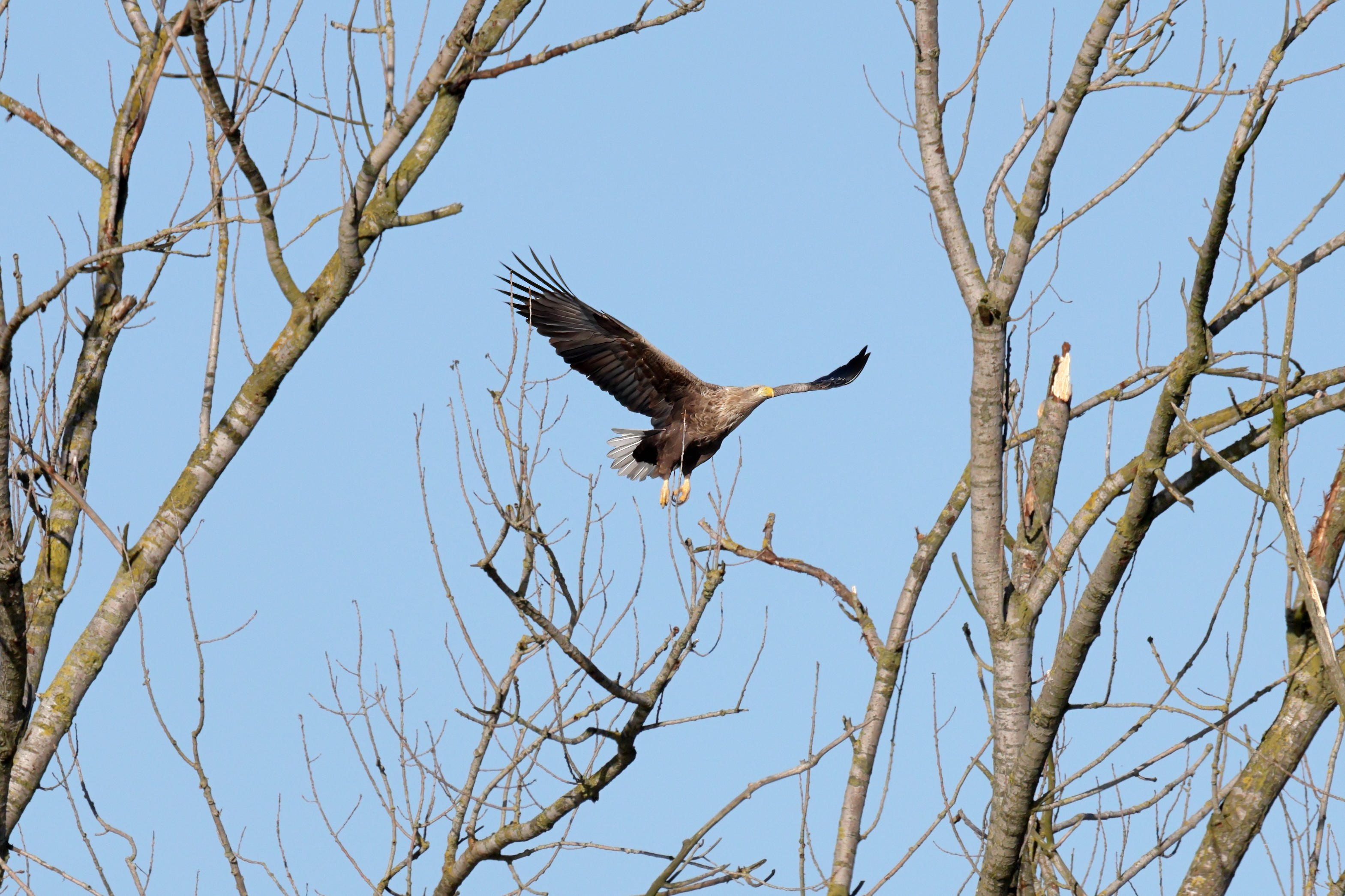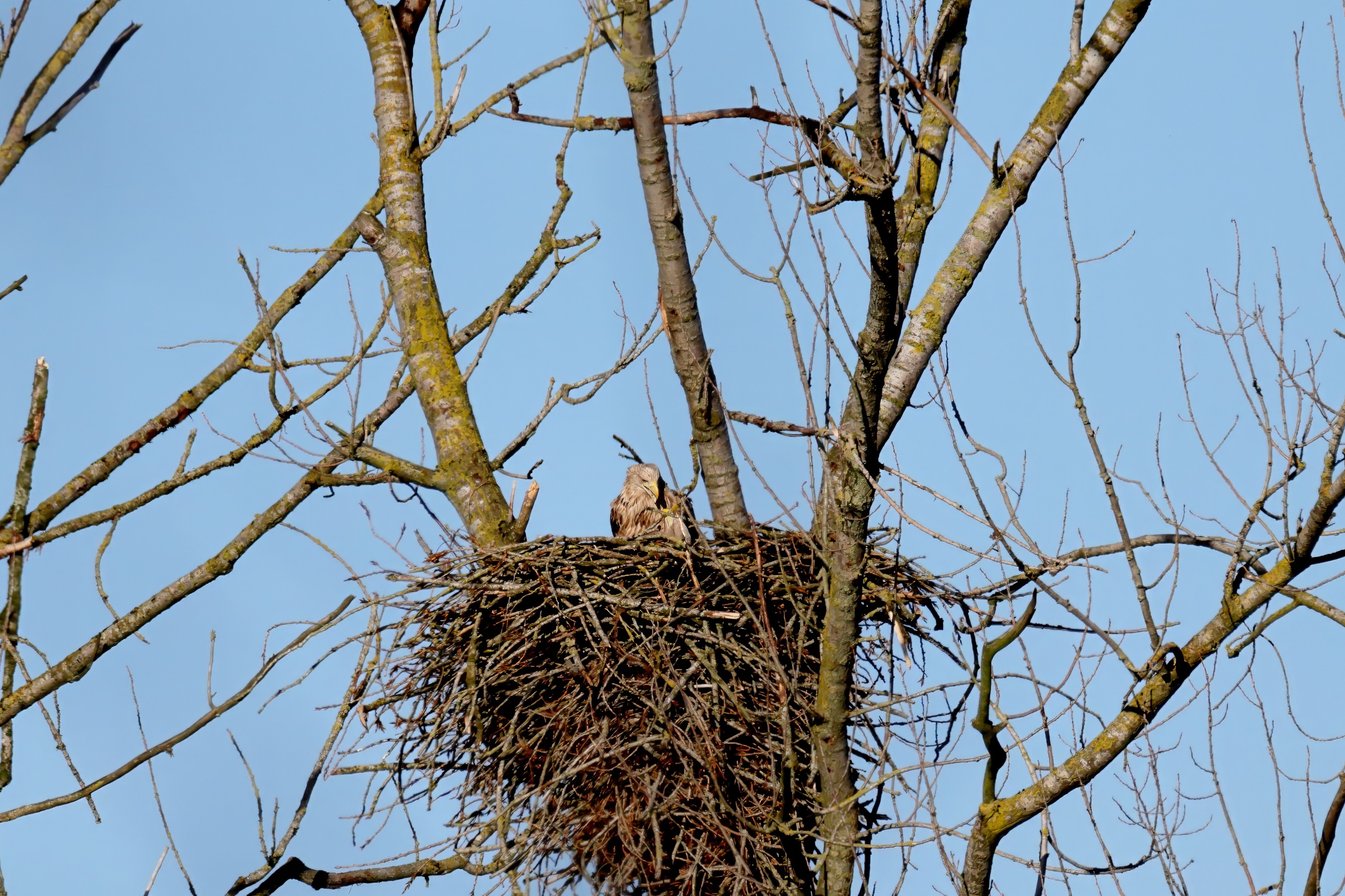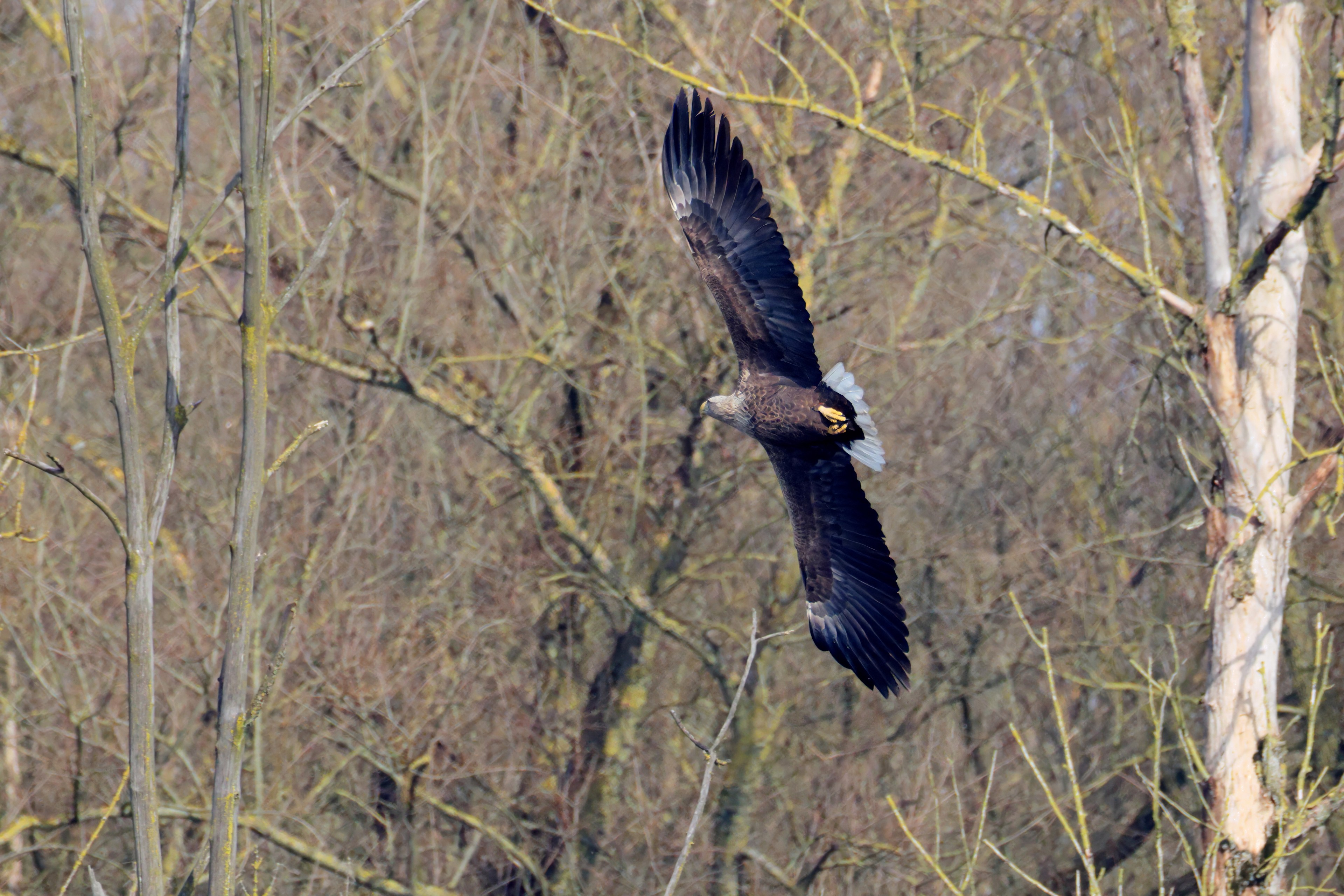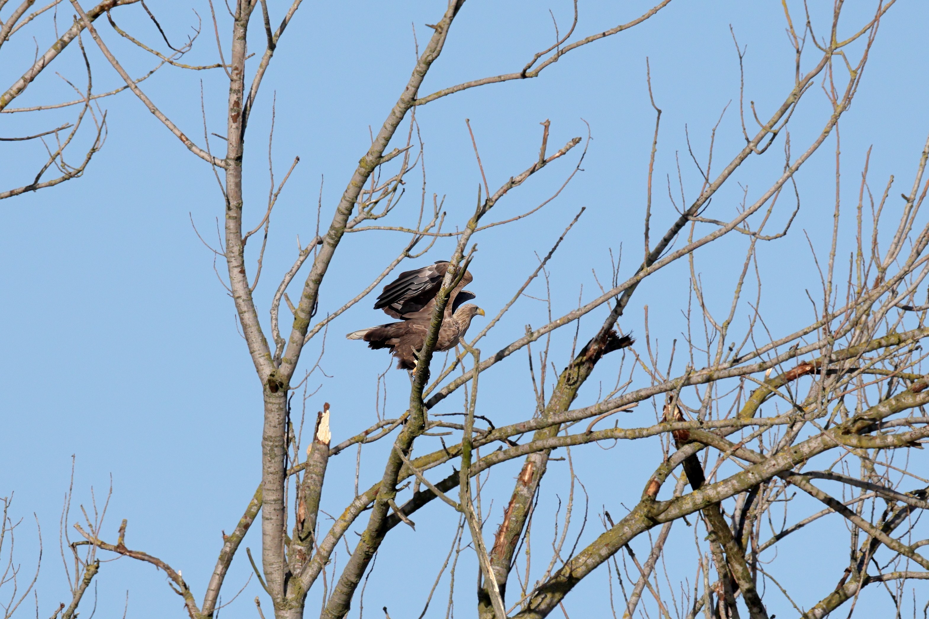 Während der etwa 38 bis 42 Tage dauernden Brutzeit der Seeadler kommt es meist nur zu kurzen Ablösungen zwischen den Partnern. Doch wenn gutes Wetter, die Tageszeit und der natürliche Bewegungsdrang nach den langen Brutsitzungen zusammentreffen, lassen sich vom abgelösten Partner manchmal ganz besondere Aufnahmen gestalten.
