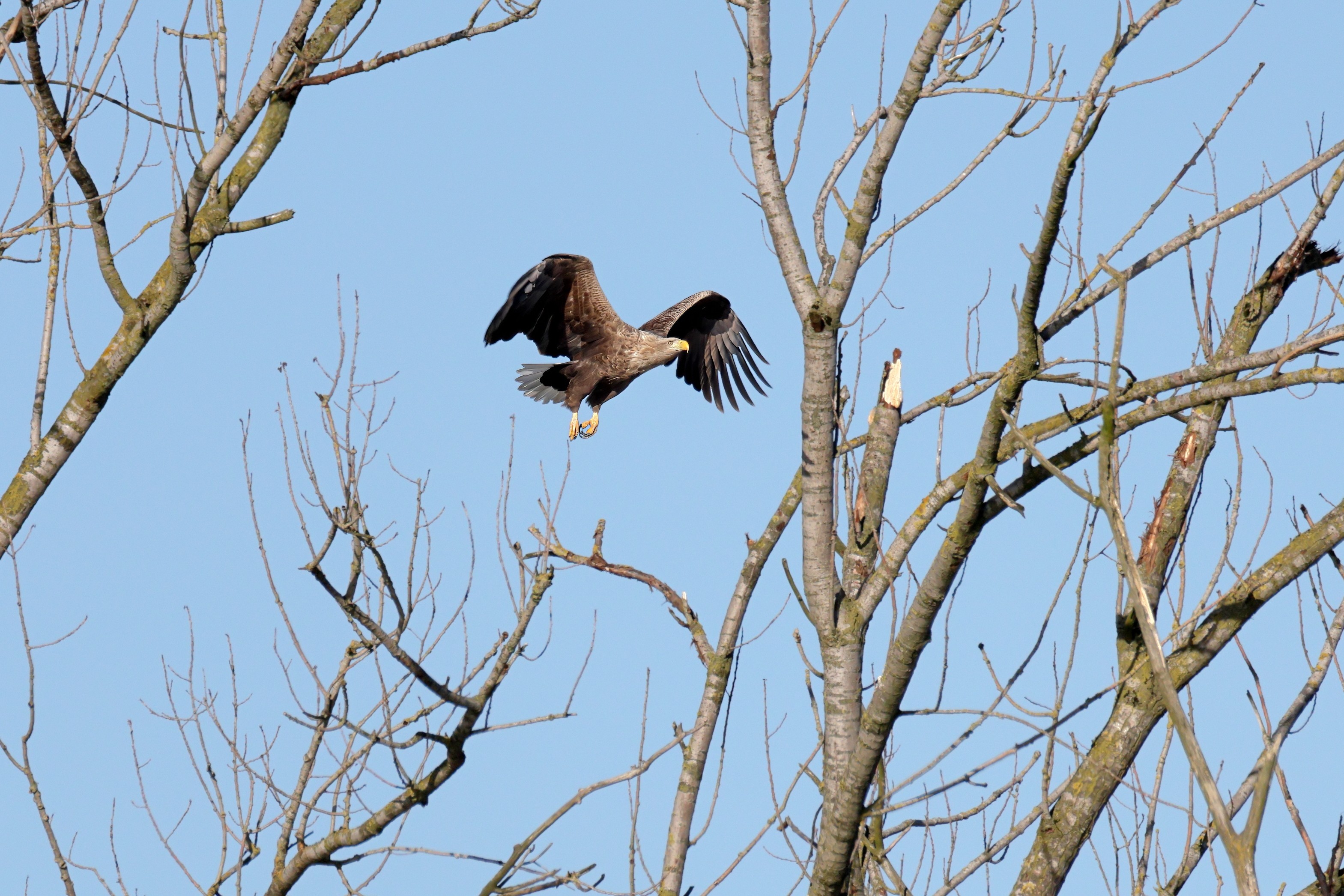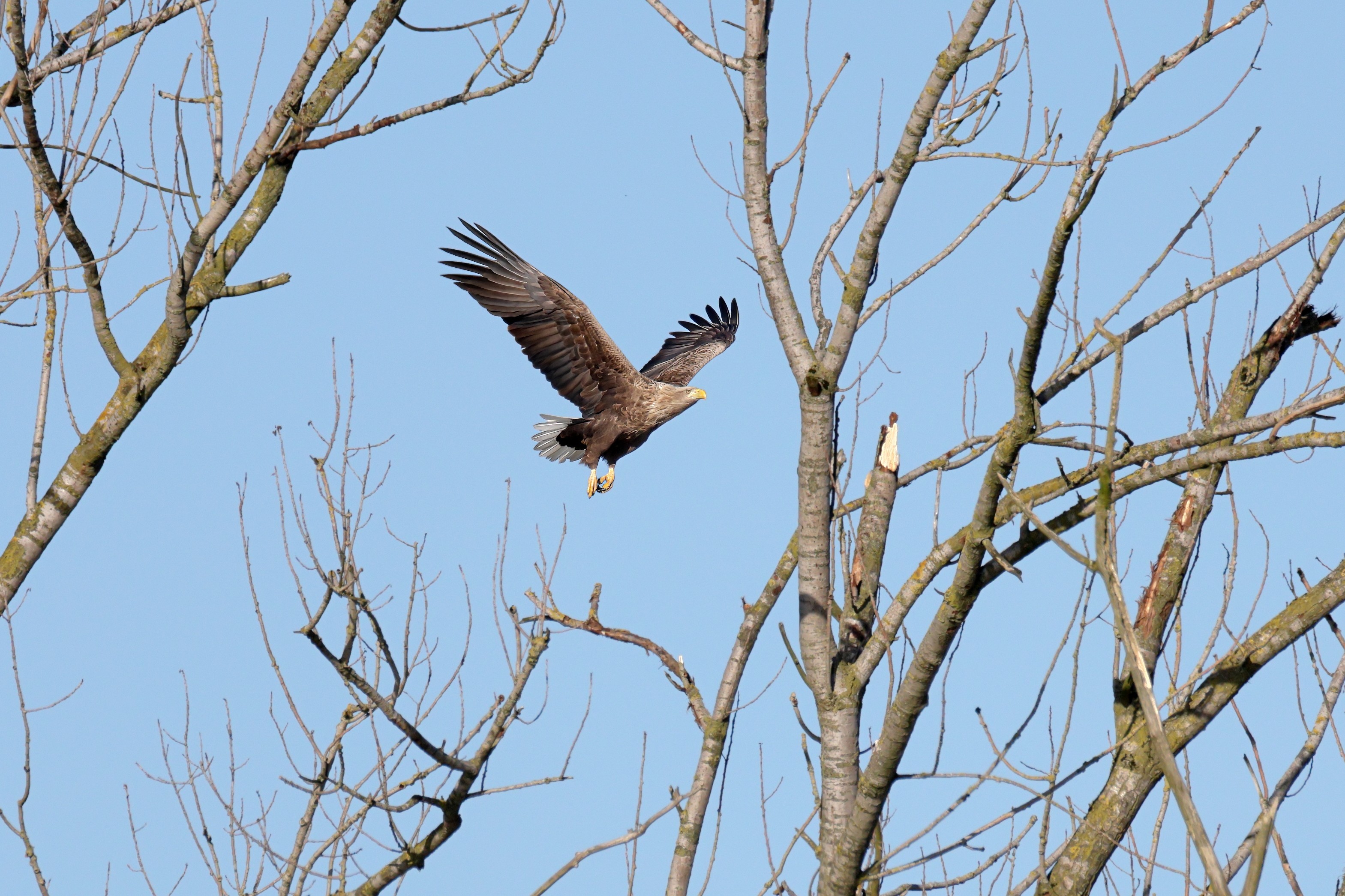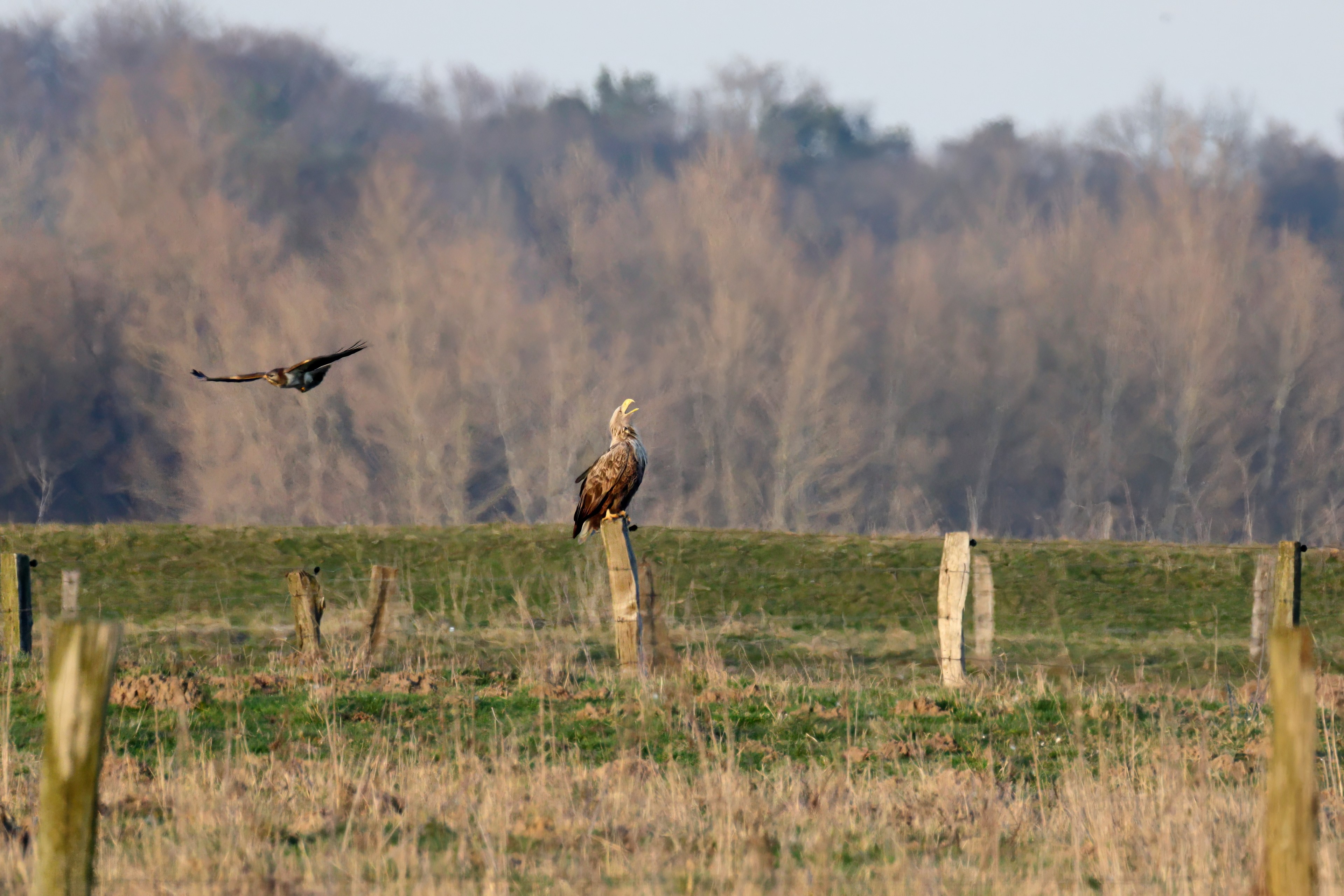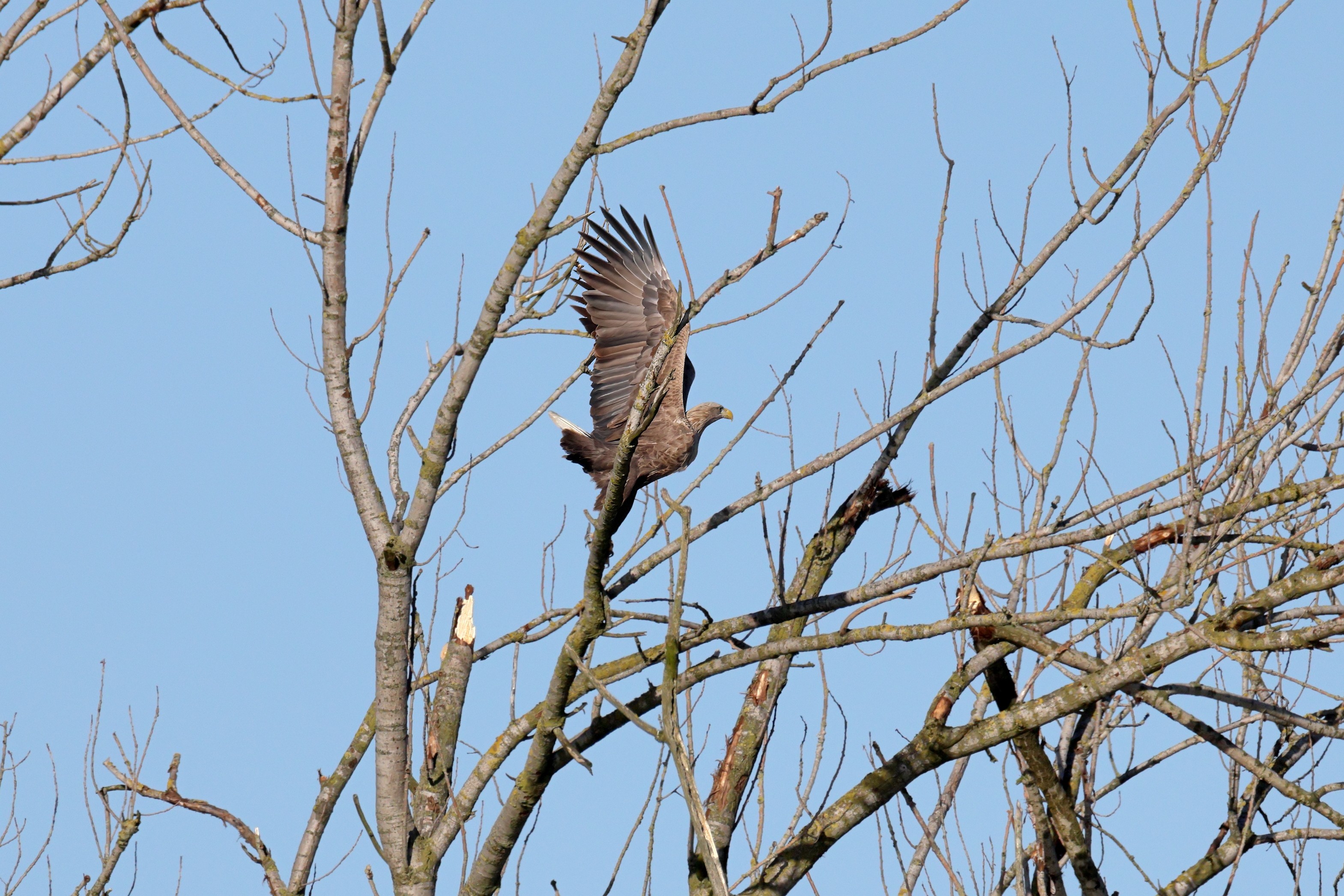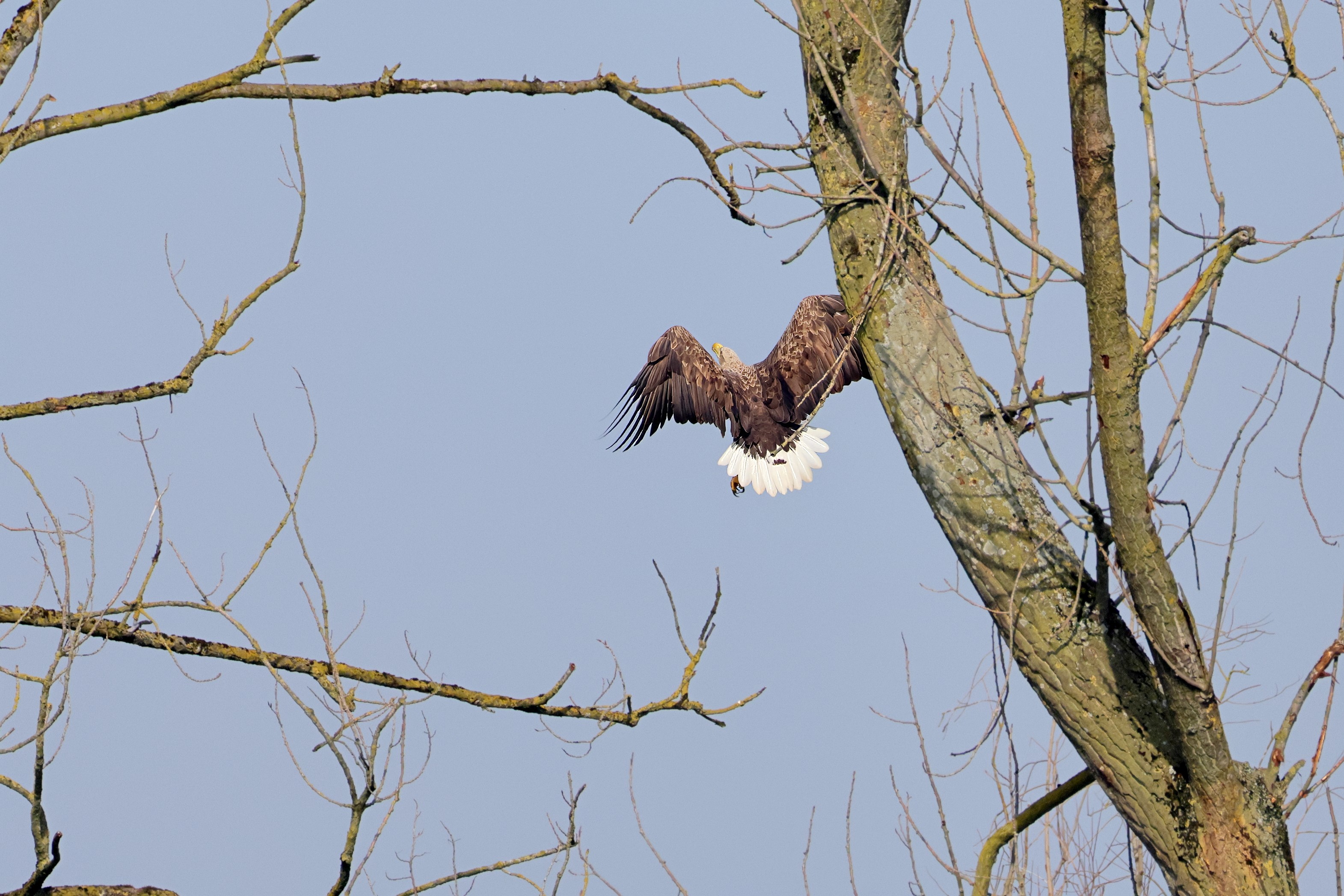 Während der etwa 38 bis 42 Tage dauernden Brutzeit der Seeadler kommt es meist nur zu kurzen Ablösungen zwischen den Partnern. Doch wenn gutes Wetter, die Tageszeit und der natürliche Bewegungsdrang nach den langen Brutsitzungen zusammentreffen, lassen sich vom abgelösten Partner manchmal ganz besondere Aufnahmen gestalten.