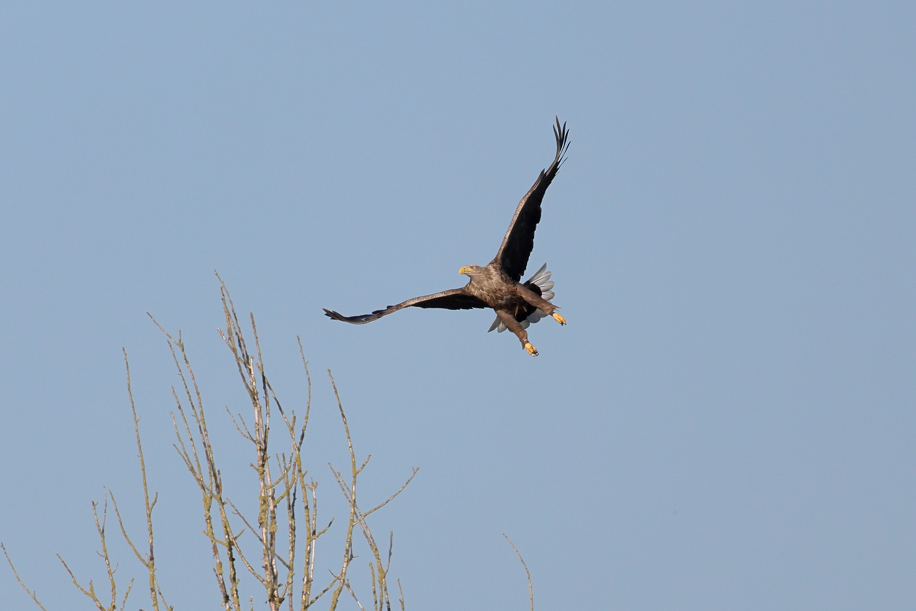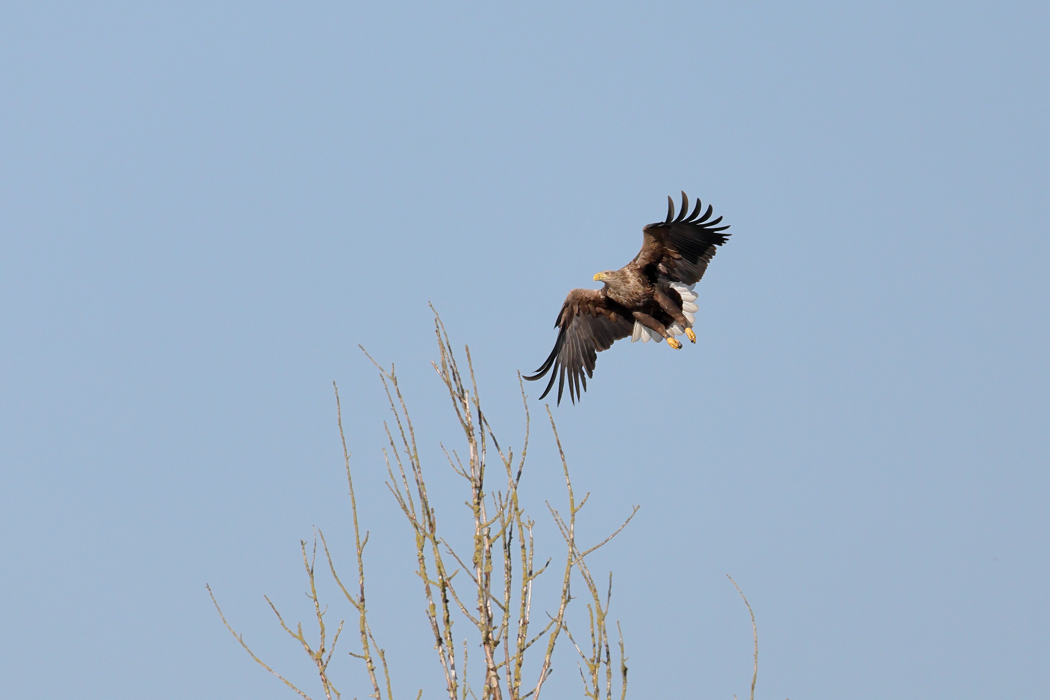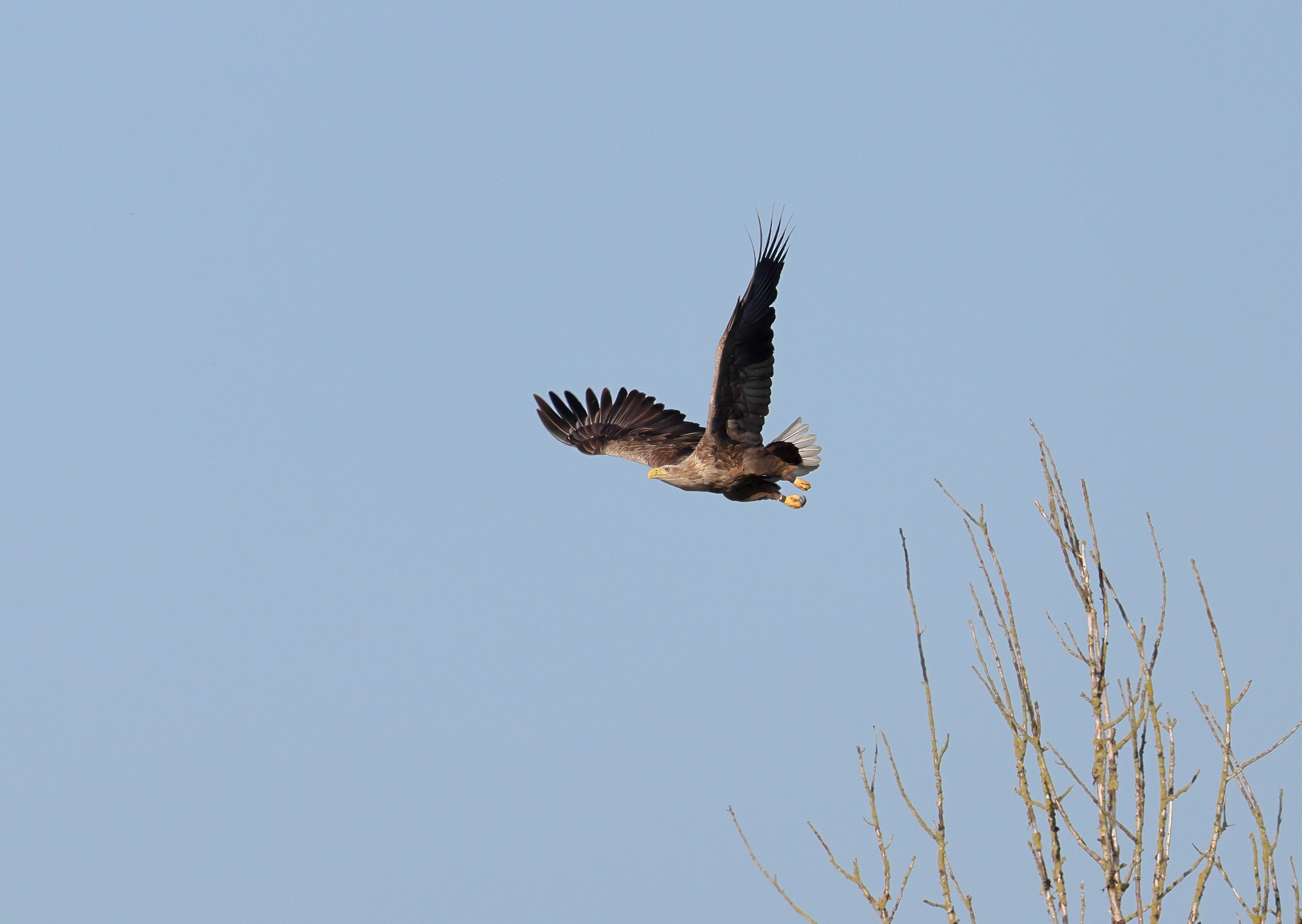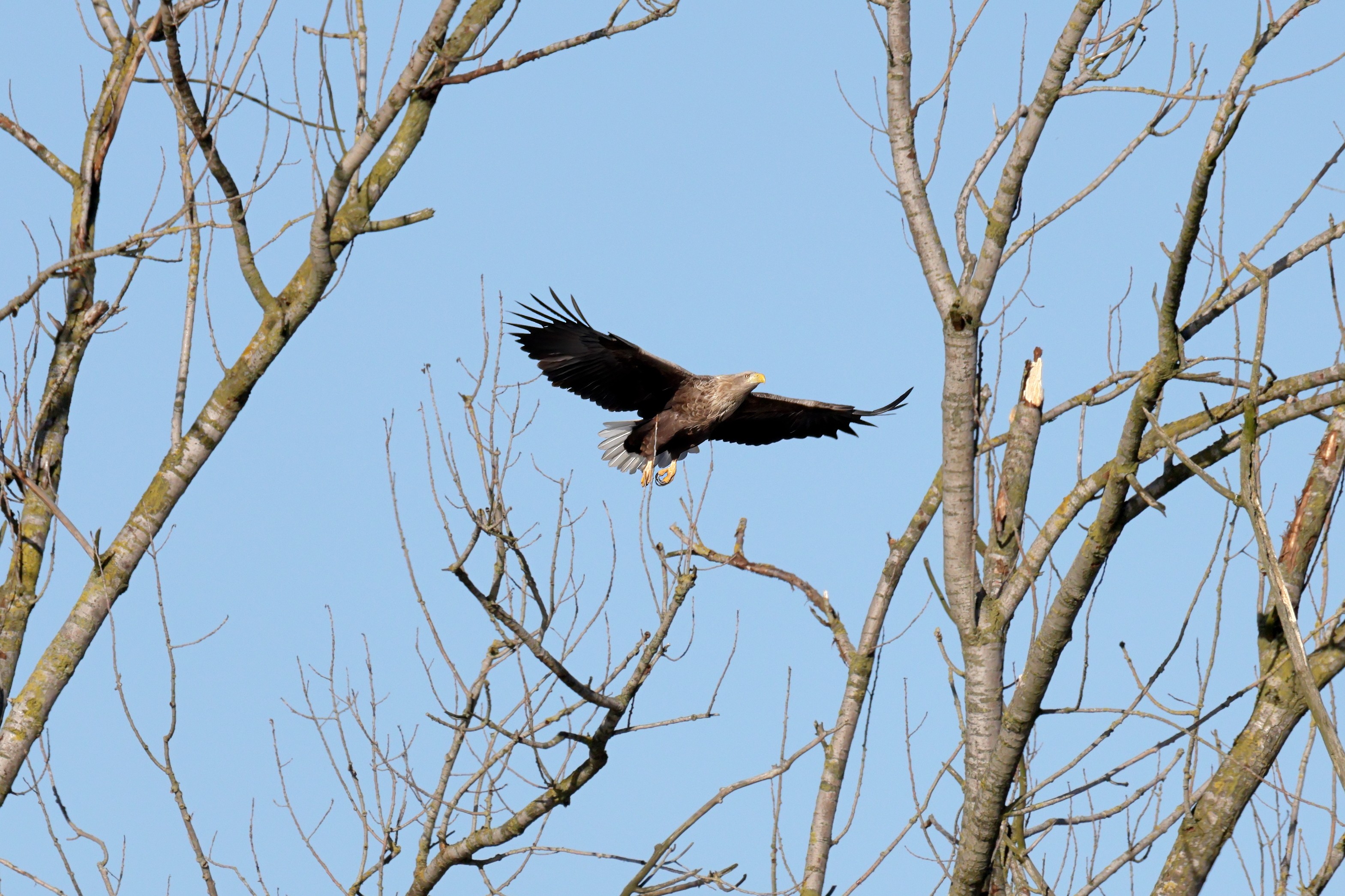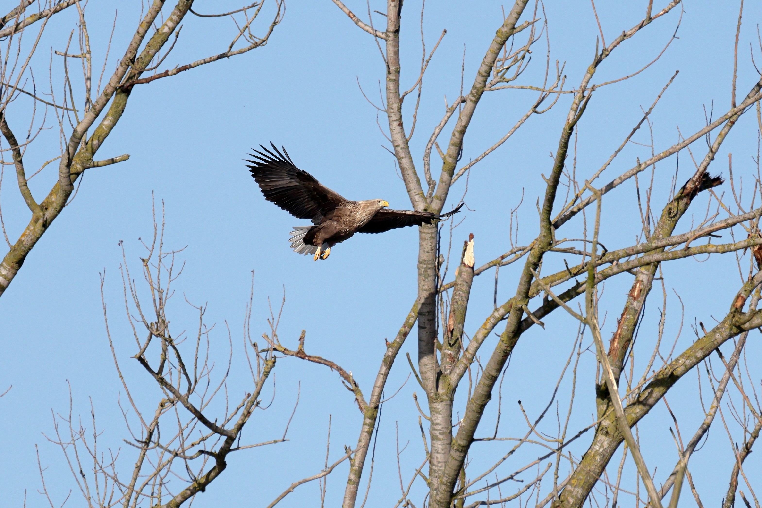 Während der etwa 38 bis 42 Tage dauernden Brutzeit der Seeadler kommt es meist nur zu kurzen Ablösungen zwischen den Partnern. Doch wenn gutes Wetter, die Tageszeit und der natürliche Bewegungsdrang nach den langen Brutsitzungen zusammentreffen, lassen sich vom abgelösten Partner manchmal ganz besondere Aufnahmen gestalten.