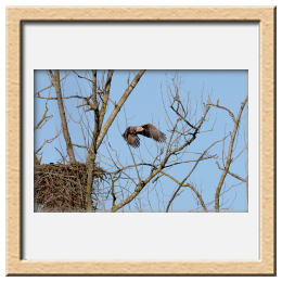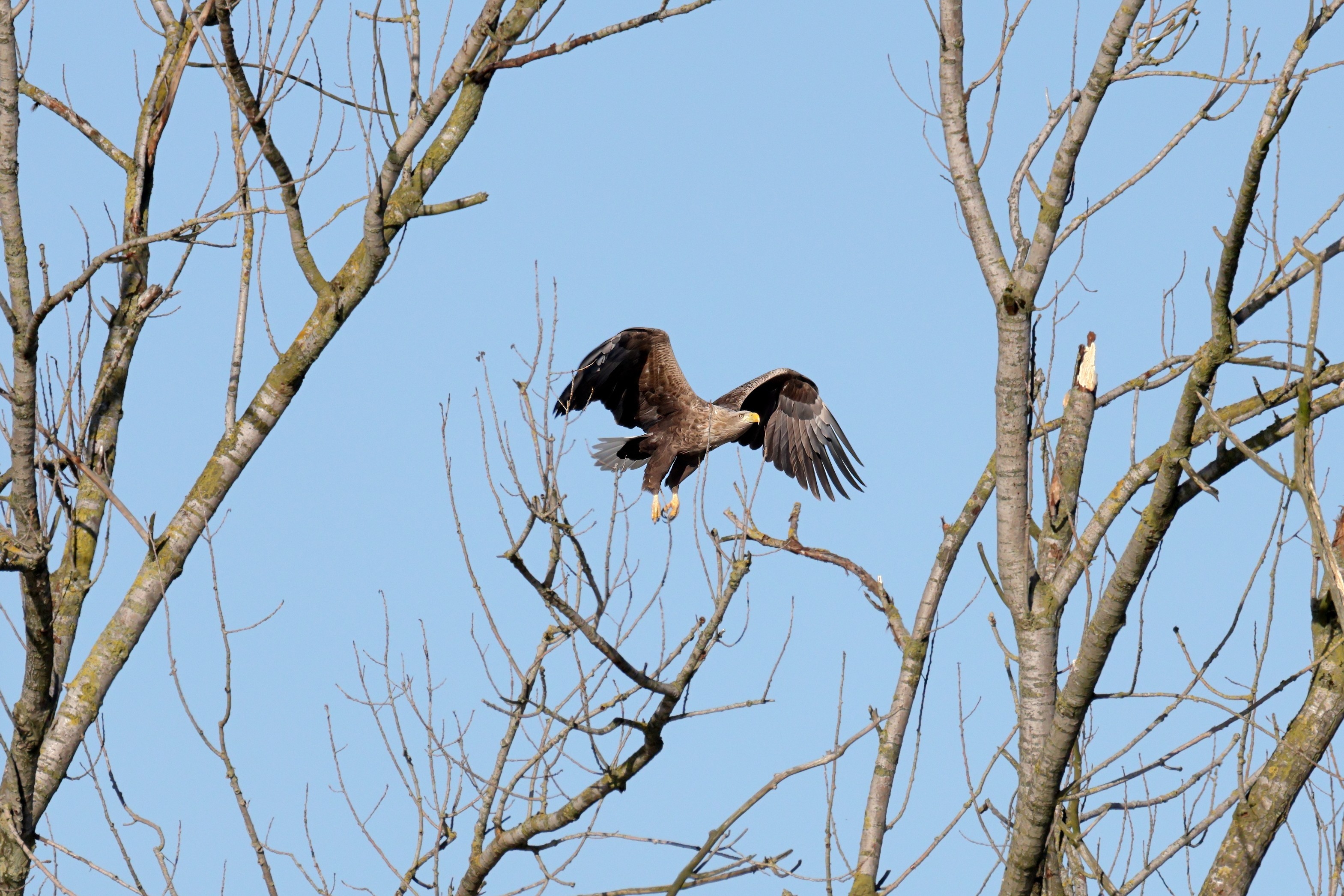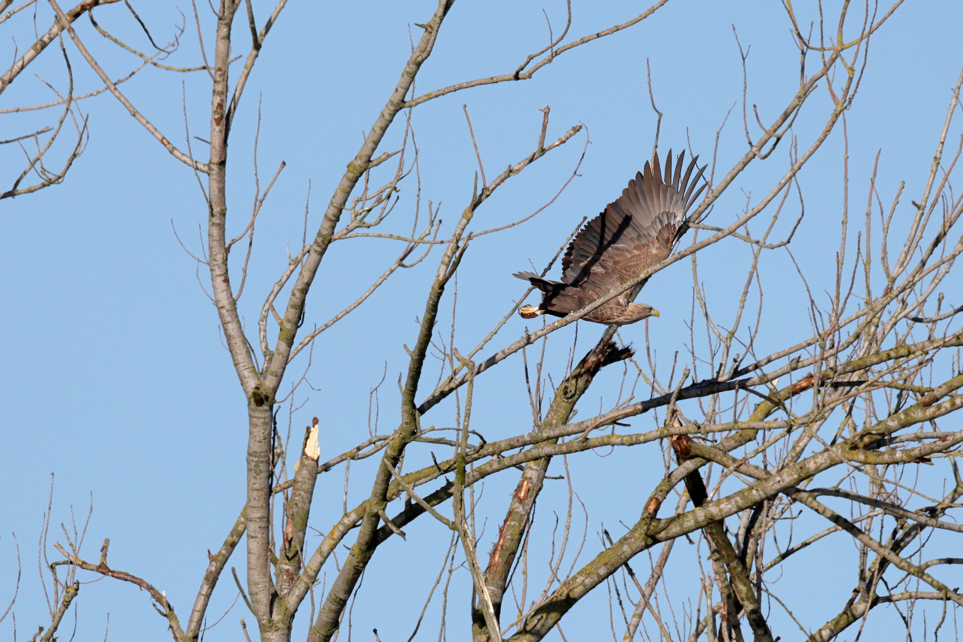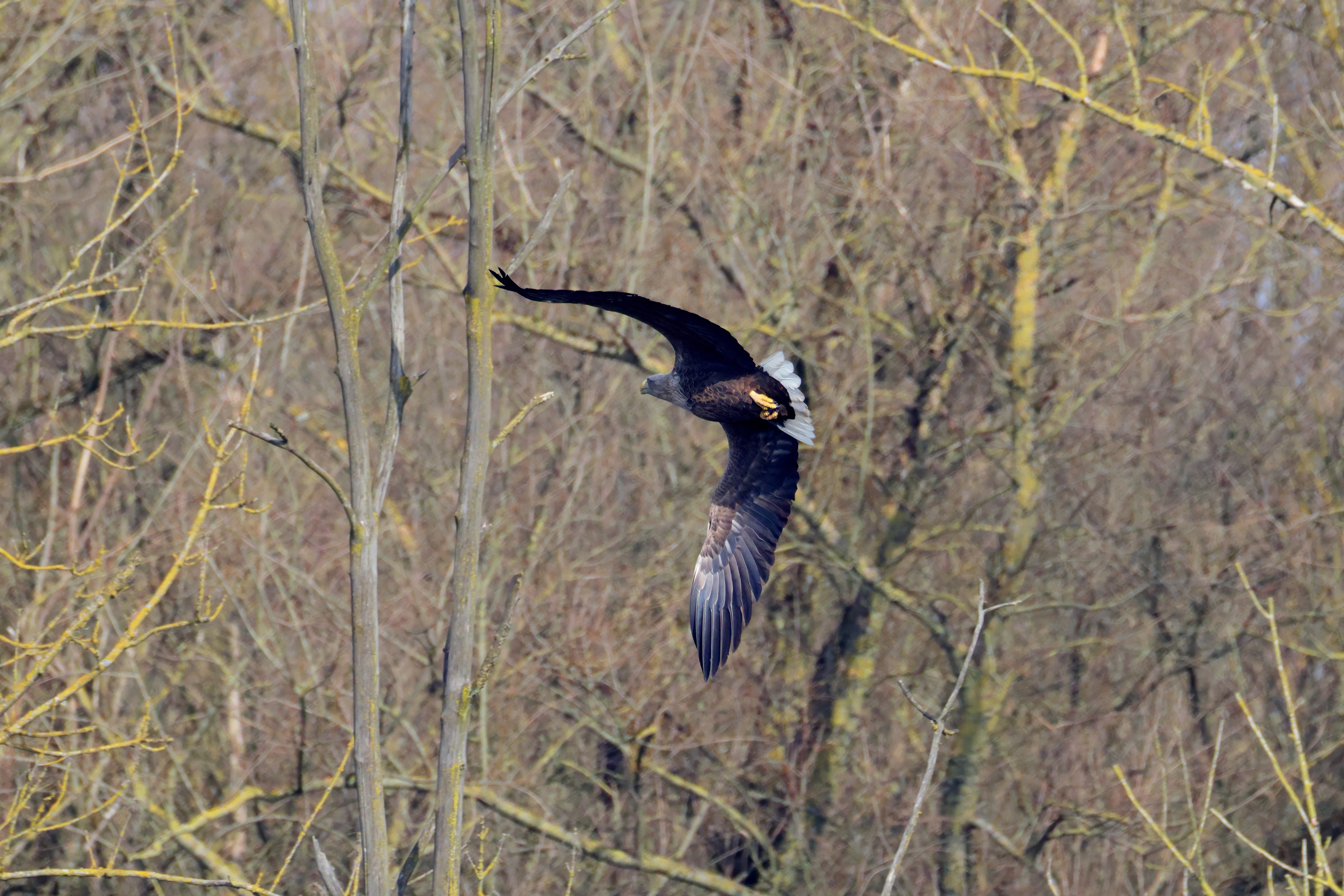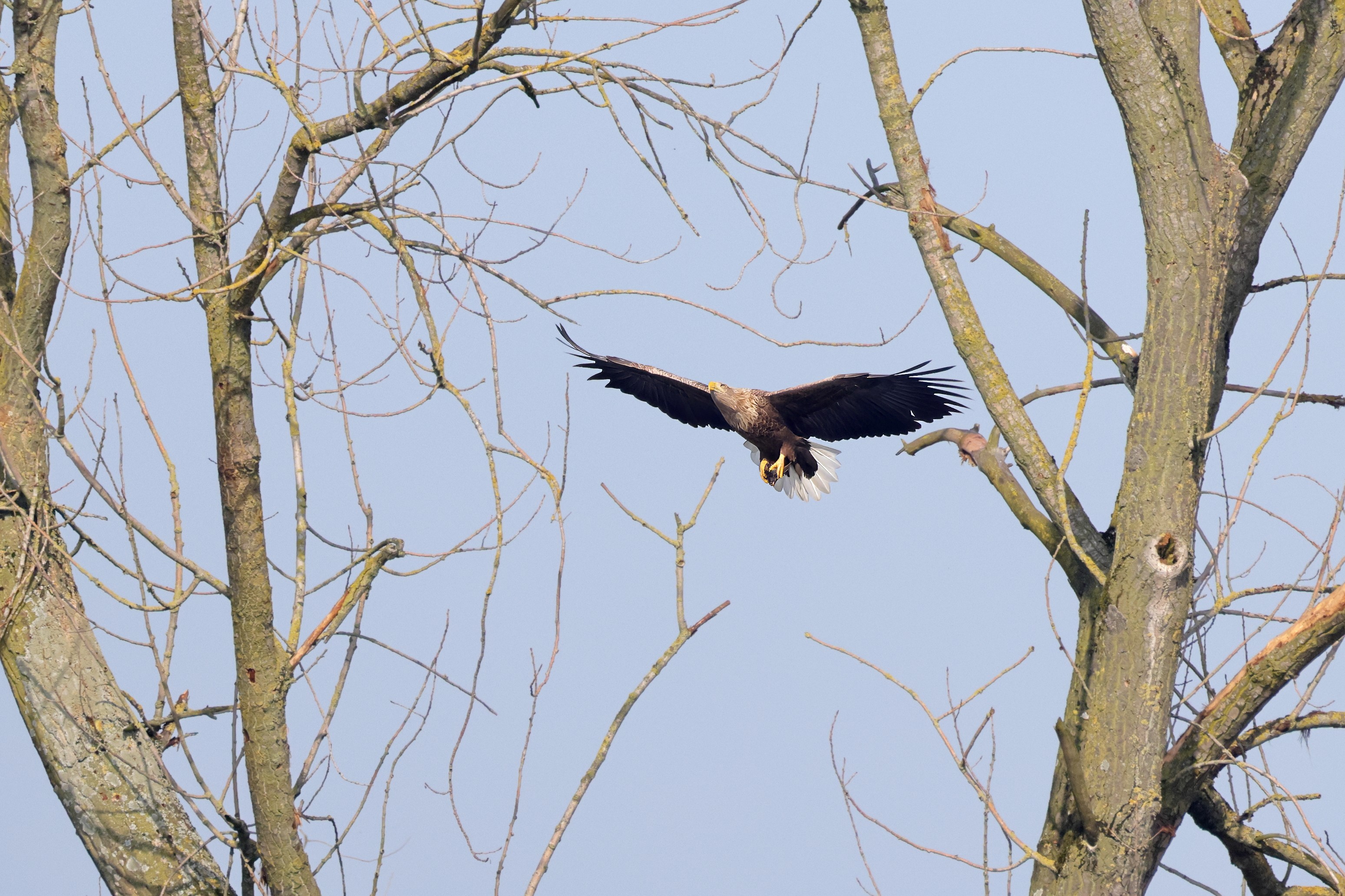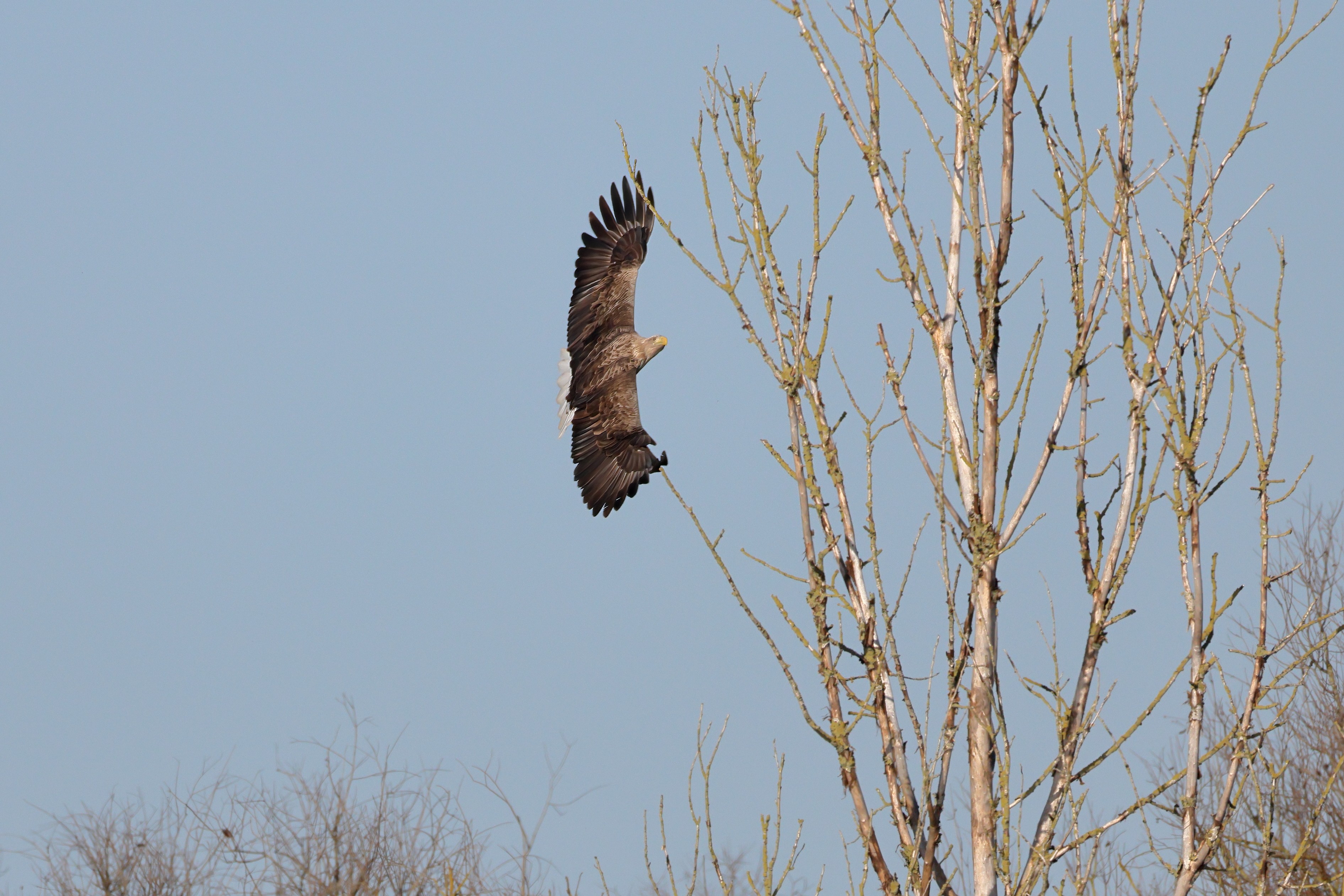 Während der etwa 38 bis 42 Tage dauernden Brutzeit der Seeadler kommt es meist nur zu kurzen Ablösungen zwischen den Partnern. Doch wenn gutes Wetter, die Tageszeit und der natürliche Bewegungsdrang nach den langen Brutsitzungen zusammentreffen, lassen sich vom abgelösten Partner manchmal ganz besondere Aufnahmen gestalten.