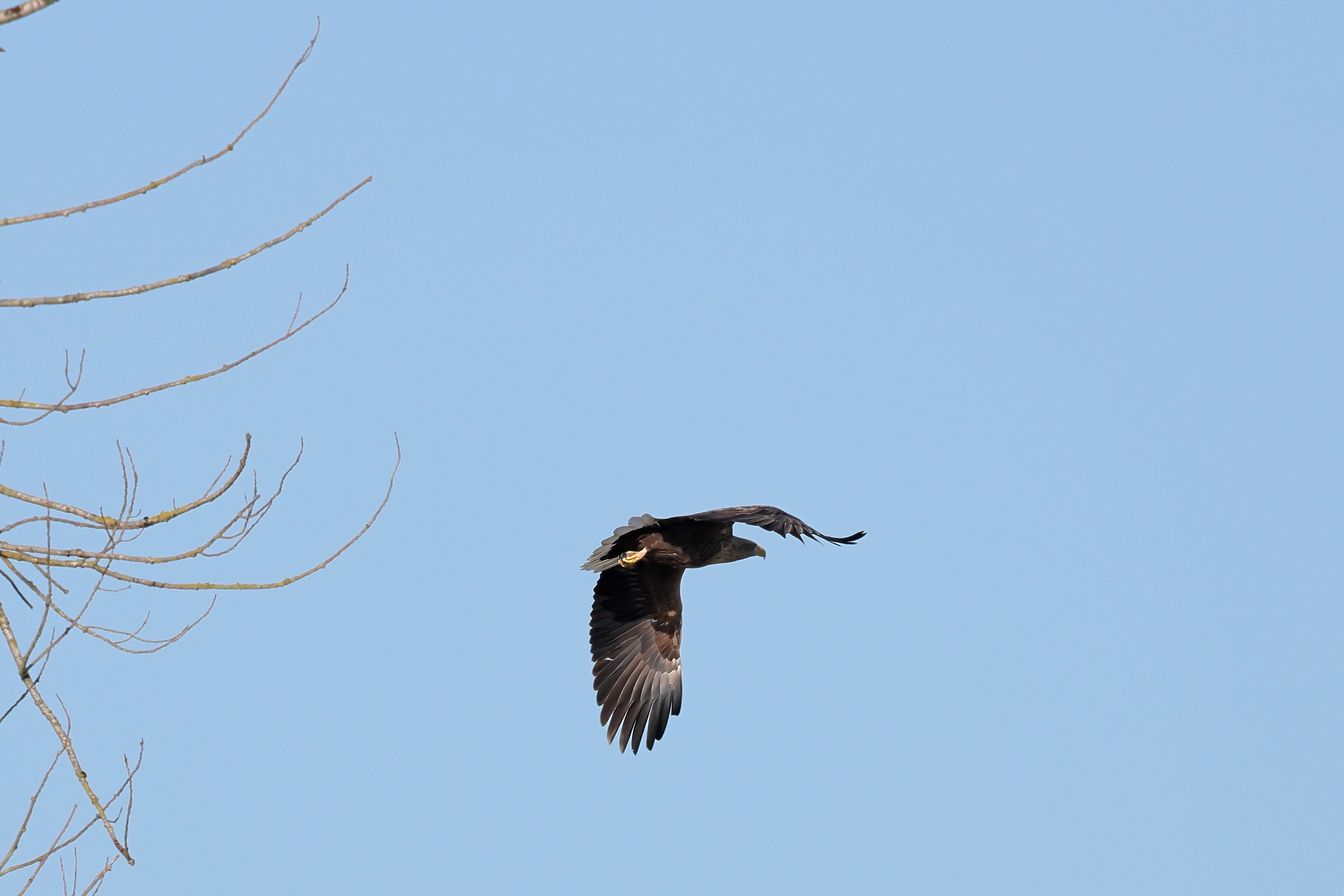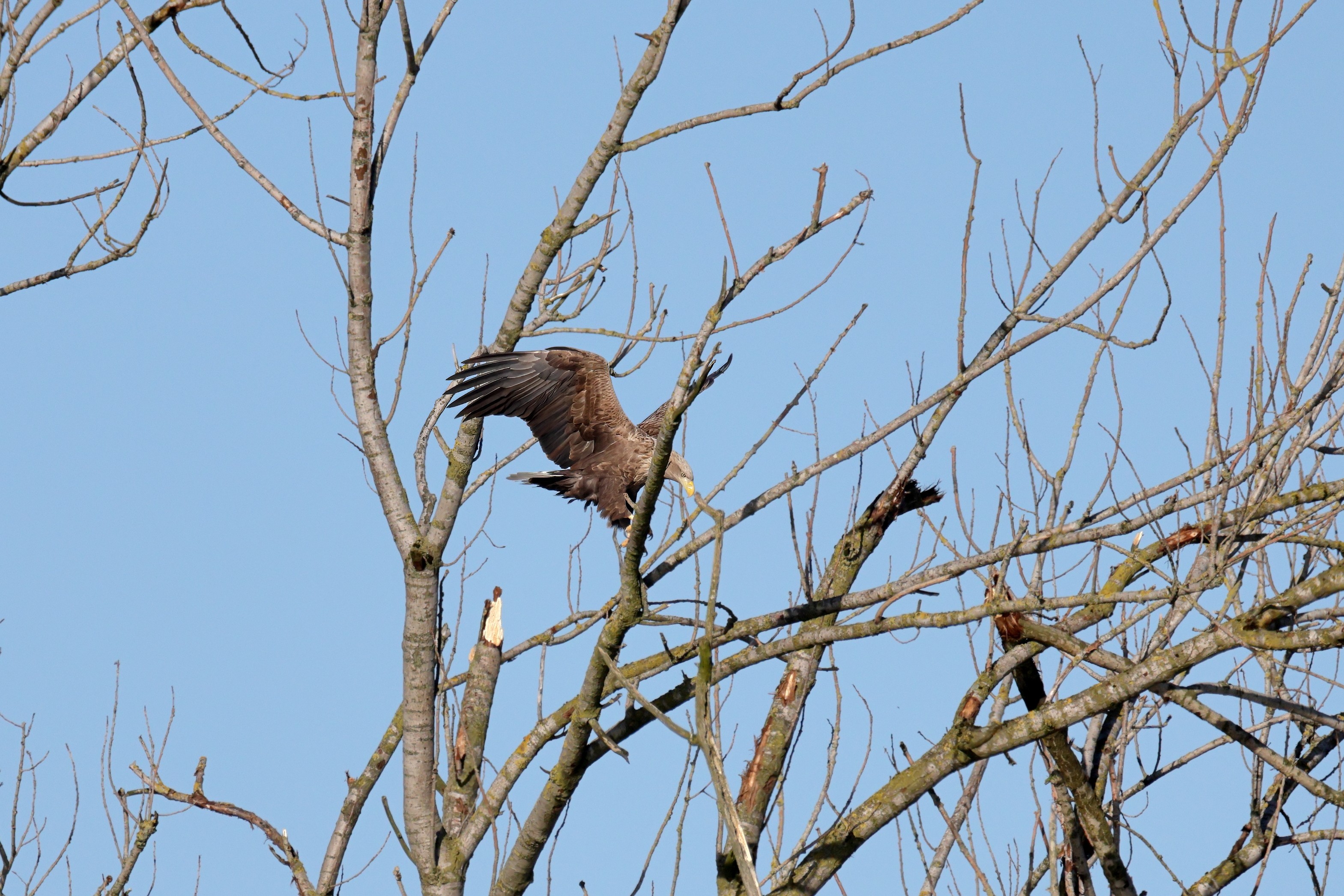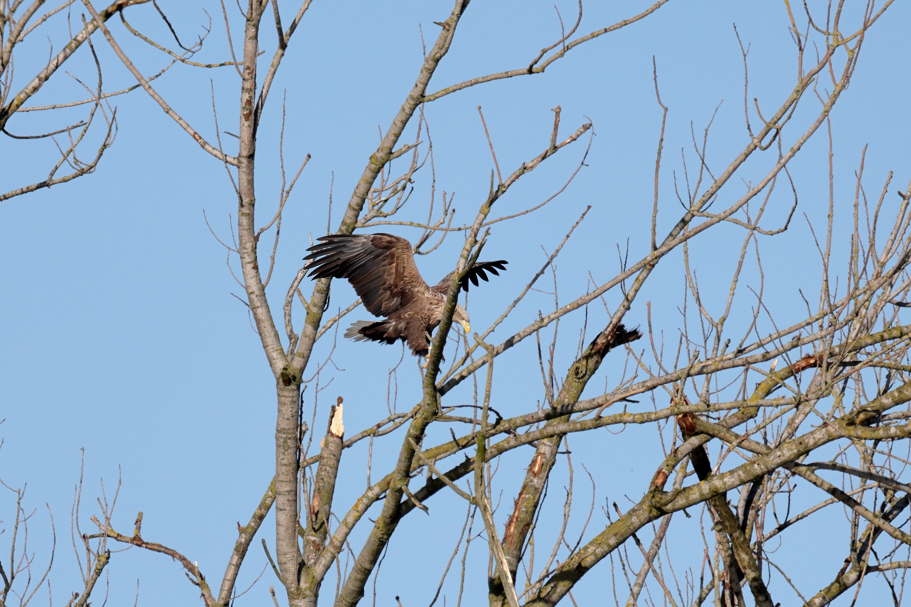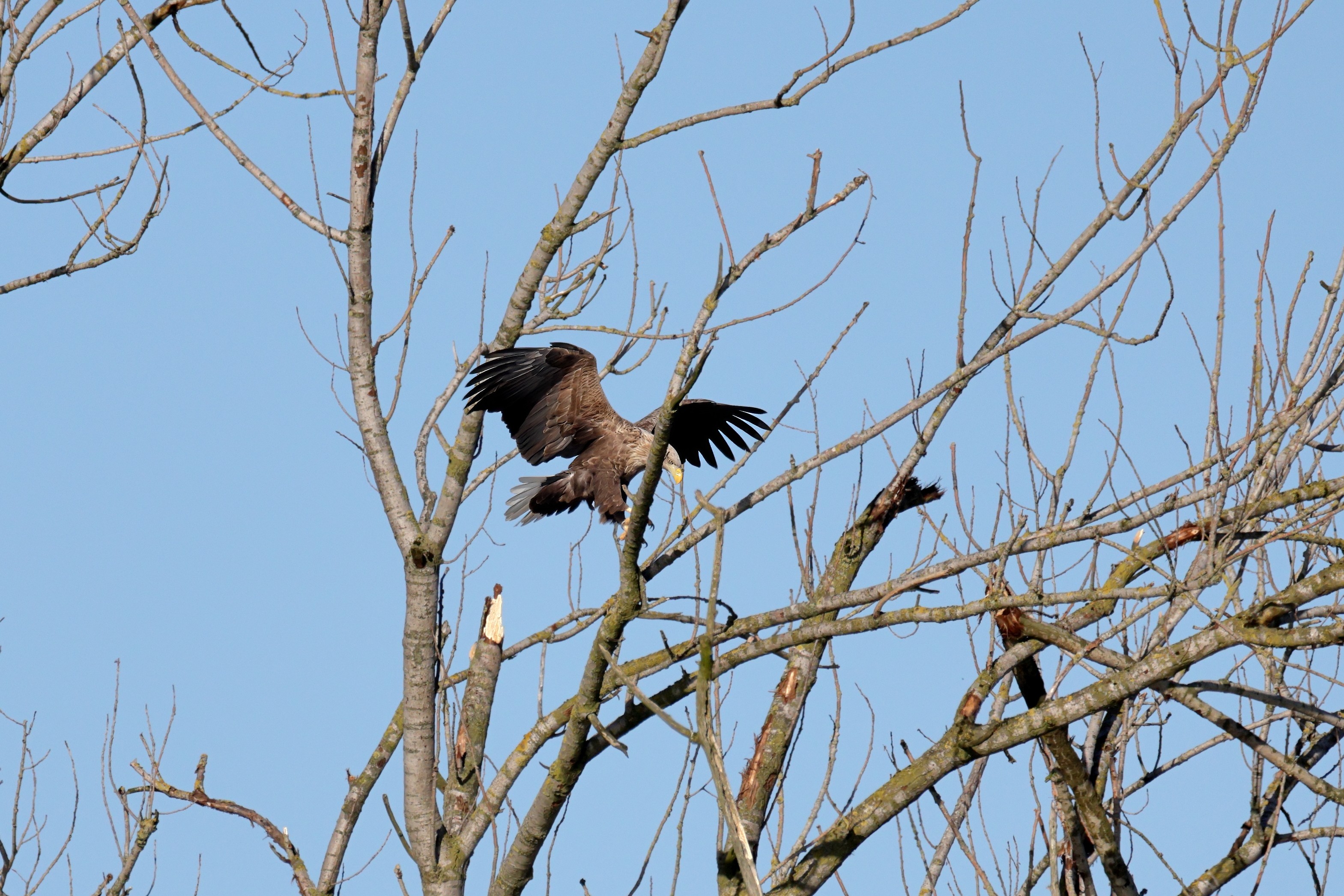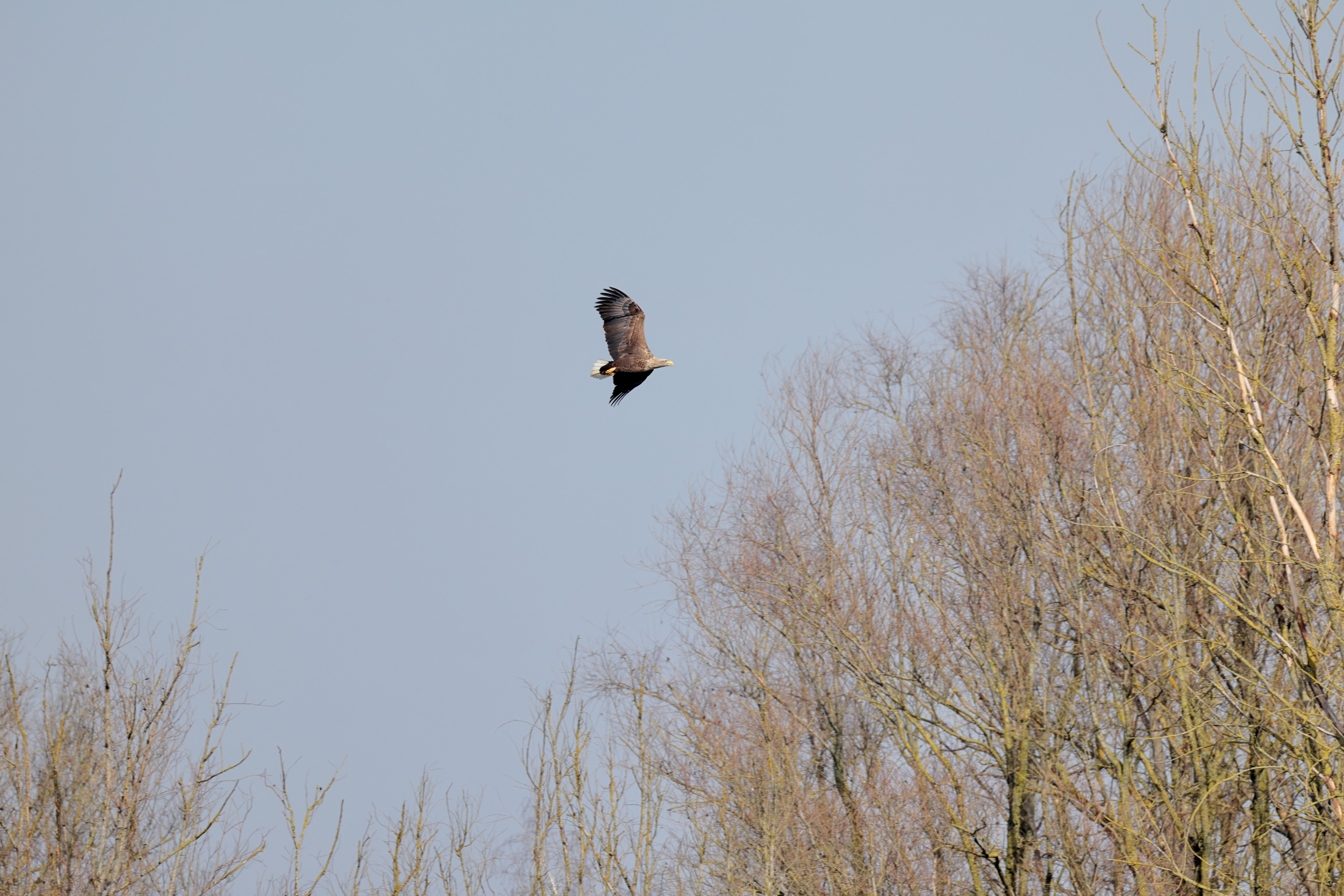 Während der etwa 38 bis 42 Tage dauernden Brutzeit der Seeadler kommt es meist nur zu kurzen Ablösungen zwischen den Partnern. Doch wenn gutes Wetter, die Tageszeit und der natürliche Bewegungsdrang nach den langen Brutsitzungen zusammentreffen, lassen sich vom abgelösten Partner manchmal ganz besondere Aufnahmen gestalten.