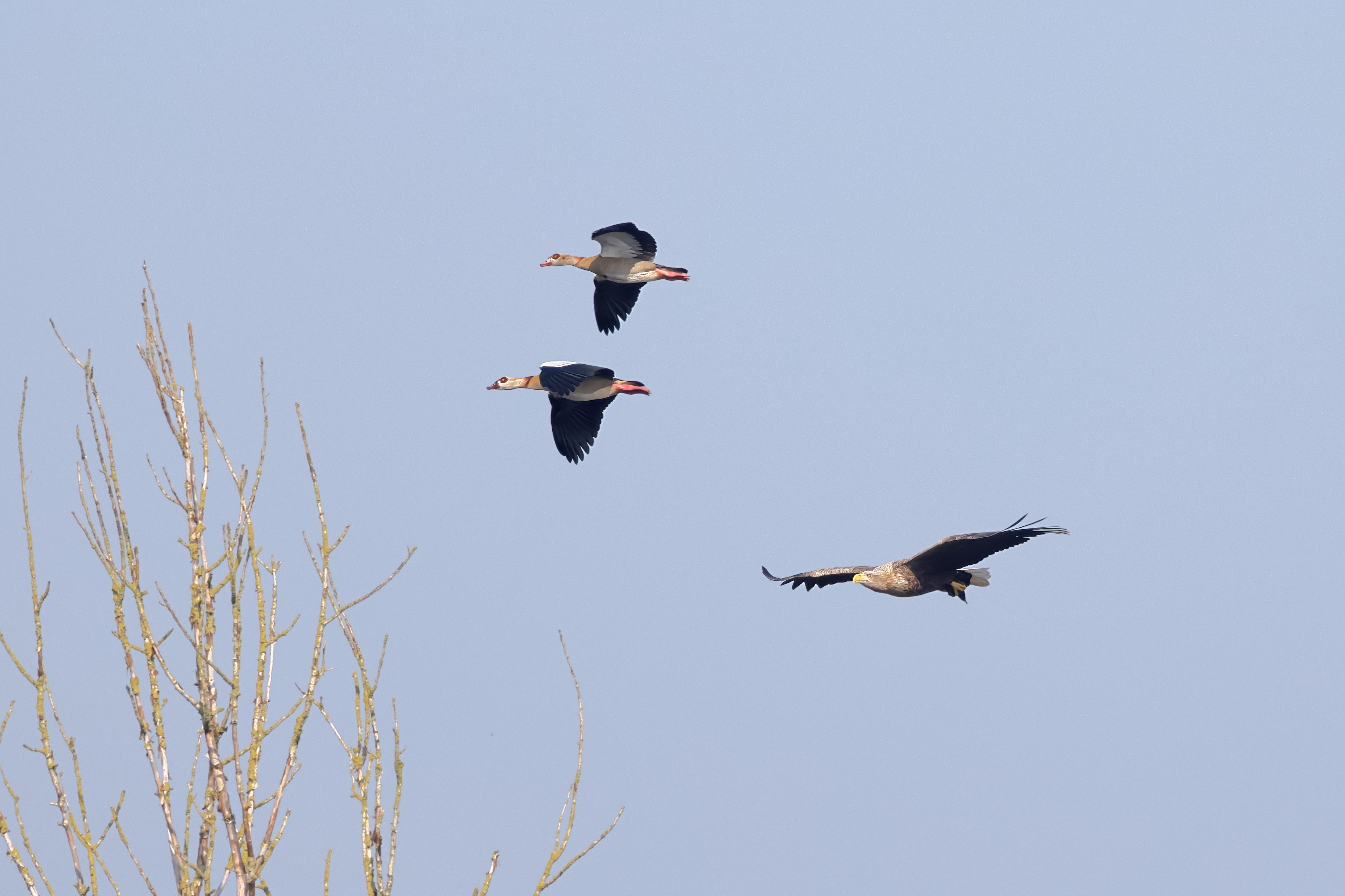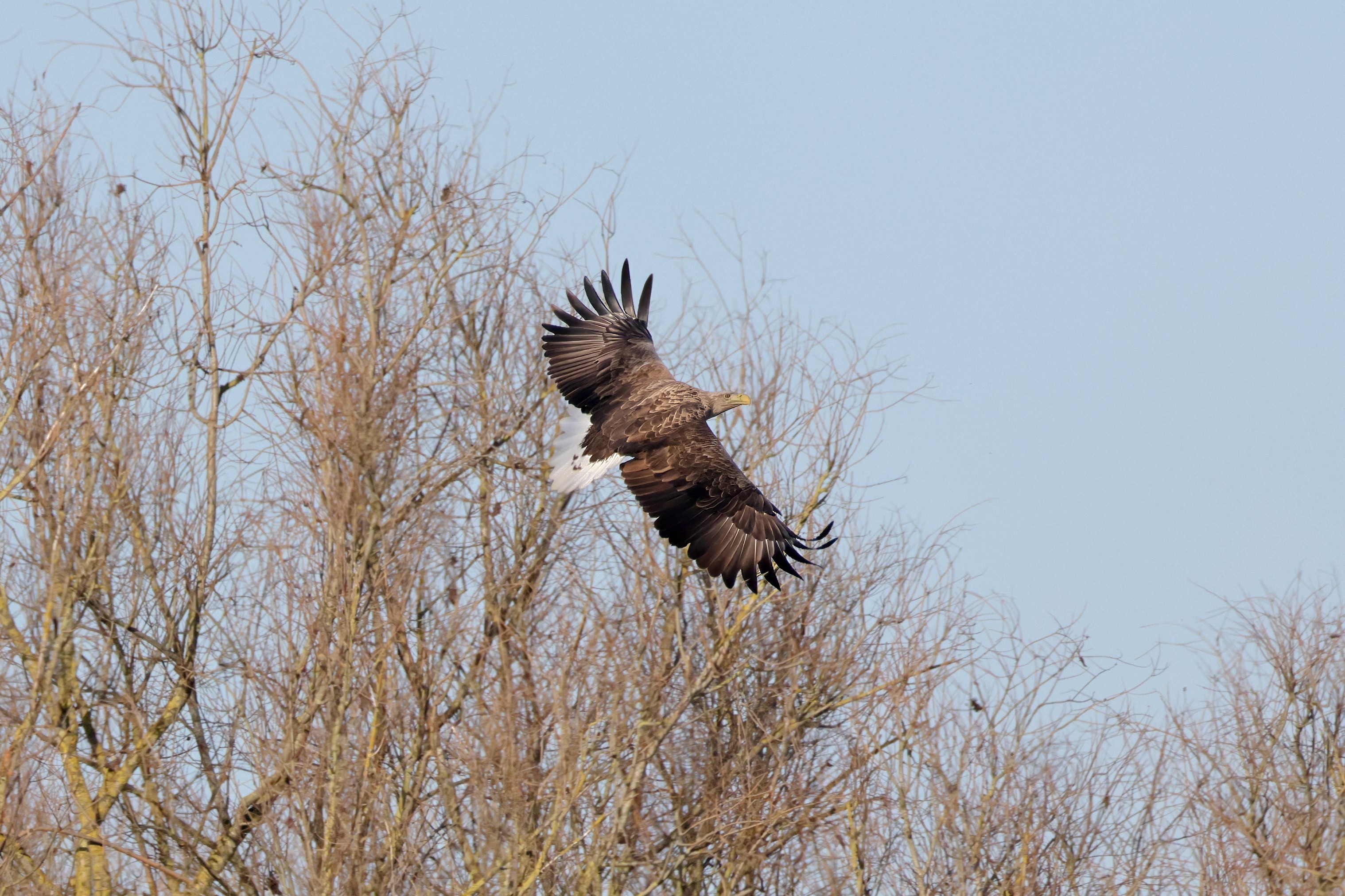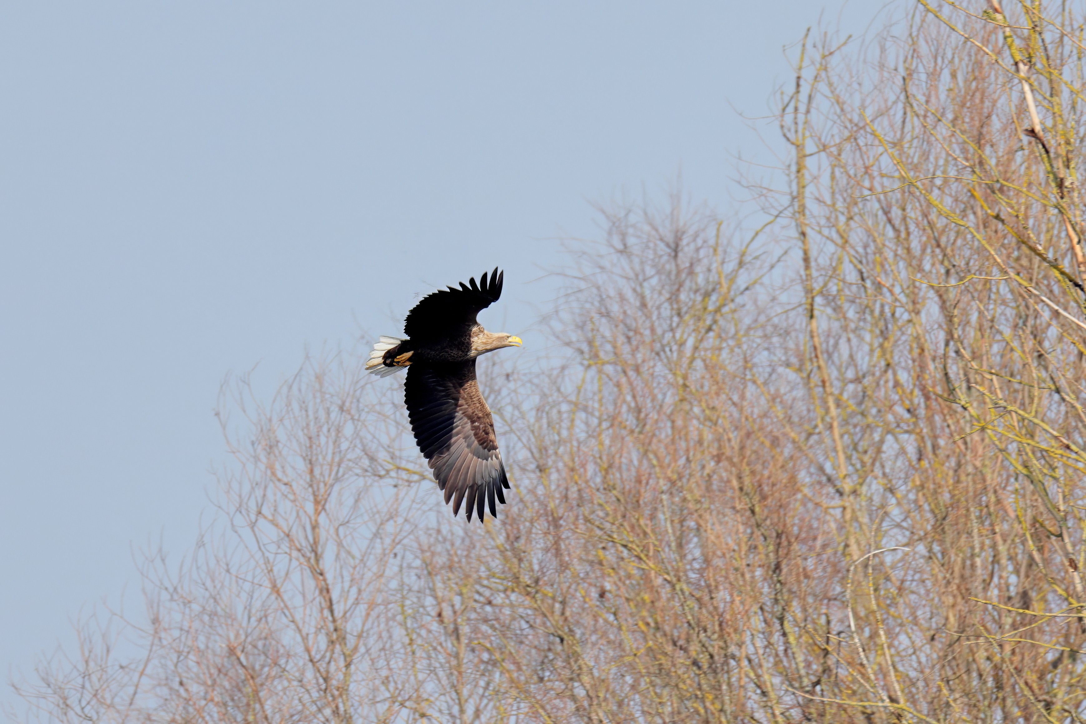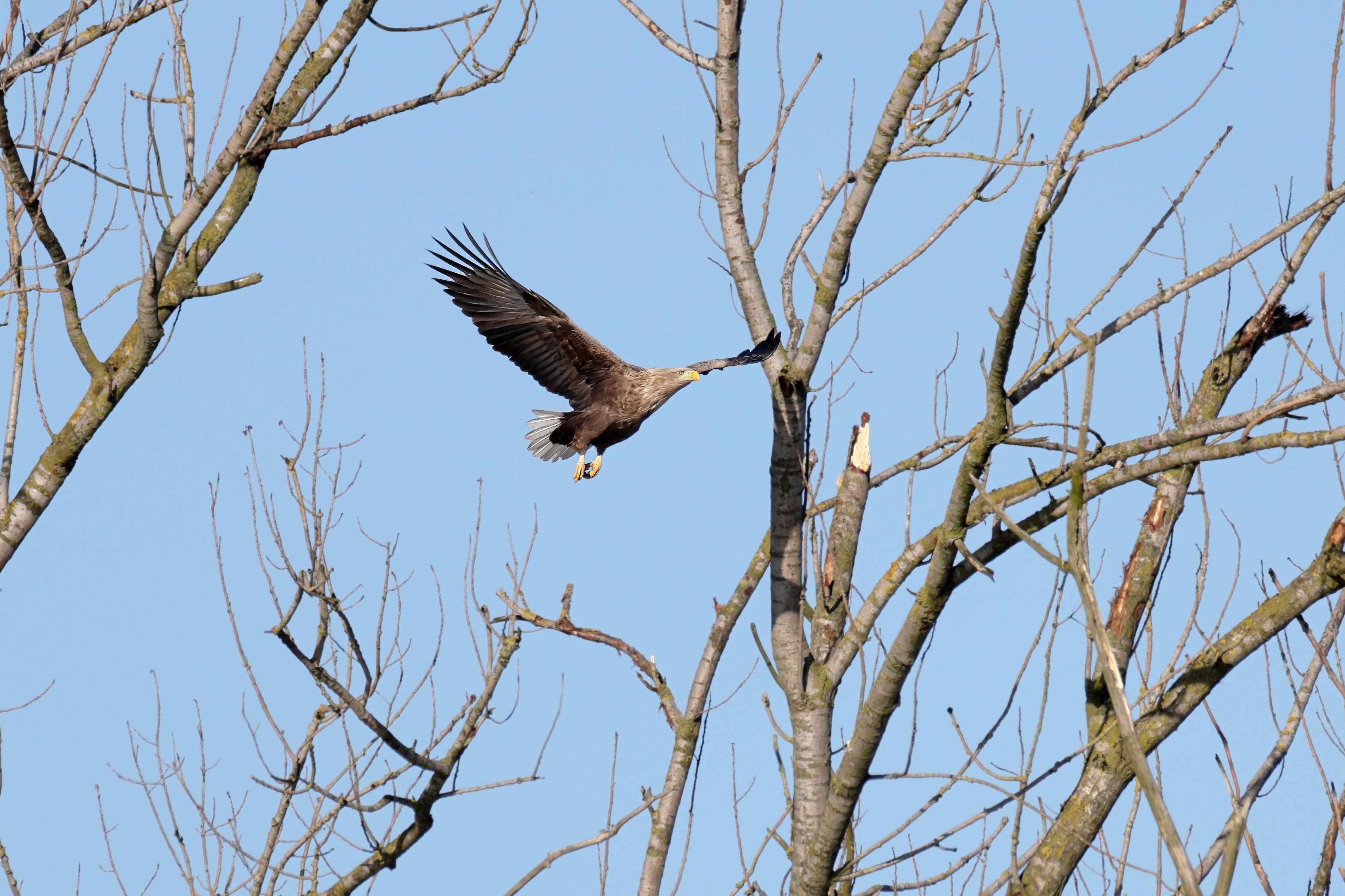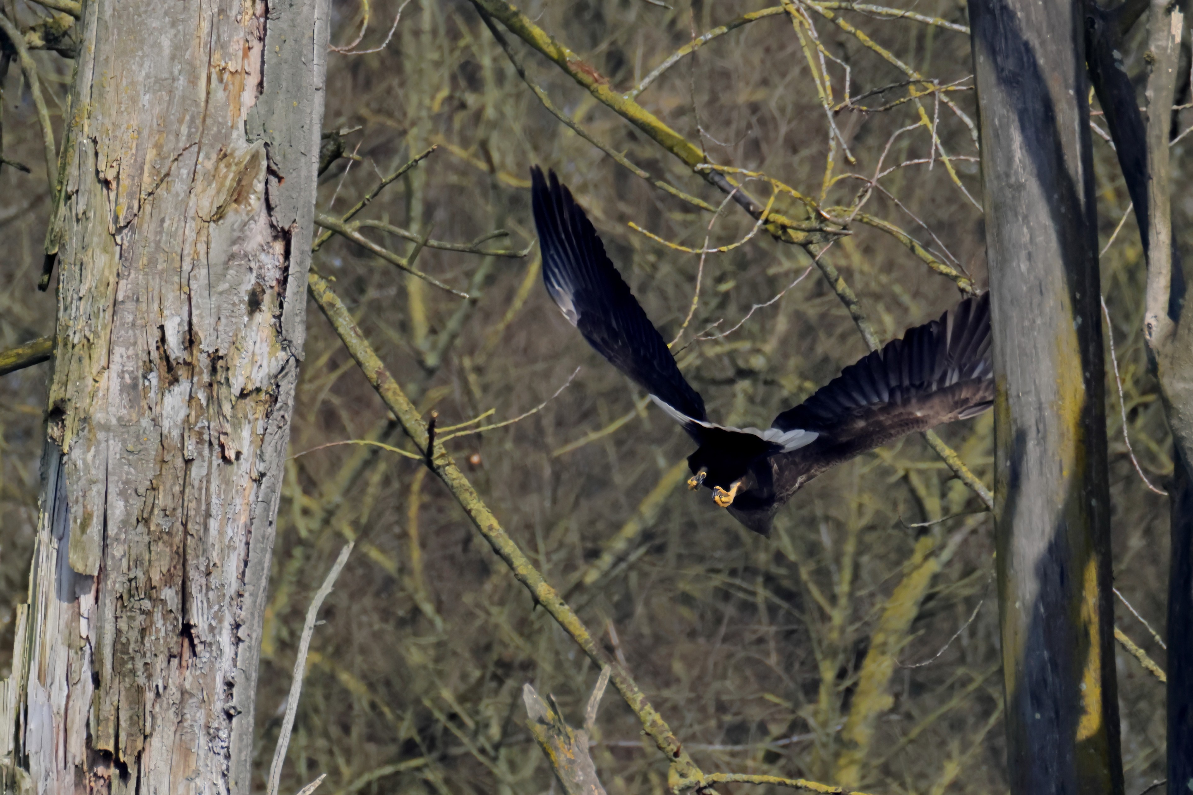 Während der etwa 38 bis 42 Tage dauernden Brutzeit der Seeadler kommt es meist nur zu kurzen Ablösungen zwischen den Partnern. Doch wenn gutes Wetter, die Tageszeit und der natürliche Bewegungsdrang nach den langen Brutsitzungen zusammentreffen, lassen sich vom abgelösten Partner manchmal ganz besondere Aufnahmen gestalten.