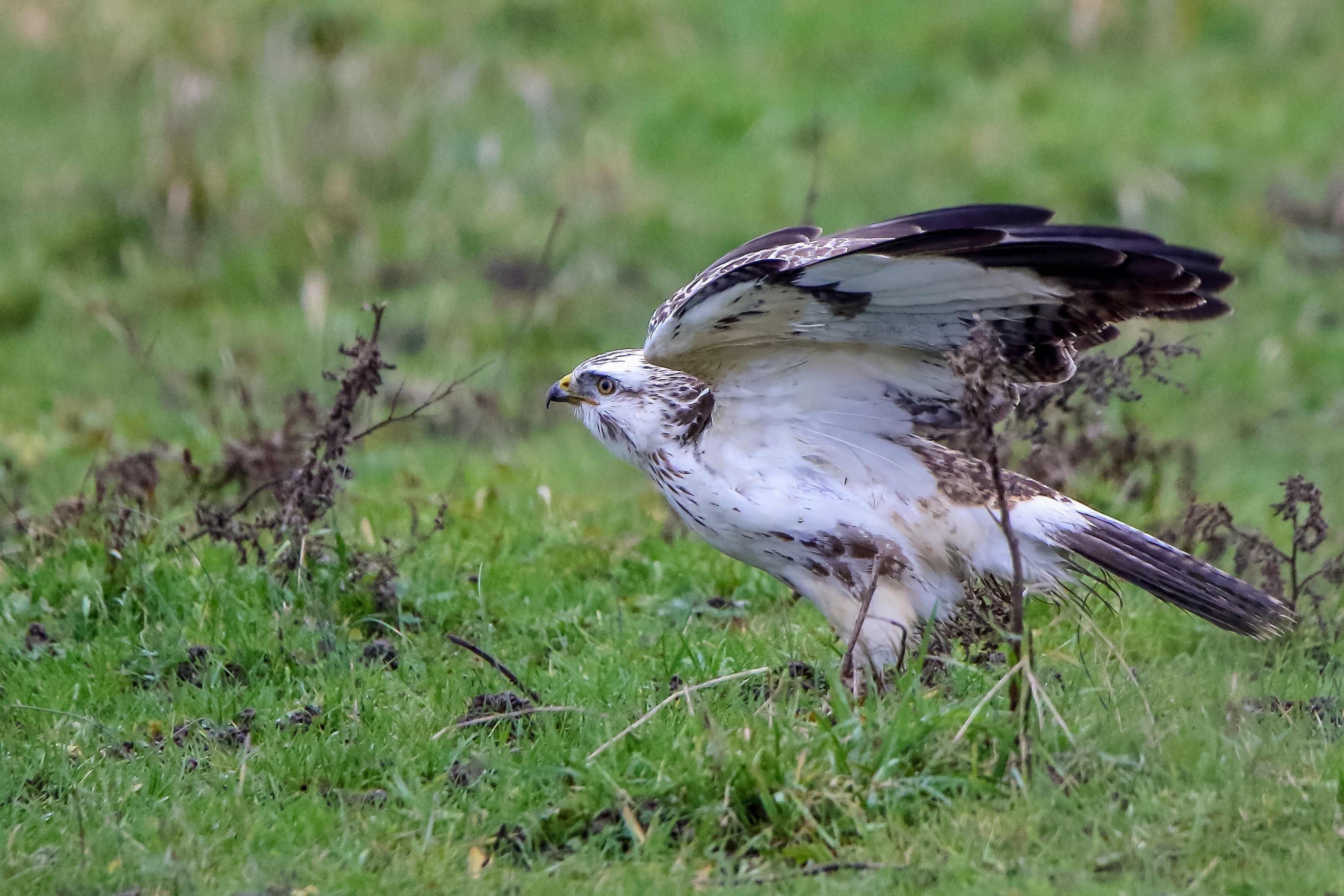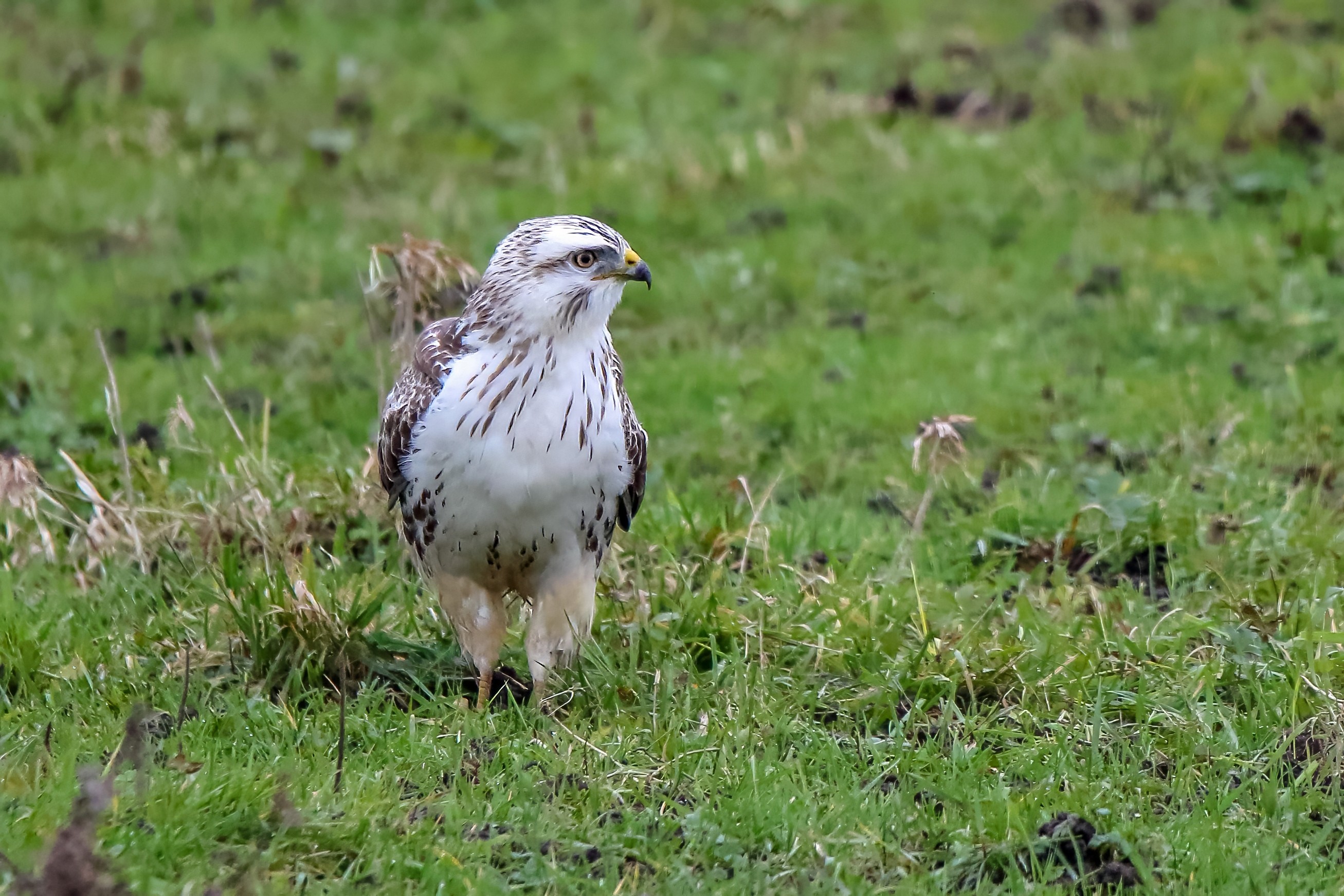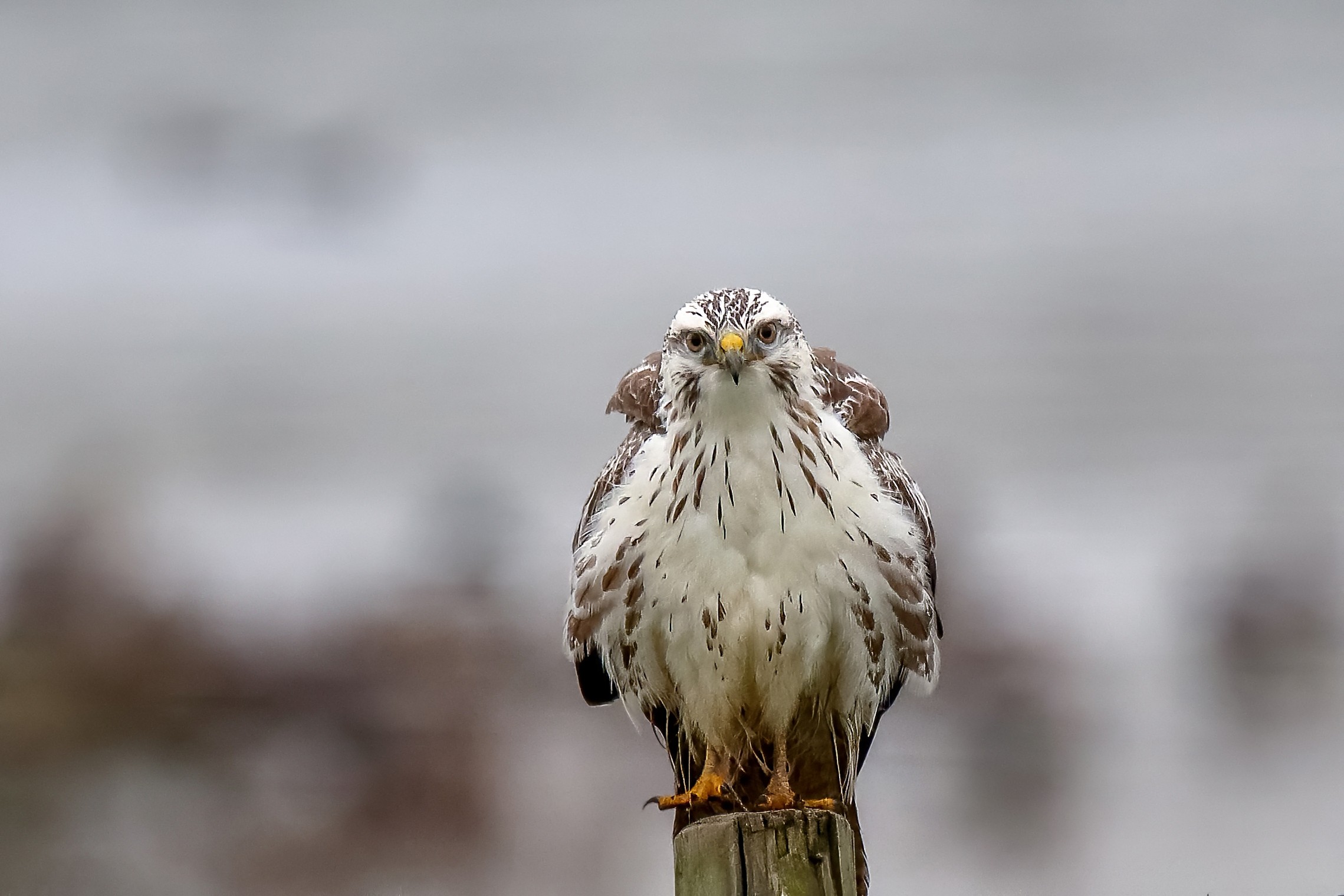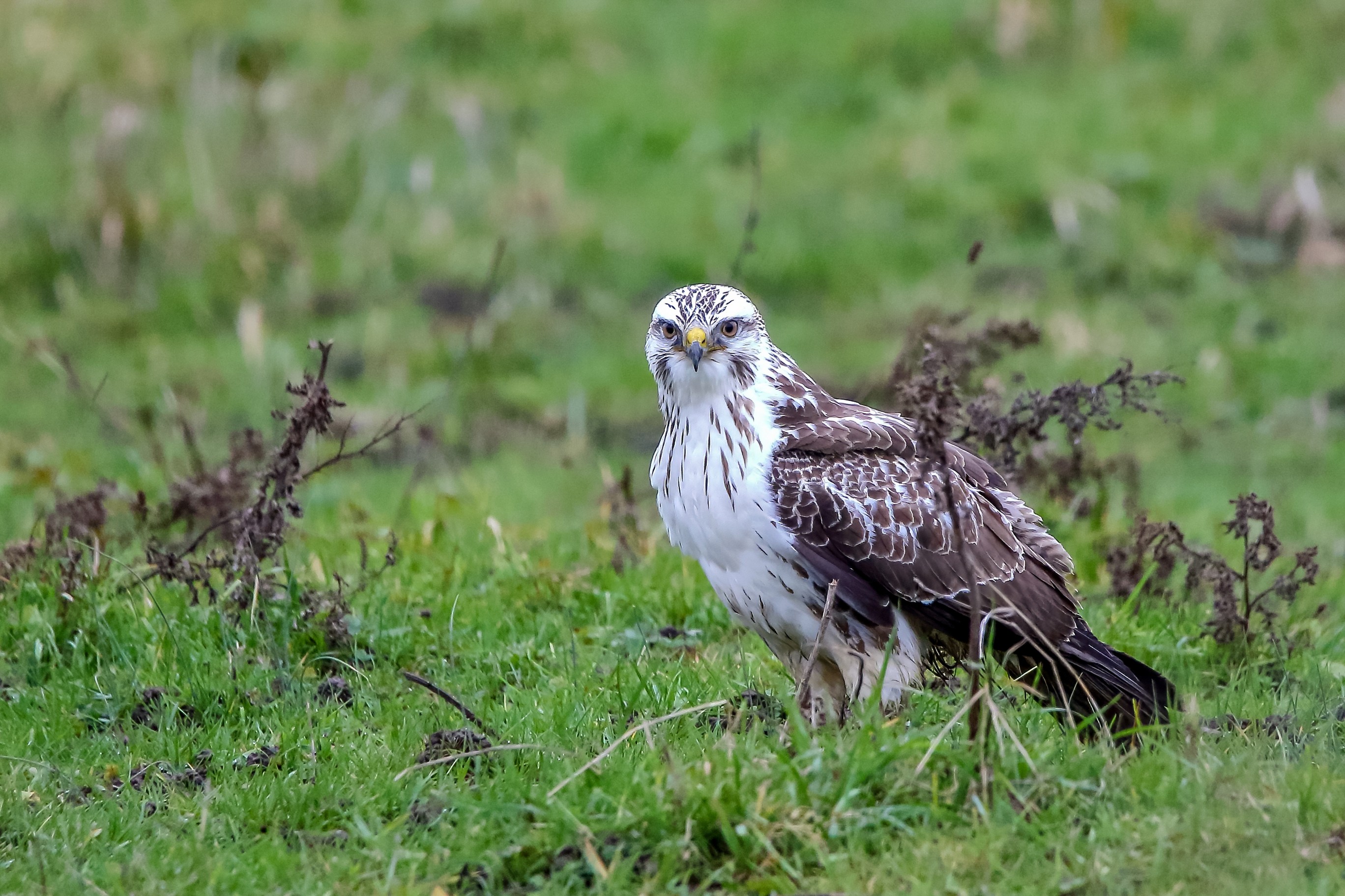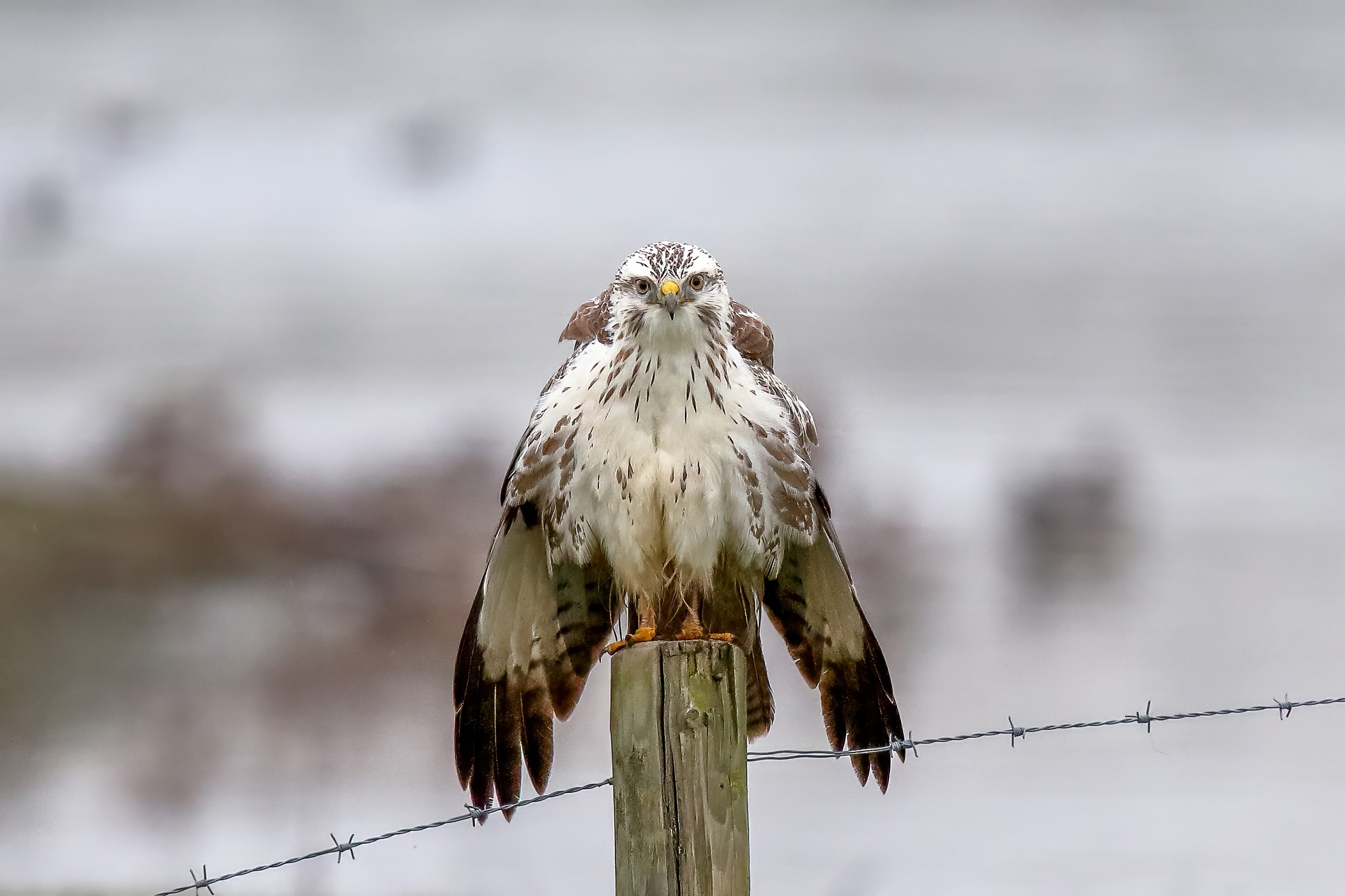 Bussarde haben sehr unterschiedliche Federkleider. Eine seltene und auffällige Farbgebung des Federkleides, wie auf diesen Aufnahmen zu sehen, nennt man helle Farbmorphe. Stets Abstand vom Fotografen einnehmend präsentiert er sich meist mit in größerer Entfernung.