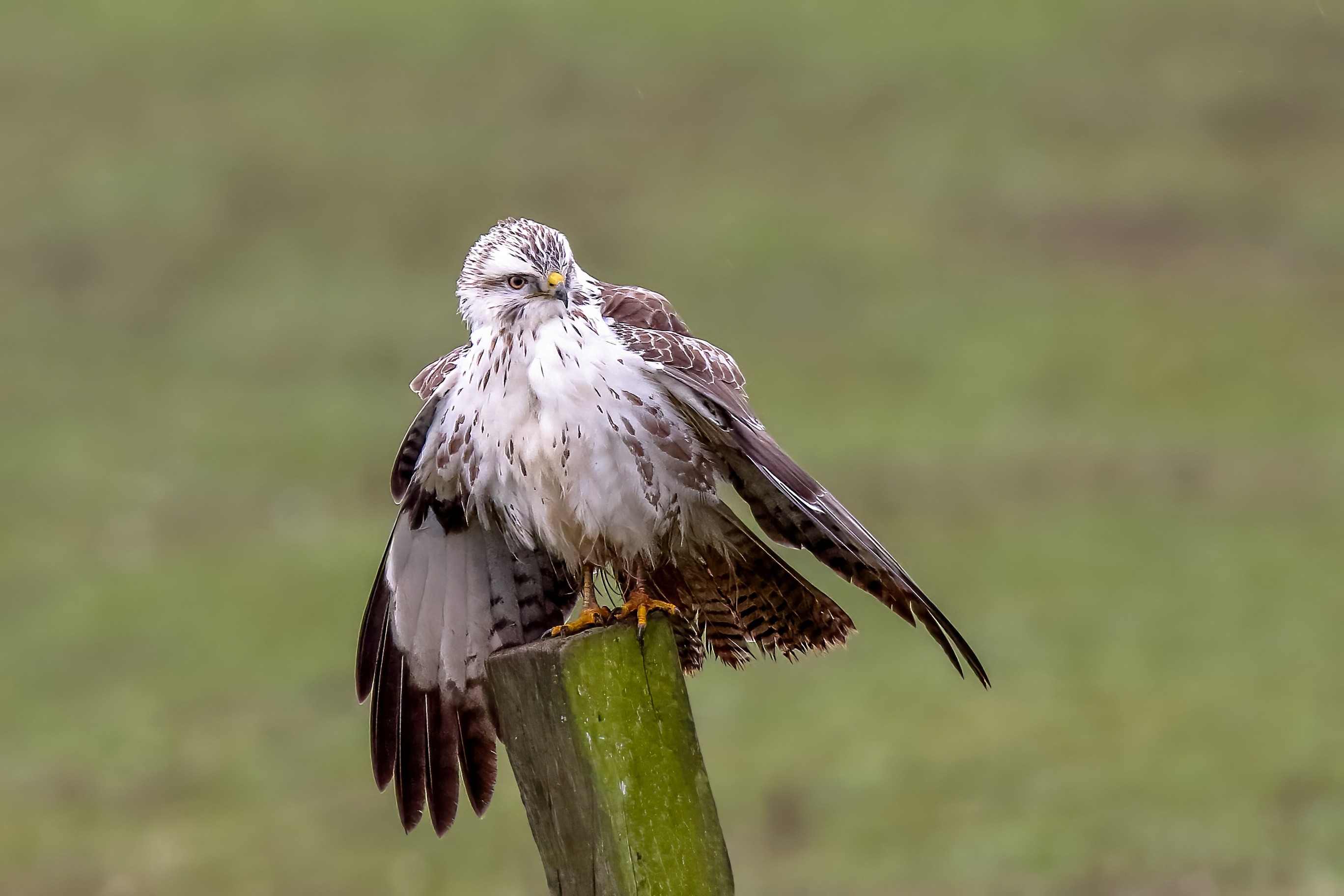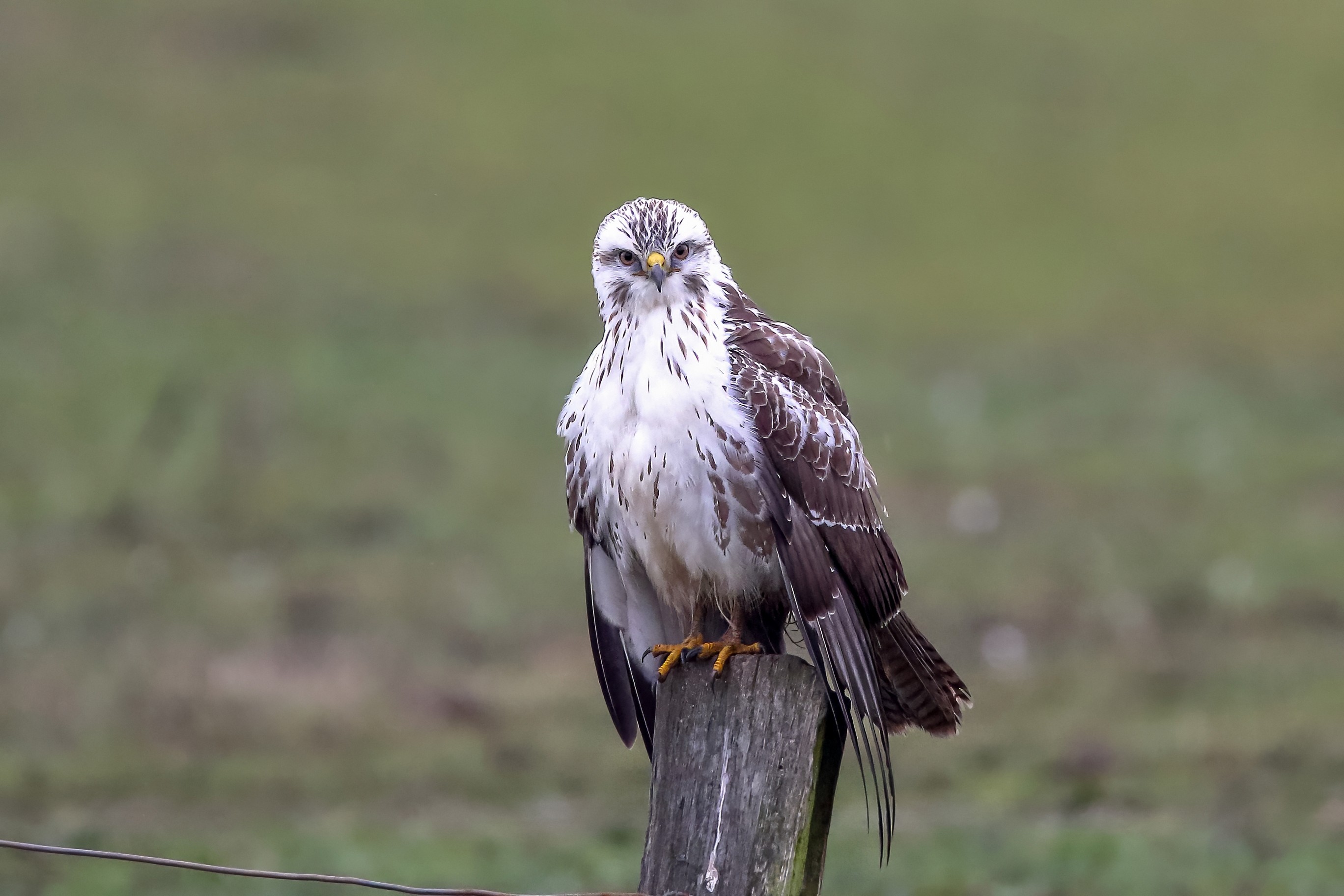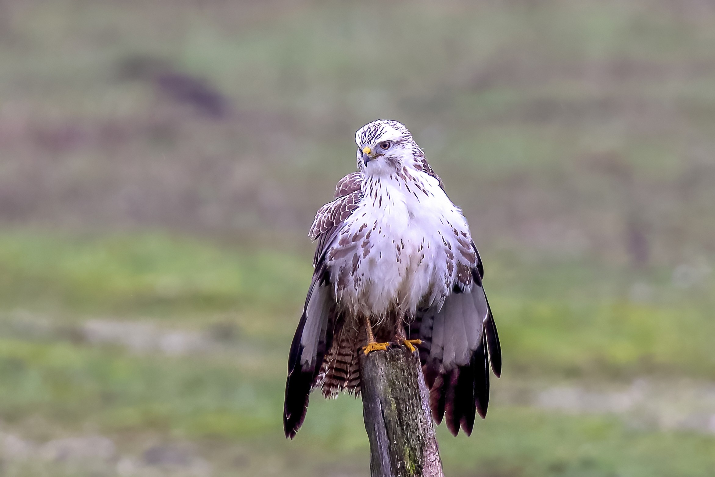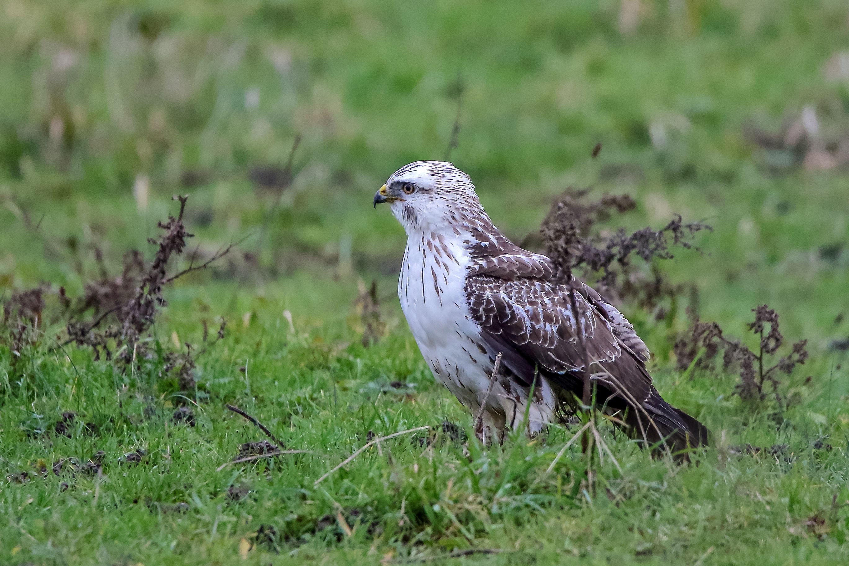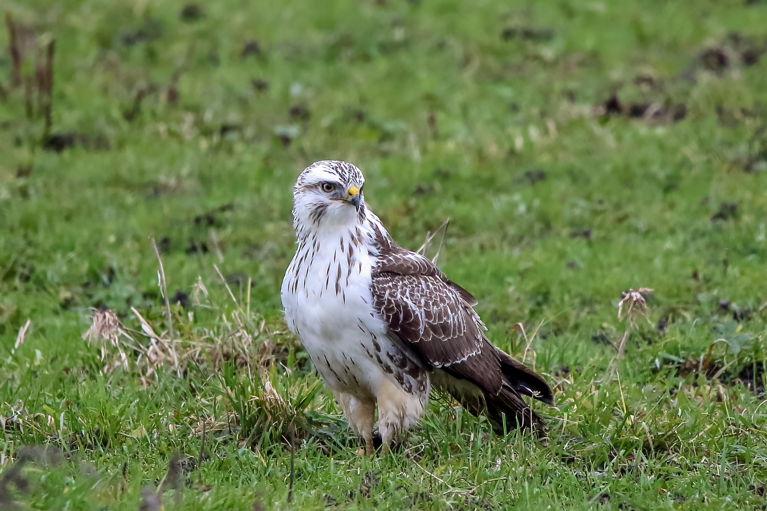 Bussarde haben sehr unterschiedliche Federkleider. Eine seltene und auffällige Farbgebung des Federkleides, wie auf diesen Aufnahmen zu sehen, nennt man helle Farbmorphe. Stets Abstand vom Fotografen einnehmend präsentiert er sich meist mit in größerer Entfernung.