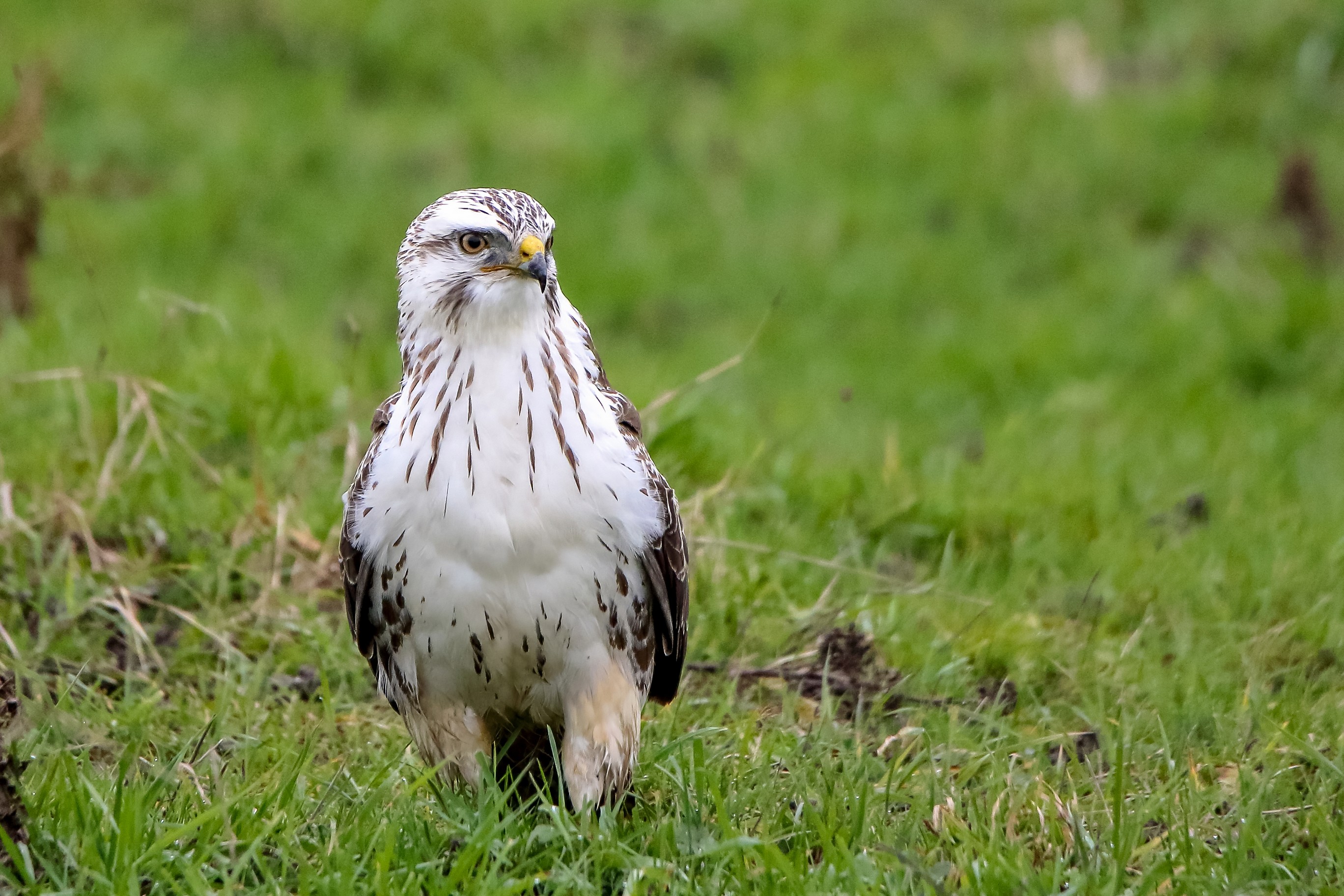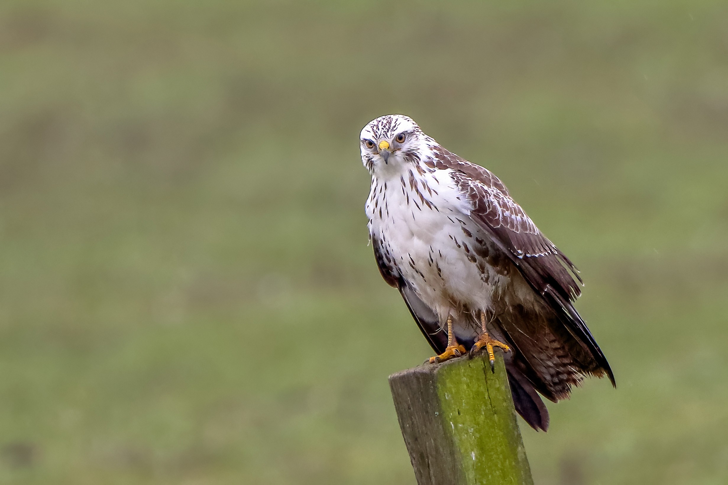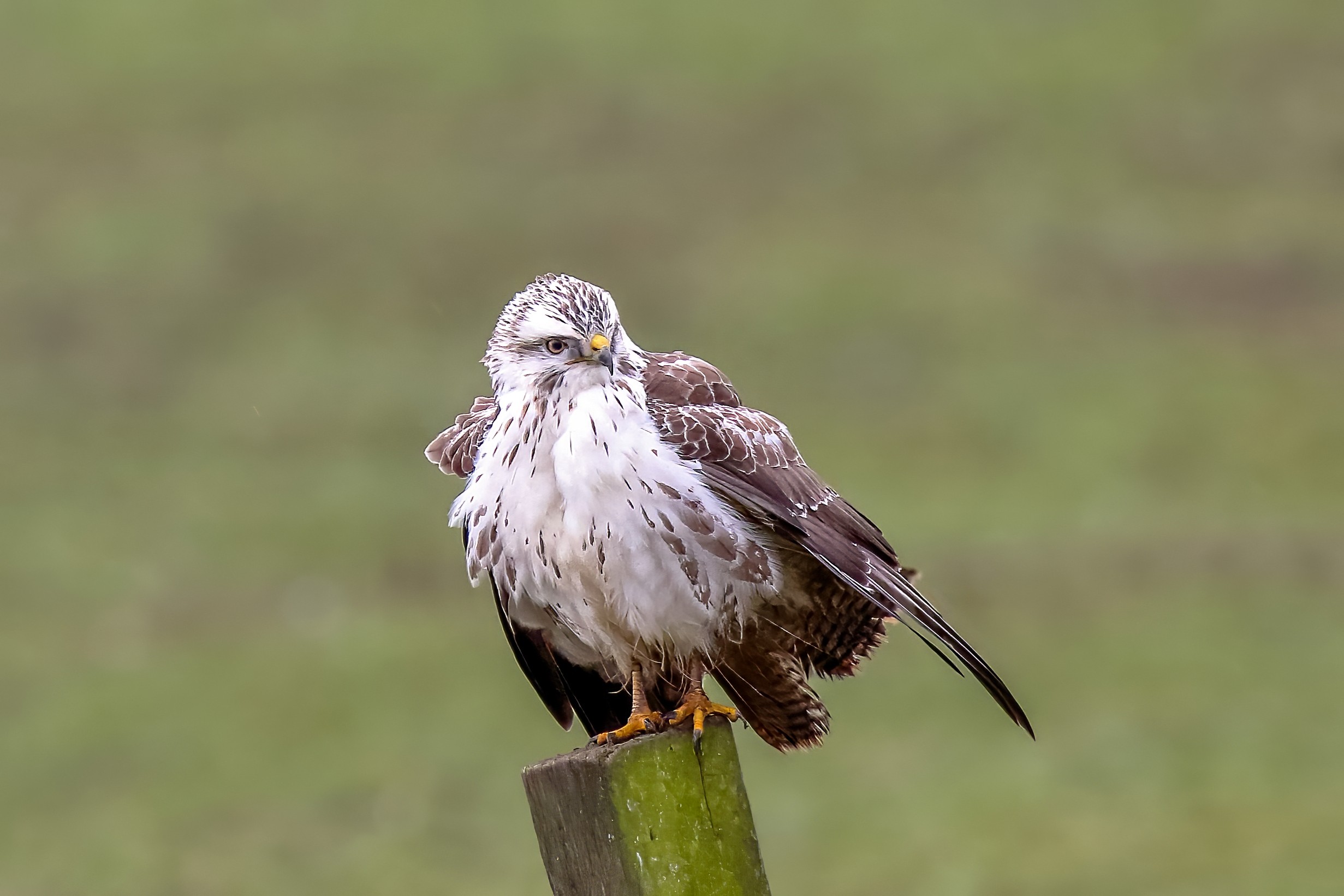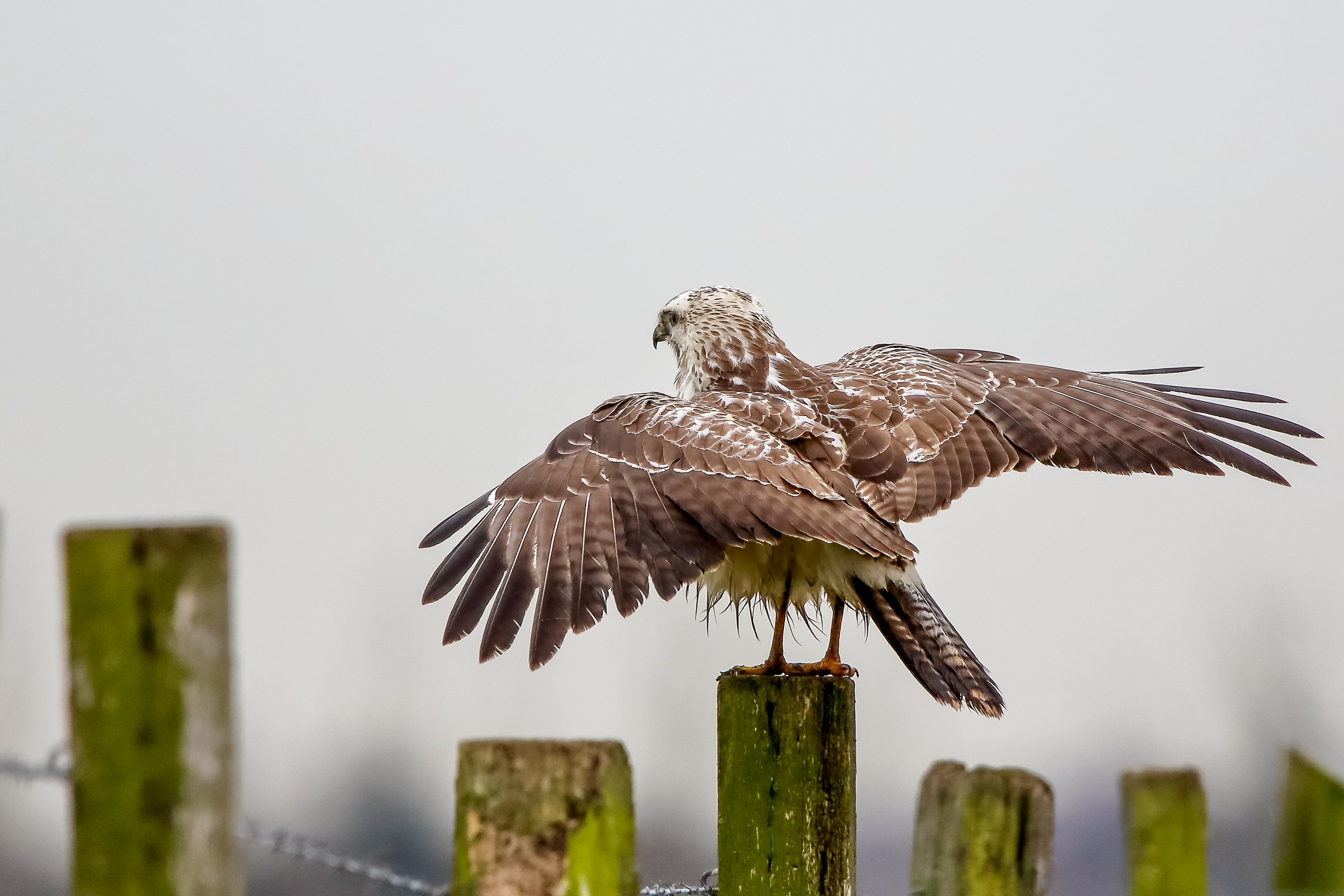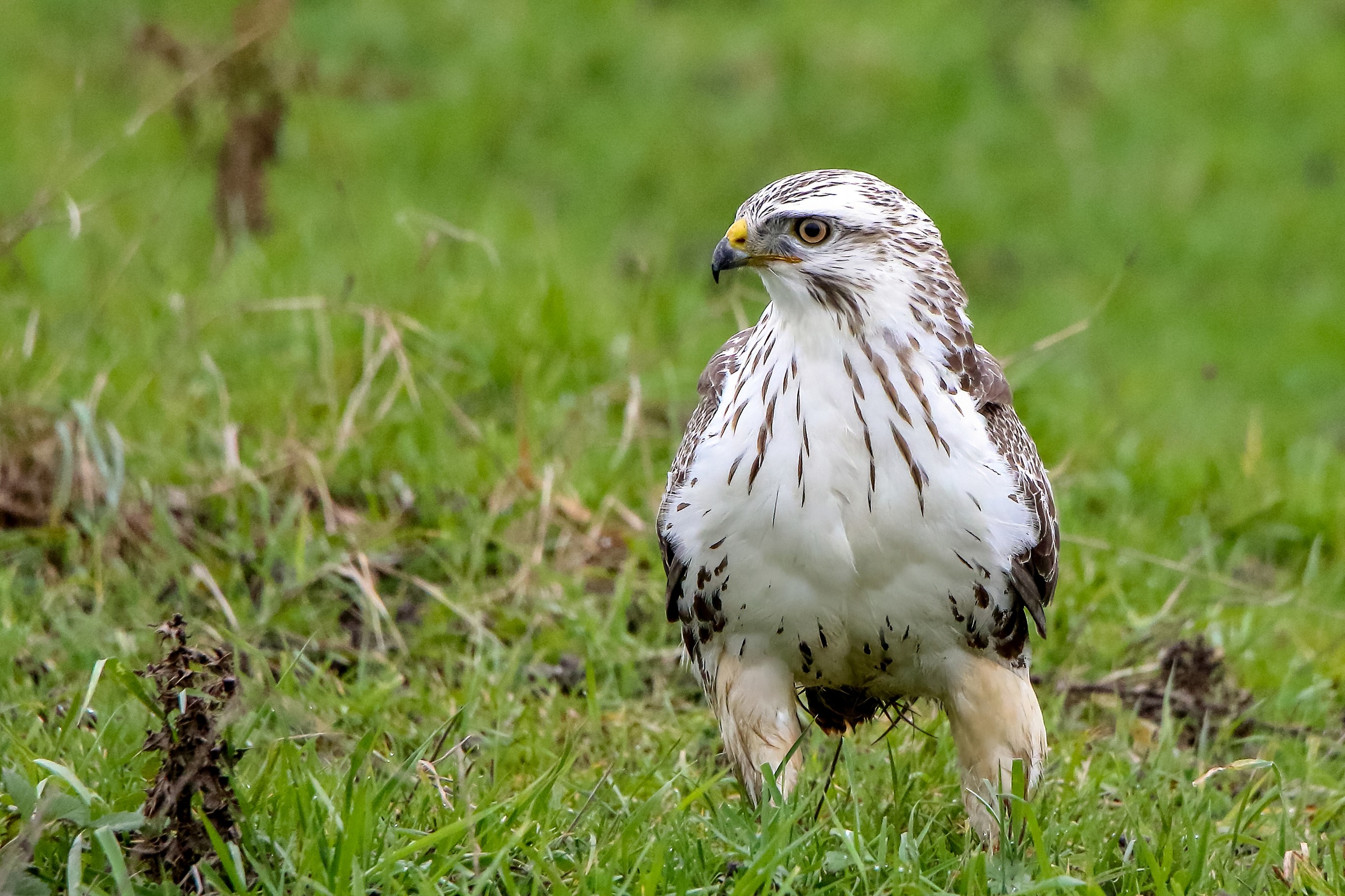 Bussarde haben sehr unterschiedliche Federkleider. Eine seltene und auffällige Farbgebung des Federkleides, wie auf diesen Aufnahmen zu sehen, nennt man helle Farbmorphe. Stets Abstand vom Fotografen einnehmend präsentiert er sich meist mit in größerer Entfernung.