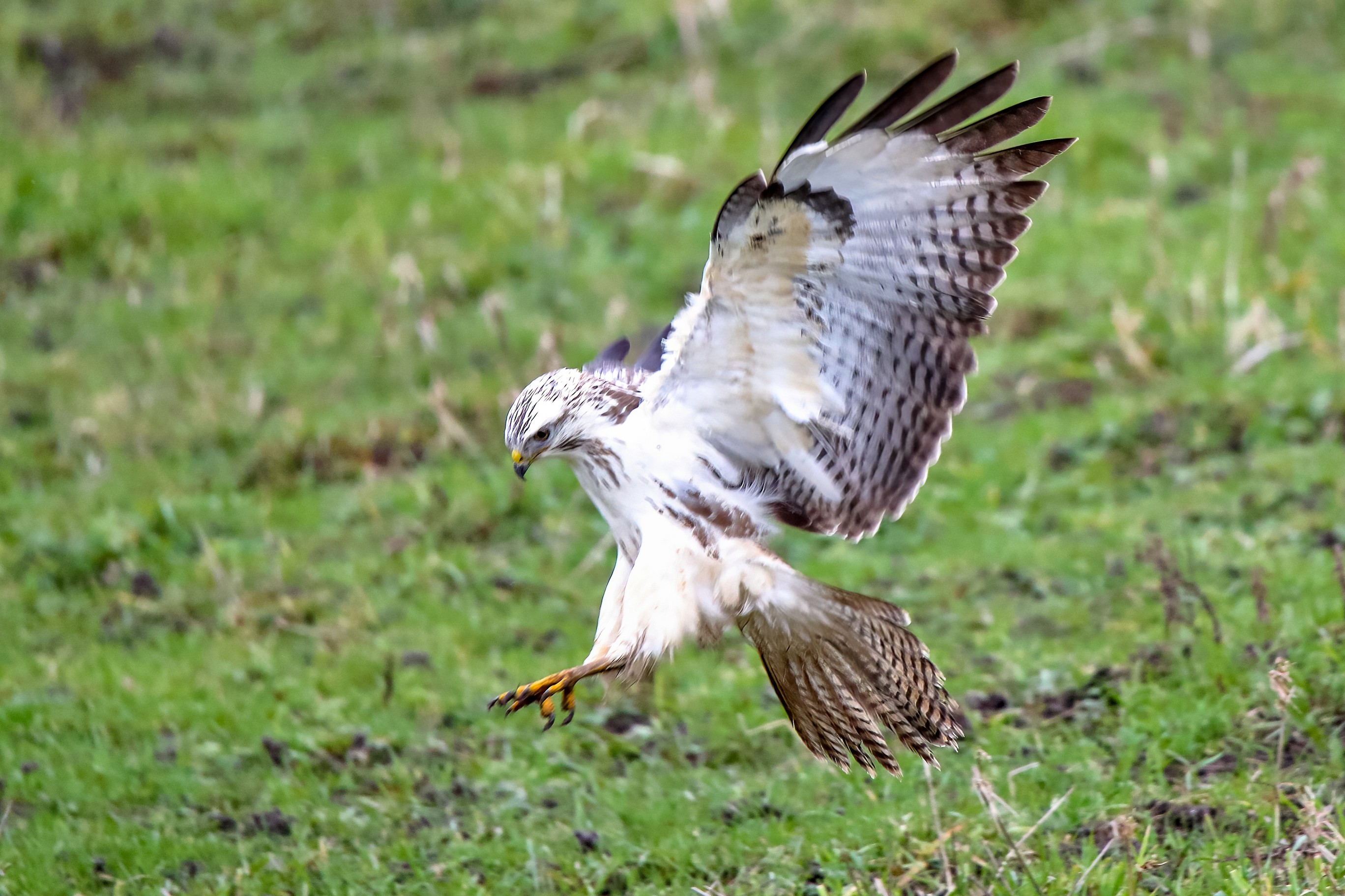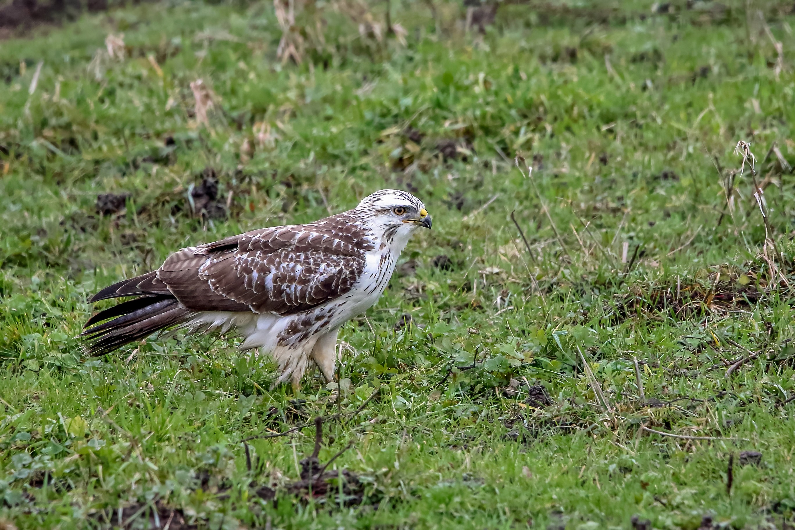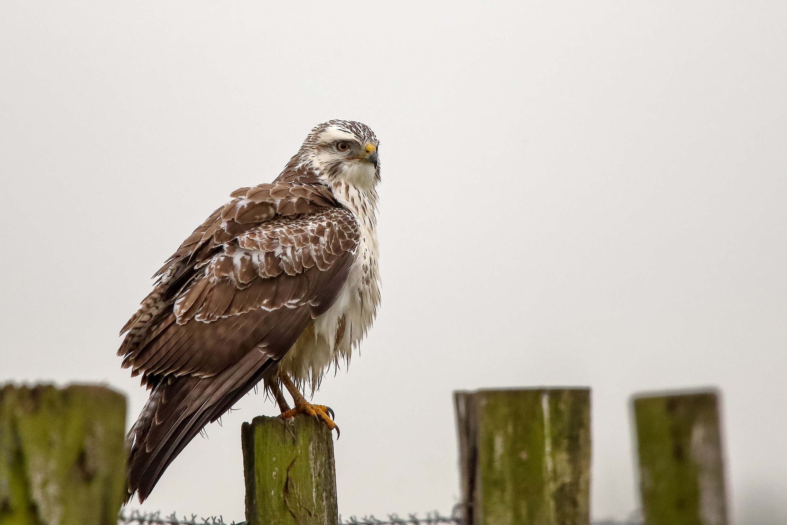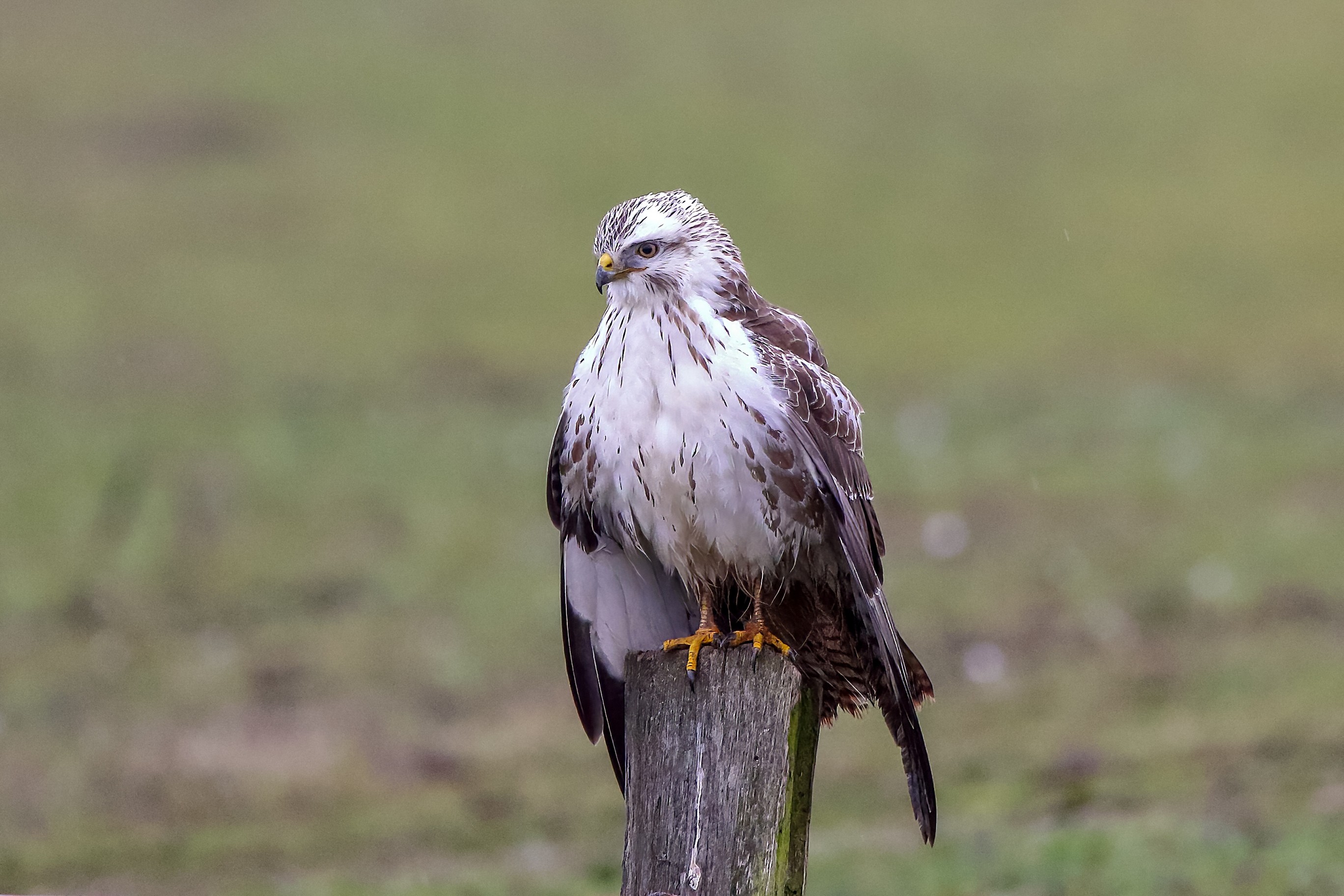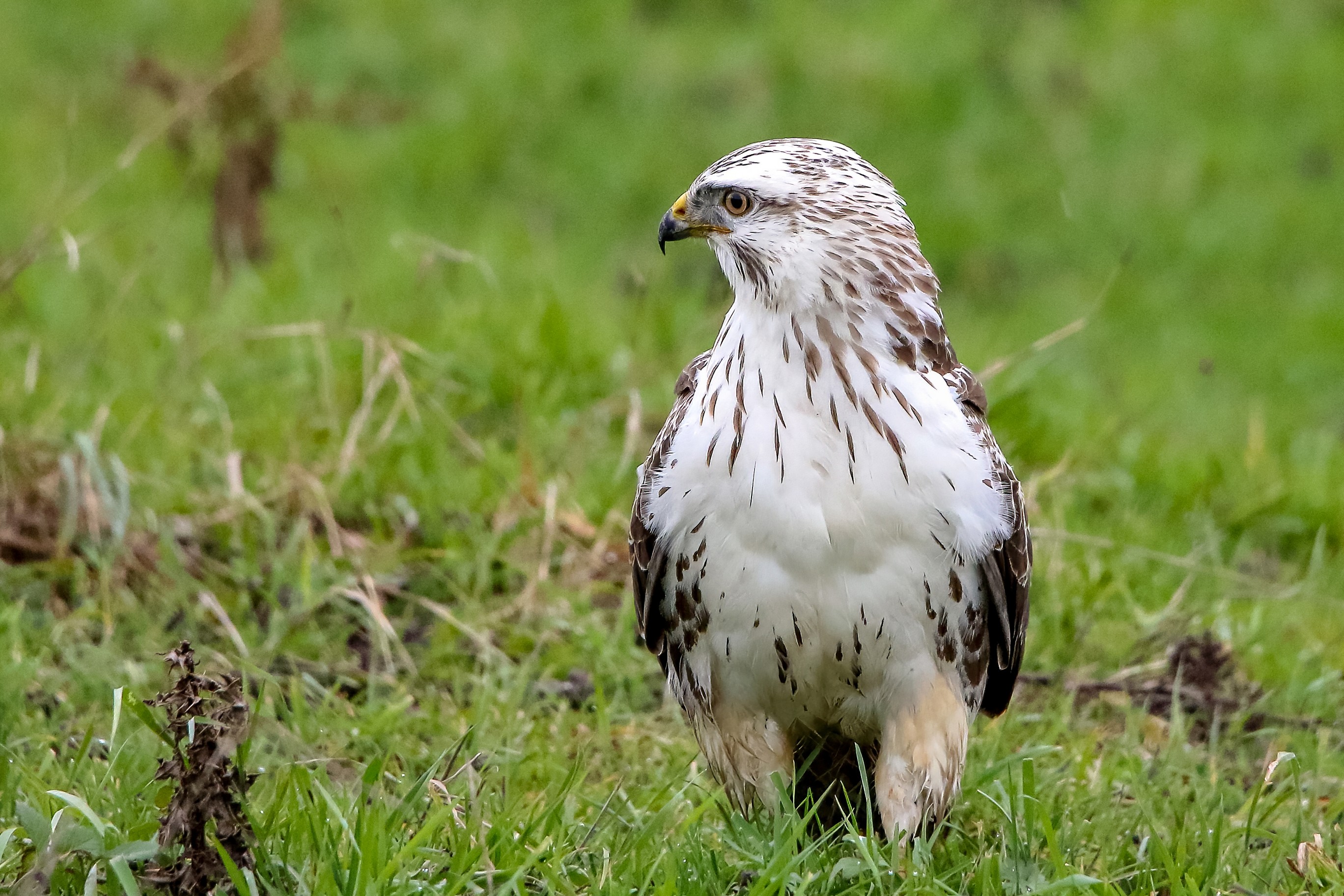 Bussarde haben sehr unterschiedliche Federkleider. Eine seltene und auffällige Farbgebung des Federkleides, wie auf diesen Aufnahmen zu sehen, nennt man helle Farbmorphe. Stets Abstand vom Fotografen einnehmend präsentiert er sich meist mit in größerer Entfernung.