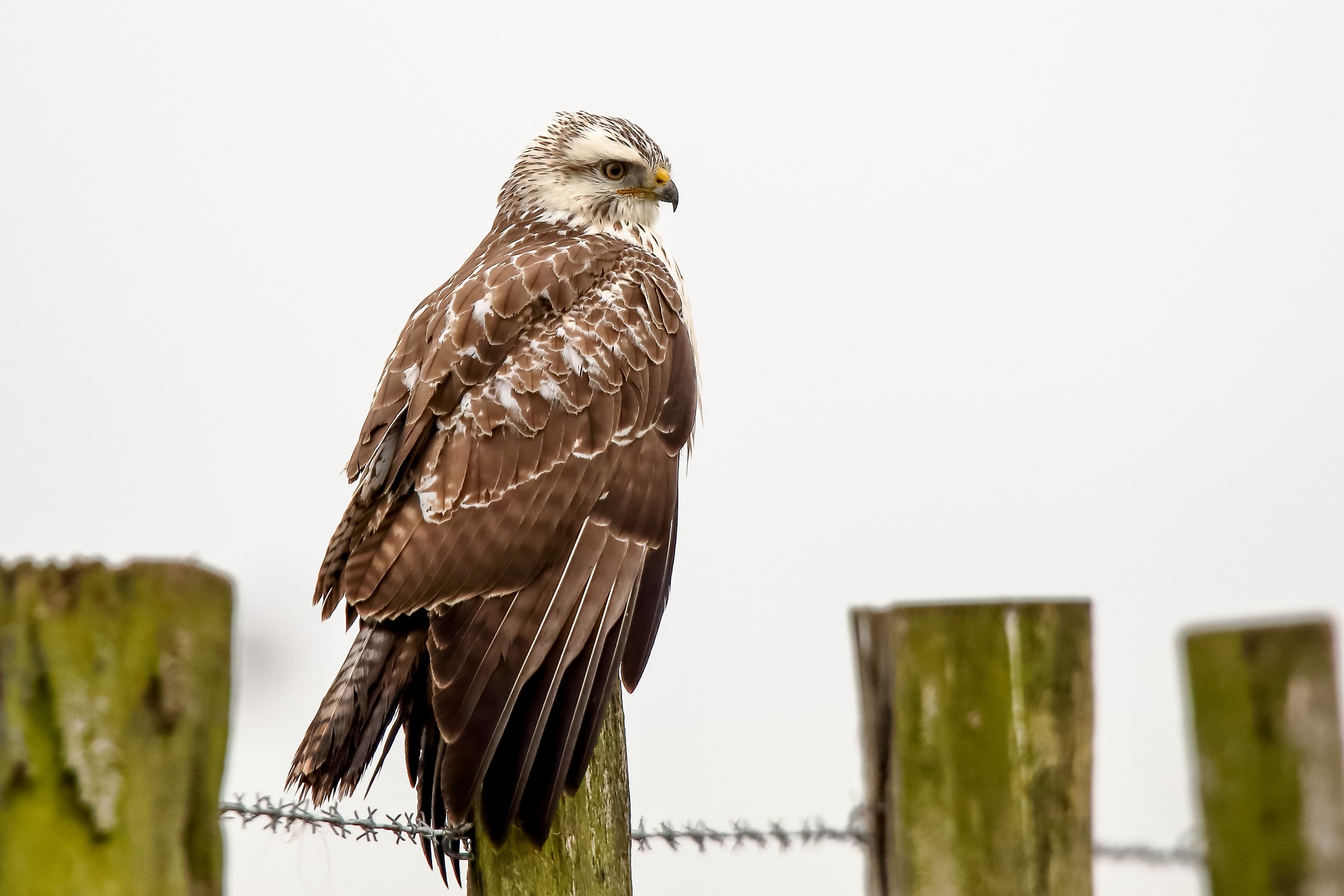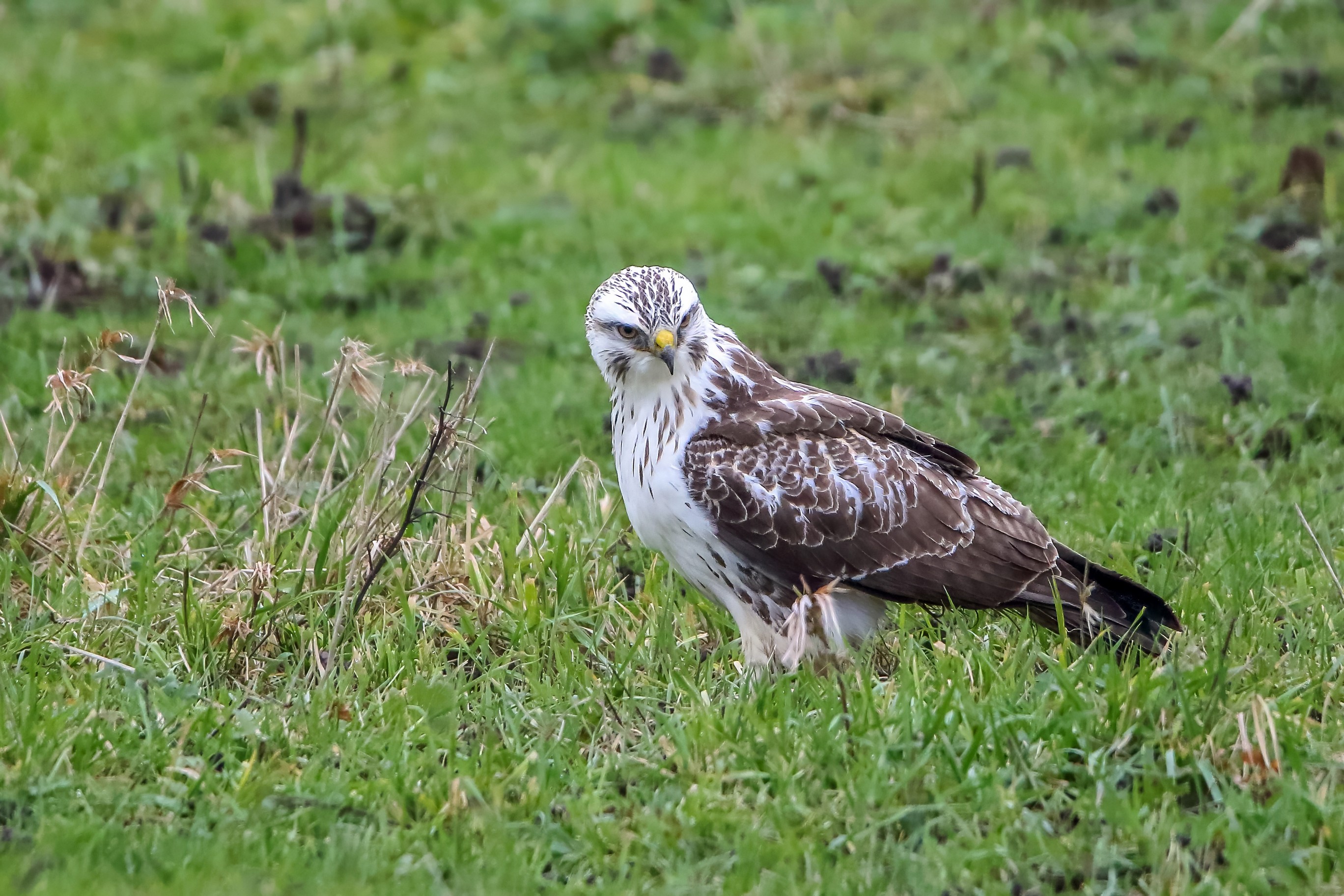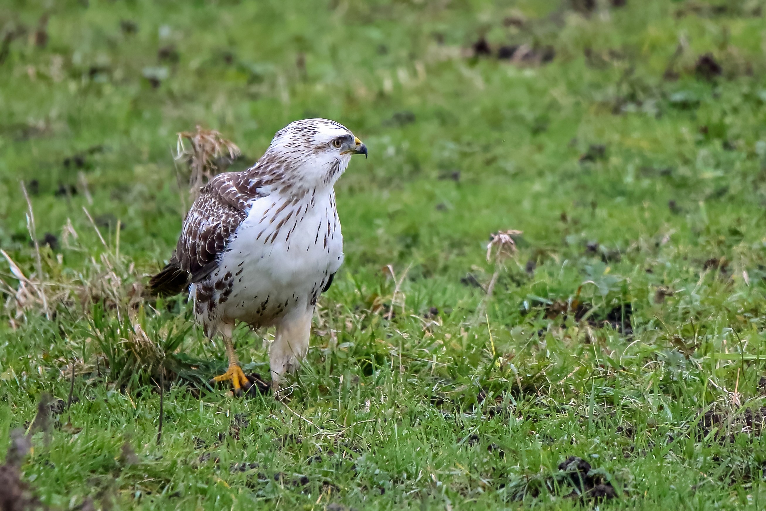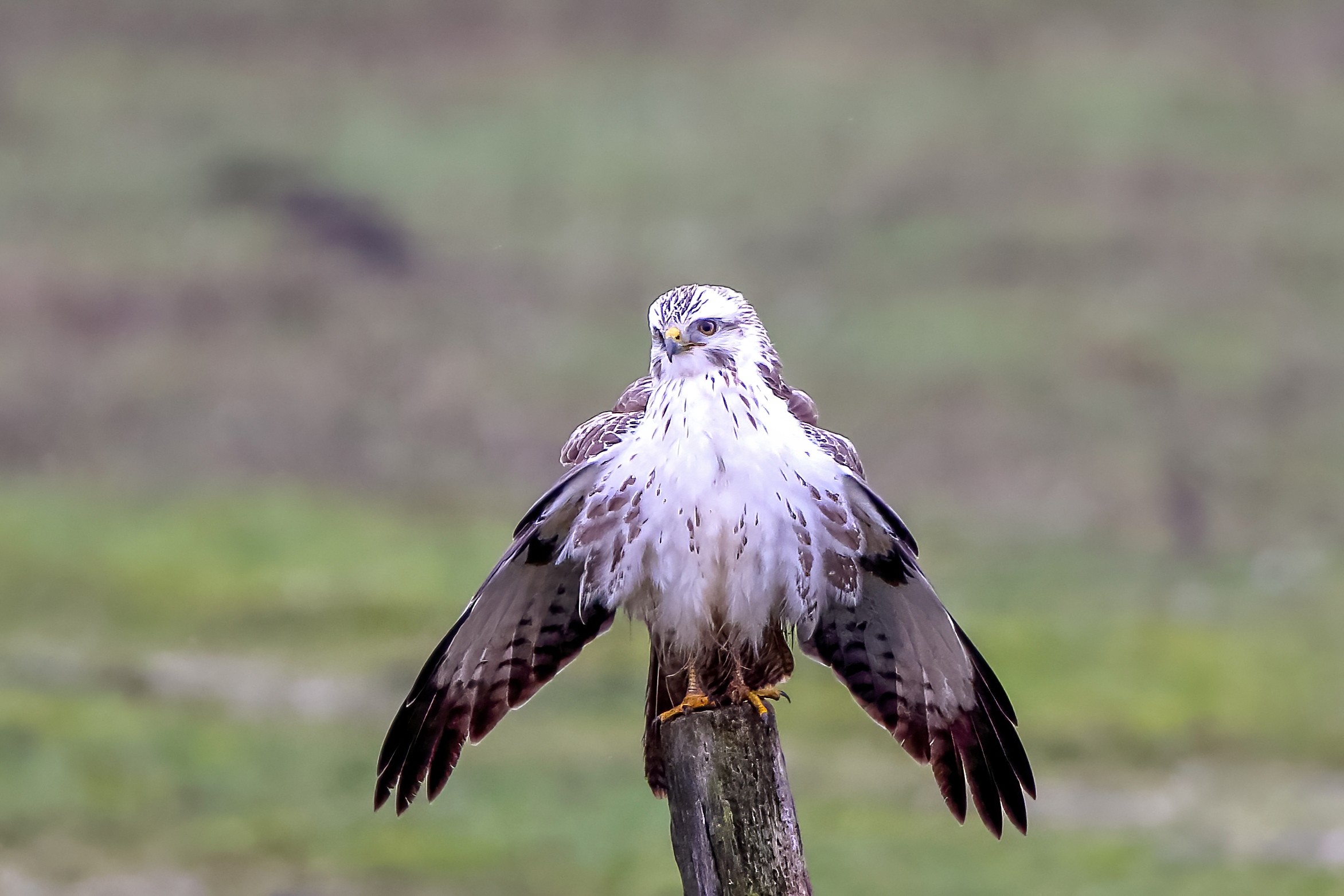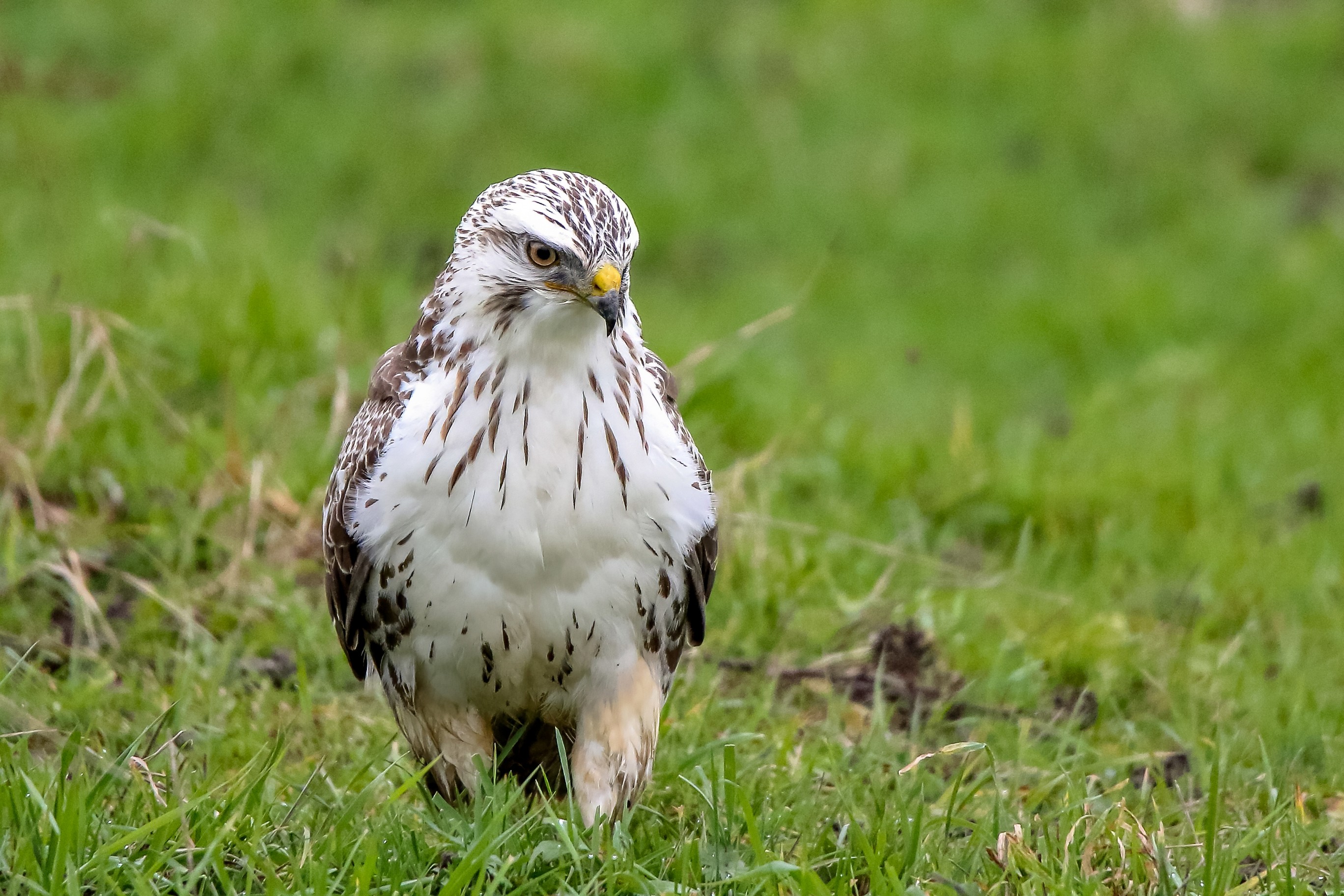 Bussarde haben sehr unterschiedliche Federkleider. Eine seltene und auffällige Farbgebung des Federkleides, wie auf diesen Aufnahmen zu sehen, nennt man helle Farbmorphe. Stets Abstand vom Fotografen einnehmend präsentiert er sich meist mit in größerer Entfernung.