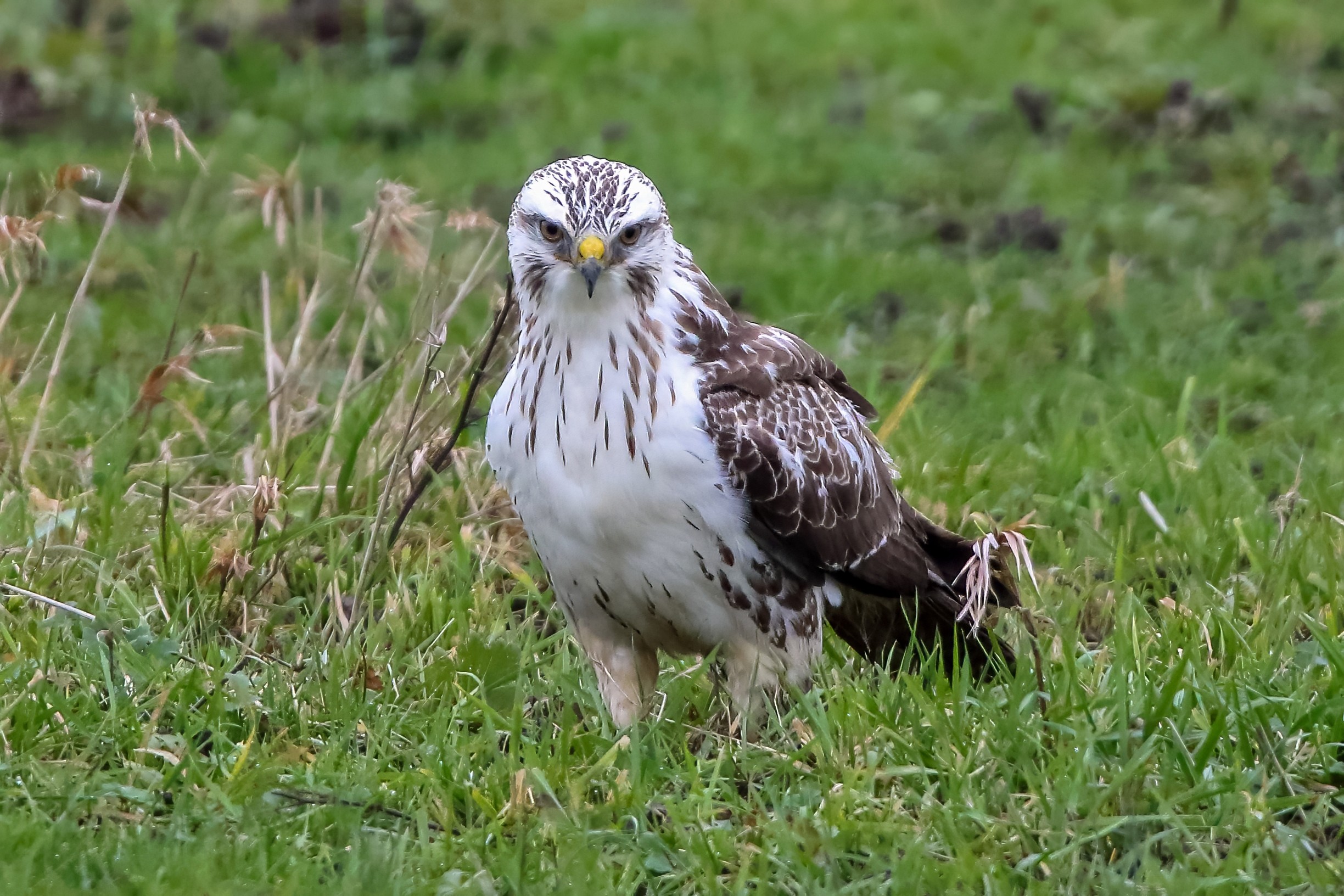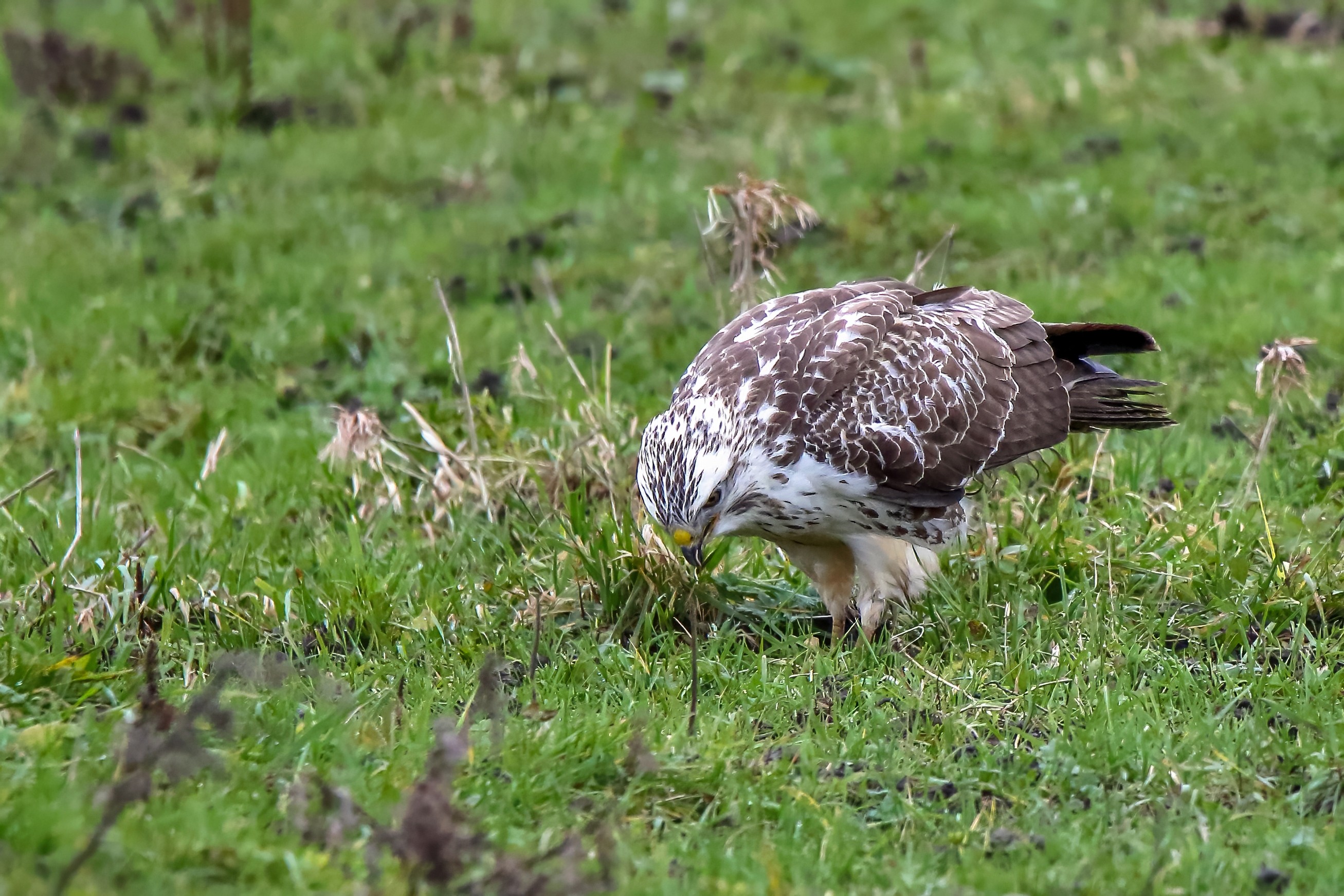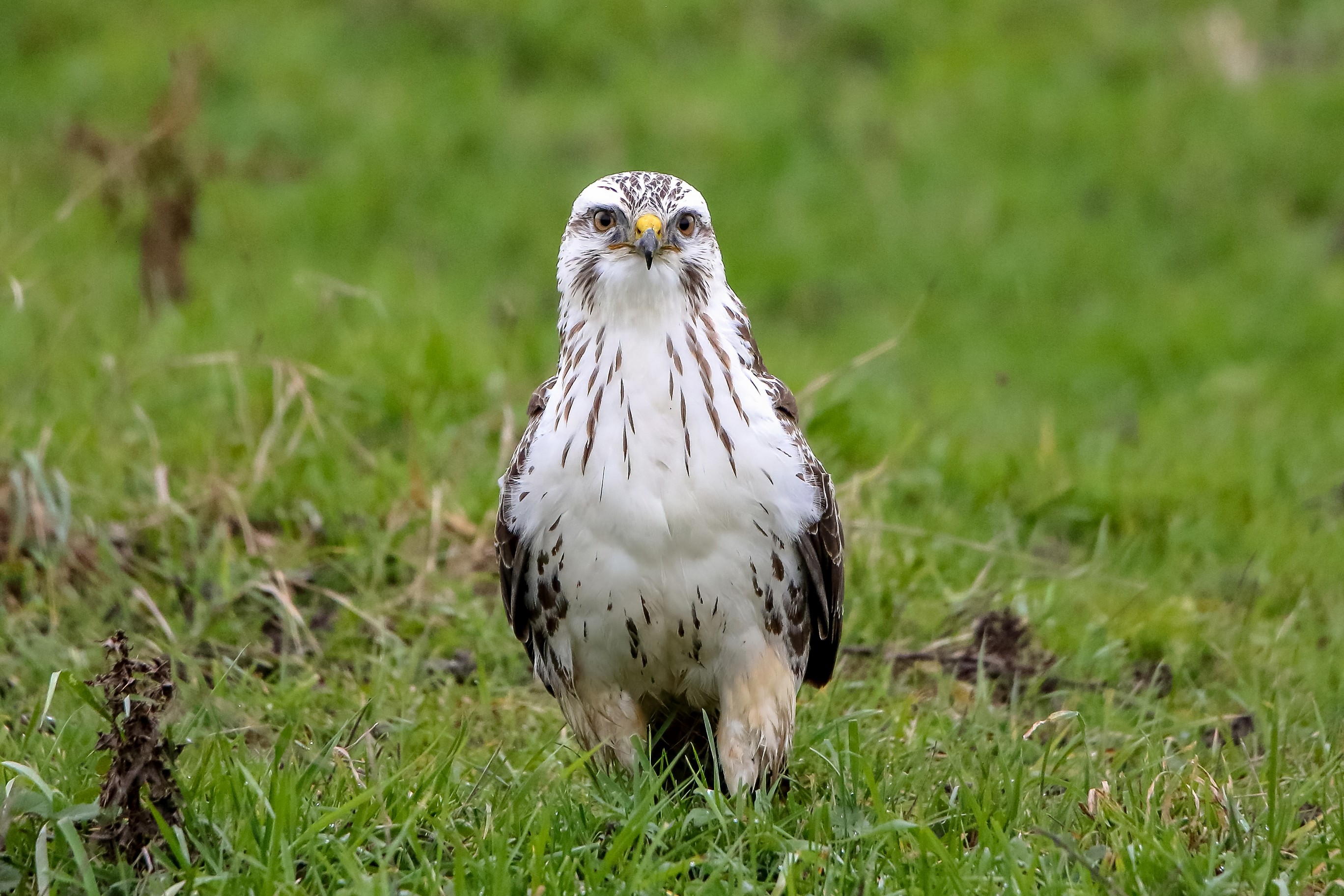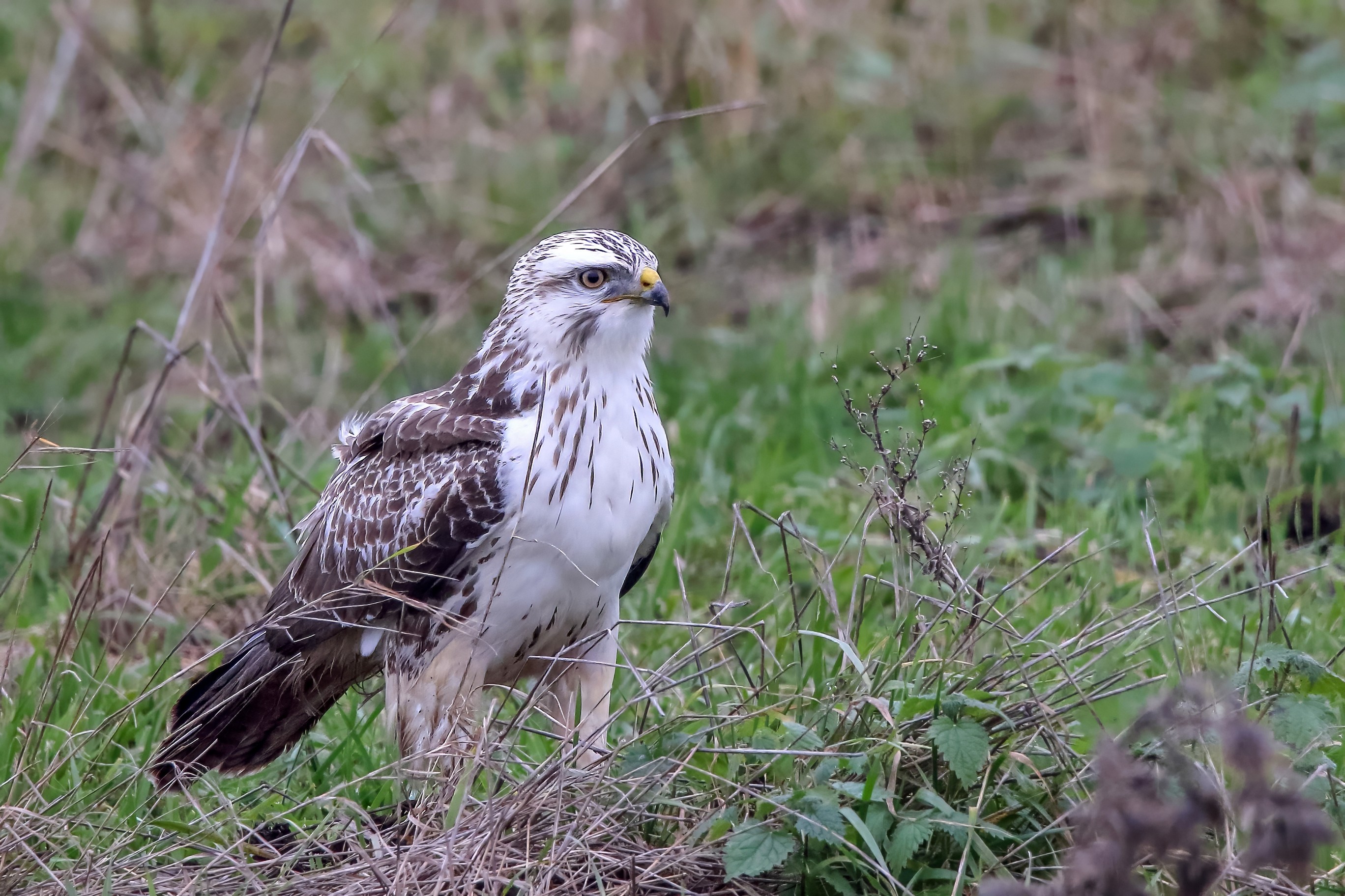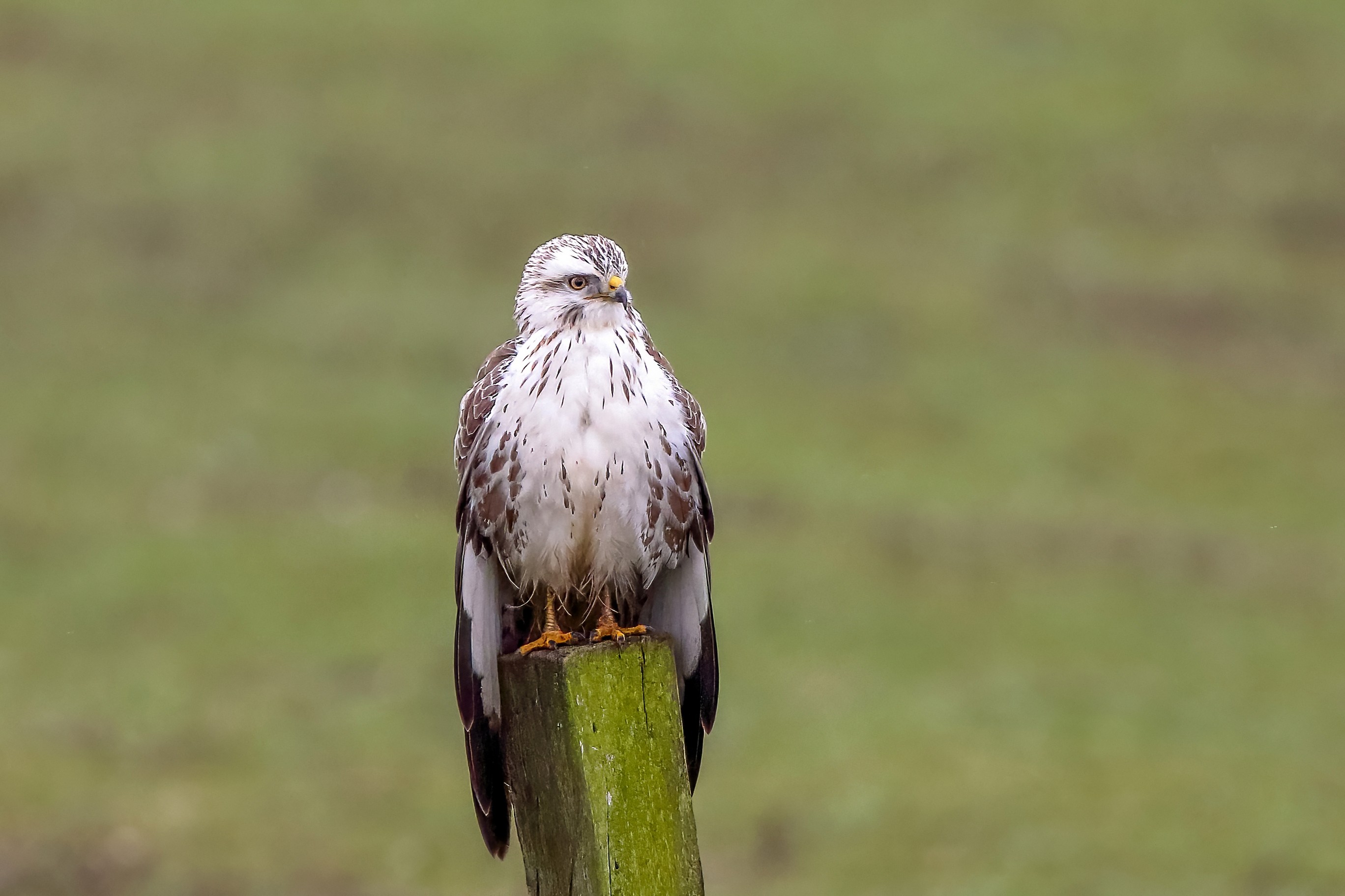 Bussarde haben sehr unterschiedliche Federkleider. Eine seltene und auffällige Farbgebung des Federkleides, wie auf diesen Aufnahmen zu sehen, nennt man helle Farbmorphe. Stets Abstand vom Fotografen einnehmend präsentiert er sich meist mit in größerer Entfernung.