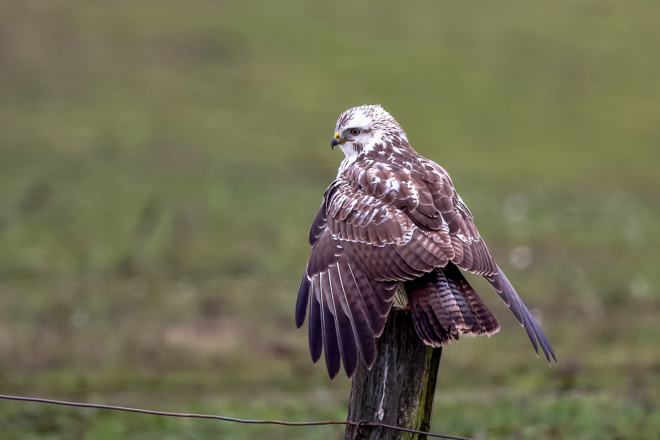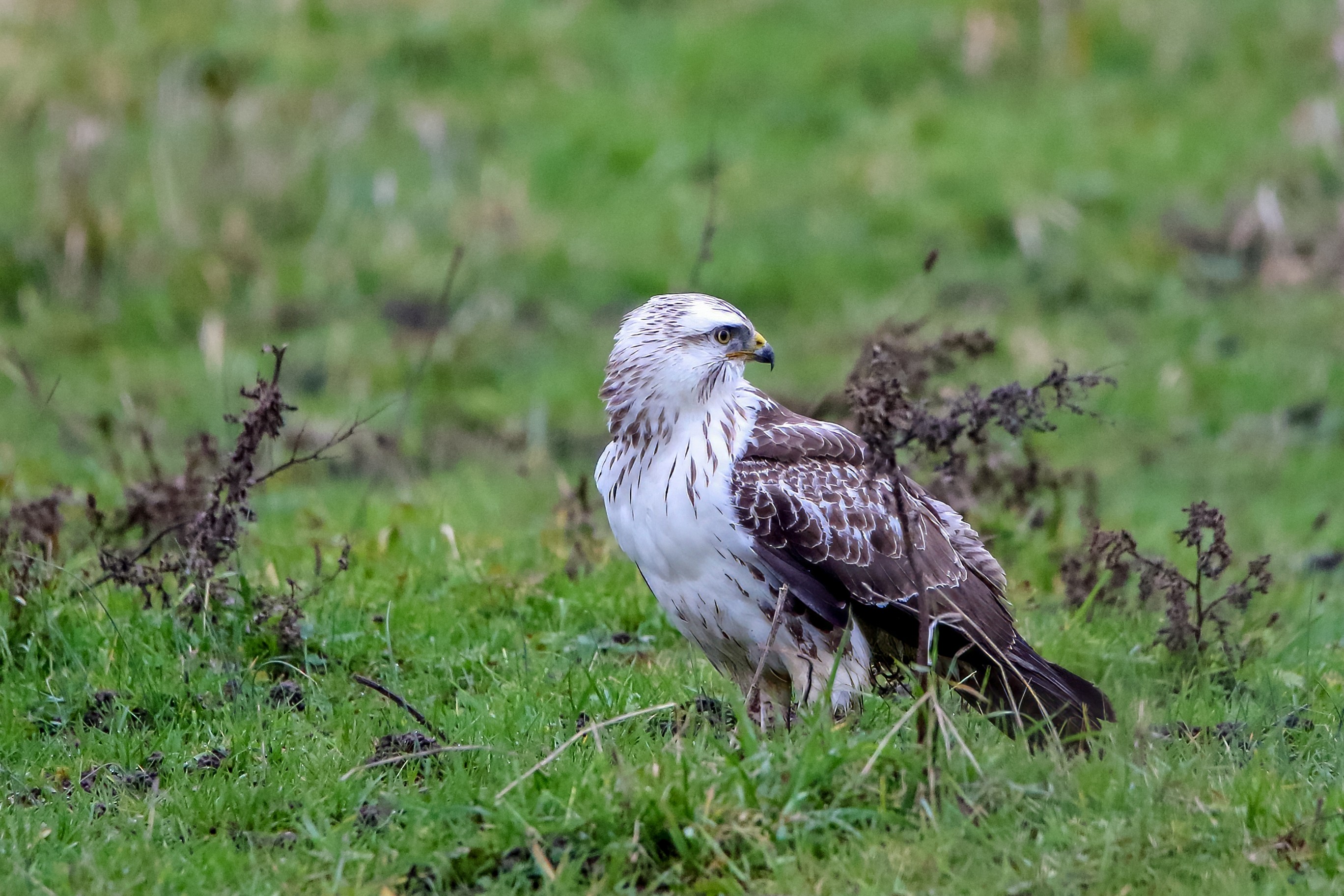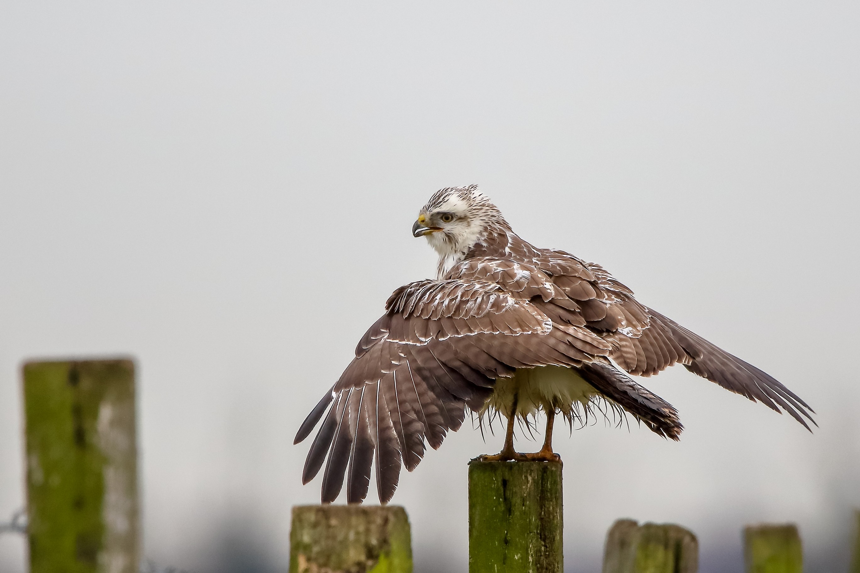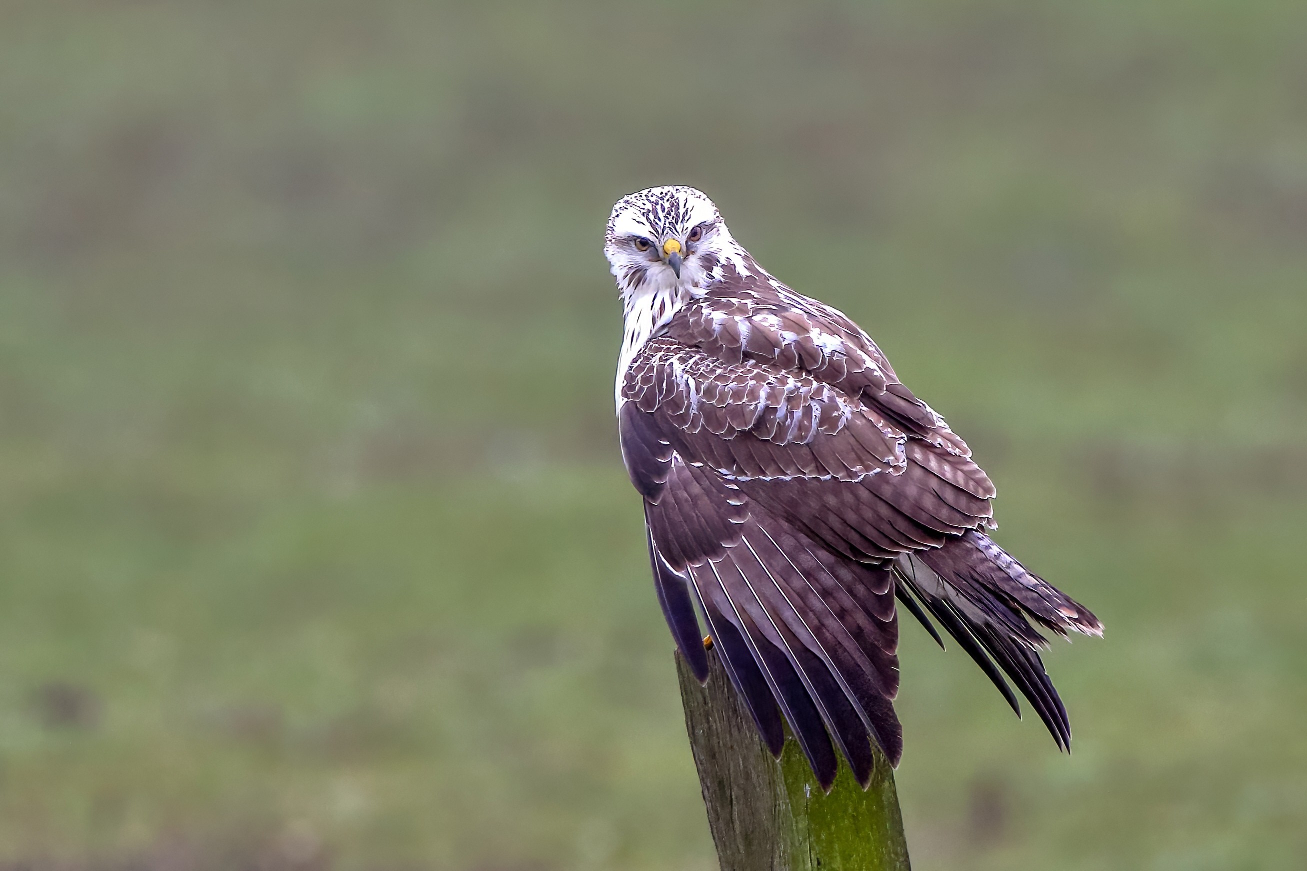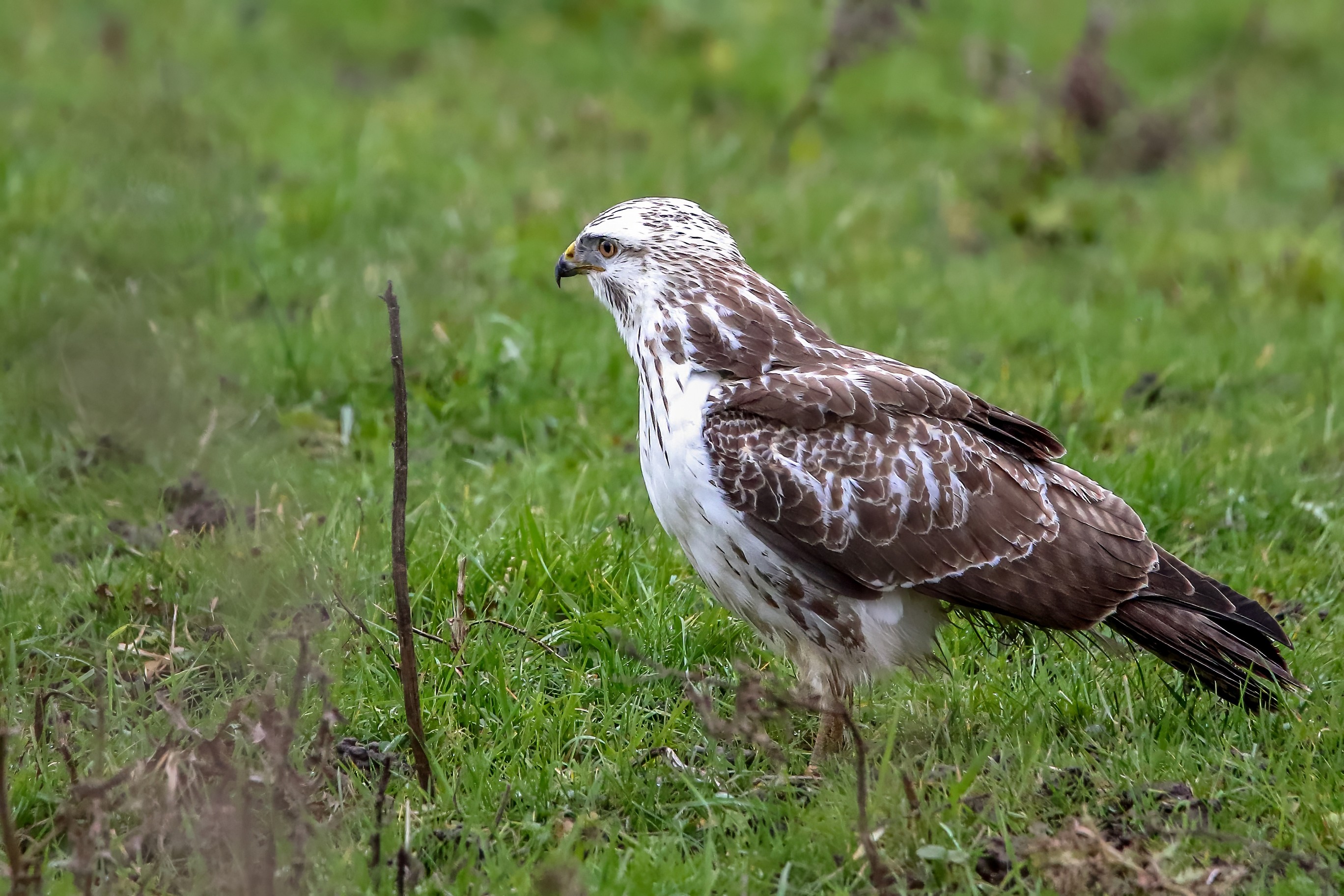 Bussarde haben sehr unterschiedliche Federkleider. Eine seltene und auffällige Farbgebung des Federkleides, wie auf diesen Aufnahmen zu sehen, nennt man helle Farbmorphe. Stets Abstand vom Fotografen einnehmend präsentiert er sich meist mit in größerer Entfernung.