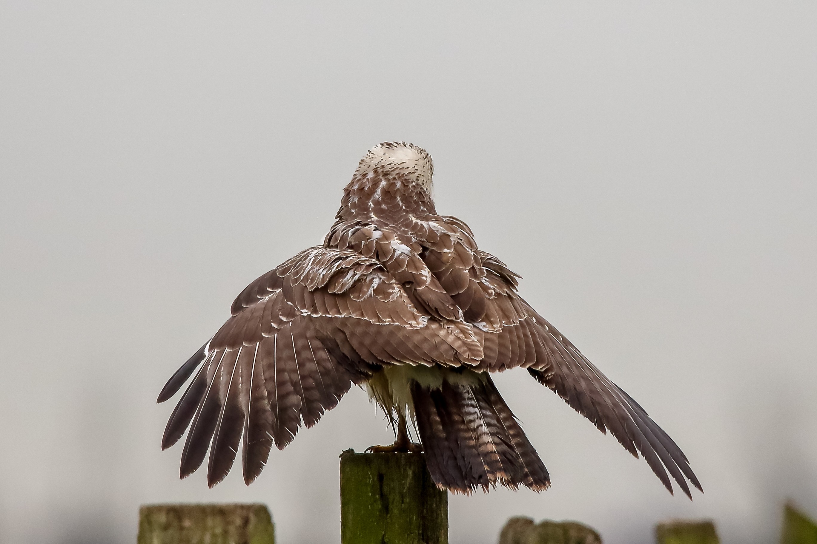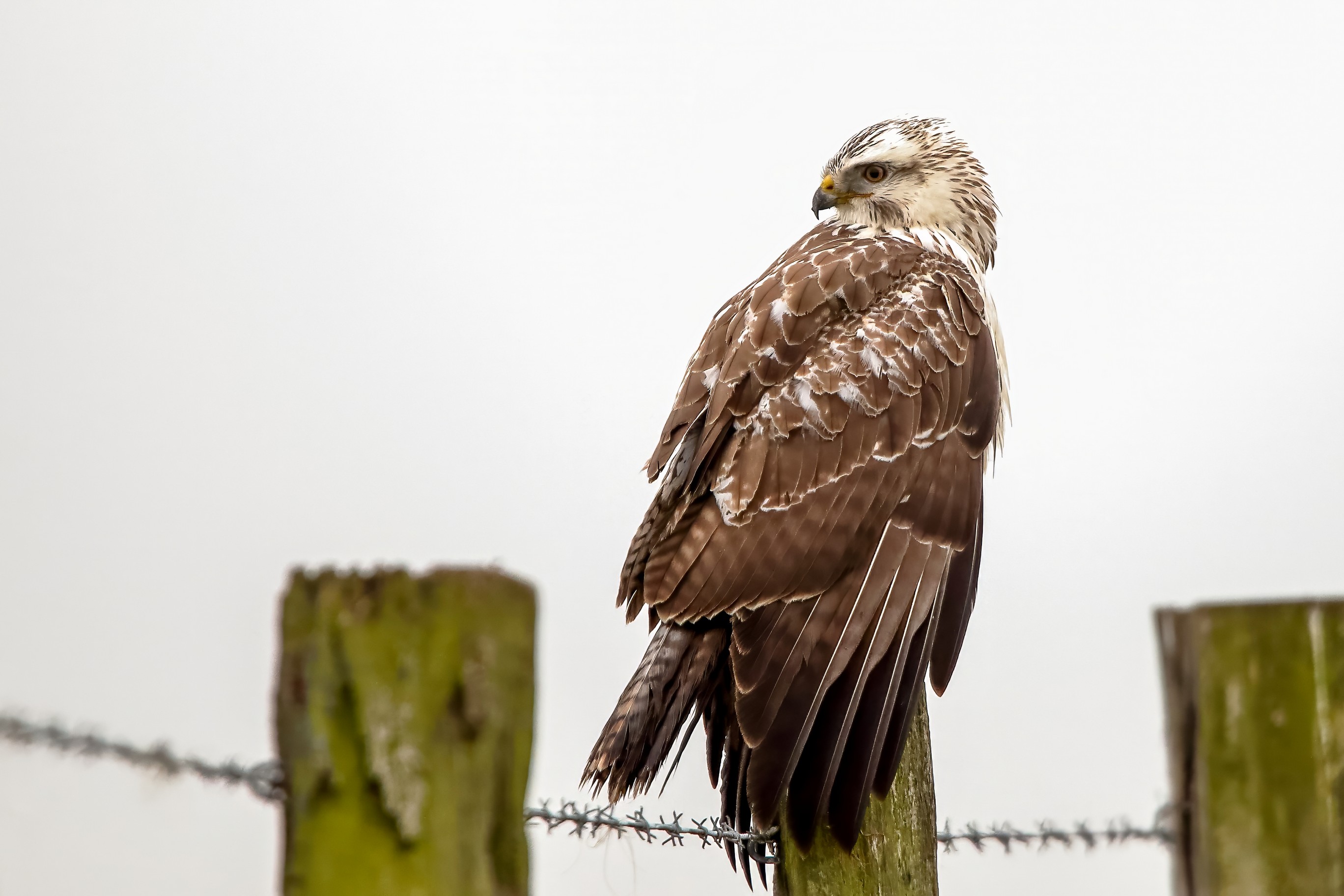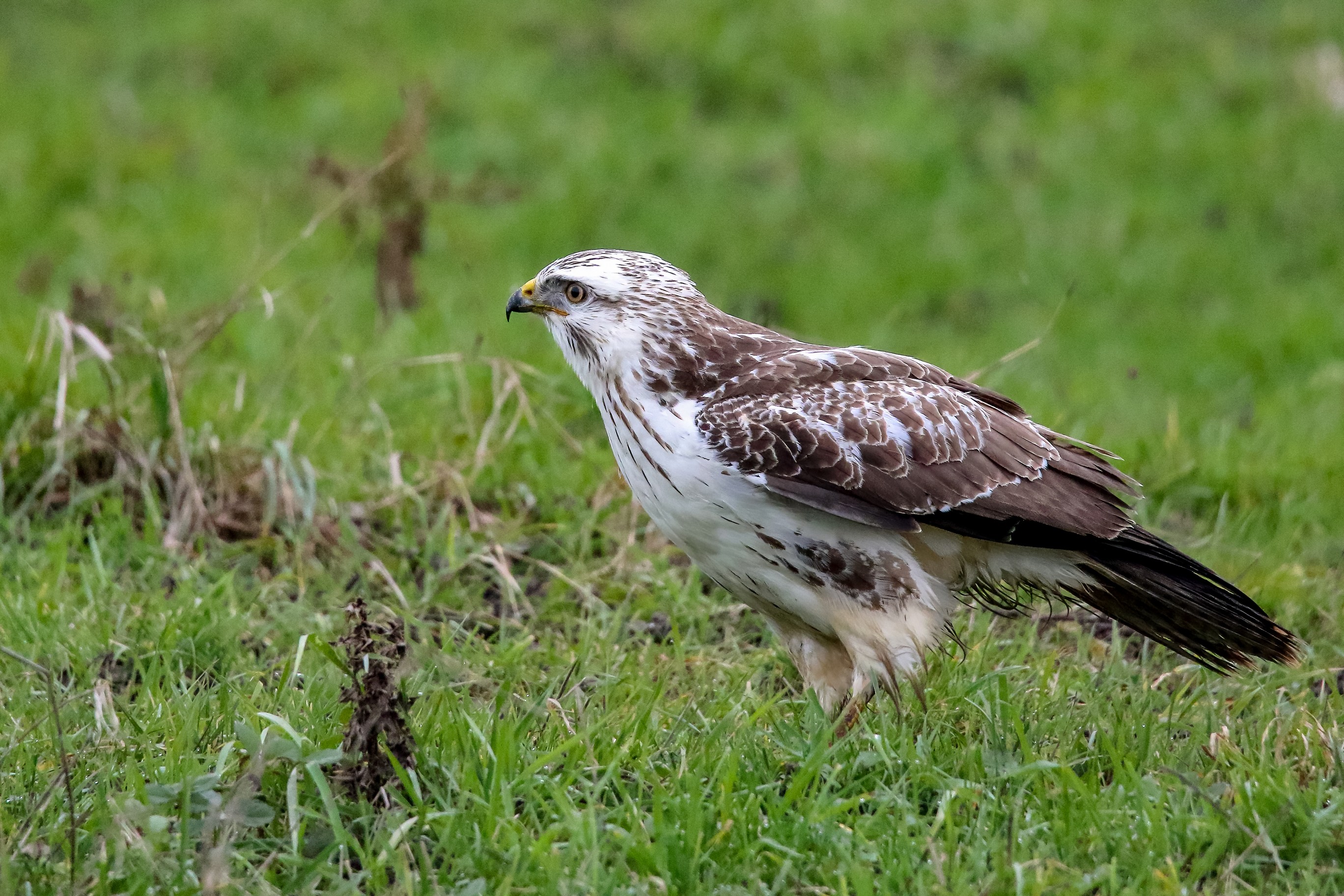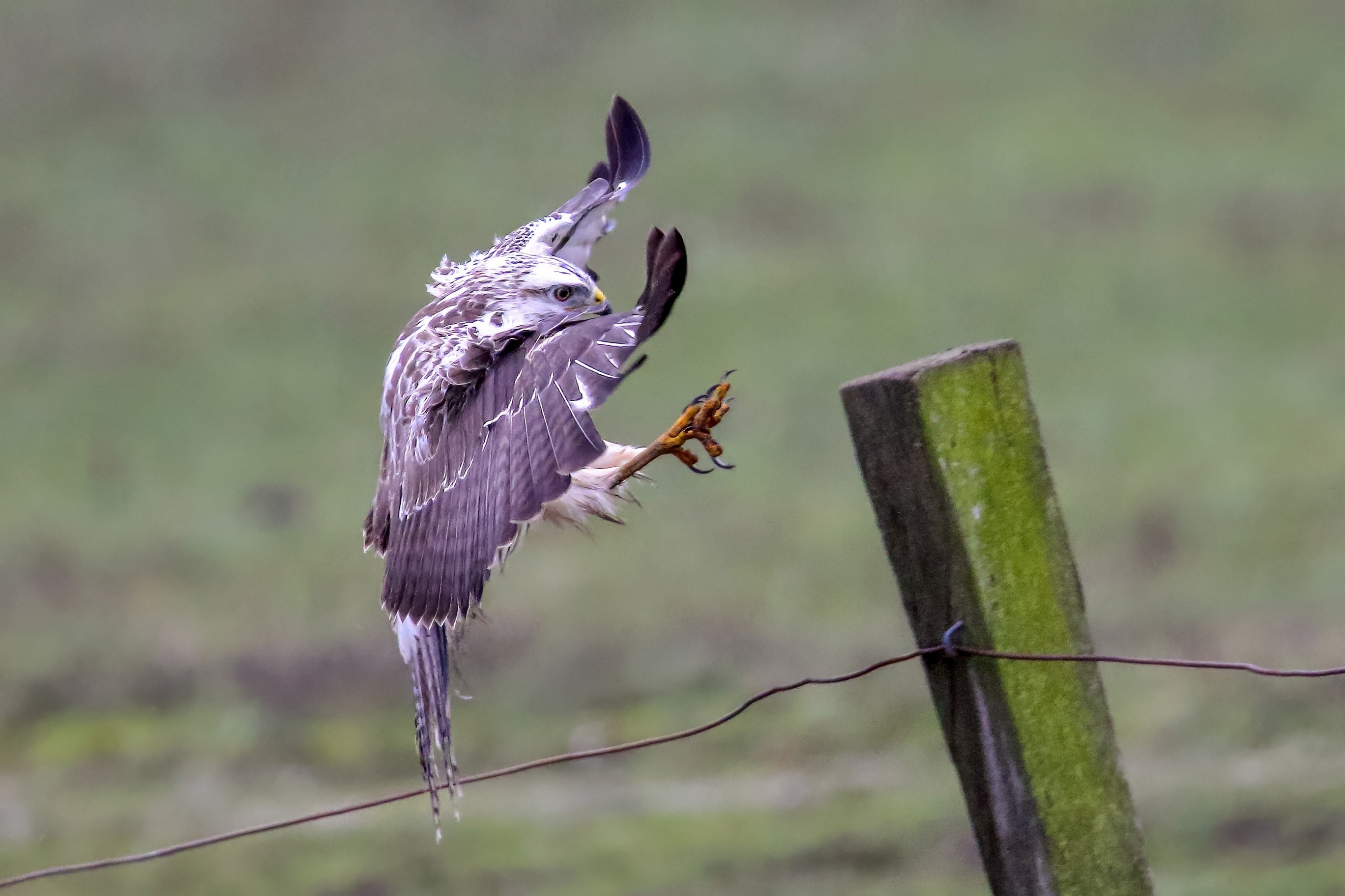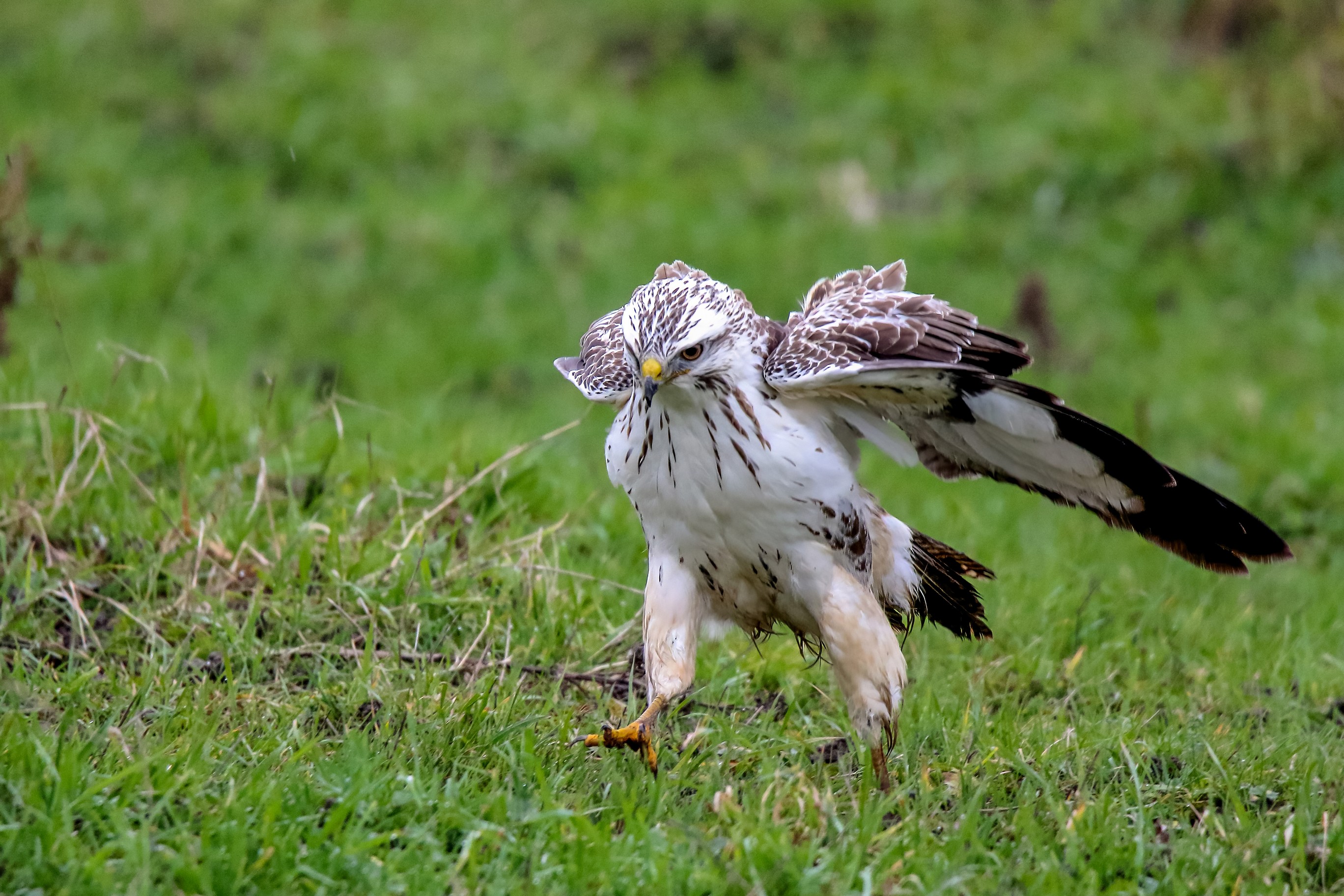 Bussarde haben sehr unterschiedliche Federkleider. Eine seltene und auffällige Farbgebung des Federkleides, wie auf diesen Aufnahmen zu sehen, nennt man helle Farbmorphe. Stets Abstand vom Fotografen einnehmend präsentiert er sich meist mit in größerer Entfernung.