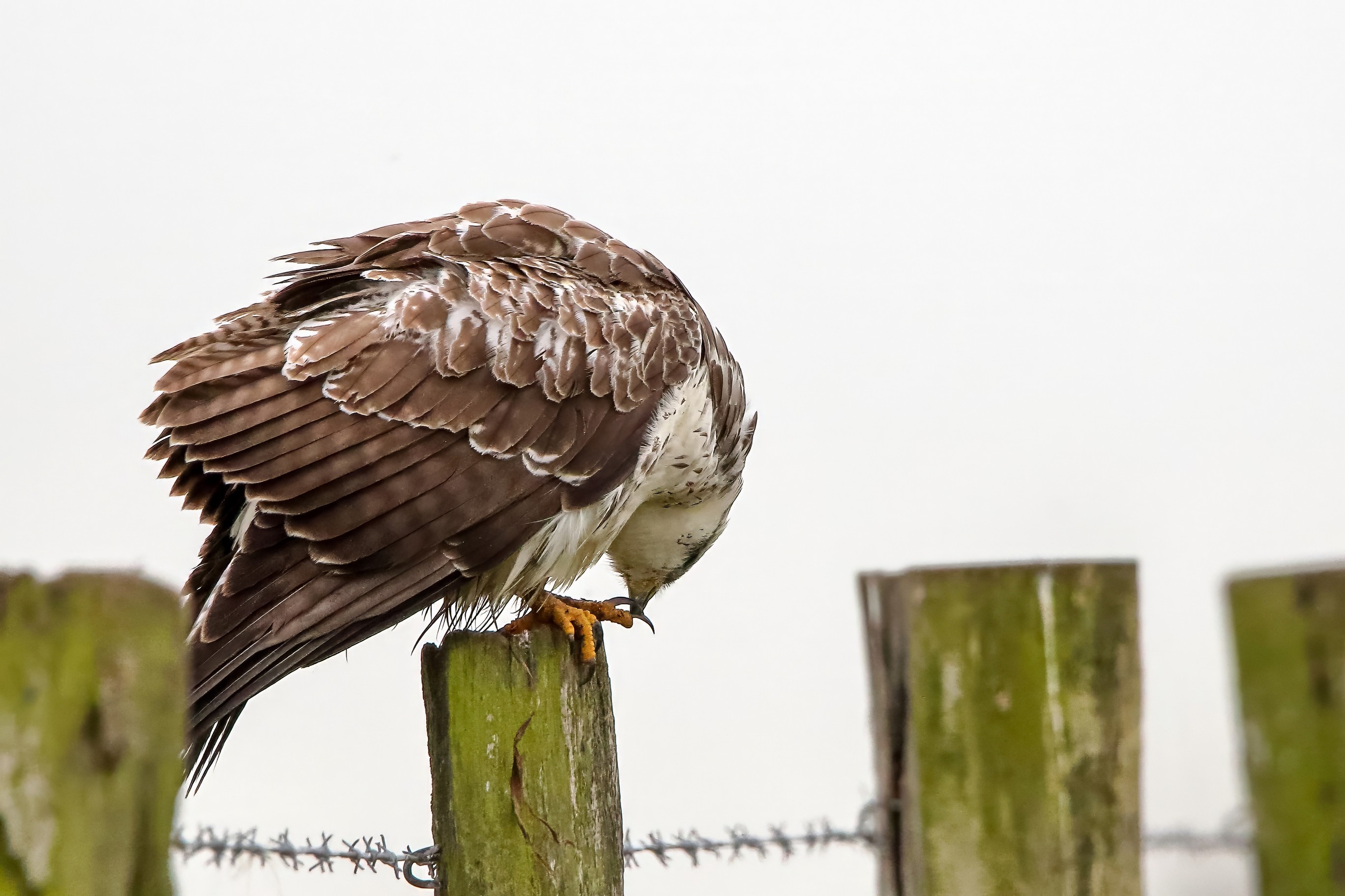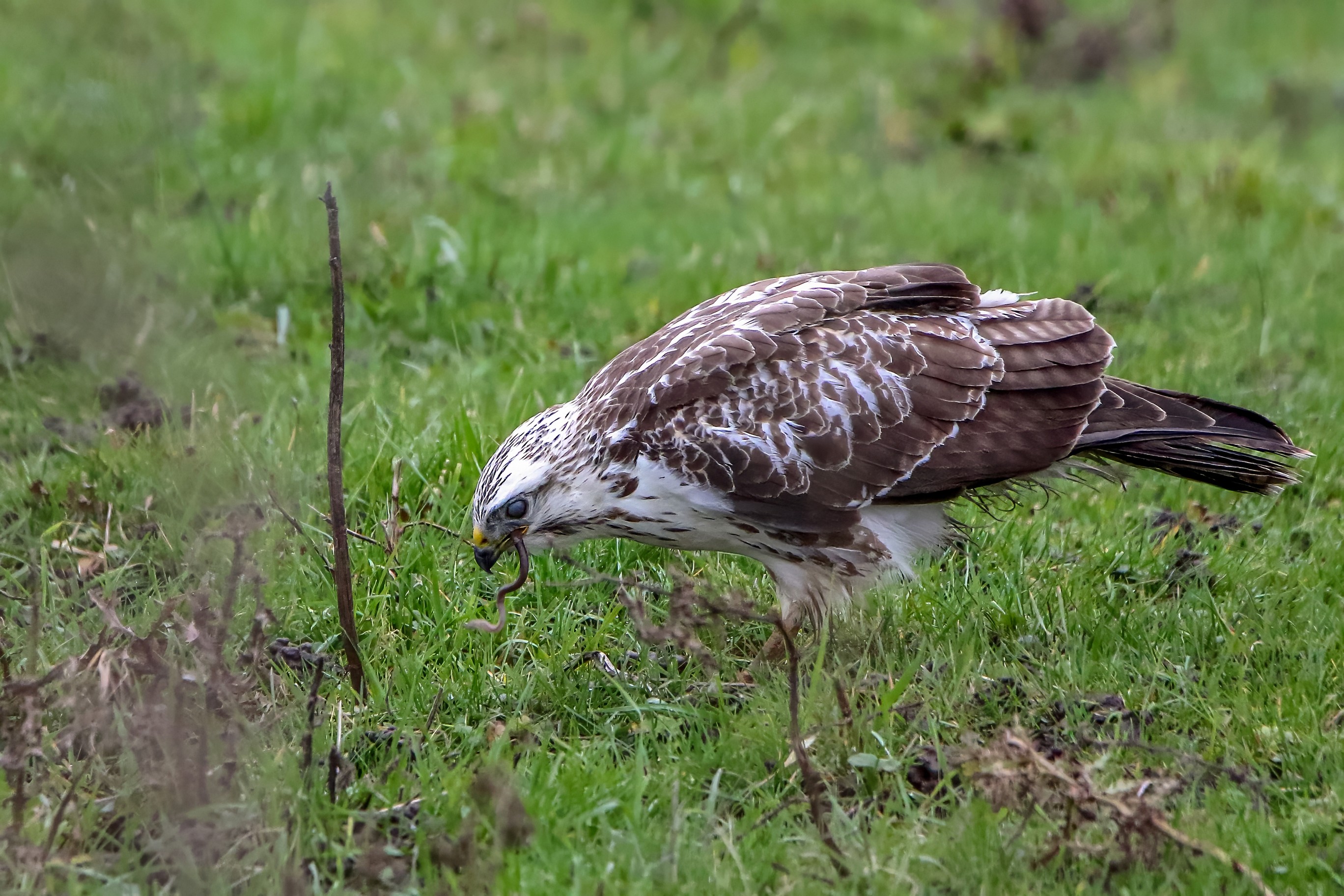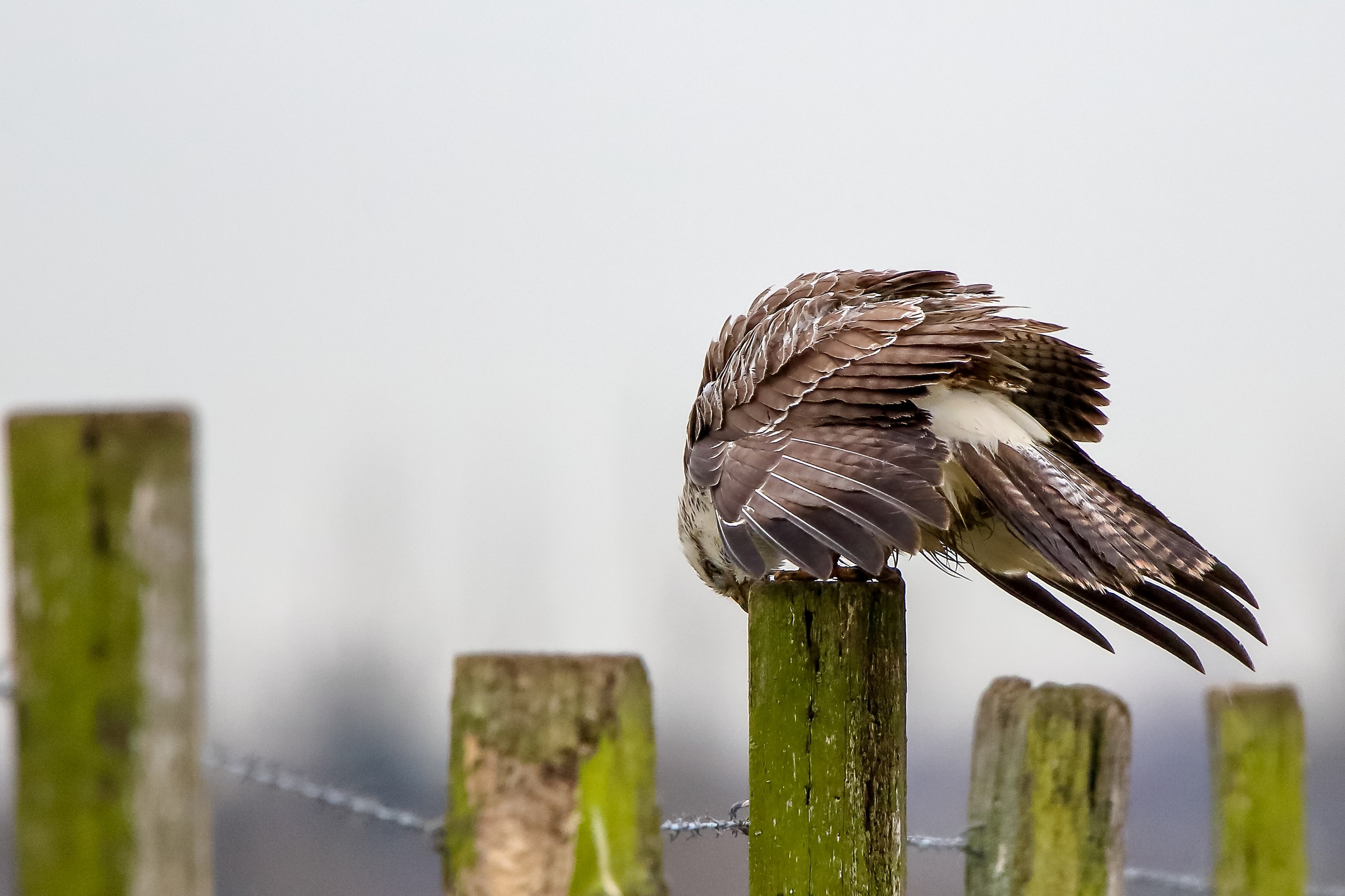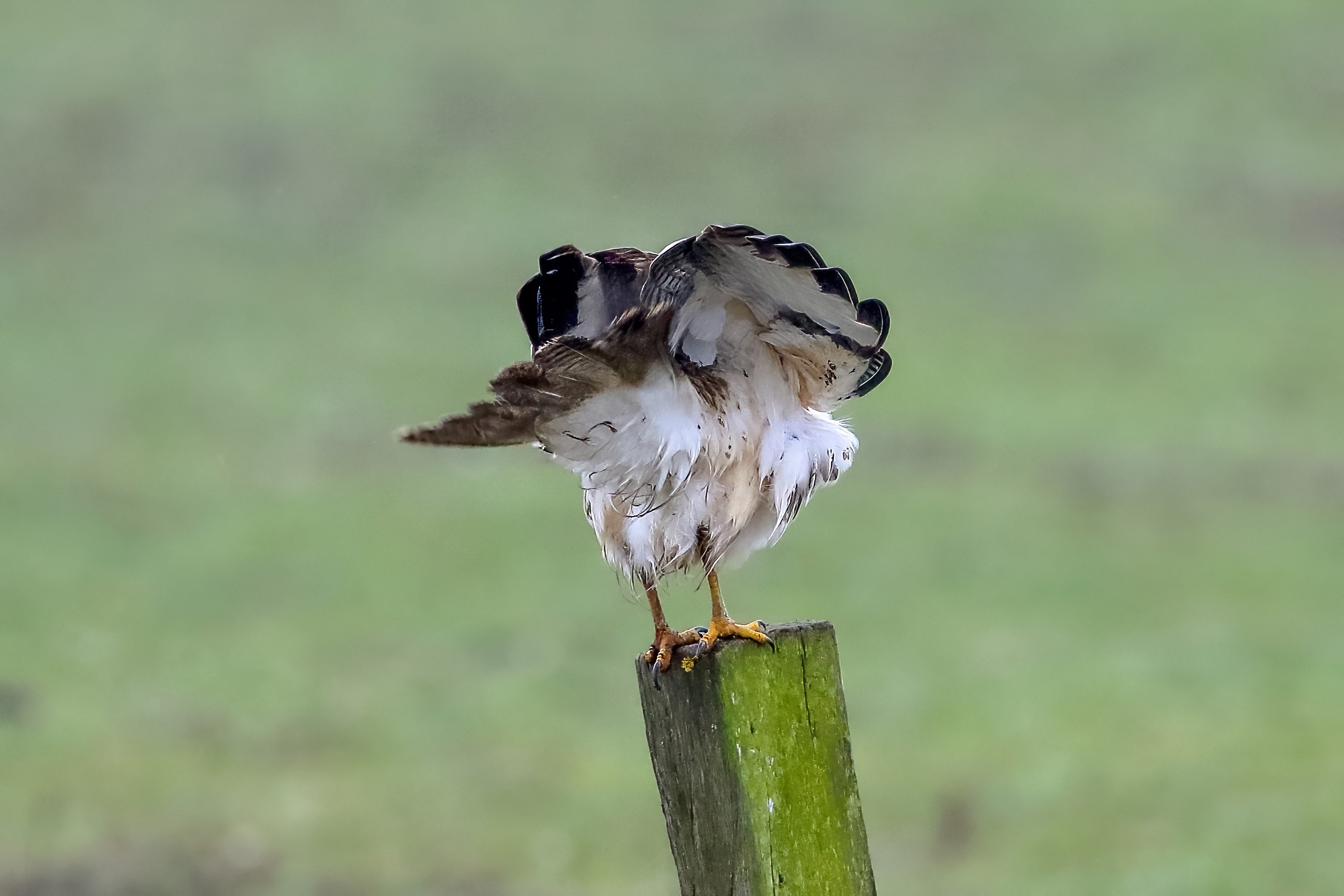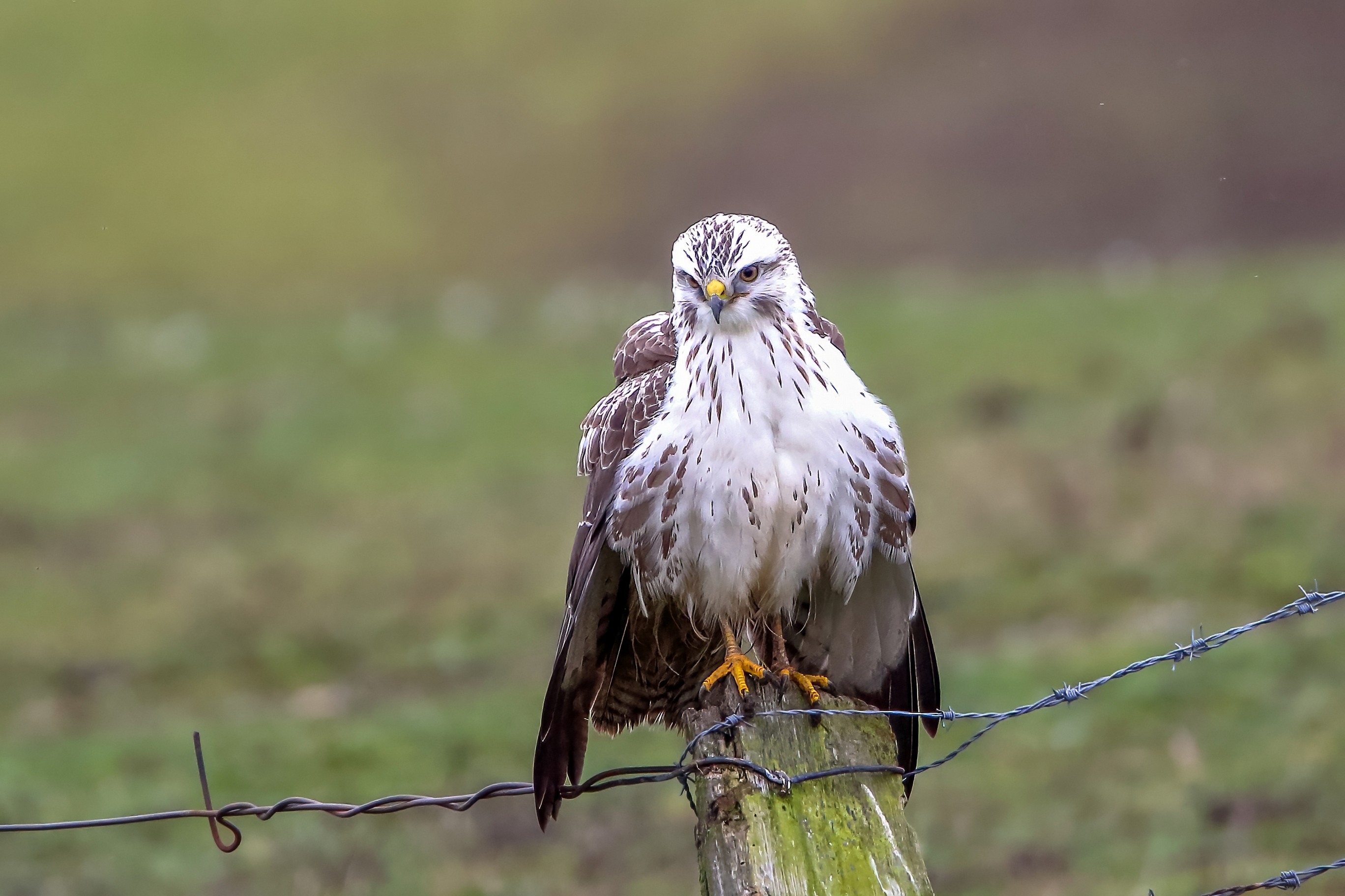 Bussarde haben sehr unterschiedliche Federkleider. Eine seltene und auffällige Farbgebung des Federkleides, wie auf diesen Aufnahmen zu sehen, nennt man helle Farbmorphe. Stets Abstand vom Fotografen einnehmend präsentiert er sich meist mit in größerer Entfernung.