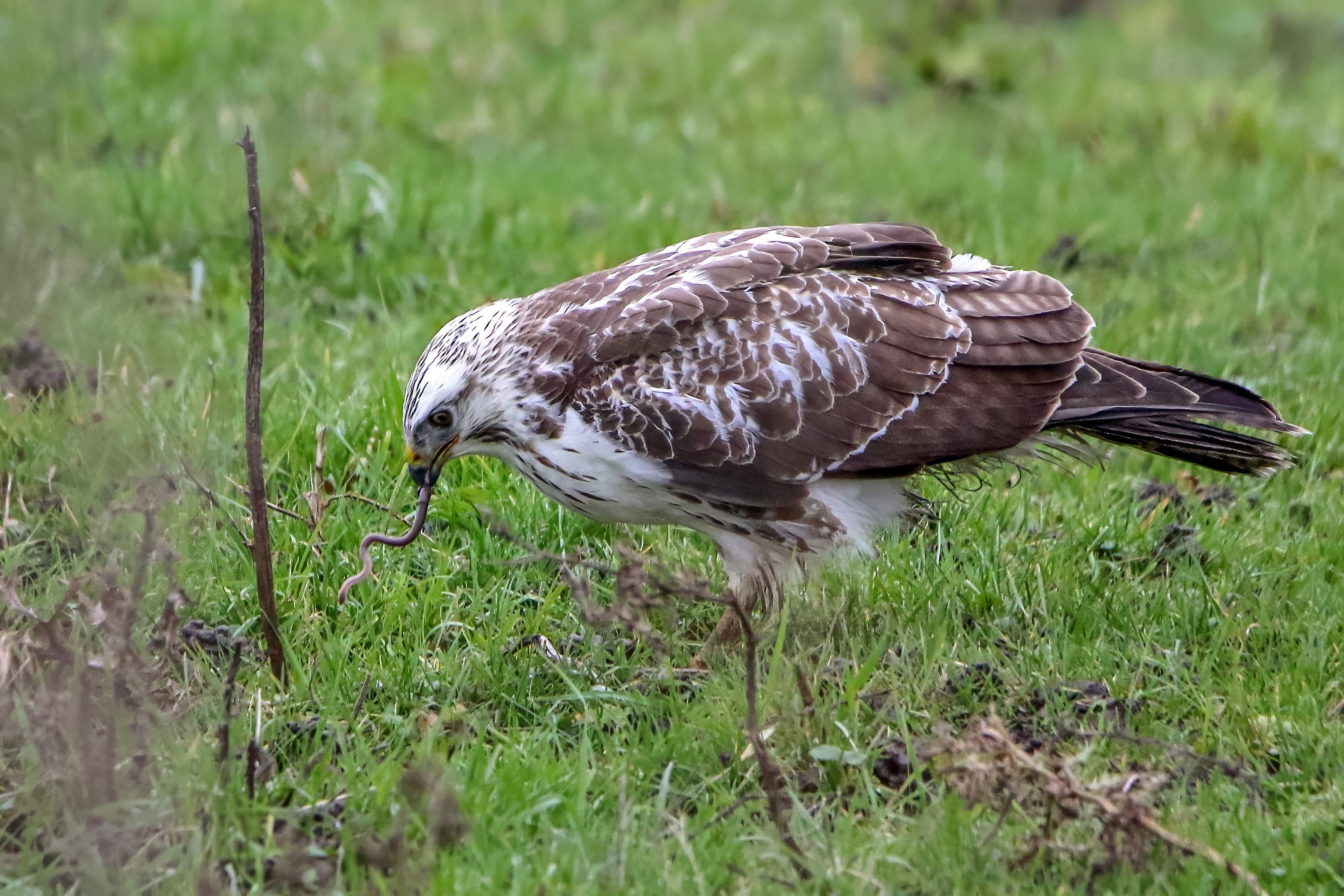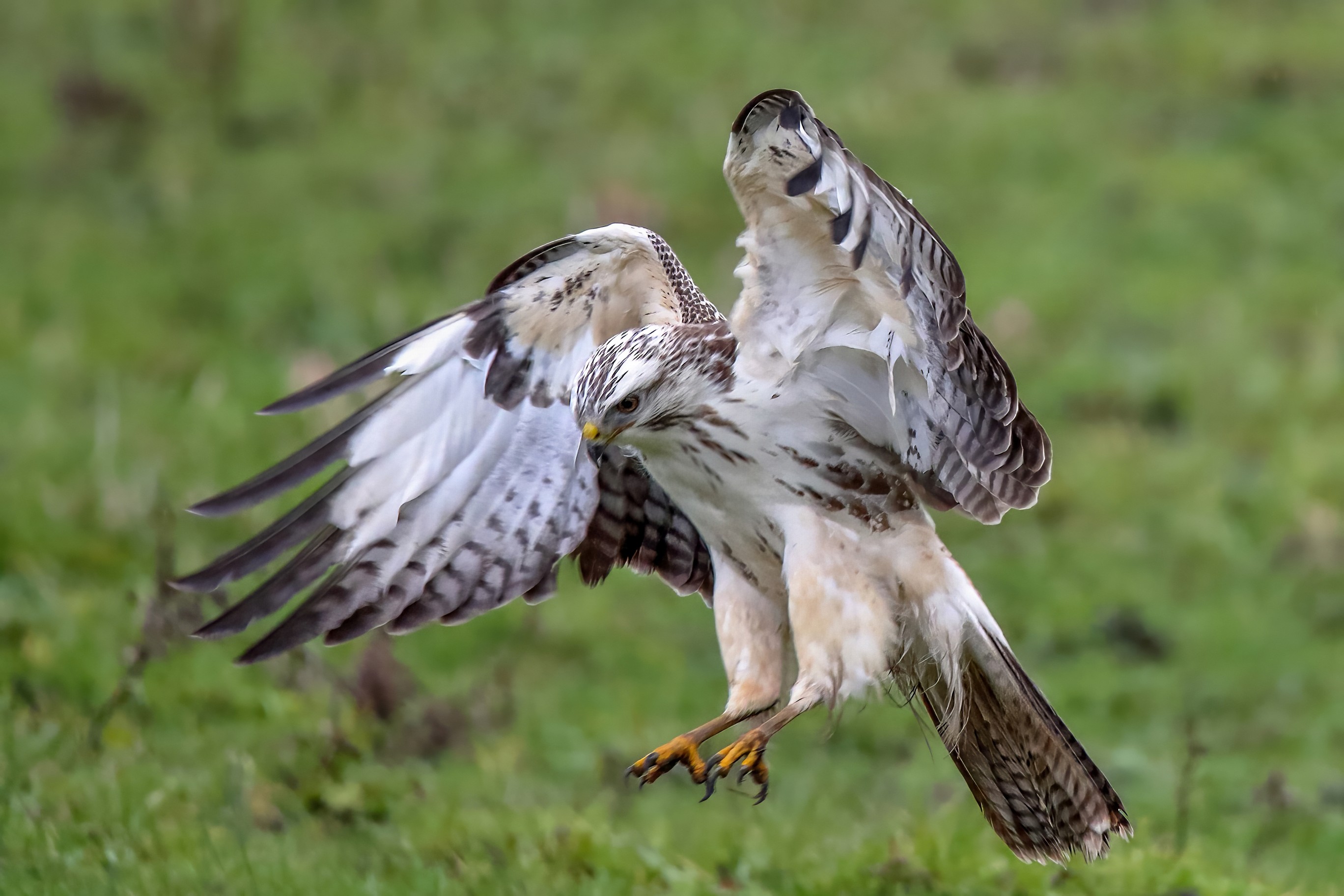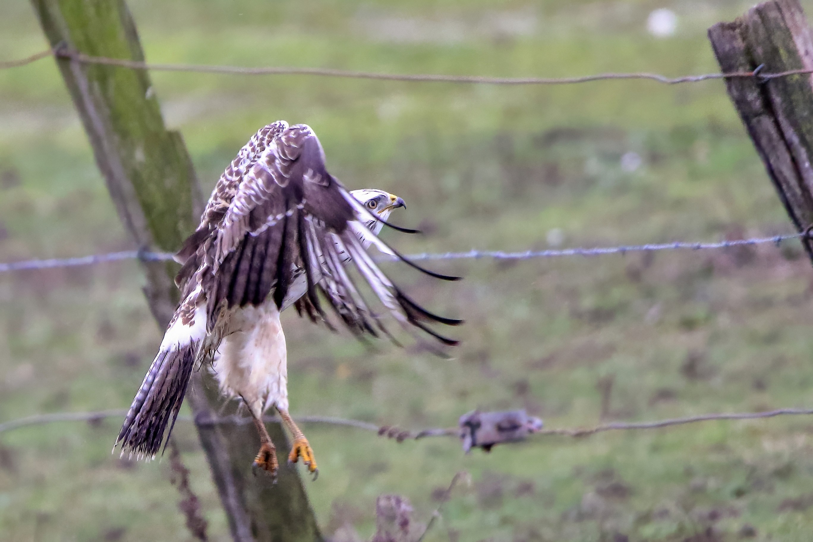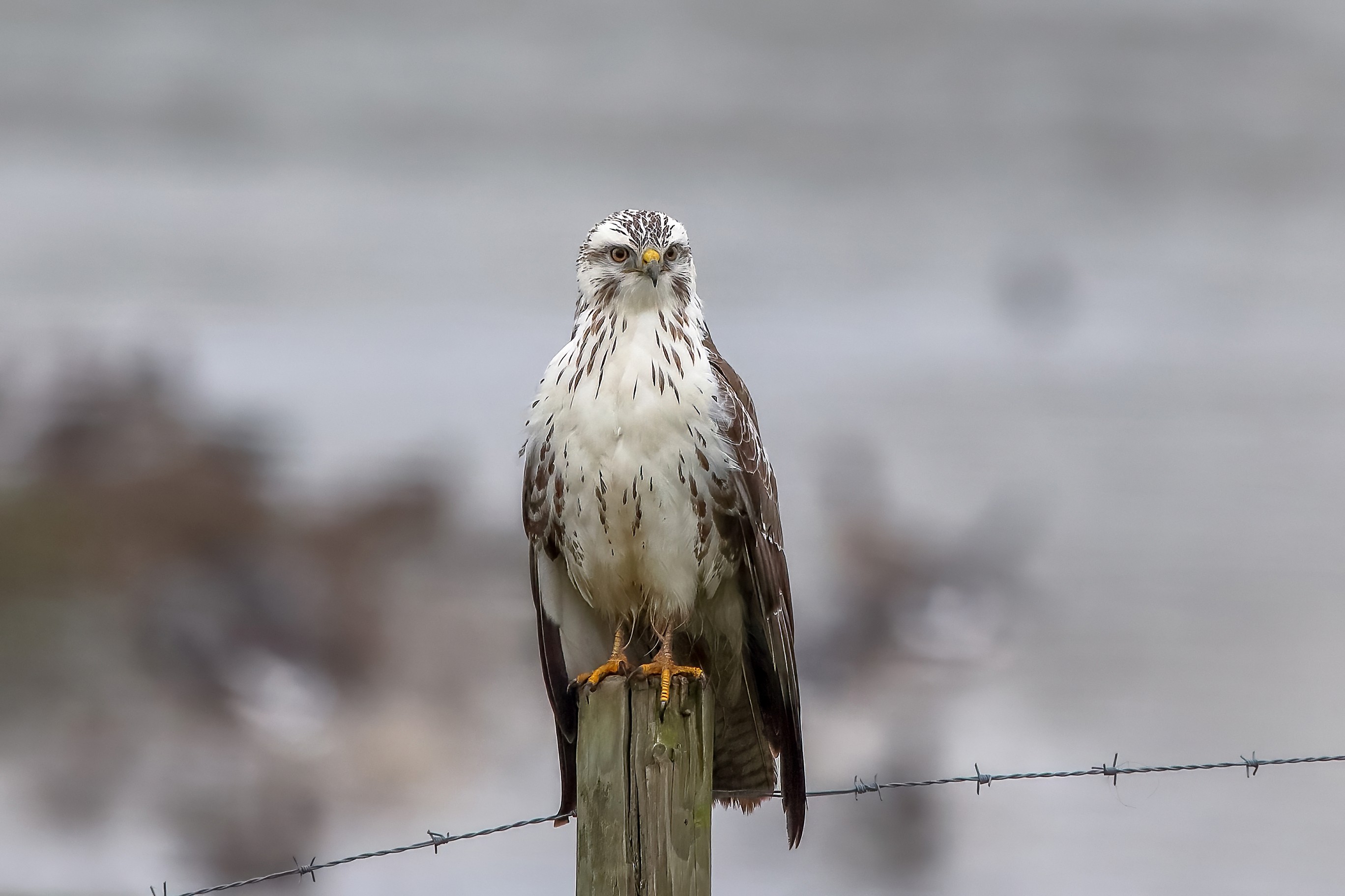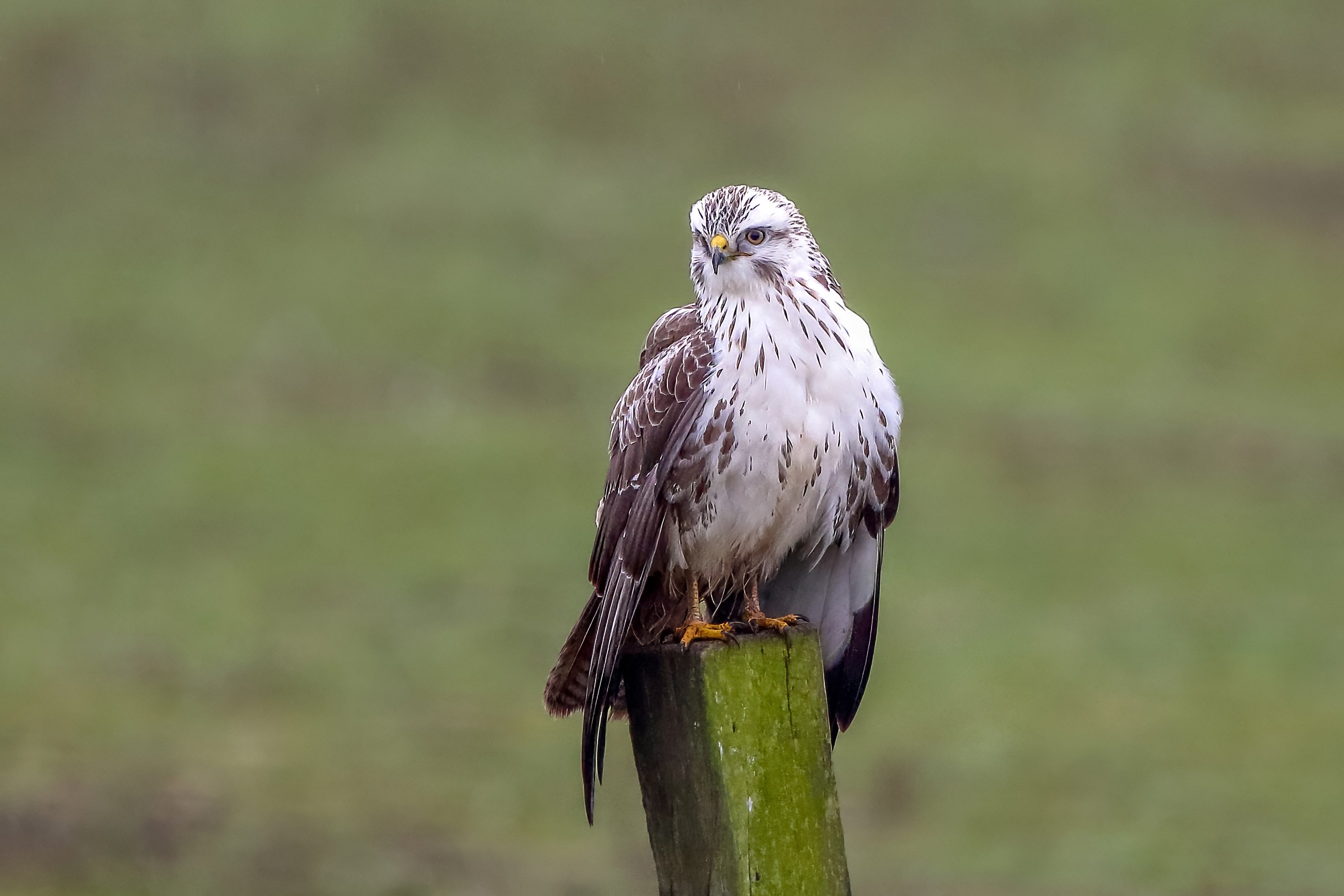 Bussarde haben sehr unterschiedliche Federkleider. Eine seltene und auffällige Farbgebung des Federkleides, wie auf diesen Aufnahmen zu sehen, nennt man helle Farbmorphe. Stets Abstand vom Fotografen einnehmend präsentiert er sich meist mit in größerer Entfernung.