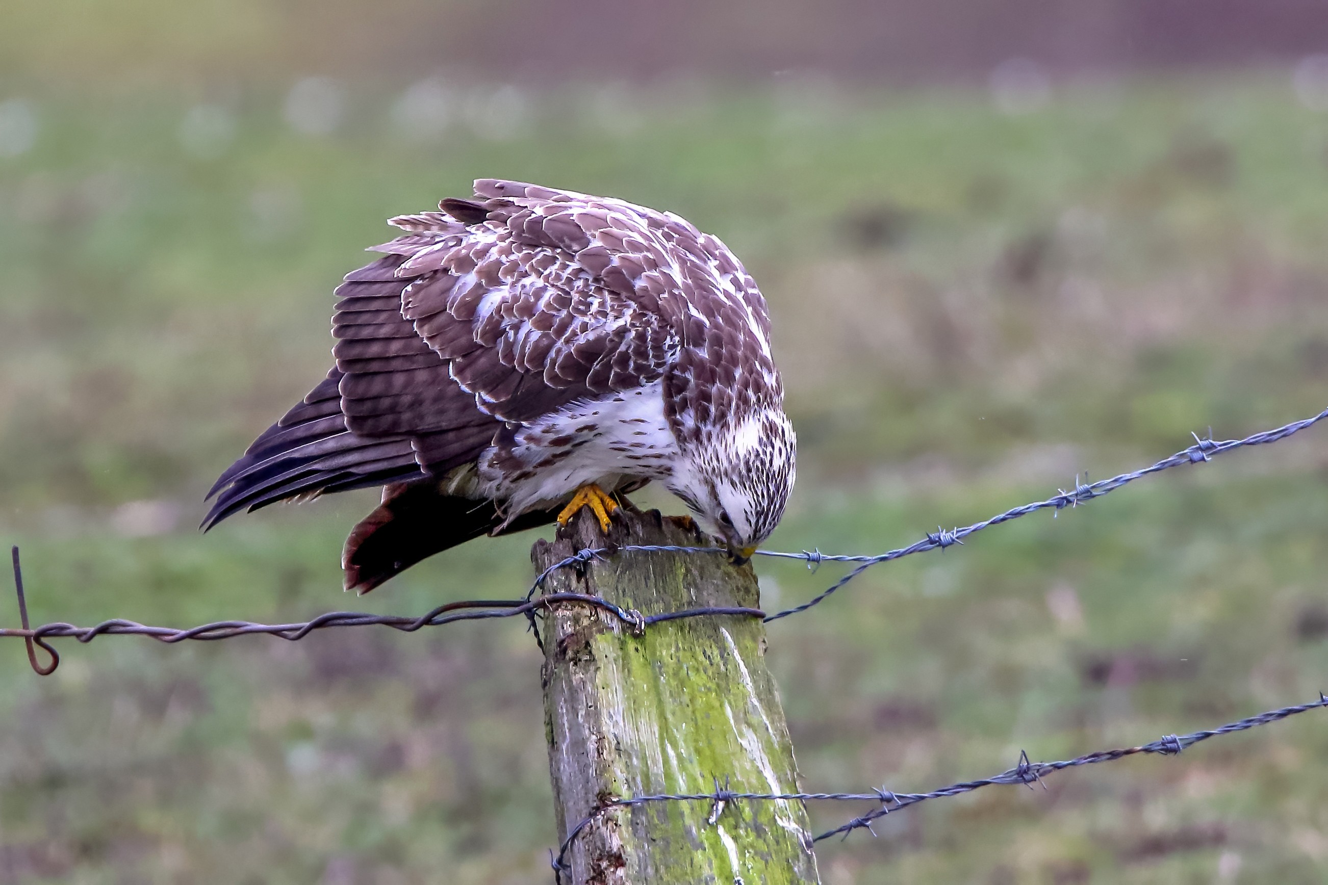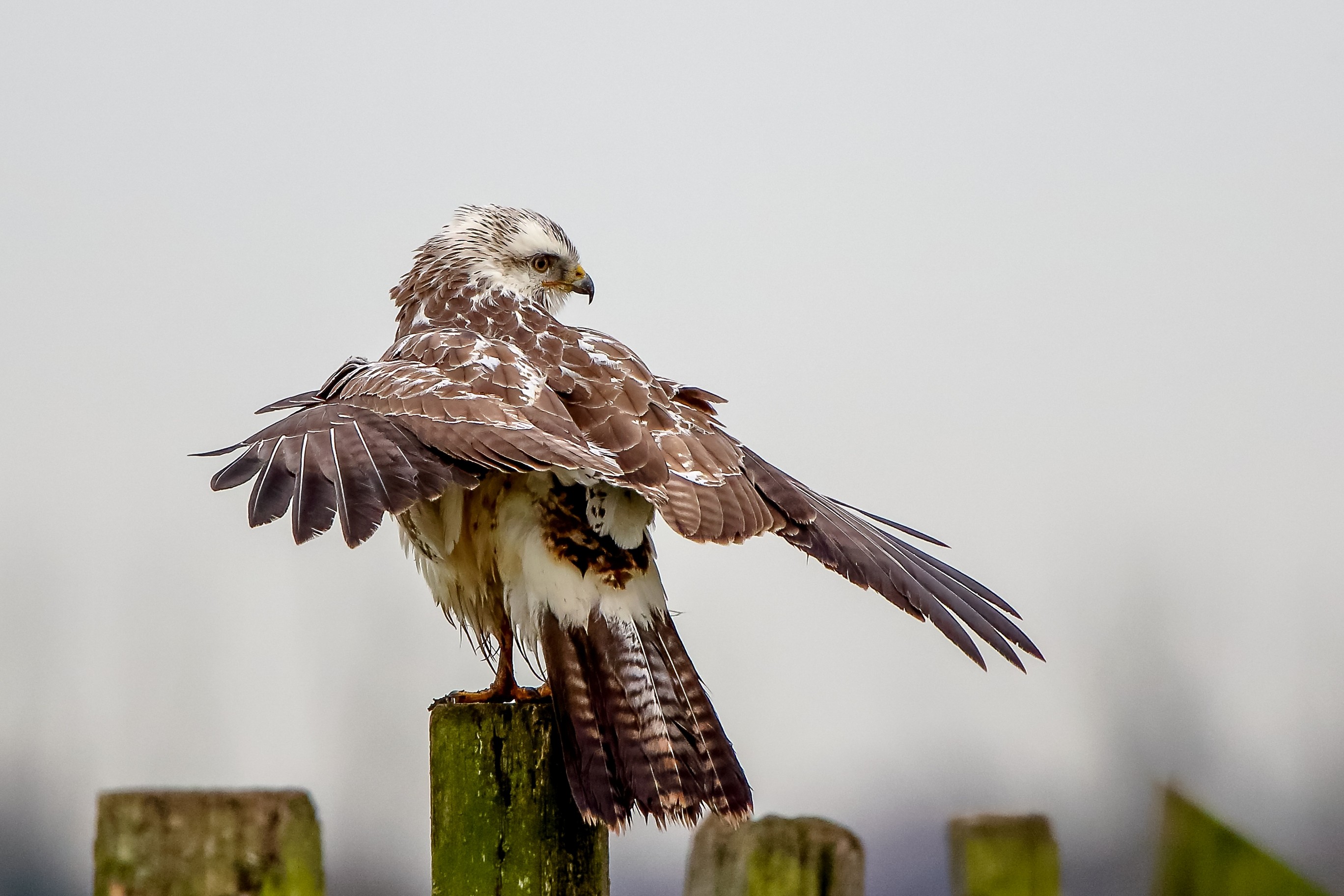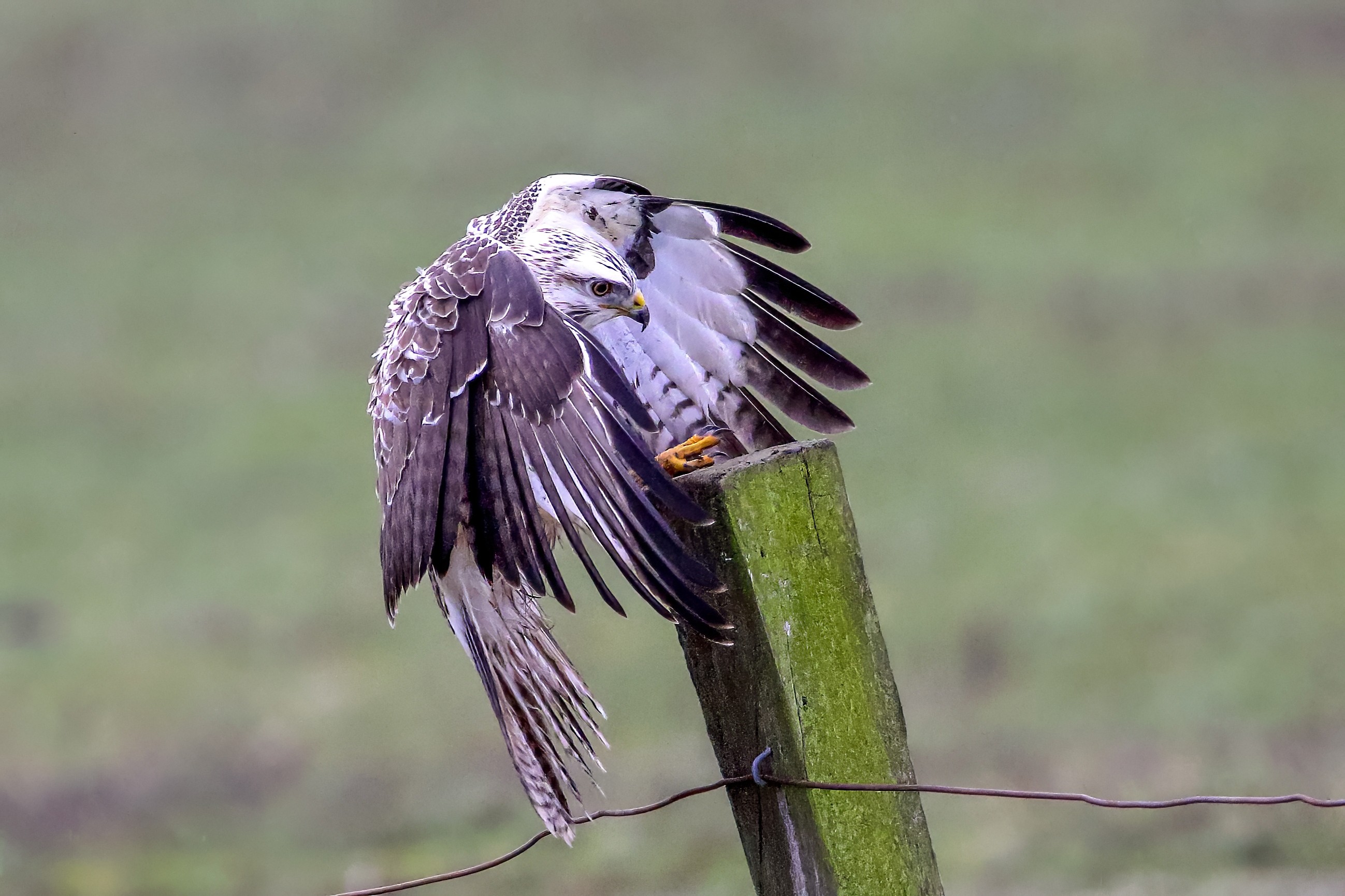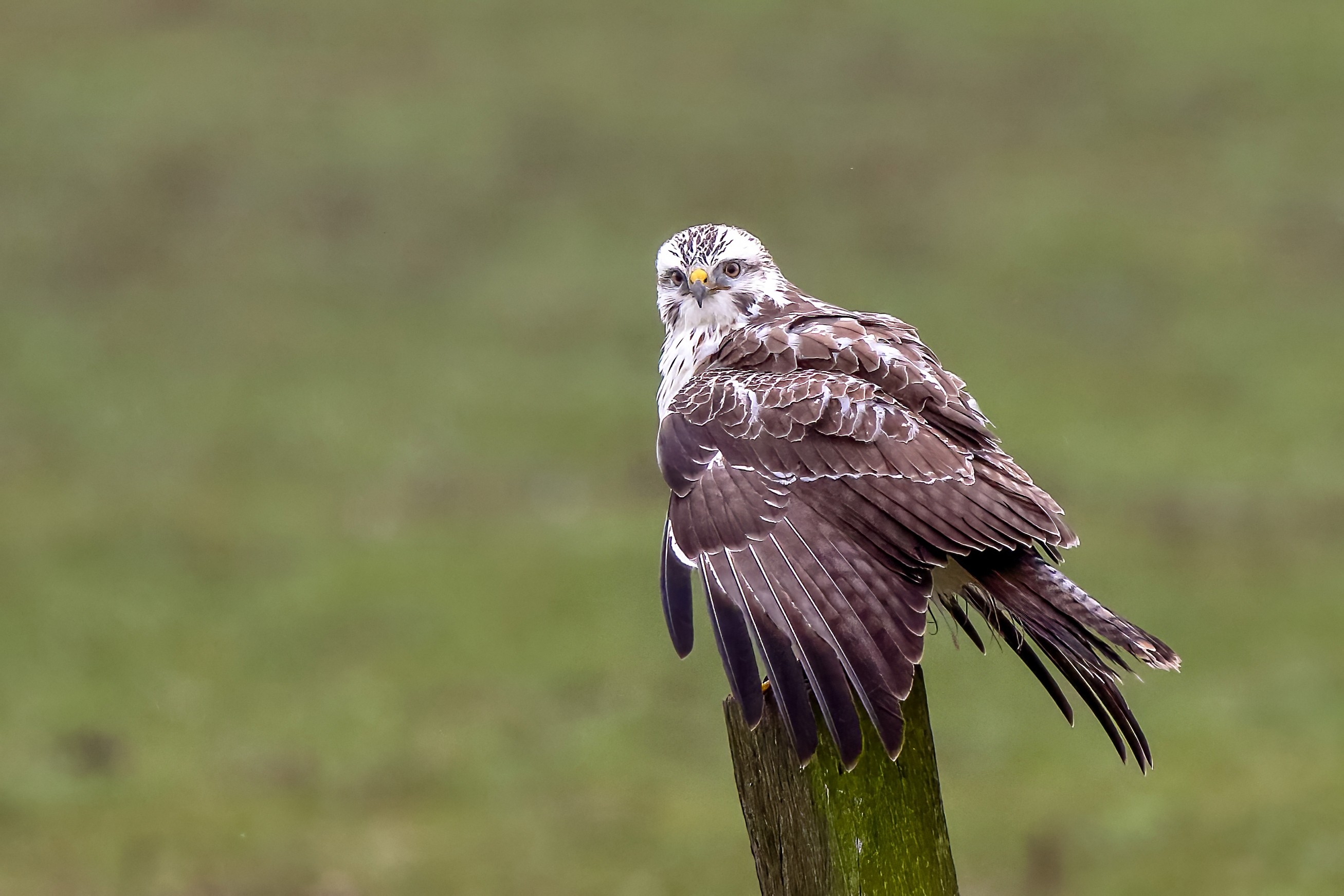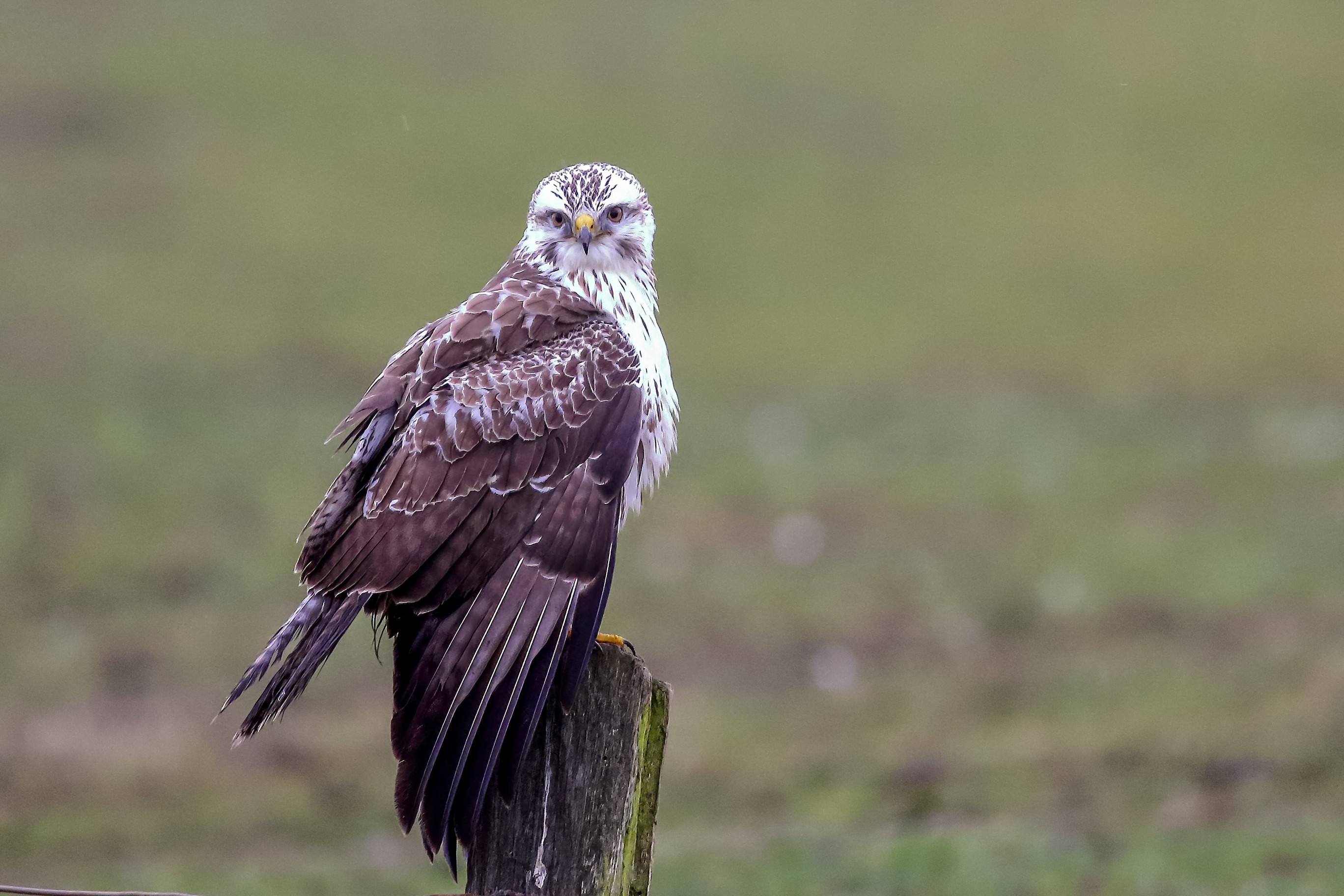 Bussarde haben sehr unterschiedliche Federkleider. Eine seltene und auffällige Farbgebung des Federkleides, wie auf diesen Aufnahmen zu sehen, nennt man helle Farbmorphe. Stets Abstand vom Fotografen einnehmend präsentiert er sich meist mit in größerer Entfernung.
