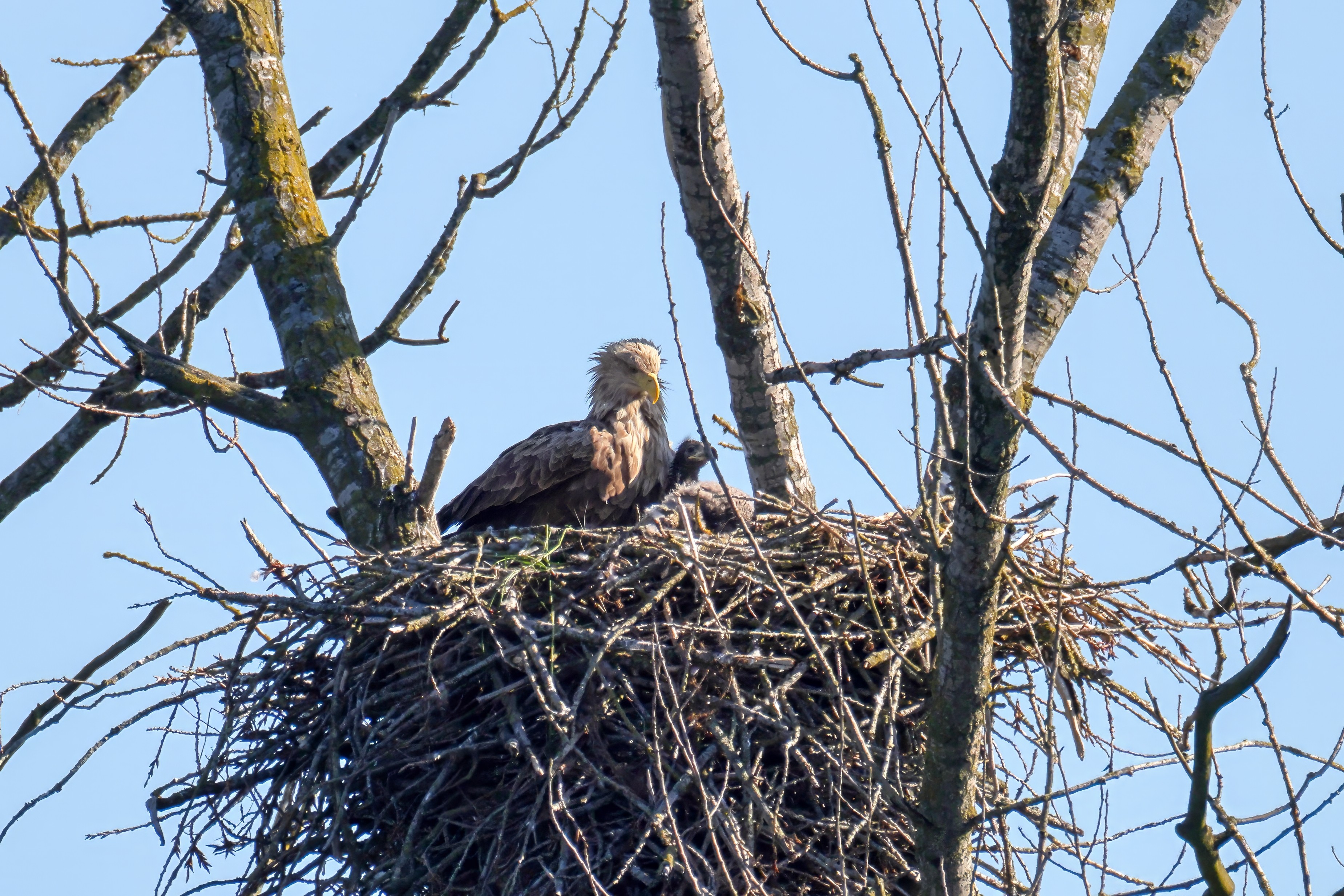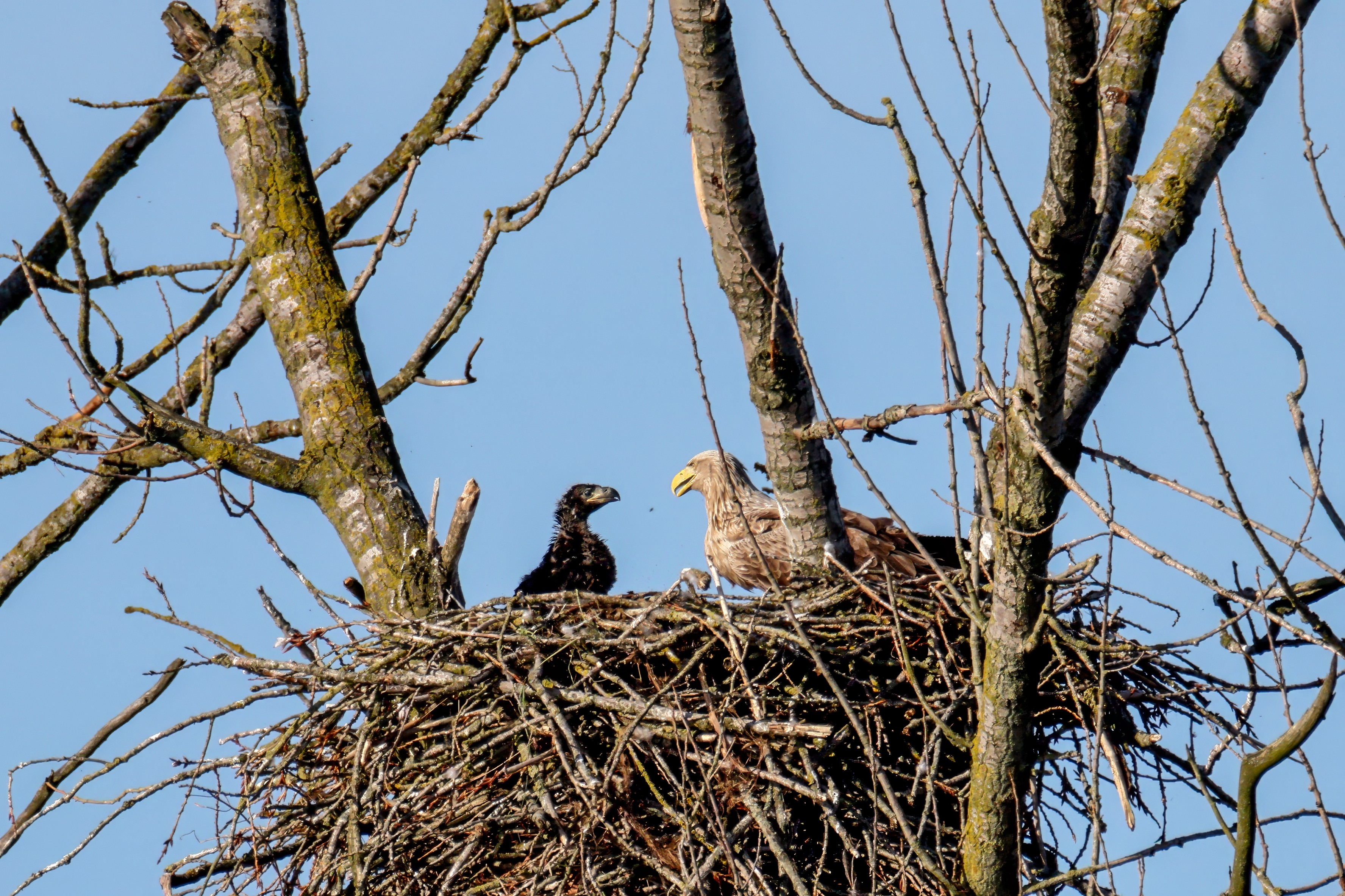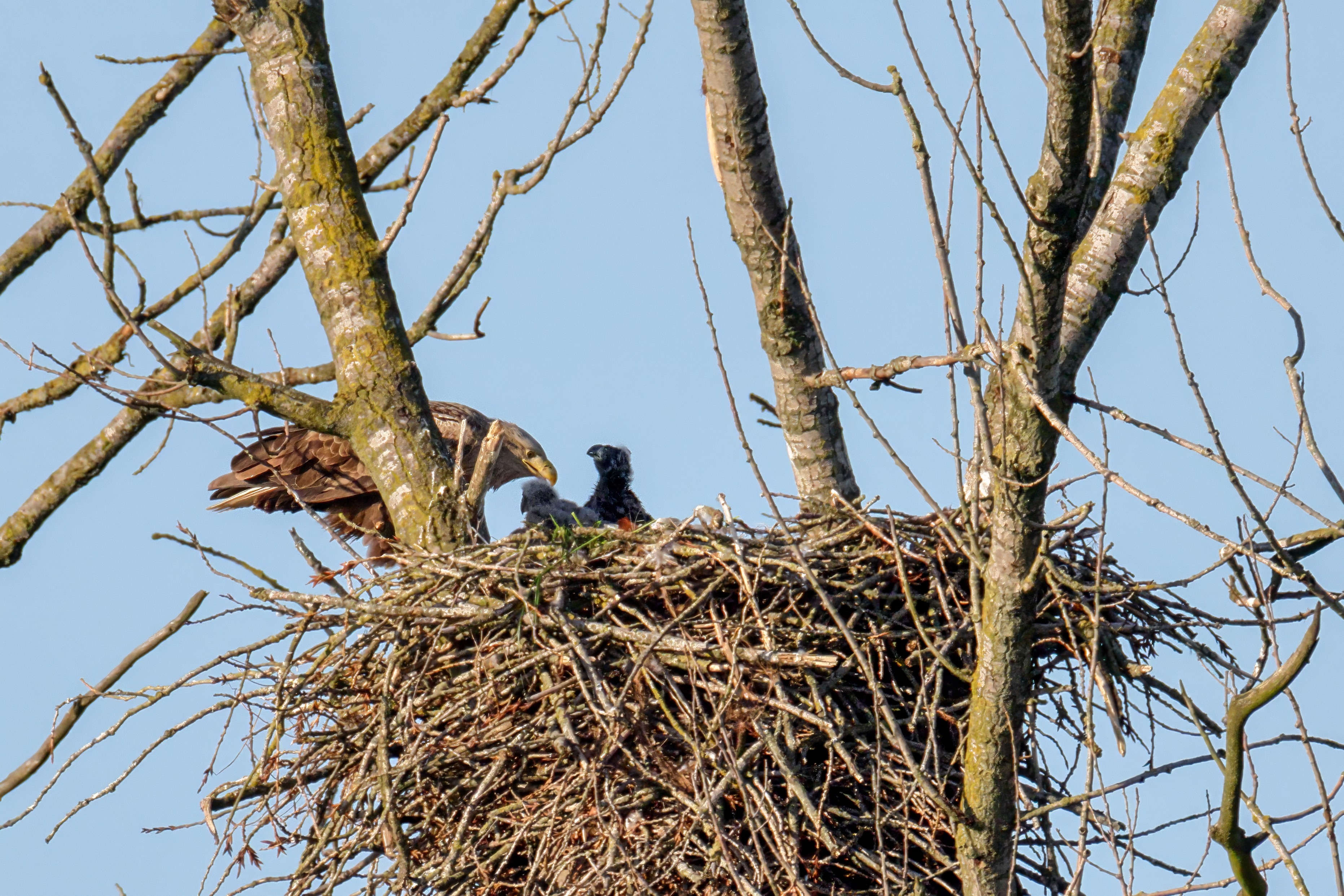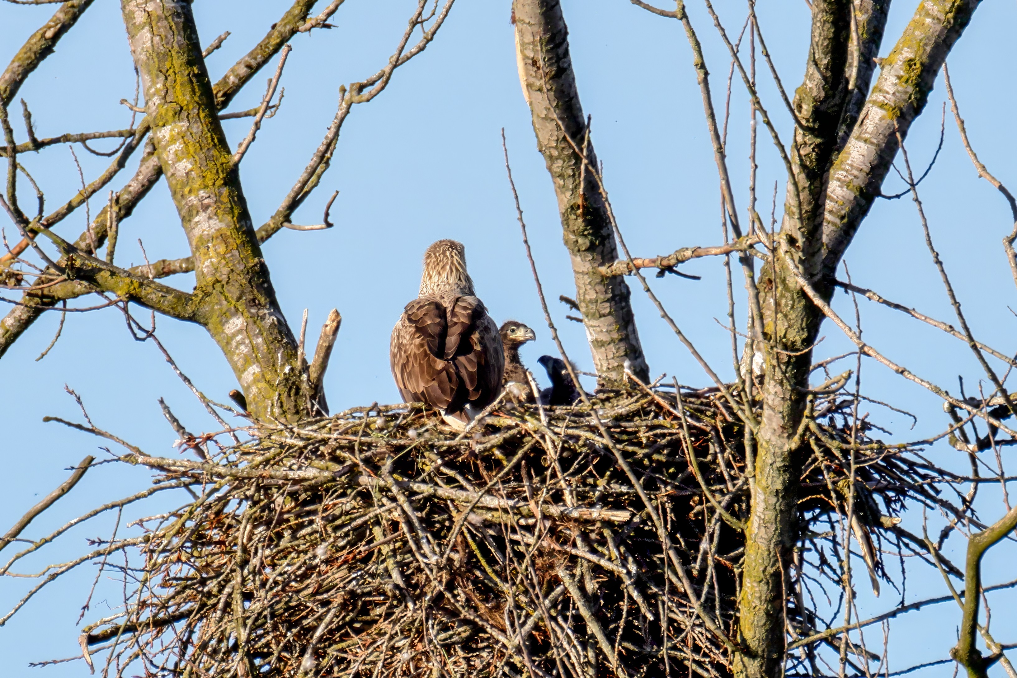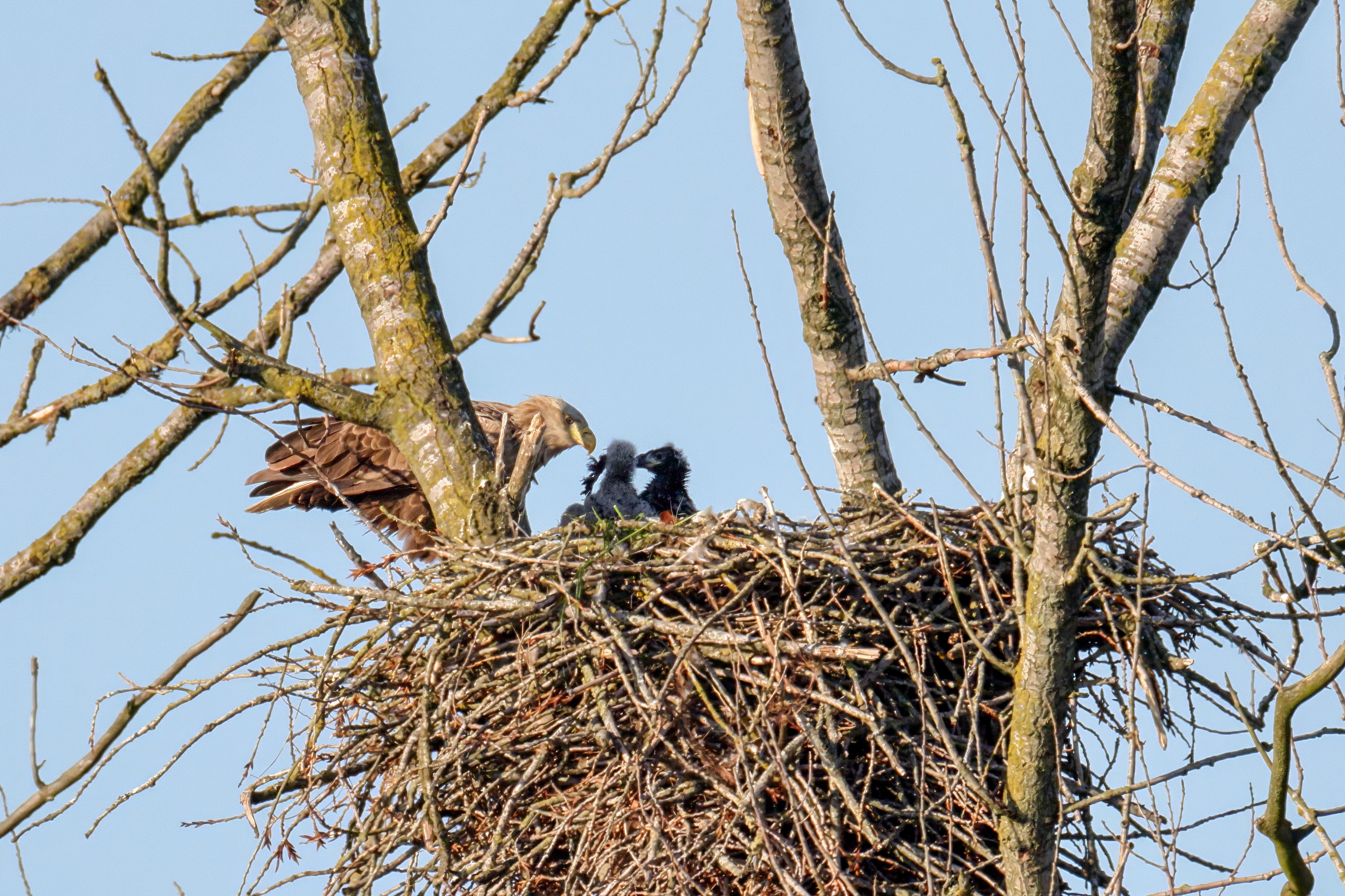 Die kleinen Nestlinge haben sich prächtig entwickelt. Die ständige Anwesenheit der Seeadler im Horst ist nun nicht mehr durchgehend erforderlich. Neben Aufmerksamkeit, Schutz und der Versorgung des Nachwuchses bleibt dem Seeadlerpaar jetzt auch etwas Zeit für sich. Häufig zeigen sie sich gemeinsam in der Nähe des Horstes und lassen dabei ihre enge Verbundenheit und den Stolz als Eltern erkennen.